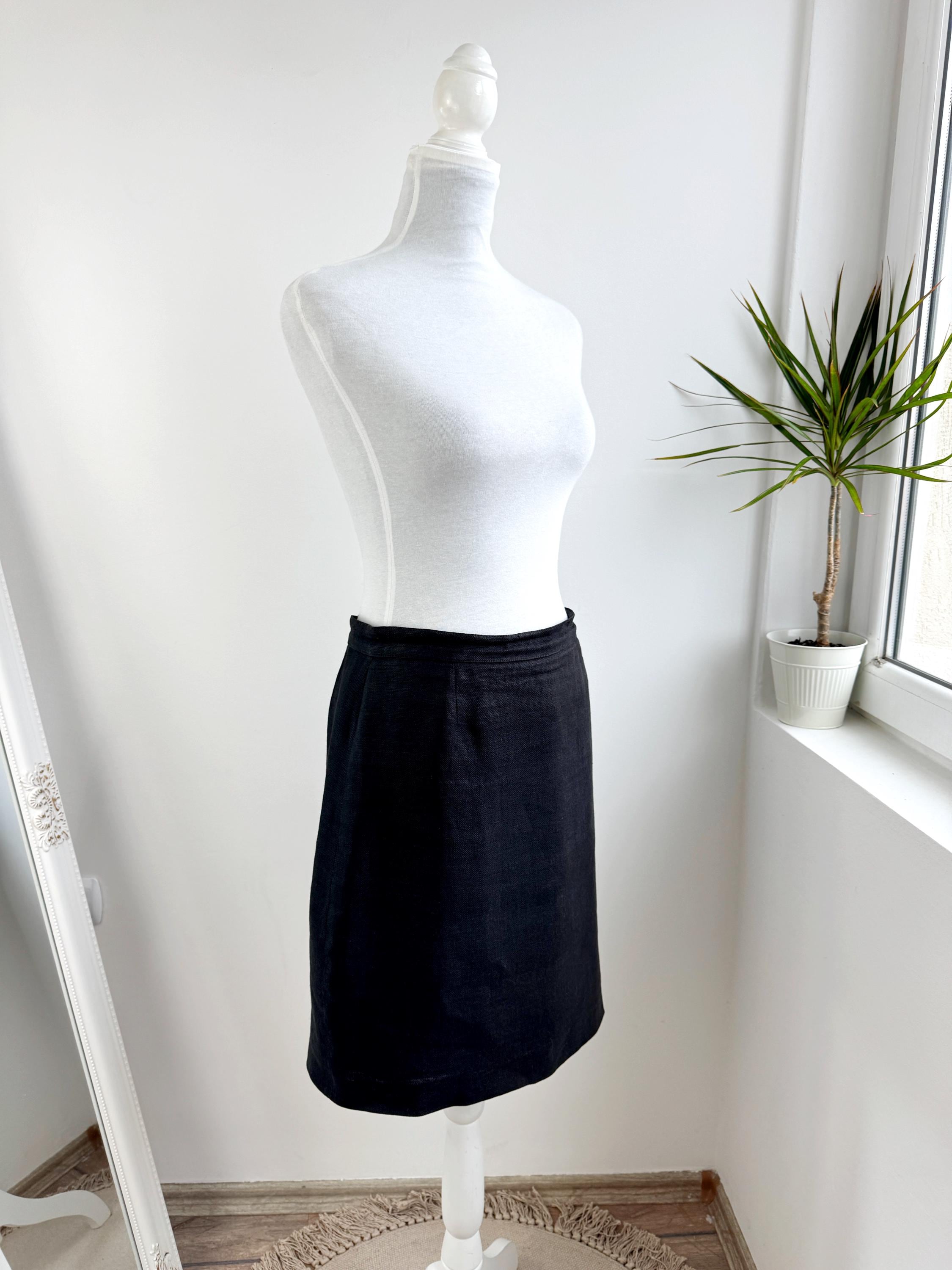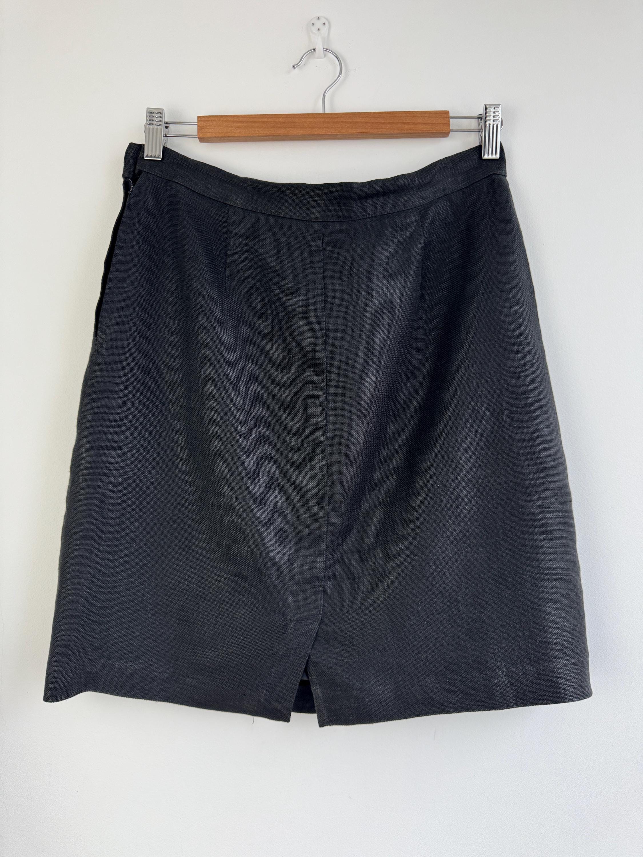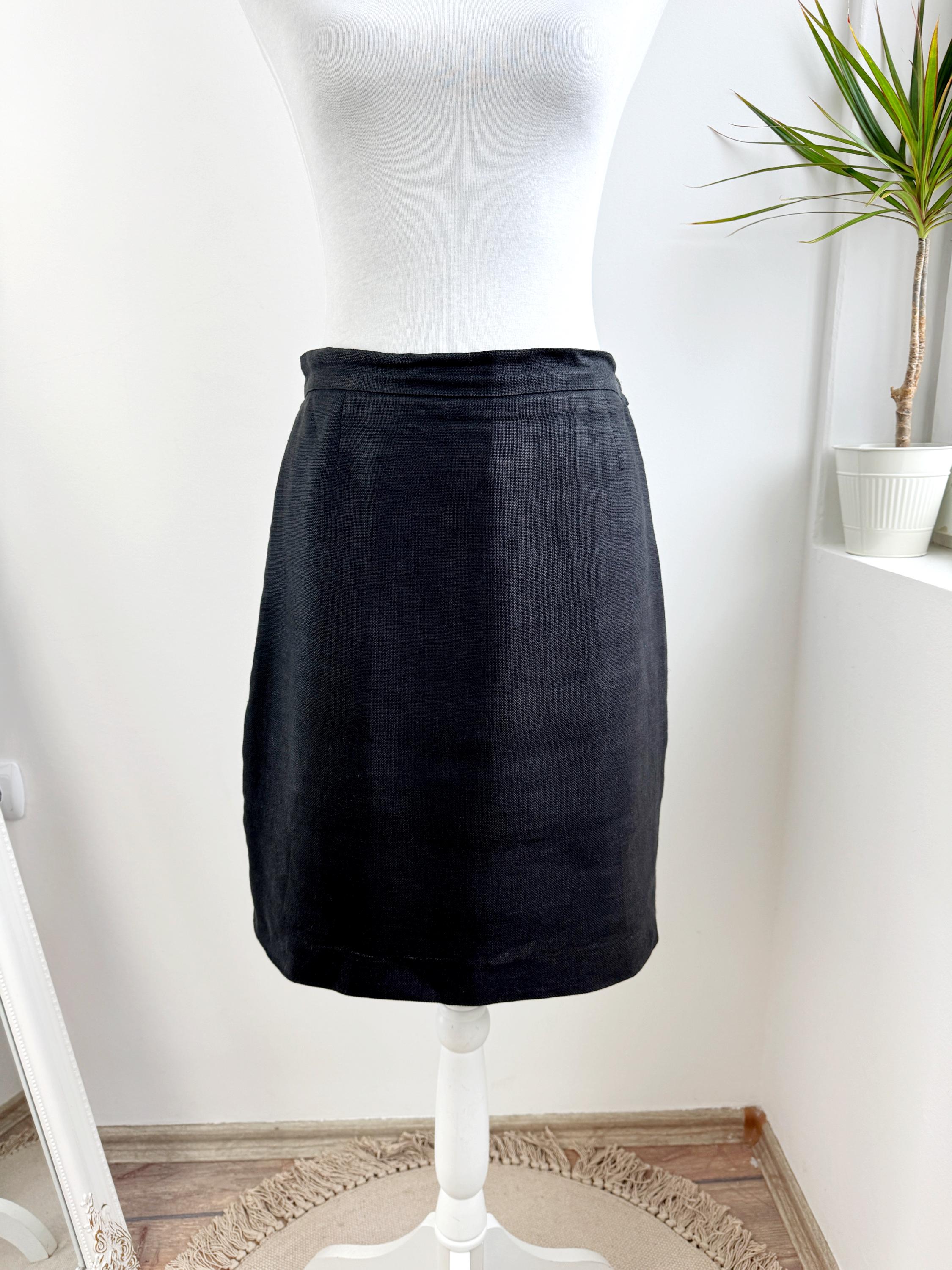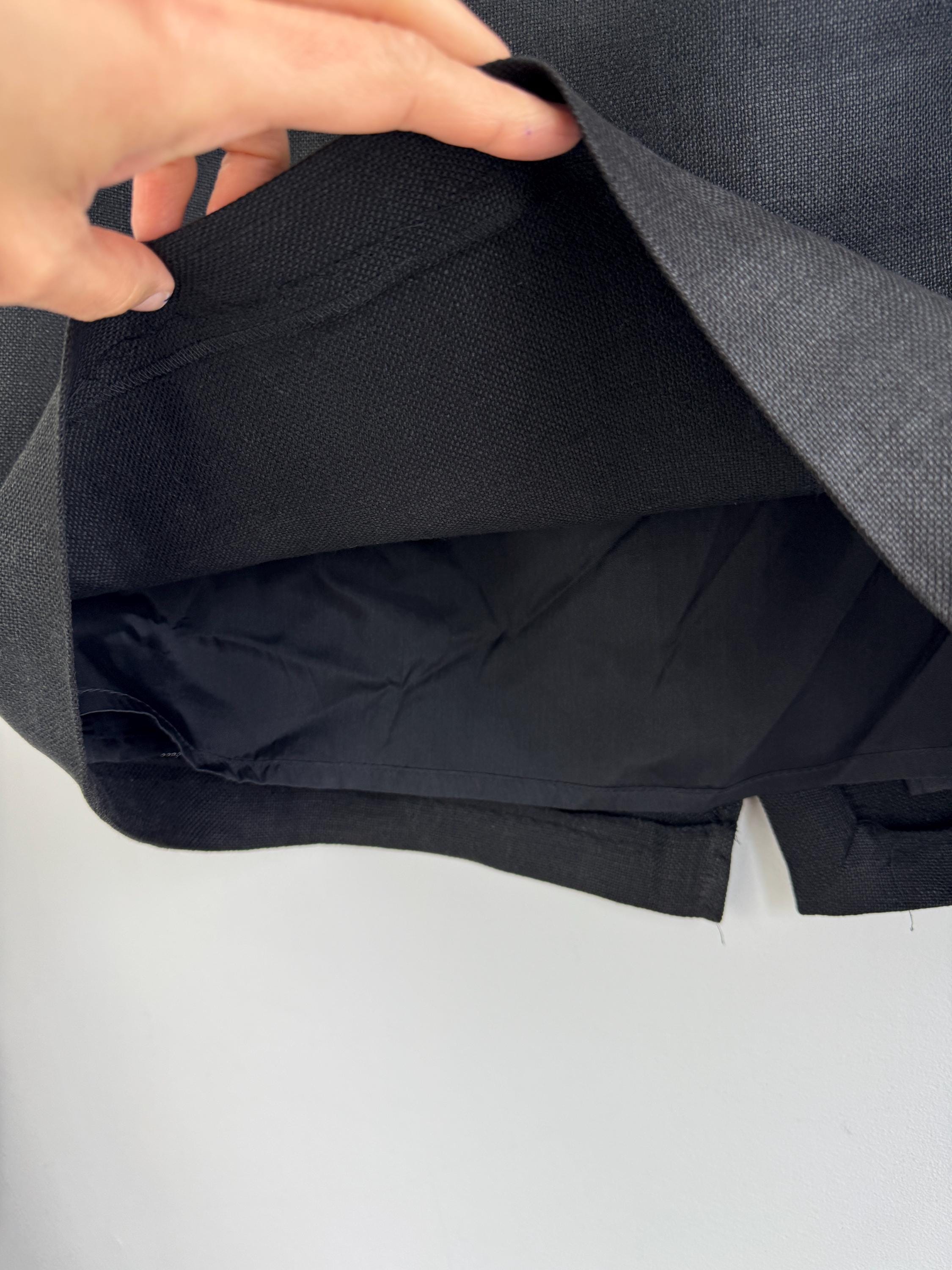 This classic black linen mini skirt by LUI & LEI is the epitome of 90s minimalist chic. Crafted from 100% high-quality flax linen, it features a structured yet breathable weave that makes it a perfect year-round staple. The sleek A-line silhouette is complemented by a high-waisted fit, a side zipper with a matching black button closure, and a full inner lining for a smooth, comfortable fit.