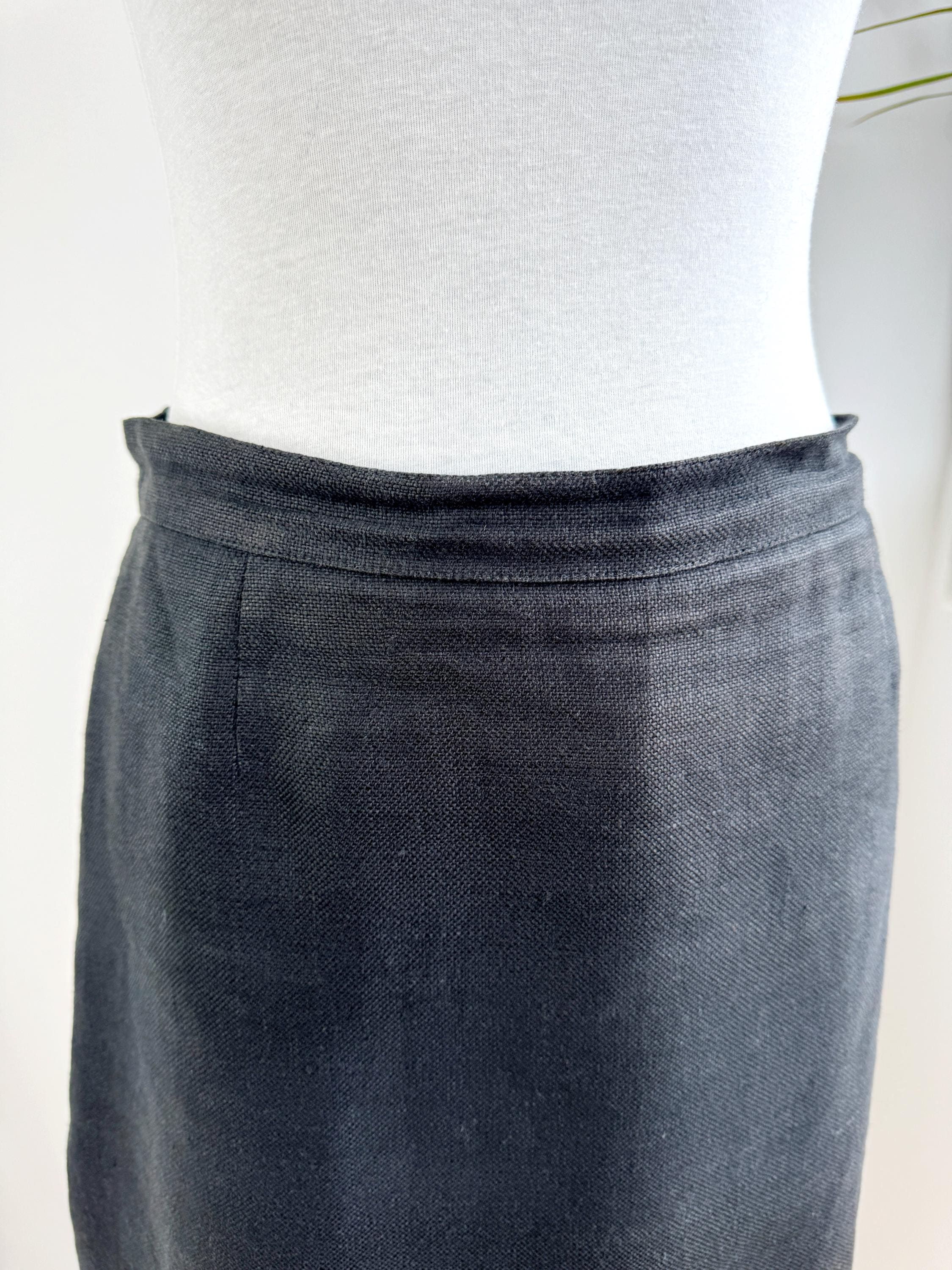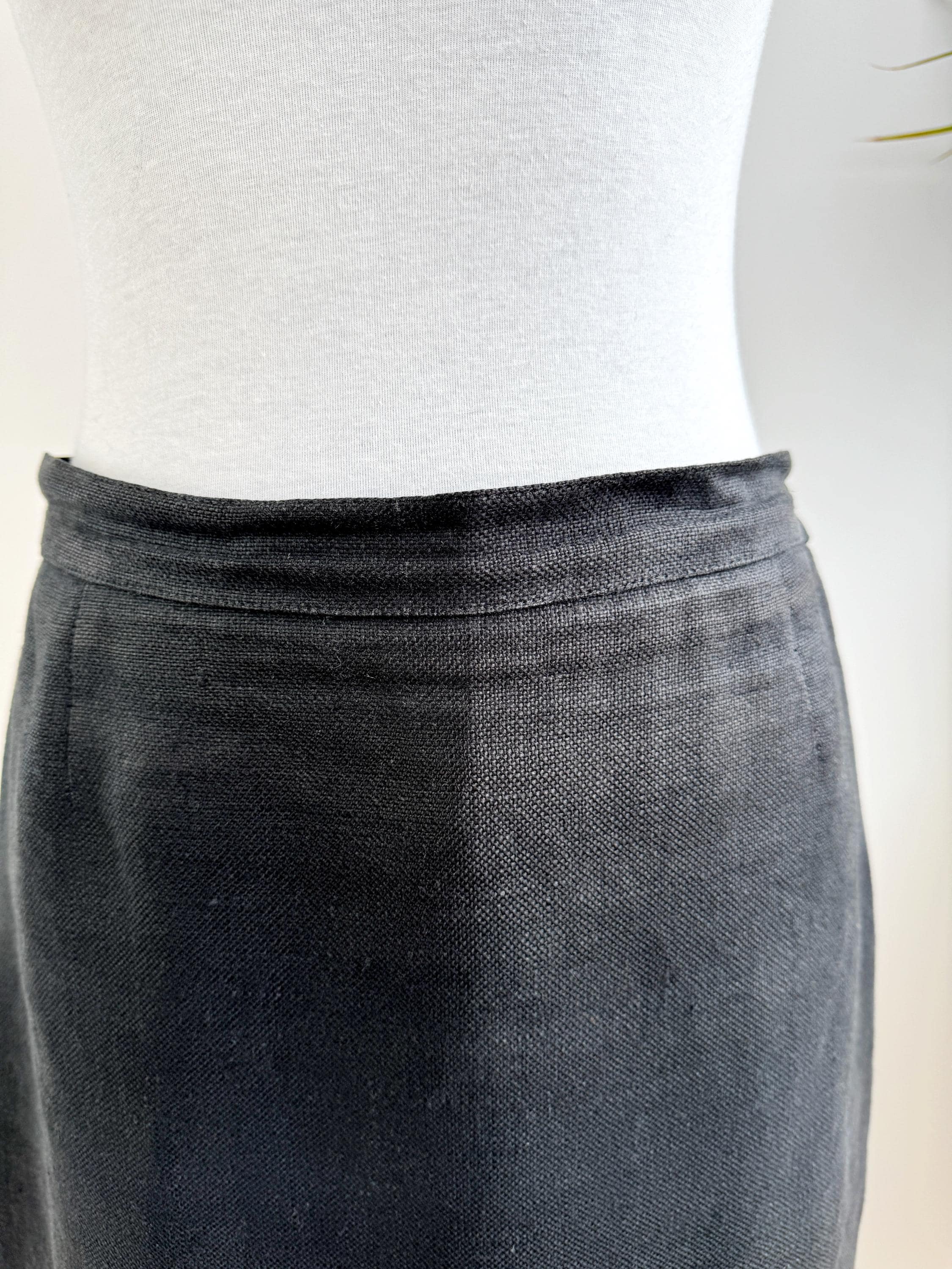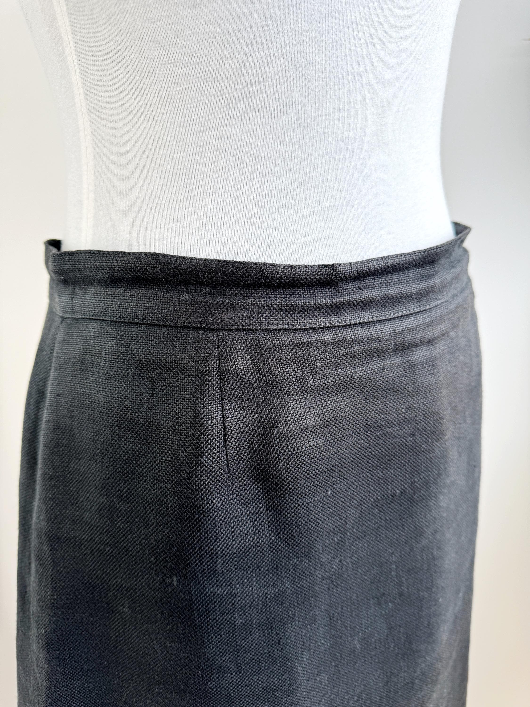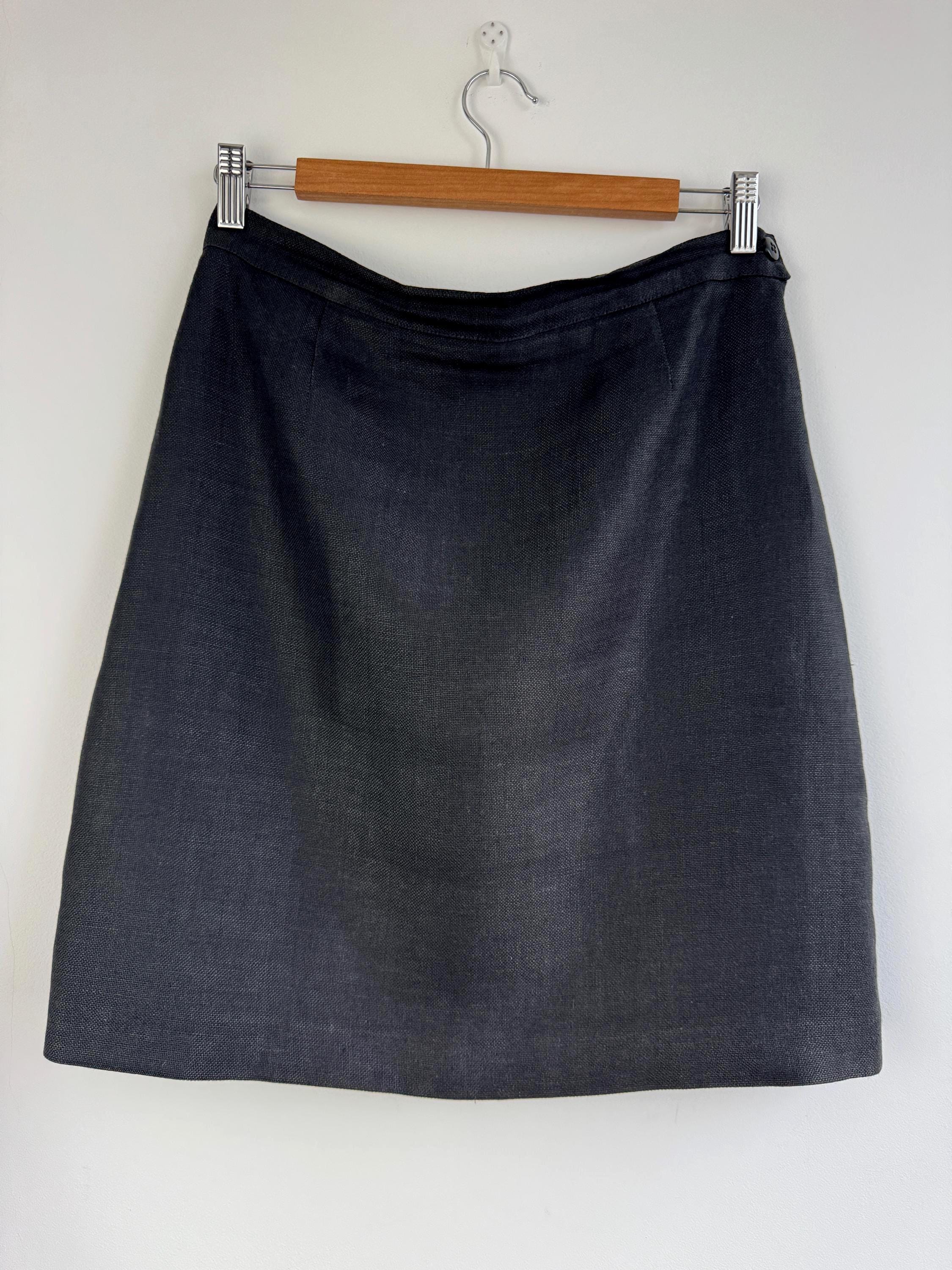 This classic black linen mini skirt by LUI & LEI is the epitome of 90s minimalist chic. Crafted from 100% high-quality flax linen, it features a structured yet breathable weave that makes it a perfect year-round staple. The sleek A-line silhouette is complemented by a high-waisted fit, a side zipper with a matching black button closure, and a full inner lining for a smooth, comfortable fit.