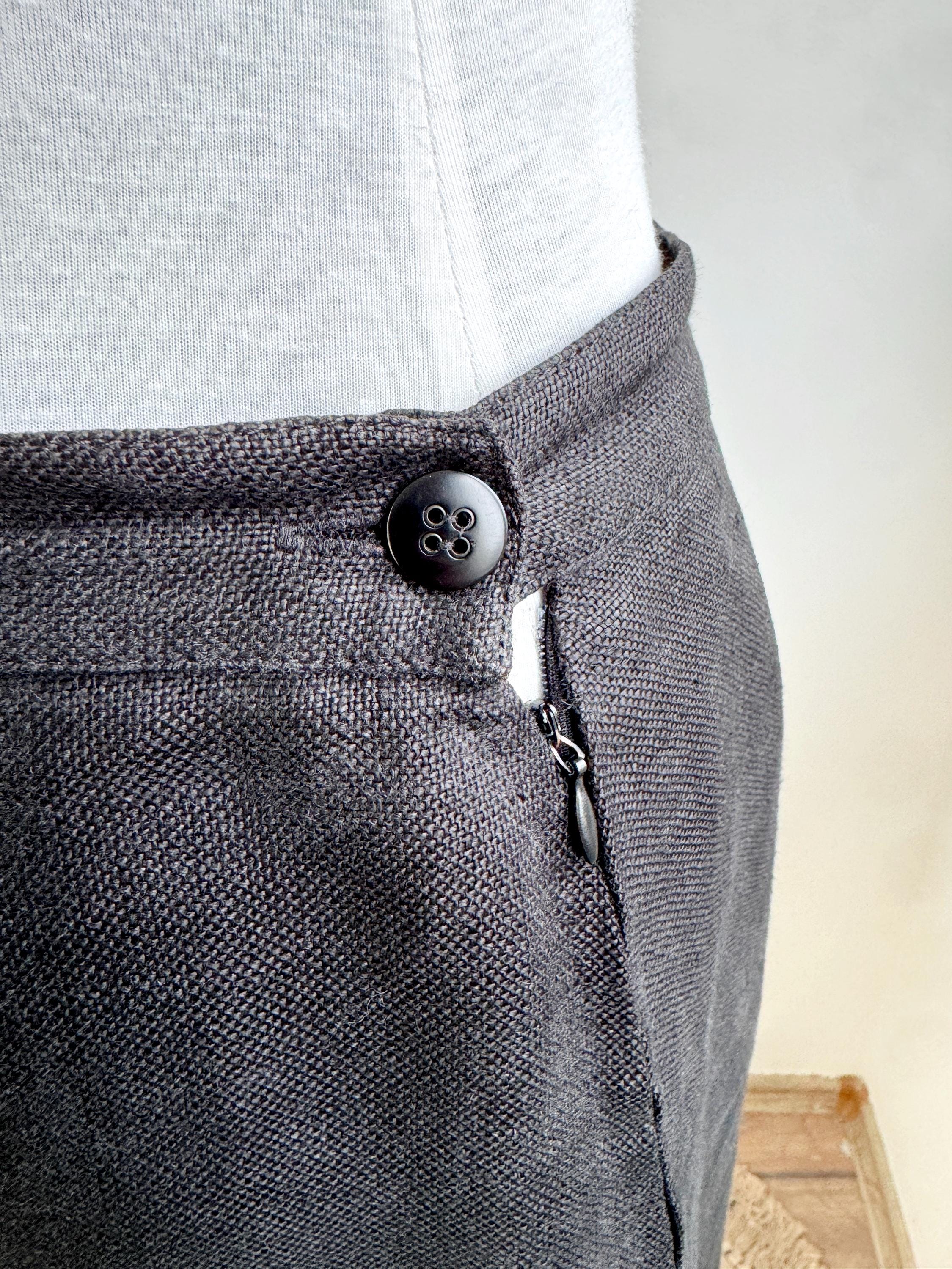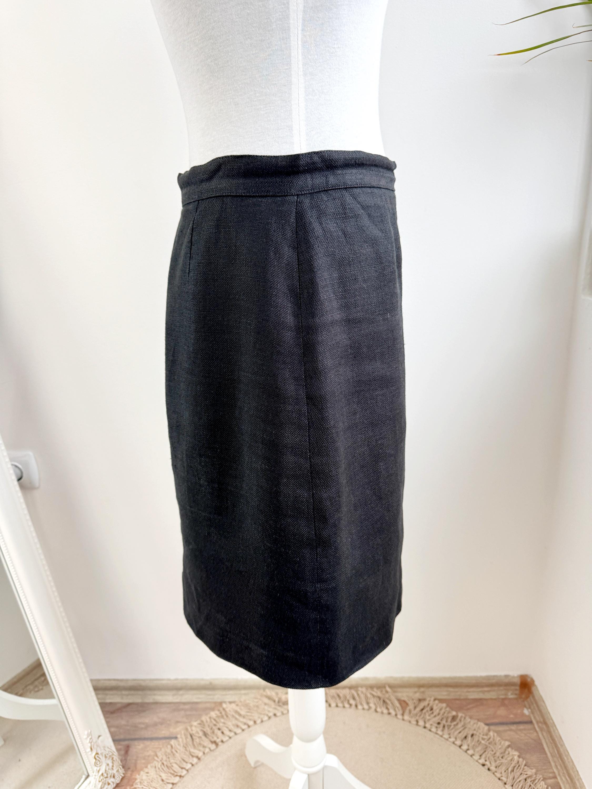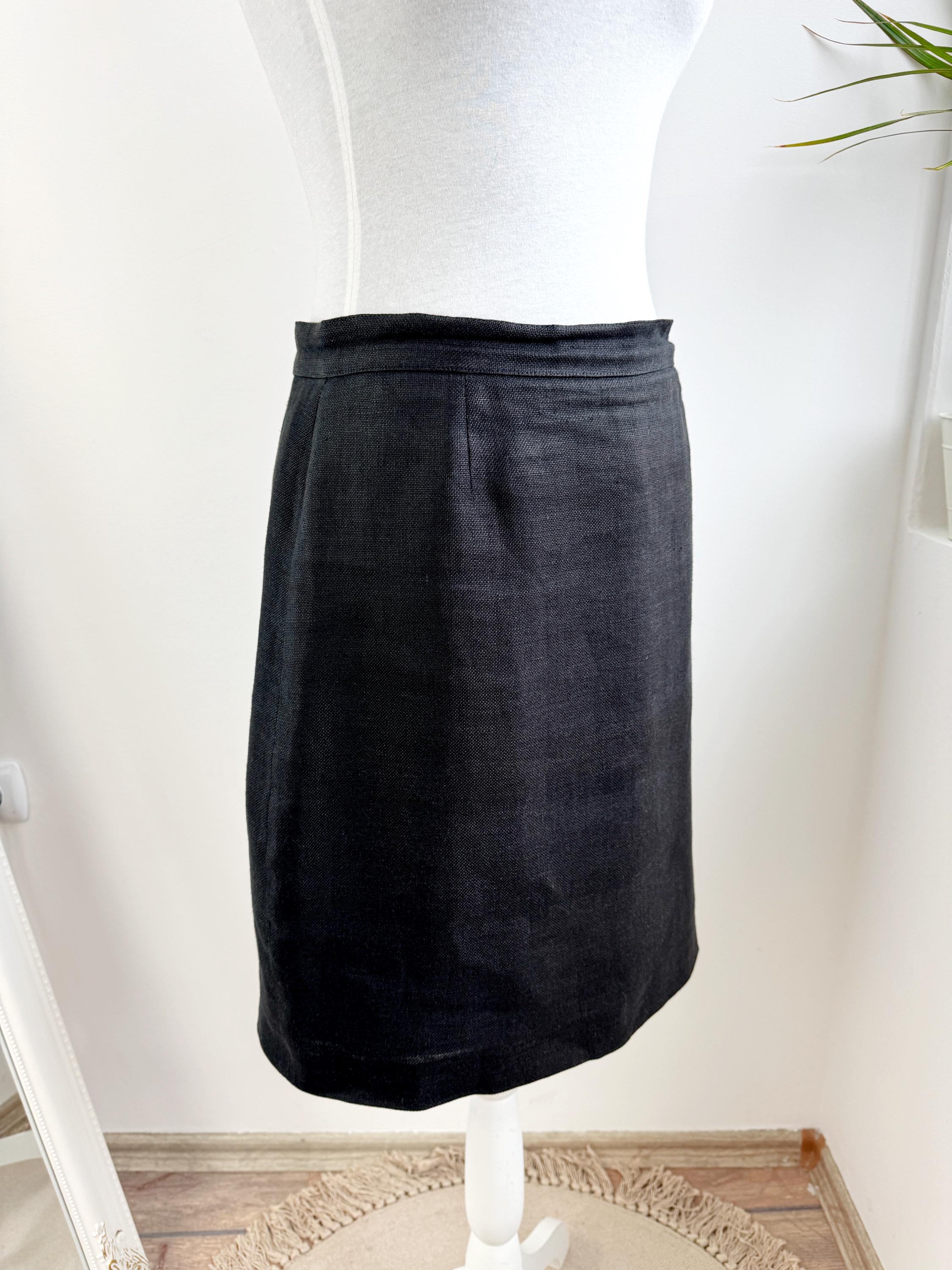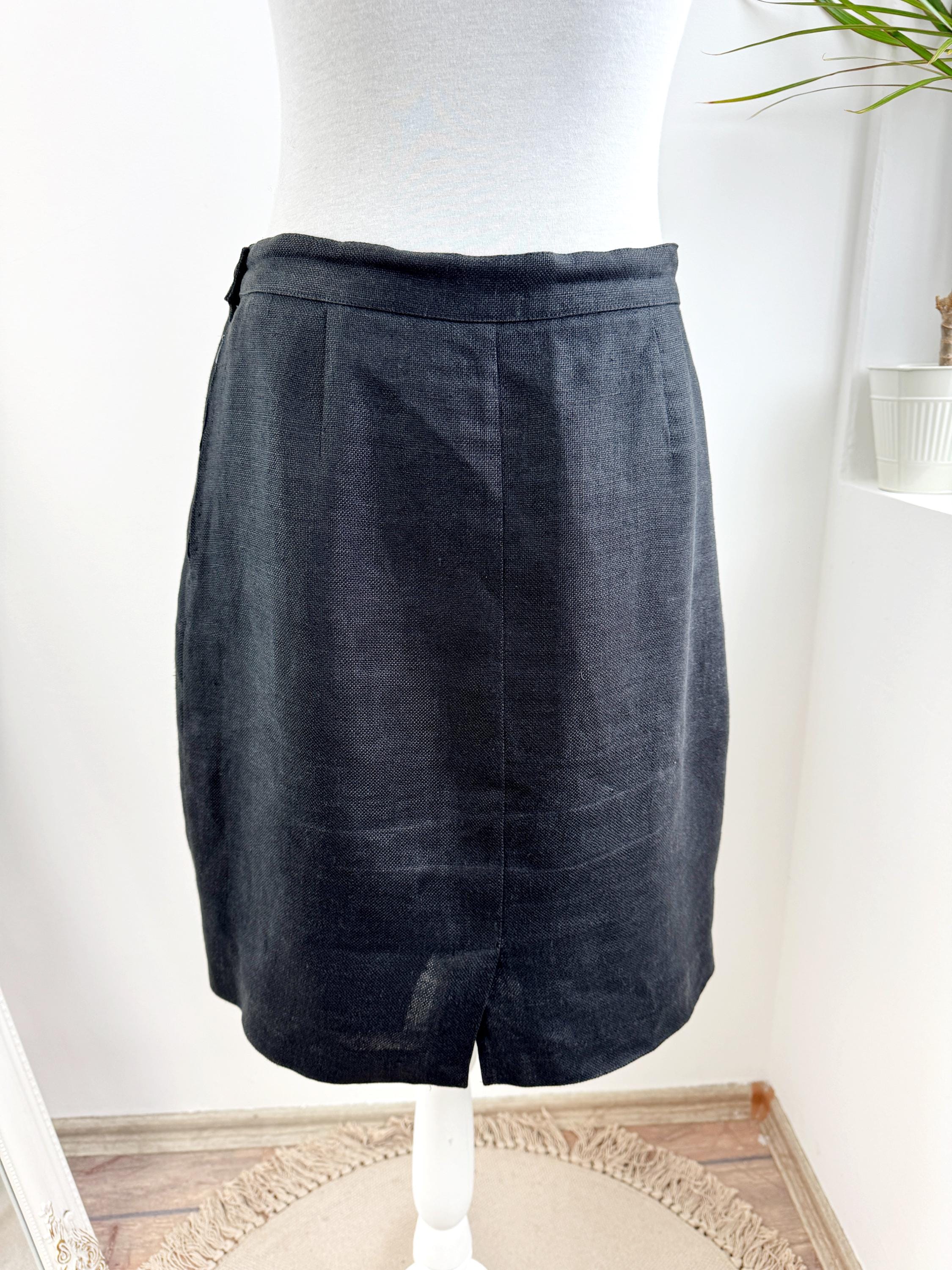 This classic black linen mini skirt by LUI & LEI is the epitome of 90s minimalist chic. Crafted from 100% high-quality flax linen, it features a structured yet breathable weave that makes it a perfect year-round staple. The sleek A-line silhouette is complemented by a high-waisted fit, a side zipper with a matching black button closure, and a full inner lining for a smooth, comfortable fit.