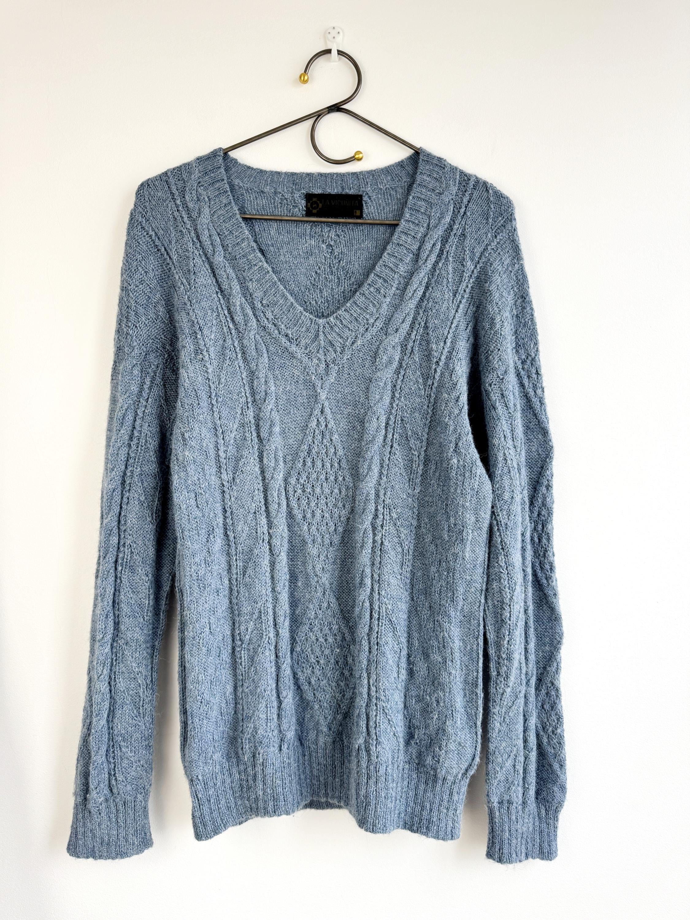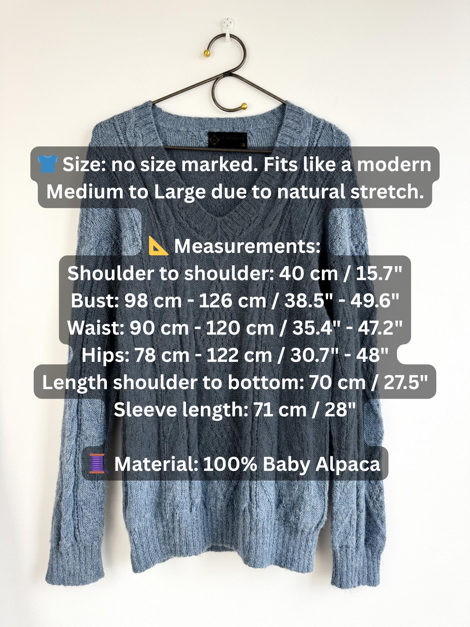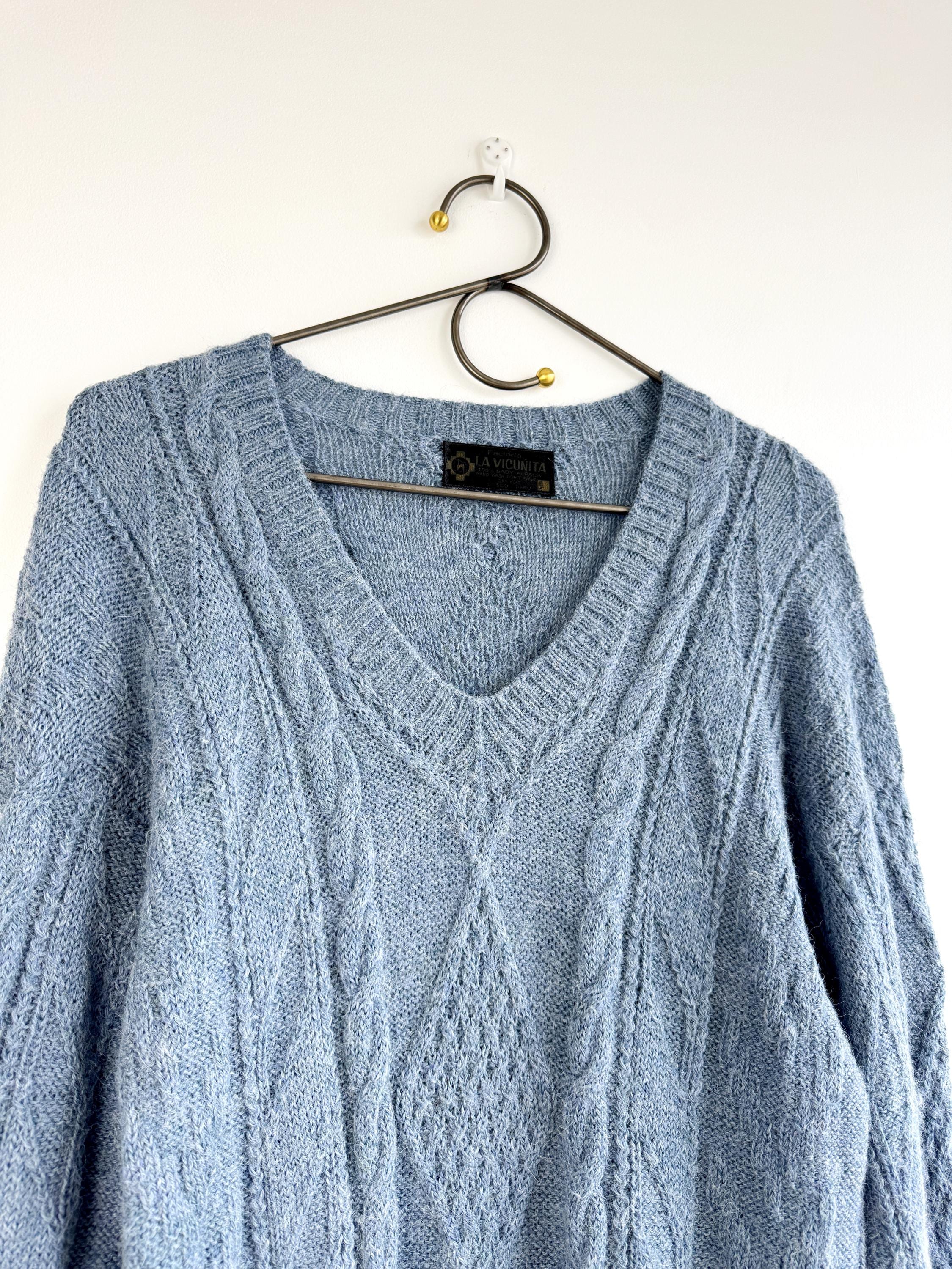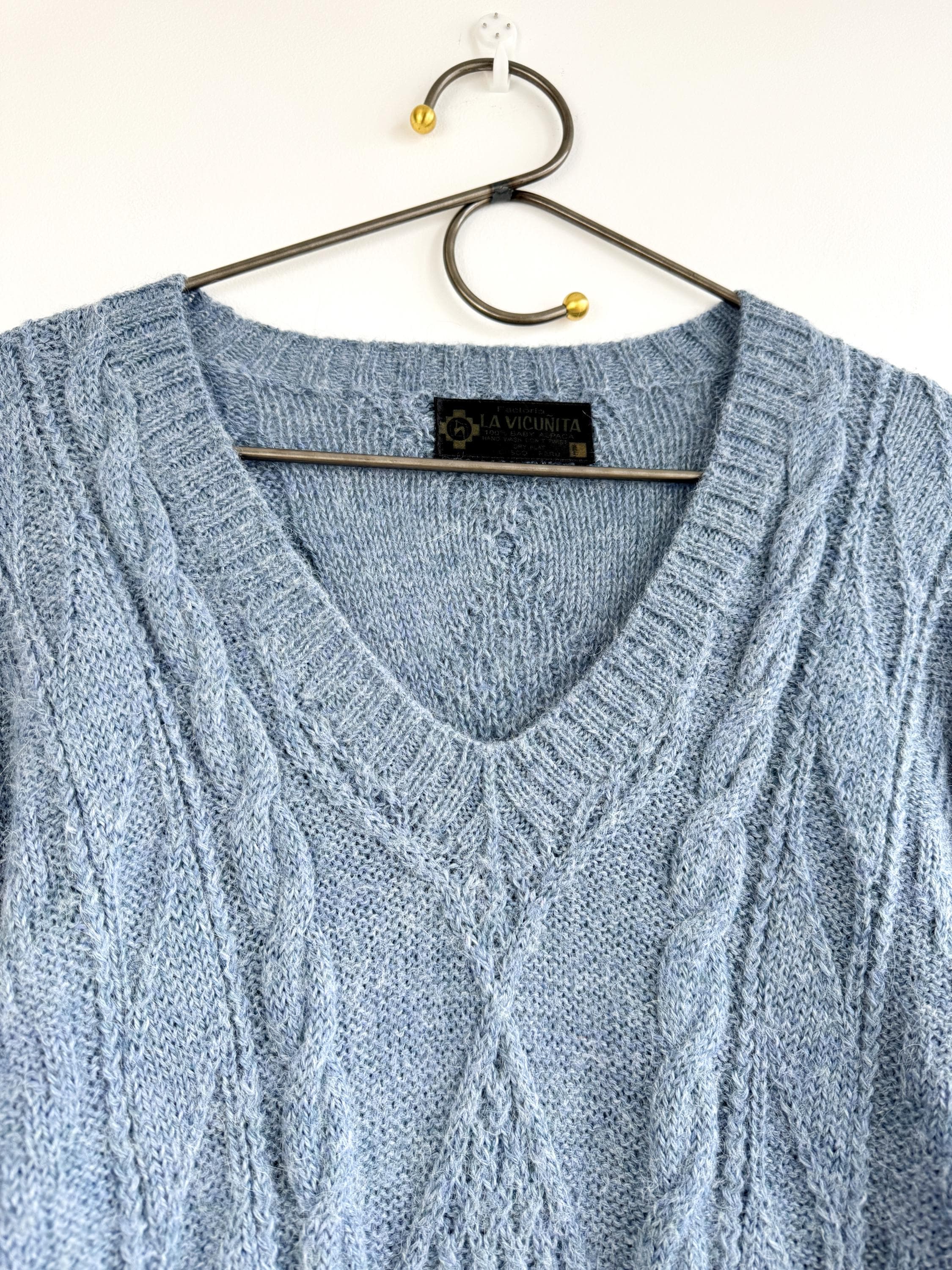 This is increadibly soft 100% baby alpaca Peruvian vintage sweater by La Vicuñita. Expertly crafted from 100% Baby Alpaca by La Vicuñita in Cusco, Peru, this soft baby alpaca pullover features a sophisticated dusty blue hue that pairs perfectly with denim or neutral linens.