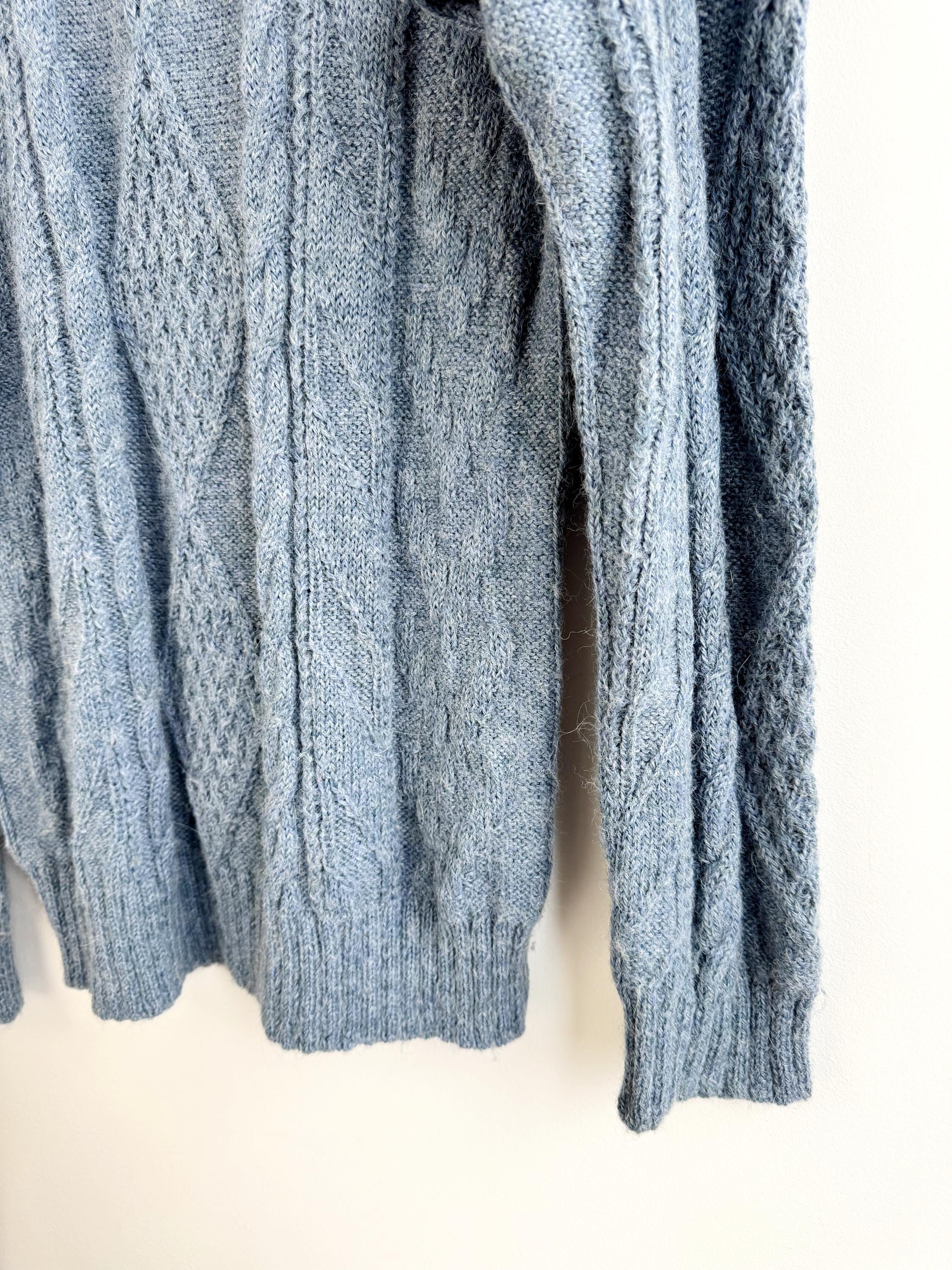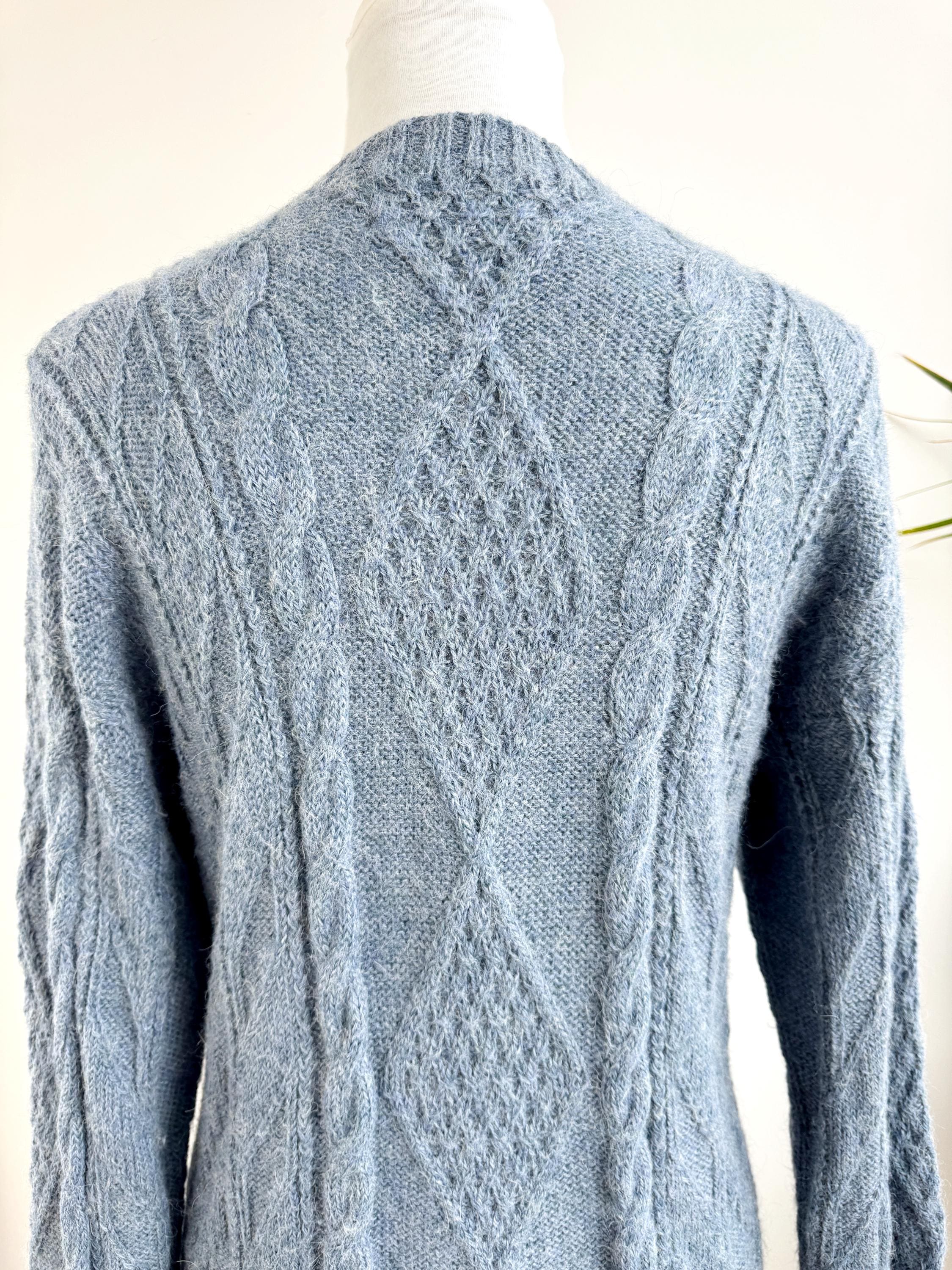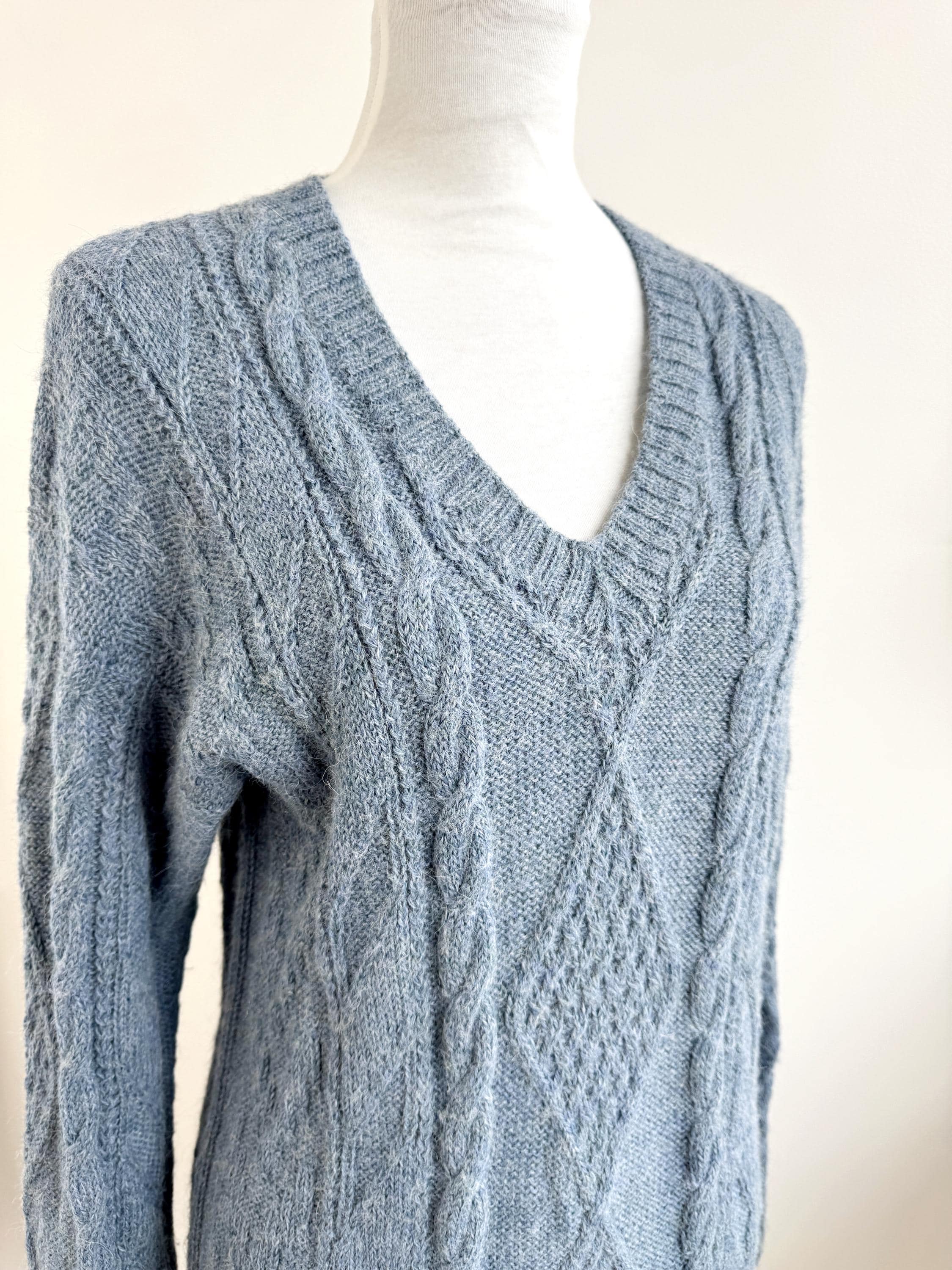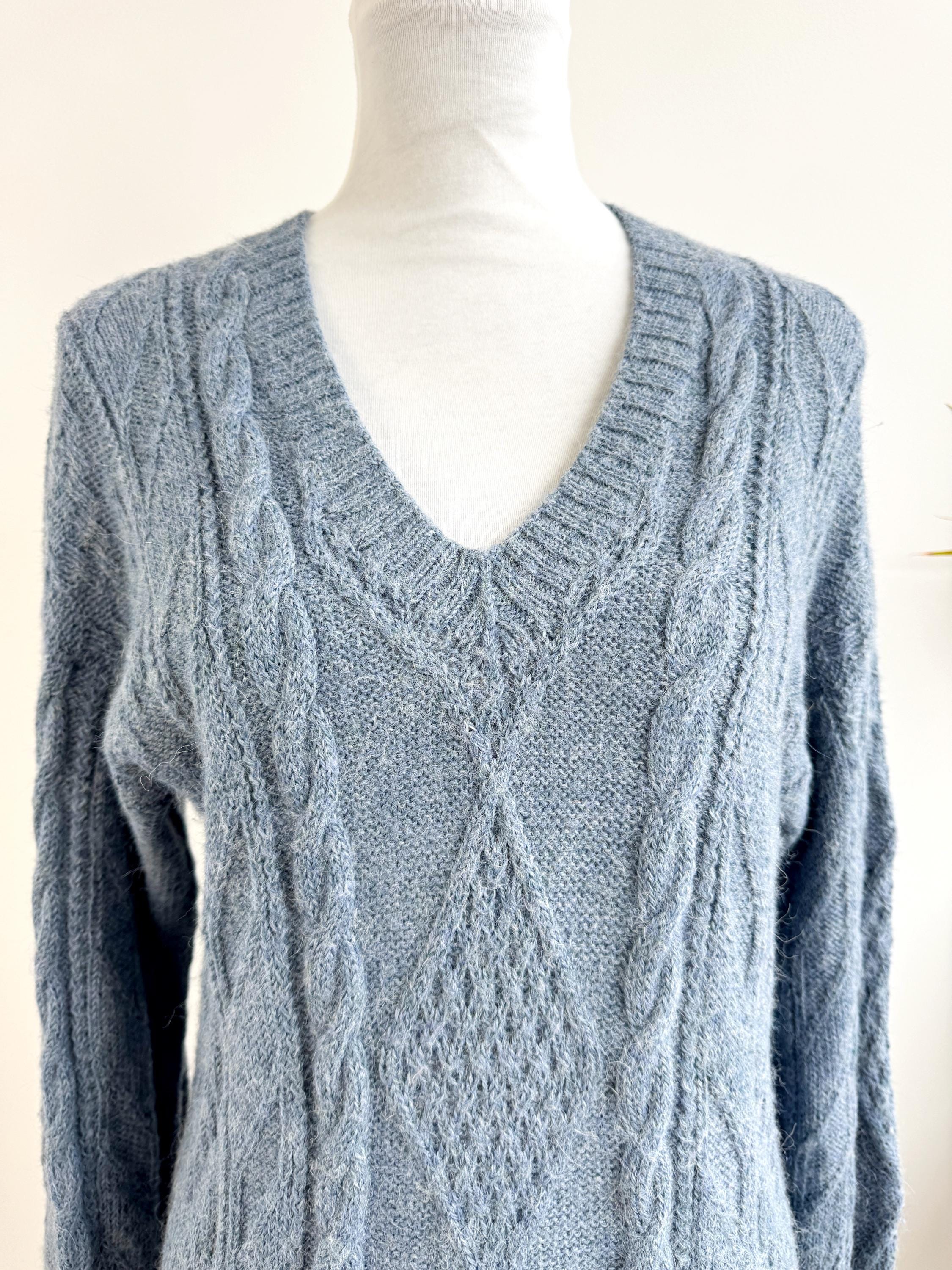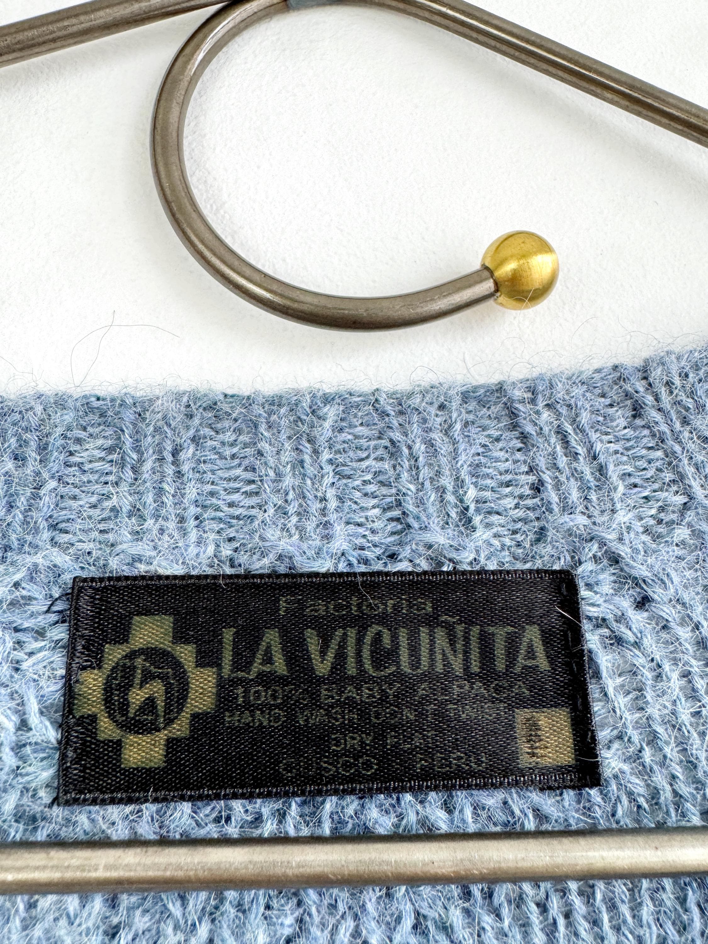 This is increadibly soft 100% baby alpaca Peruvian vintage sweater by La Vicuñita. Expertly crafted from 100% Baby Alpaca by La Vicuñita in Cusco, Peru, this soft baby alpaca pullover features a sophisticated dusty blue hue that pairs perfectly with denim or neutral linens.