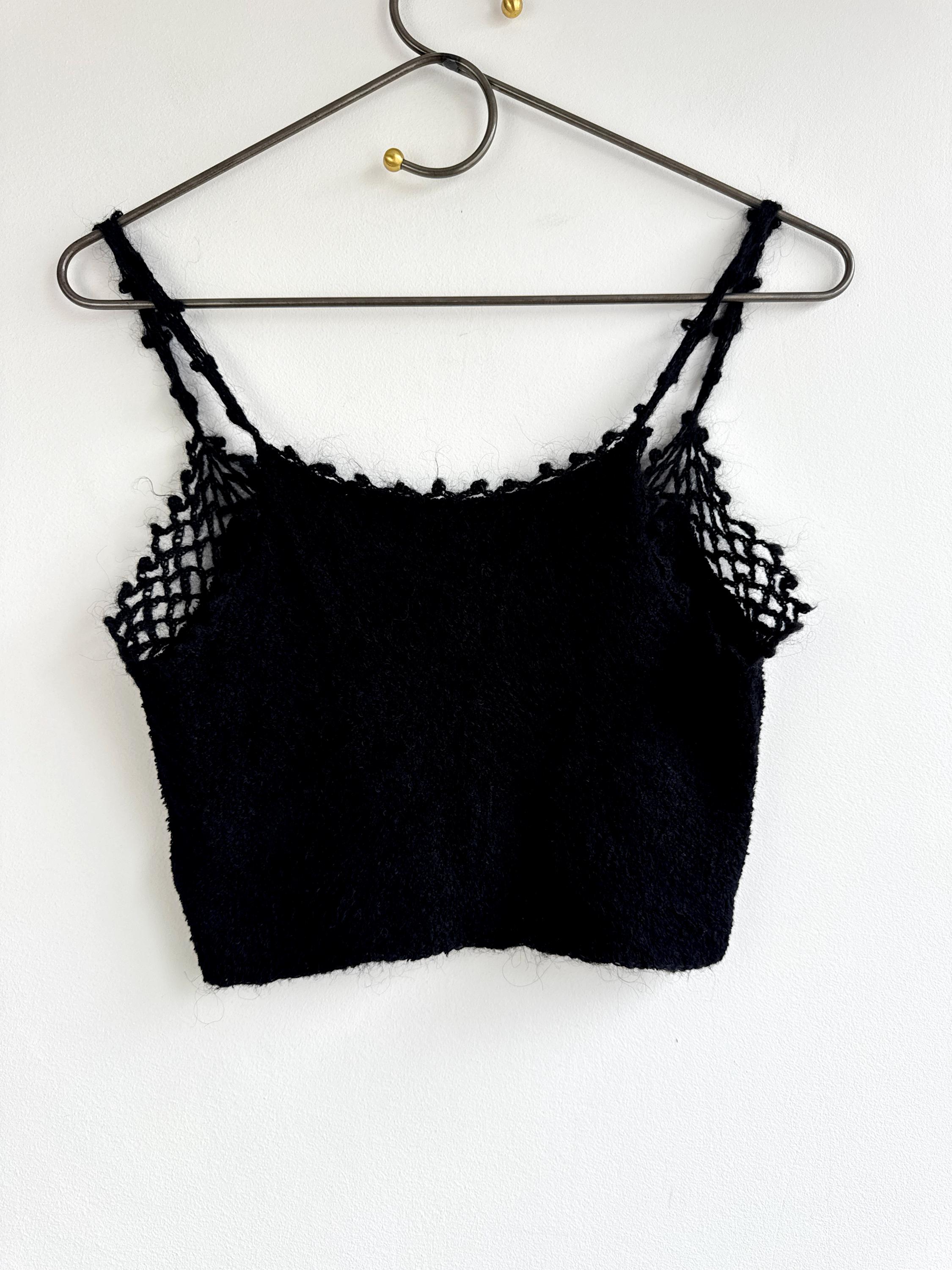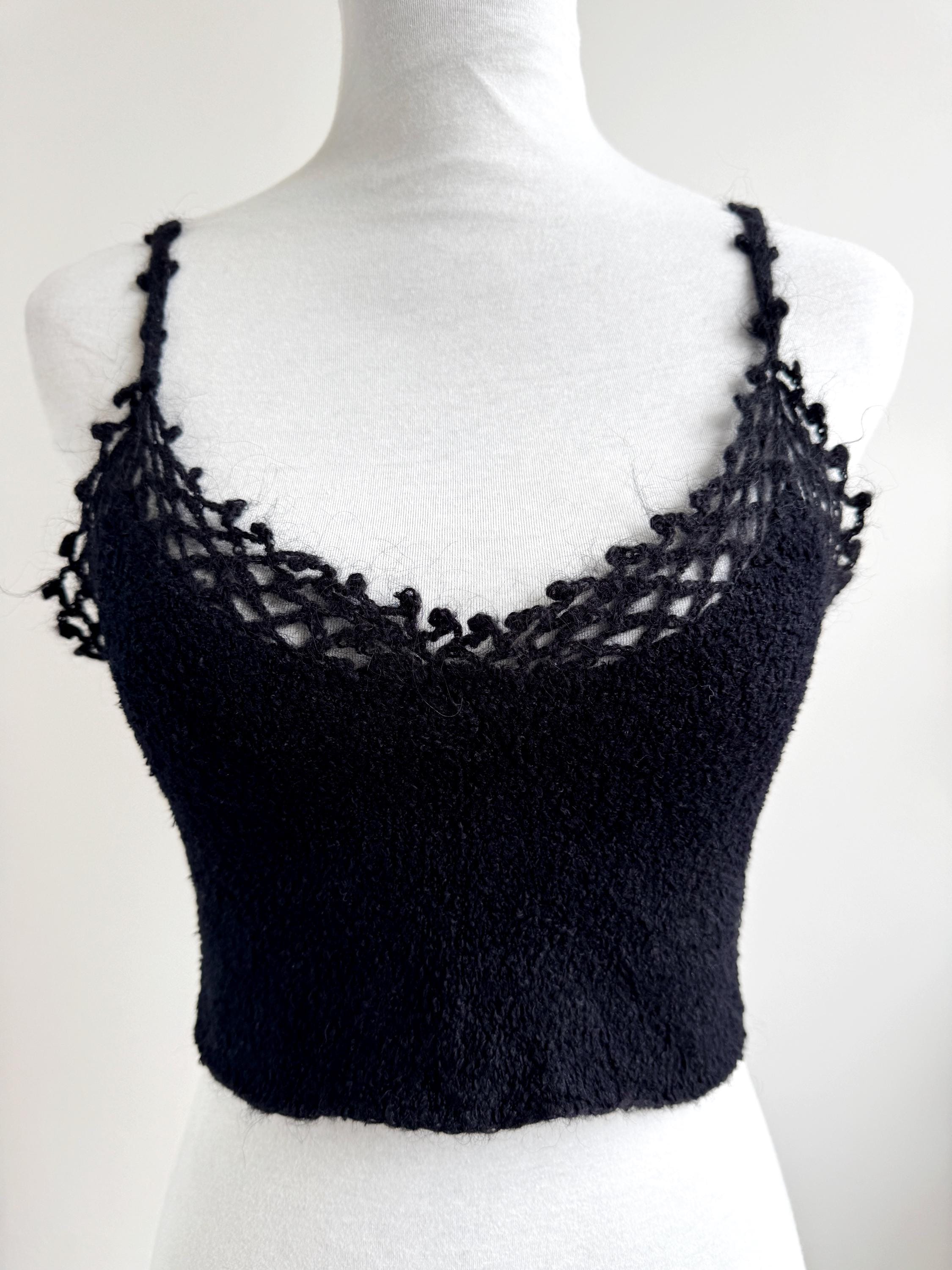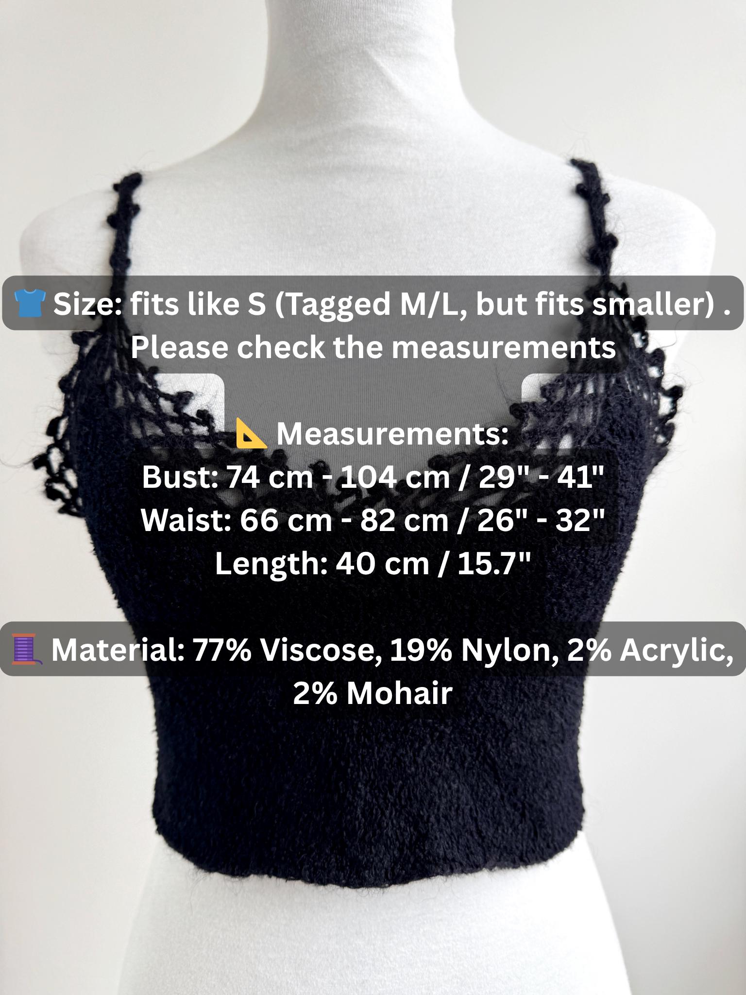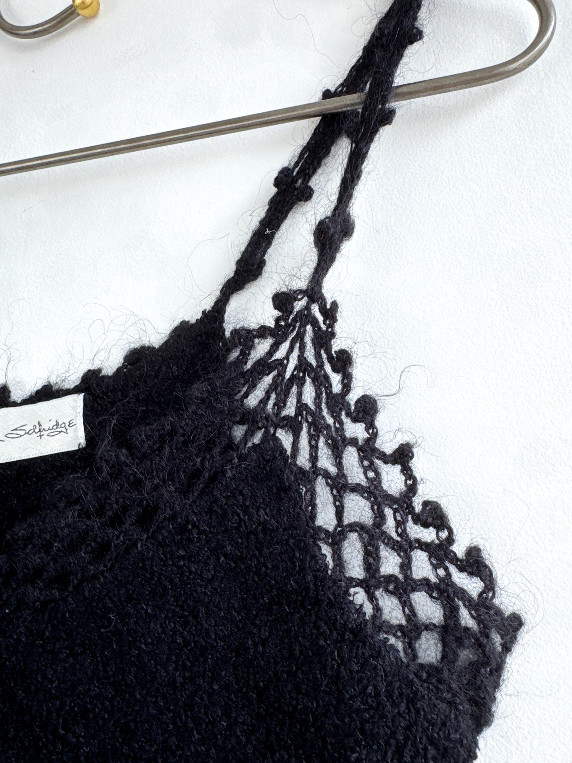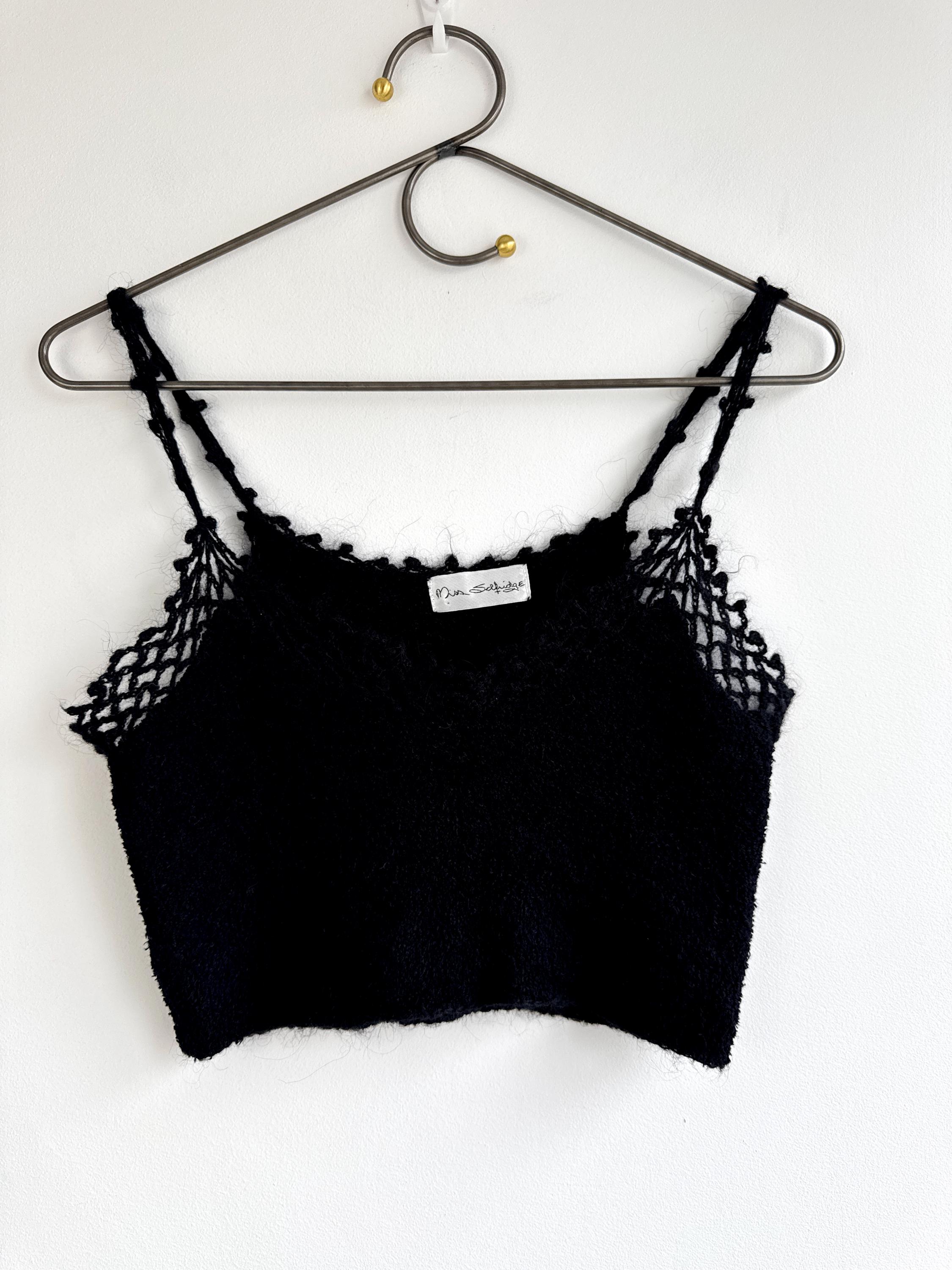 Elevate your wardrobe with this authentic vintage Miss Selfridge black crochet crop top. Perfectly capturing the late 90s to early 2000s aesthetic, this piece features a beautiful open-work lace knit along the neckline and delicate strappy detailing. The fabric is a high-quality blend including viscose and a touch of mohair, giving it a soft, "fuzzy" texture that feels as good as it looks.