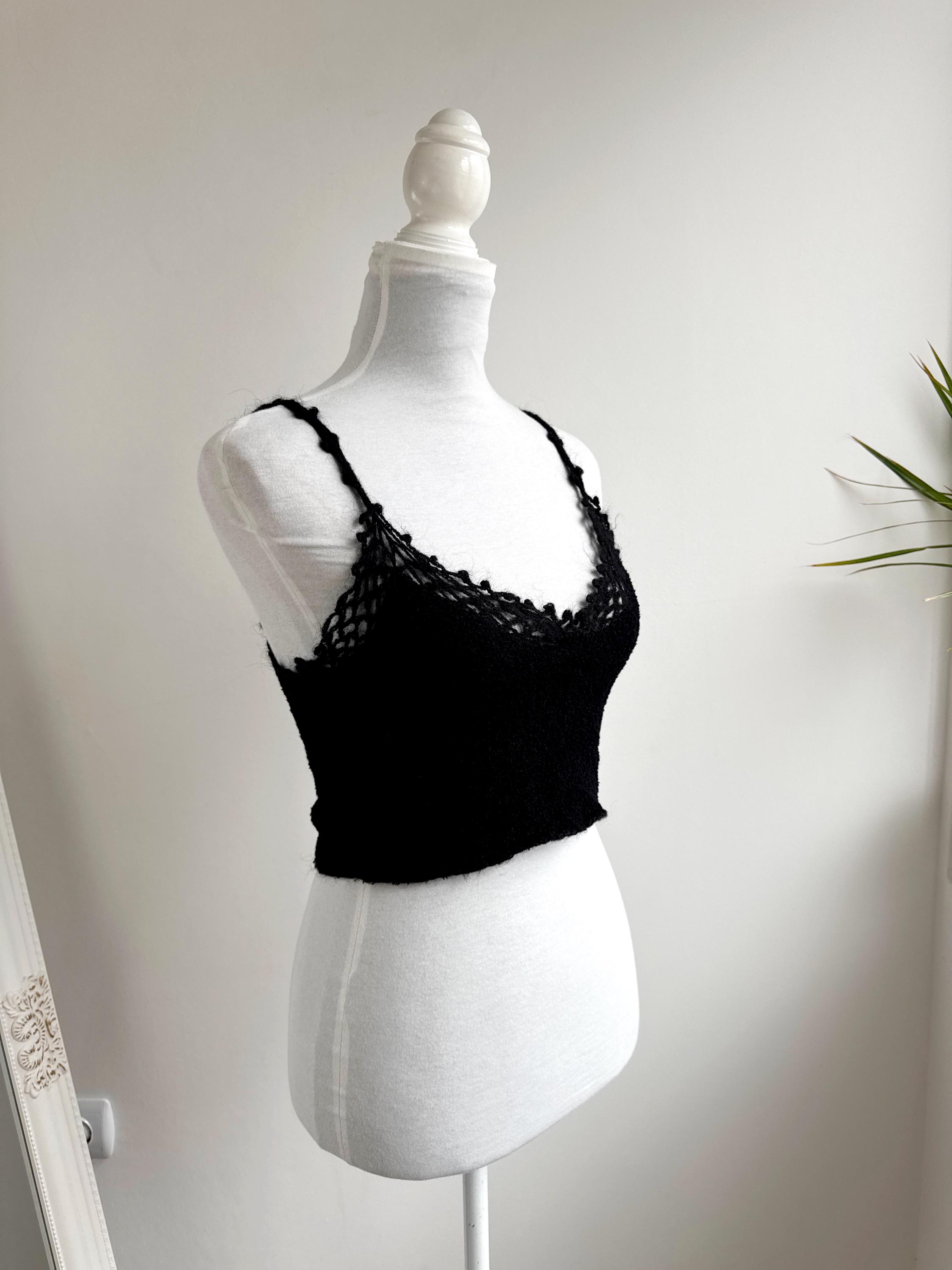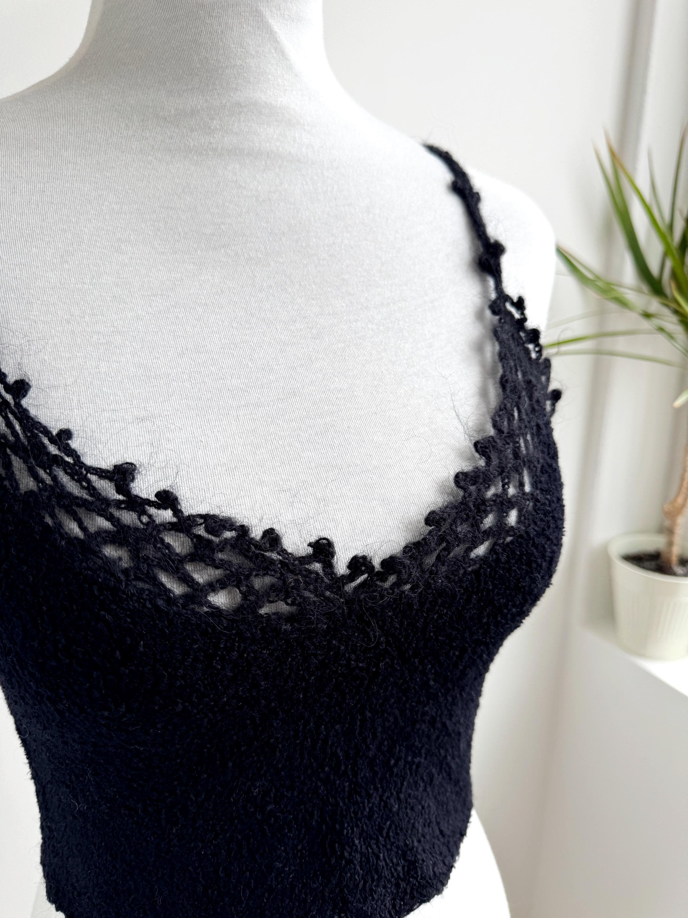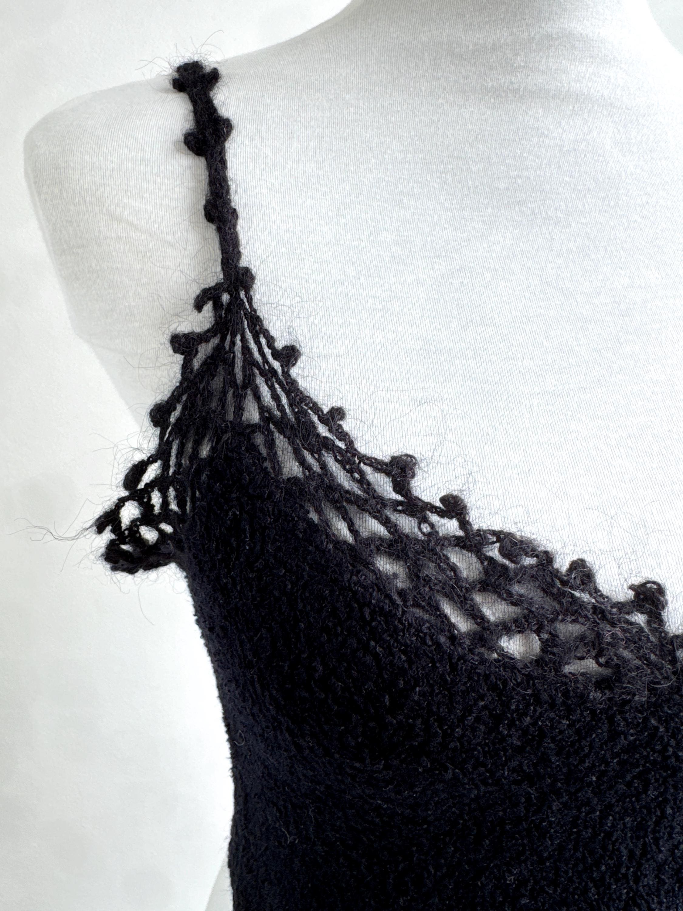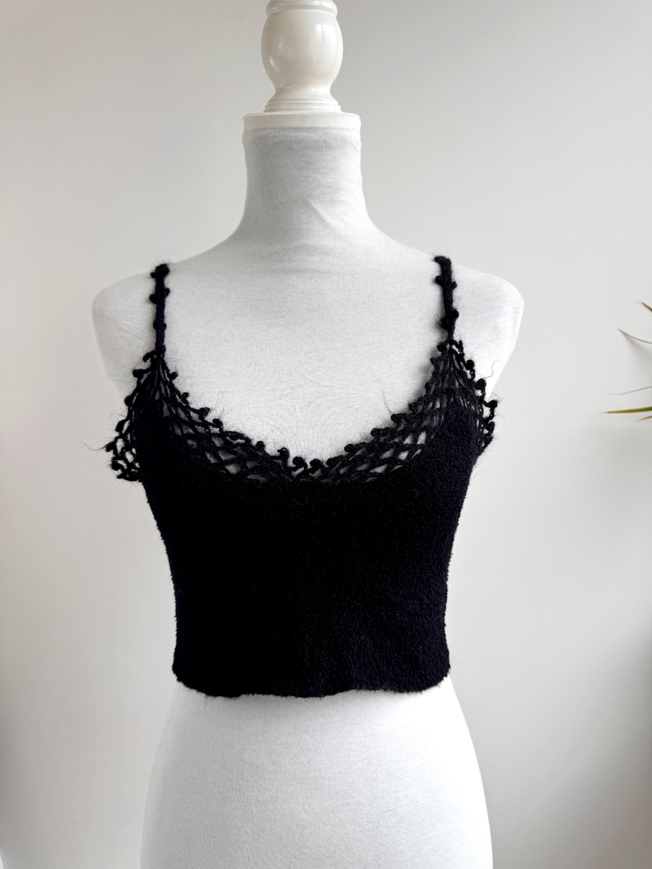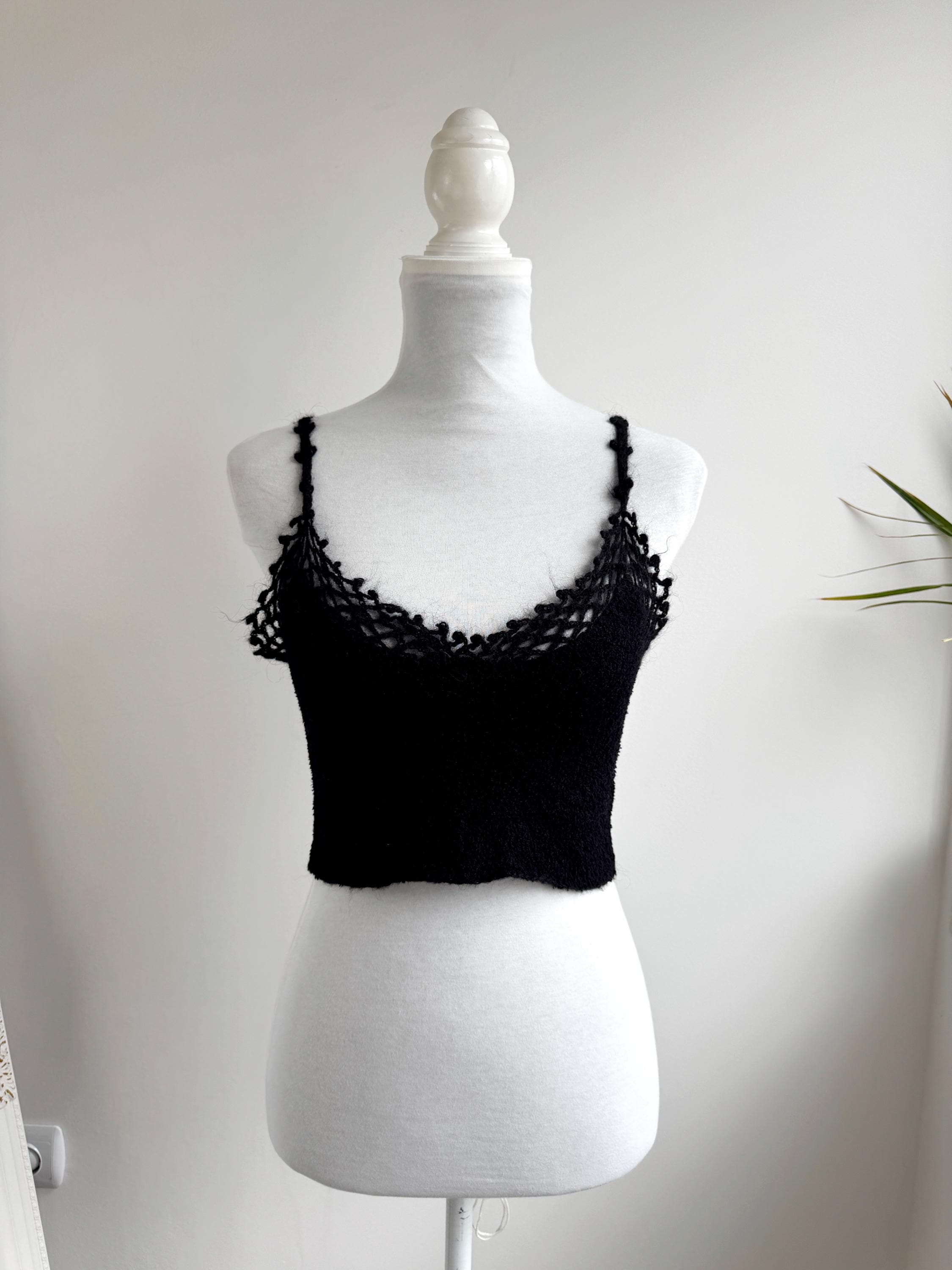 Elevate your wardrobe with this authentic vintage Miss Selfridge black crochet crop top. Perfectly capturing the late 90s to early 2000s aesthetic, this piece features a beautiful open-work lace knit along the neckline and delicate strappy detailing. The fabric is a high-quality blend including viscose and a touch of mohair, giving it a soft, "fuzzy" texture that feels as good as it looks.