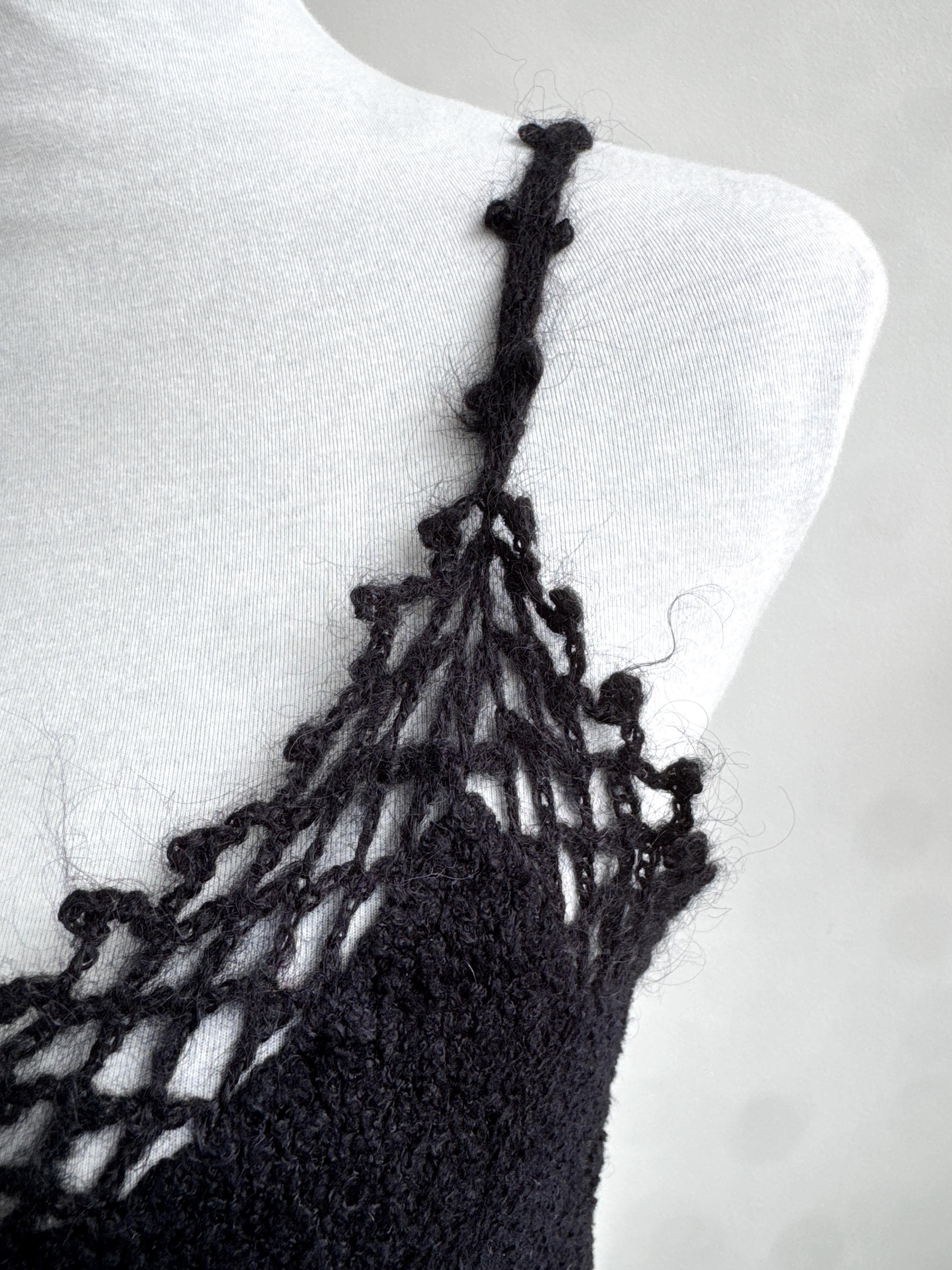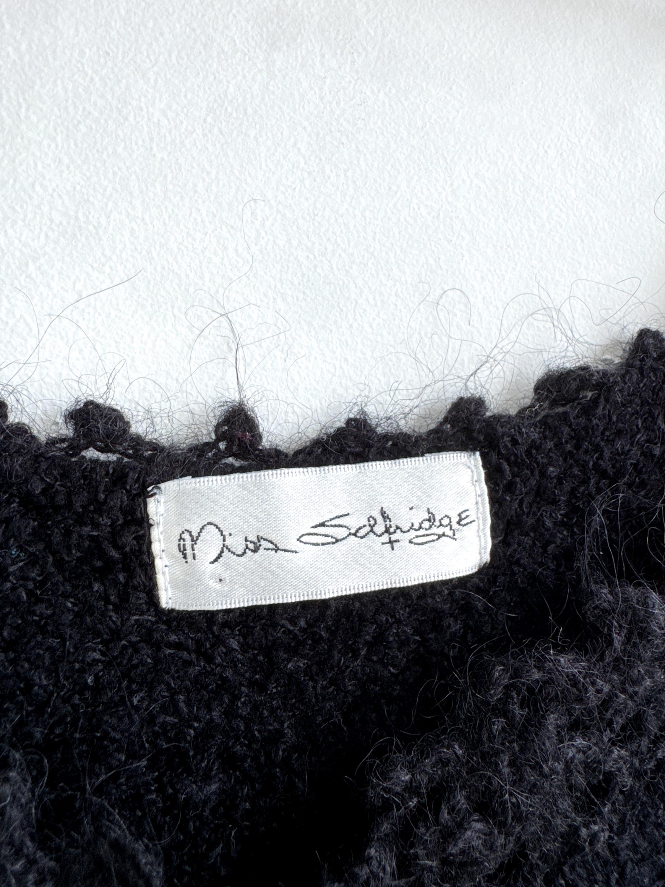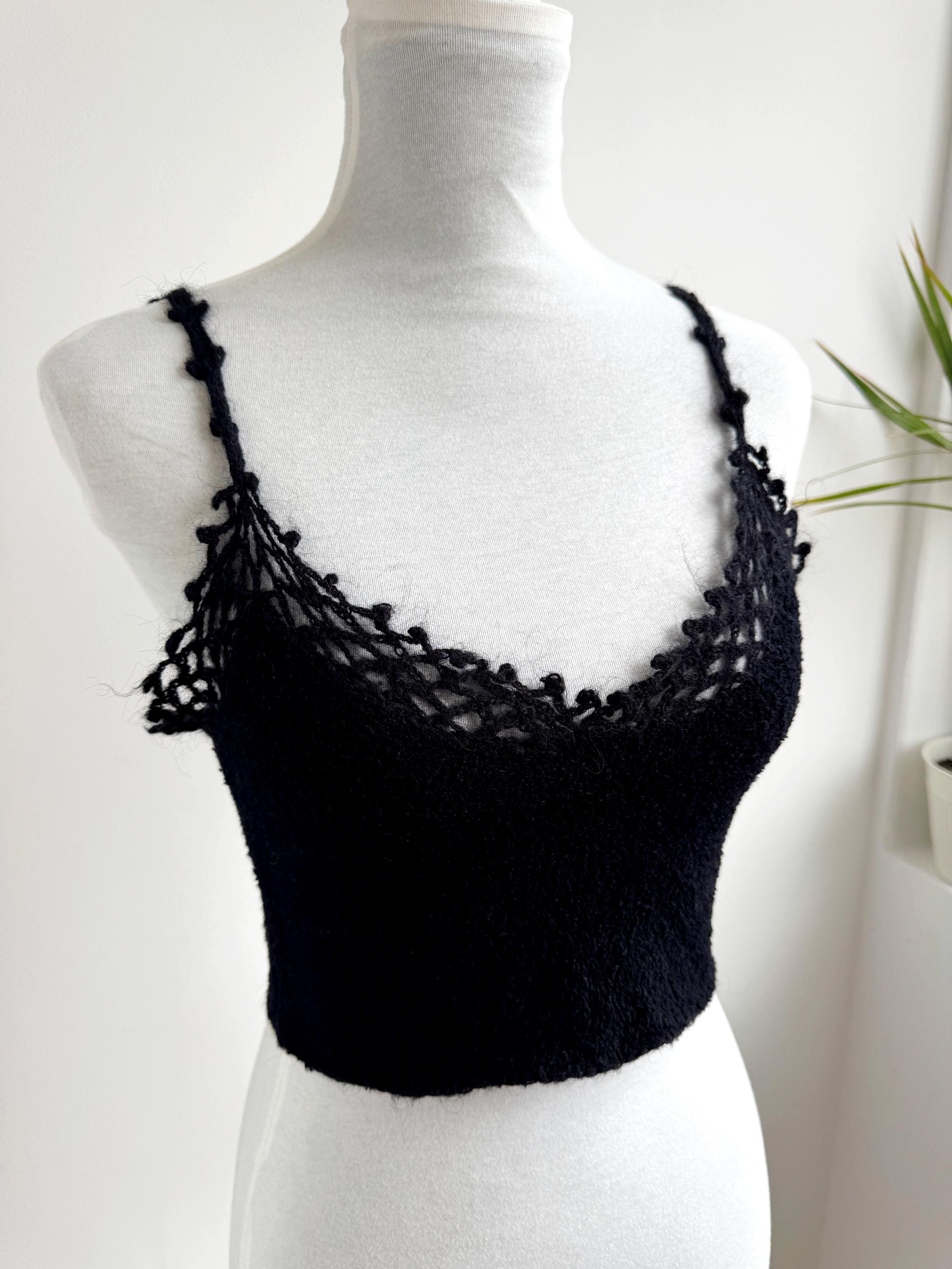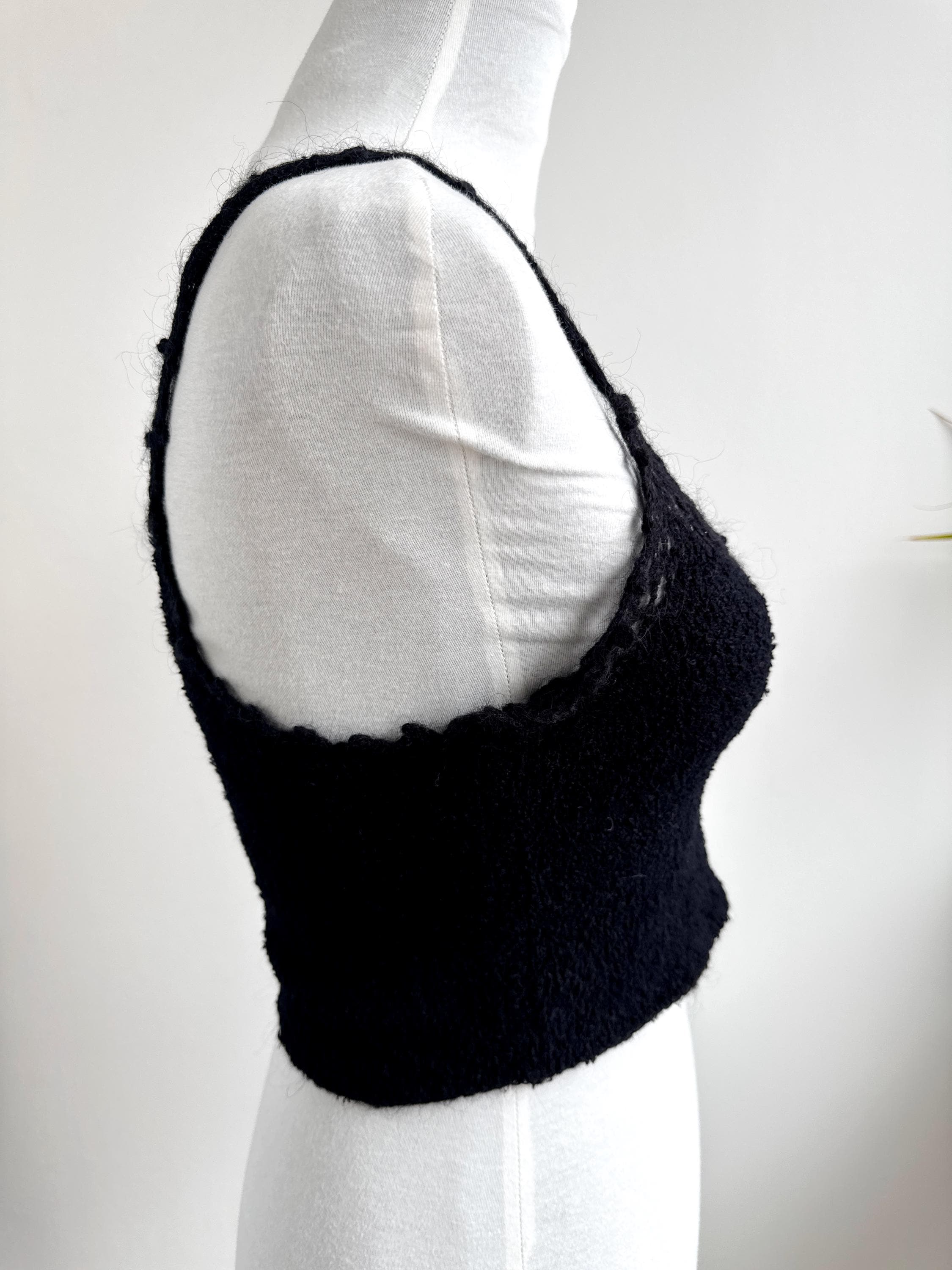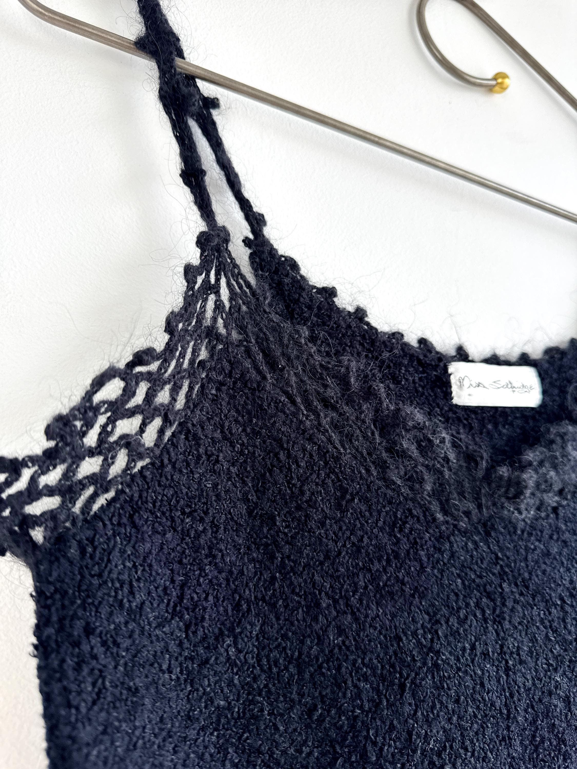 Elevate your wardrobe with this authentic vintage Miss Selfridge black crochet crop top. Perfectly capturing the late 90s to early 2000s aesthetic, this piece features a beautiful open-work lace knit along the neckline and delicate strappy detailing. The fabric is a high-quality blend including viscose and a touch of mohair, giving it a soft, "fuzzy" texture that feels as good as it looks.
