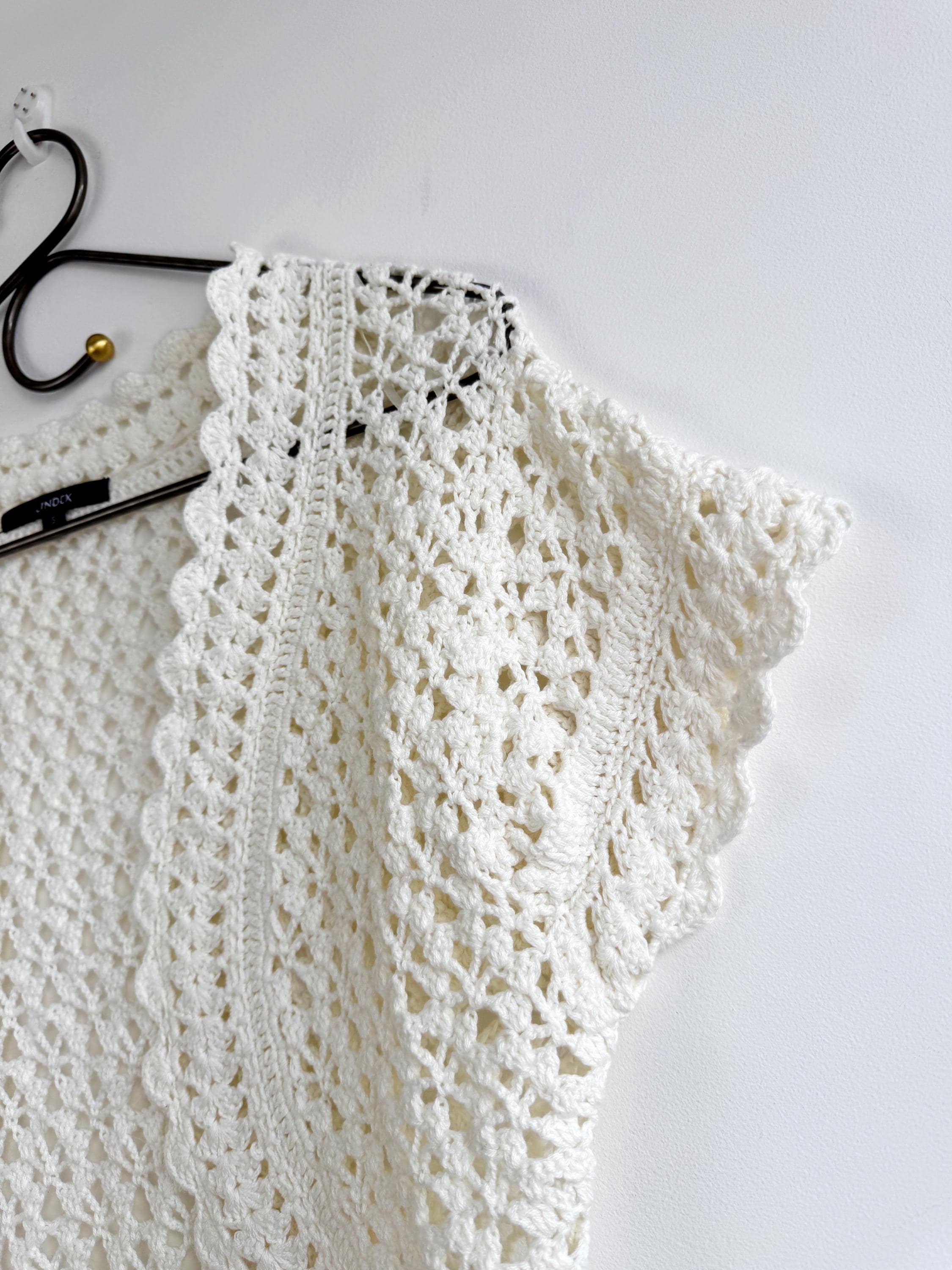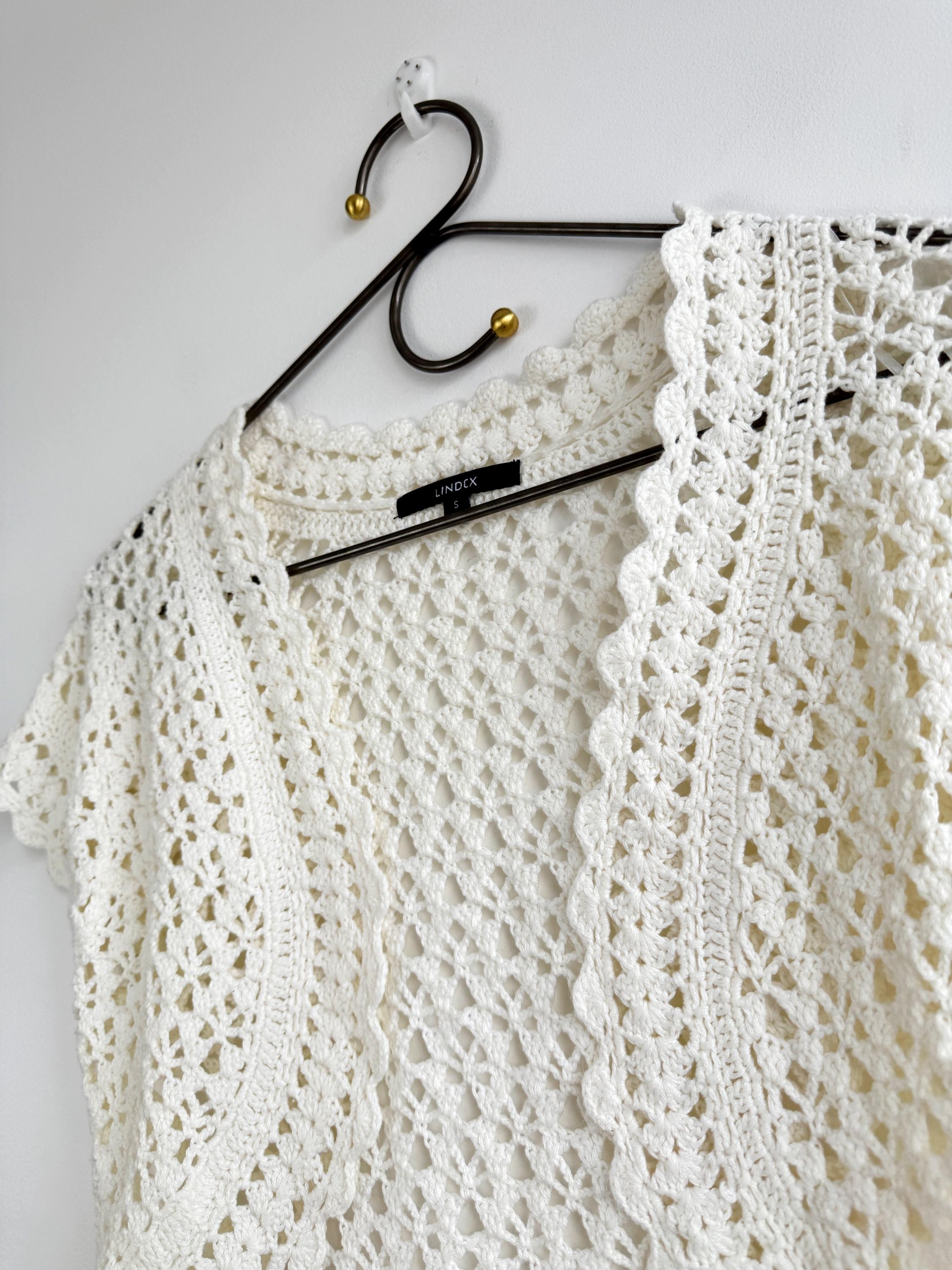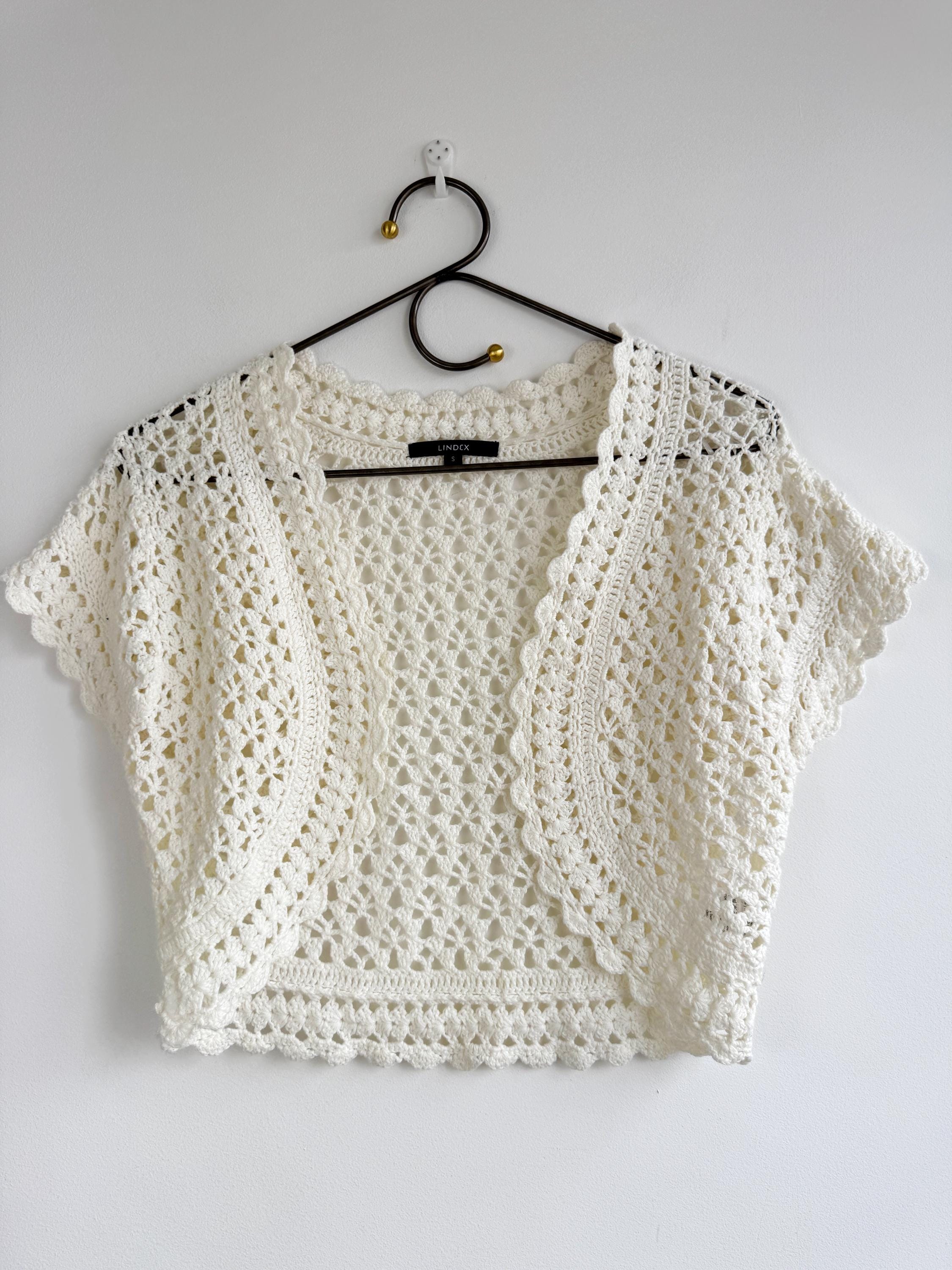 Crafted by the Swedish brand Lindex, this versatile layering piece is the ideal lightweight layer for a spring wedding, a summer festival, or a chic evening out. The soft cotton-blend material provides a comfortable stretch, allowing it to drape gracefully over dresses or camisoles. Whether you are aiming for a 70s-inspired boho look or a clean, cottagecore aesthetic, this timeless white lace crochet shrug is a standout addition to any curated vintage collection.