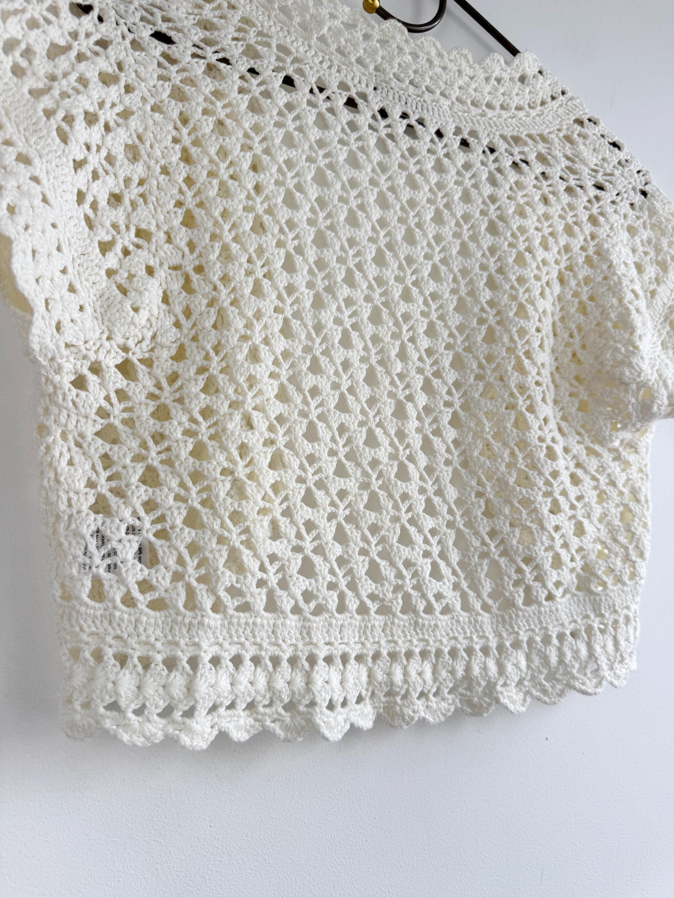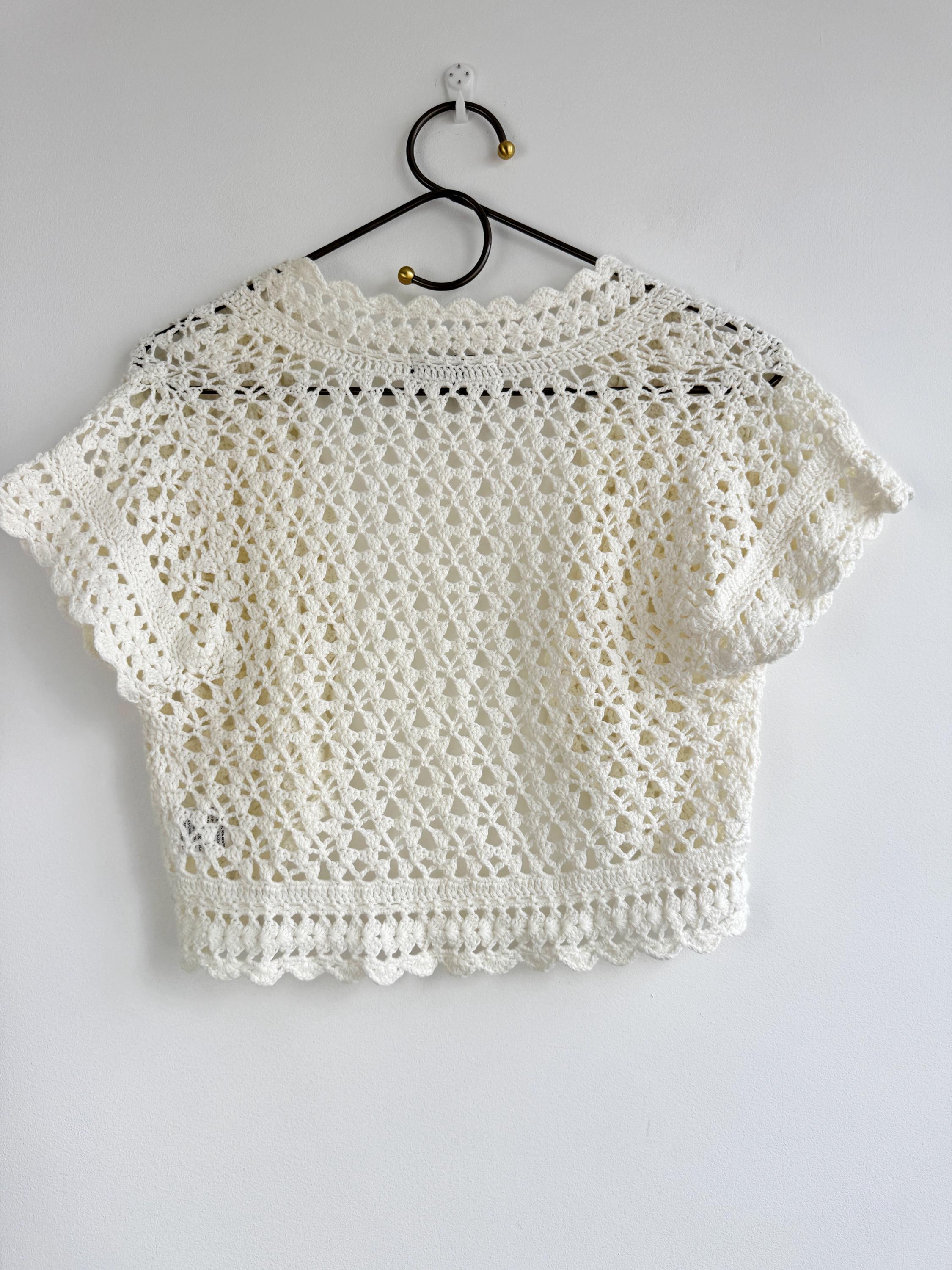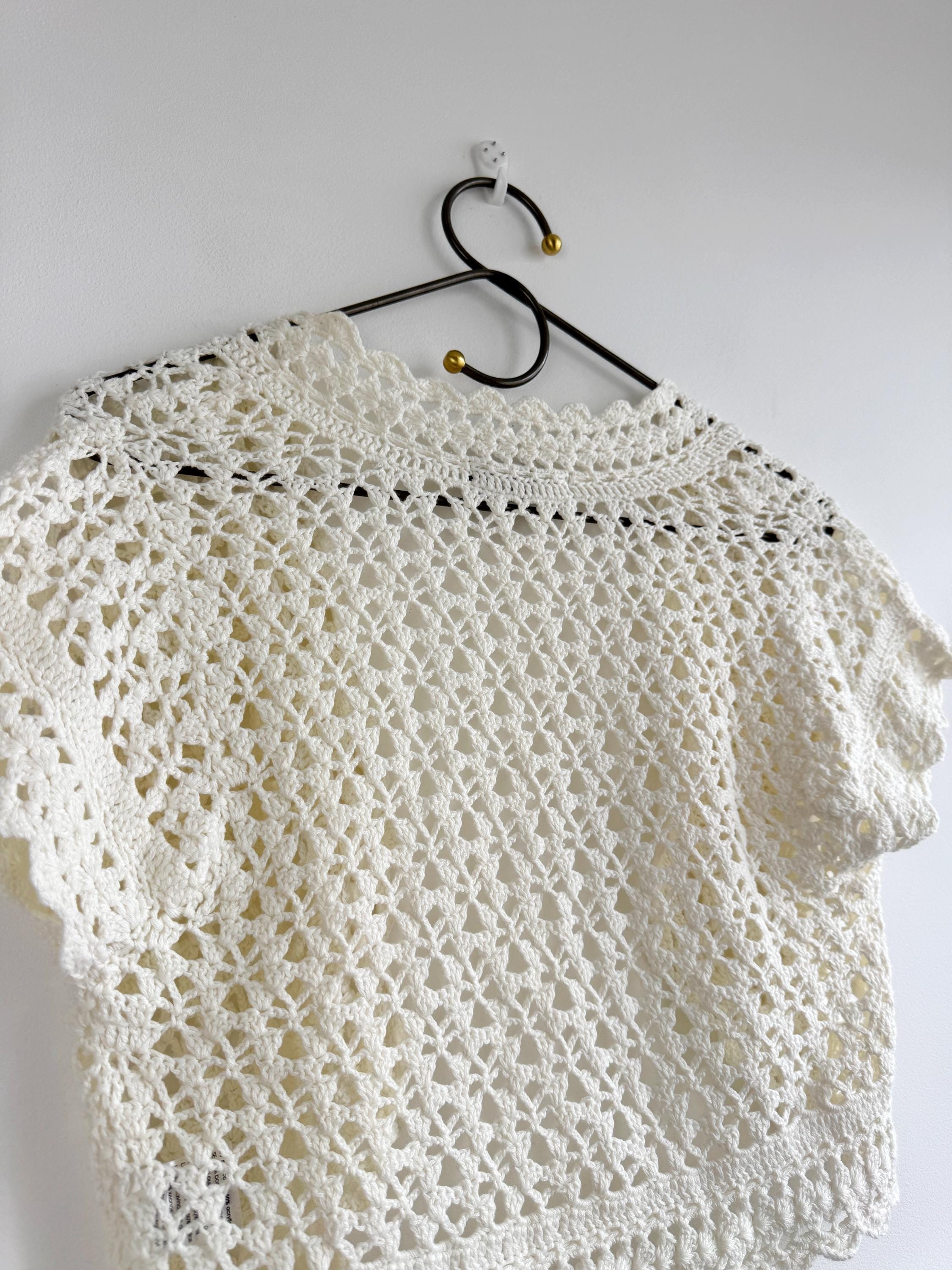 Crafted by the Swedish brand Lindex, this versatile layering piece is the ideal lightweight layer for a spring wedding, a summer festival, or a chic evening out. The soft cotton-blend material provides a comfortable stretch, allowing it to drape gracefully over dresses or camisoles. Whether you are aiming for a 70s-inspired boho look or a clean, cottagecore aesthetic, this timeless white lace crochet shrug is a standout addition to any curated vintage collection.