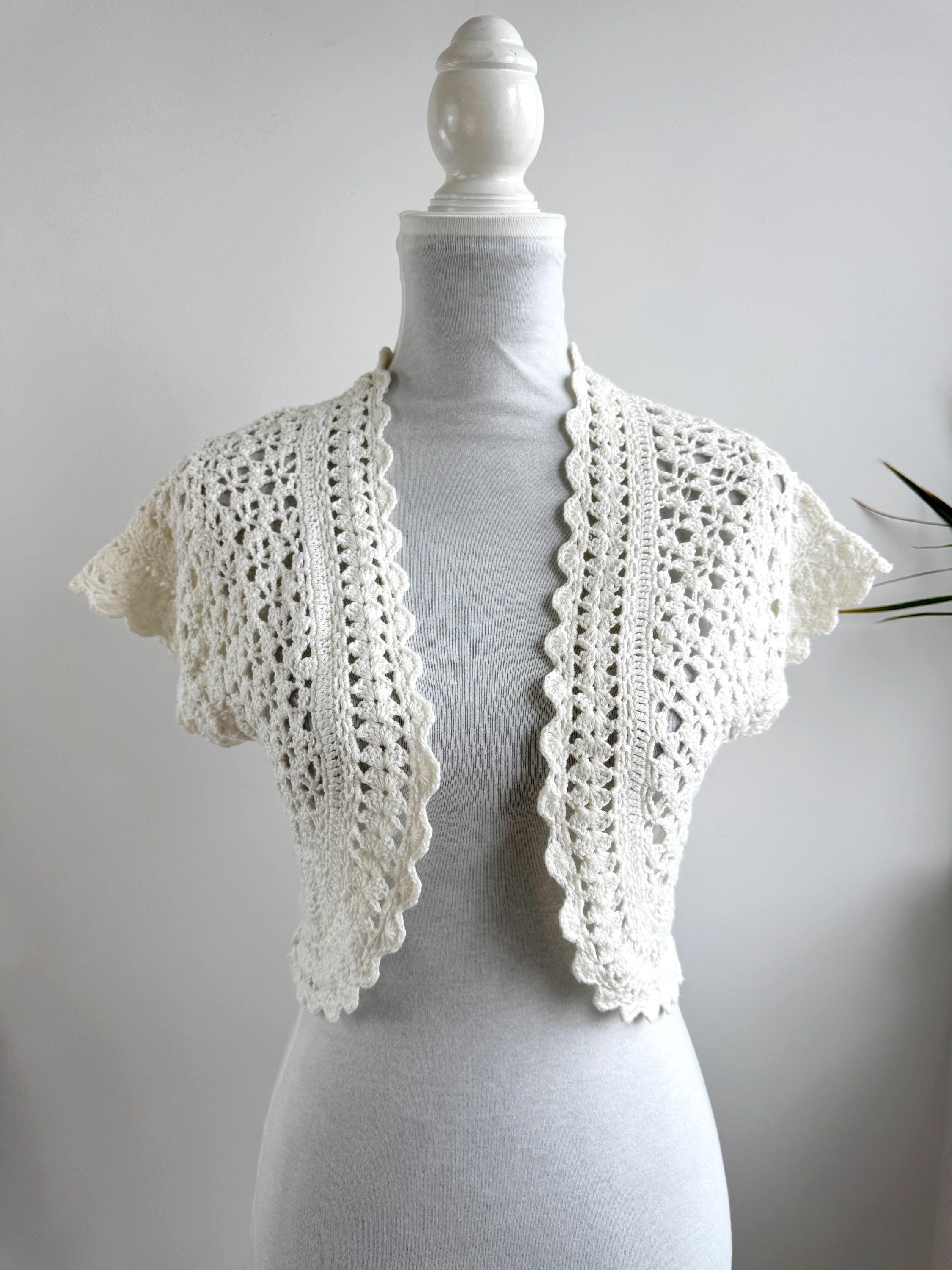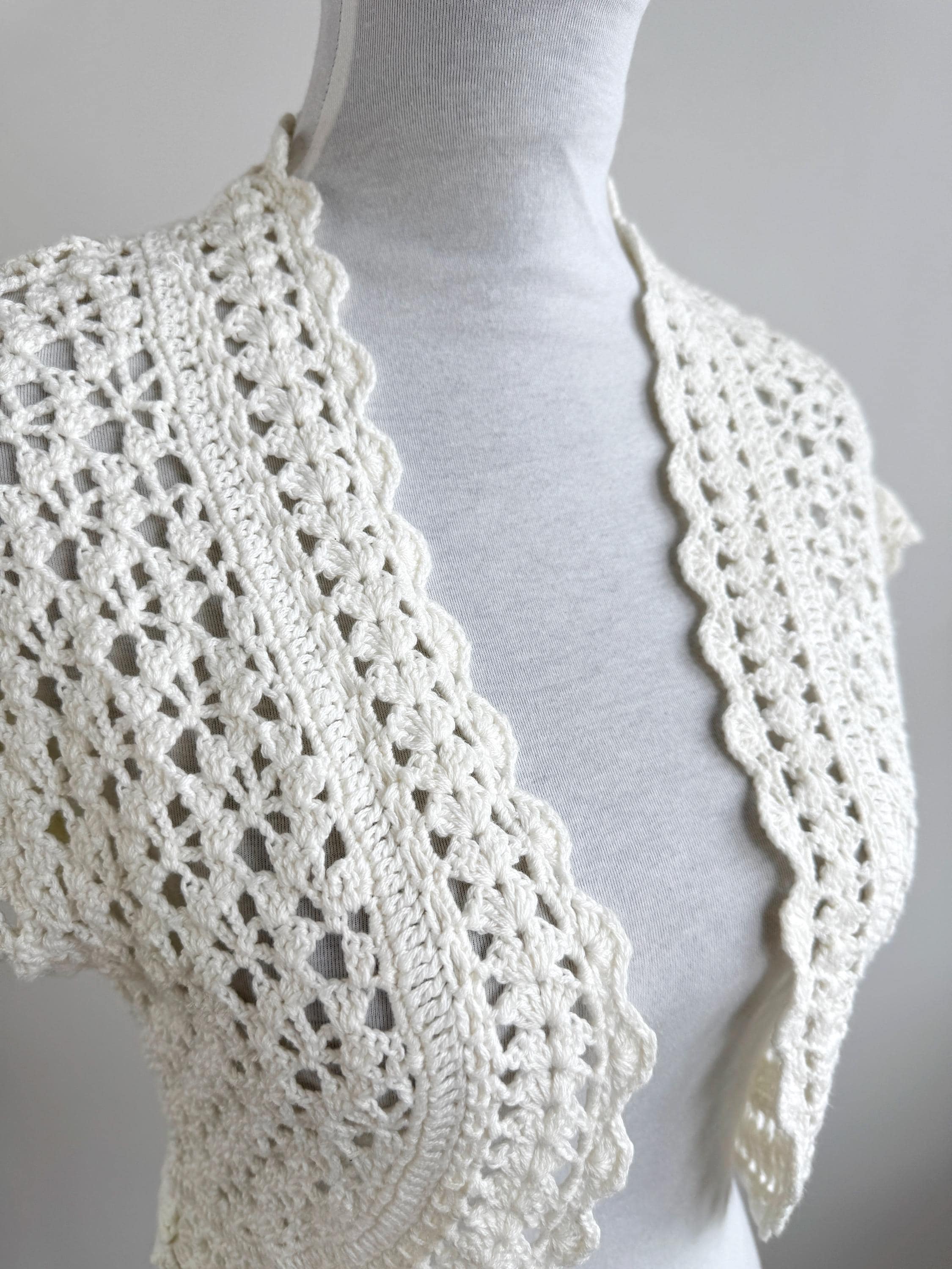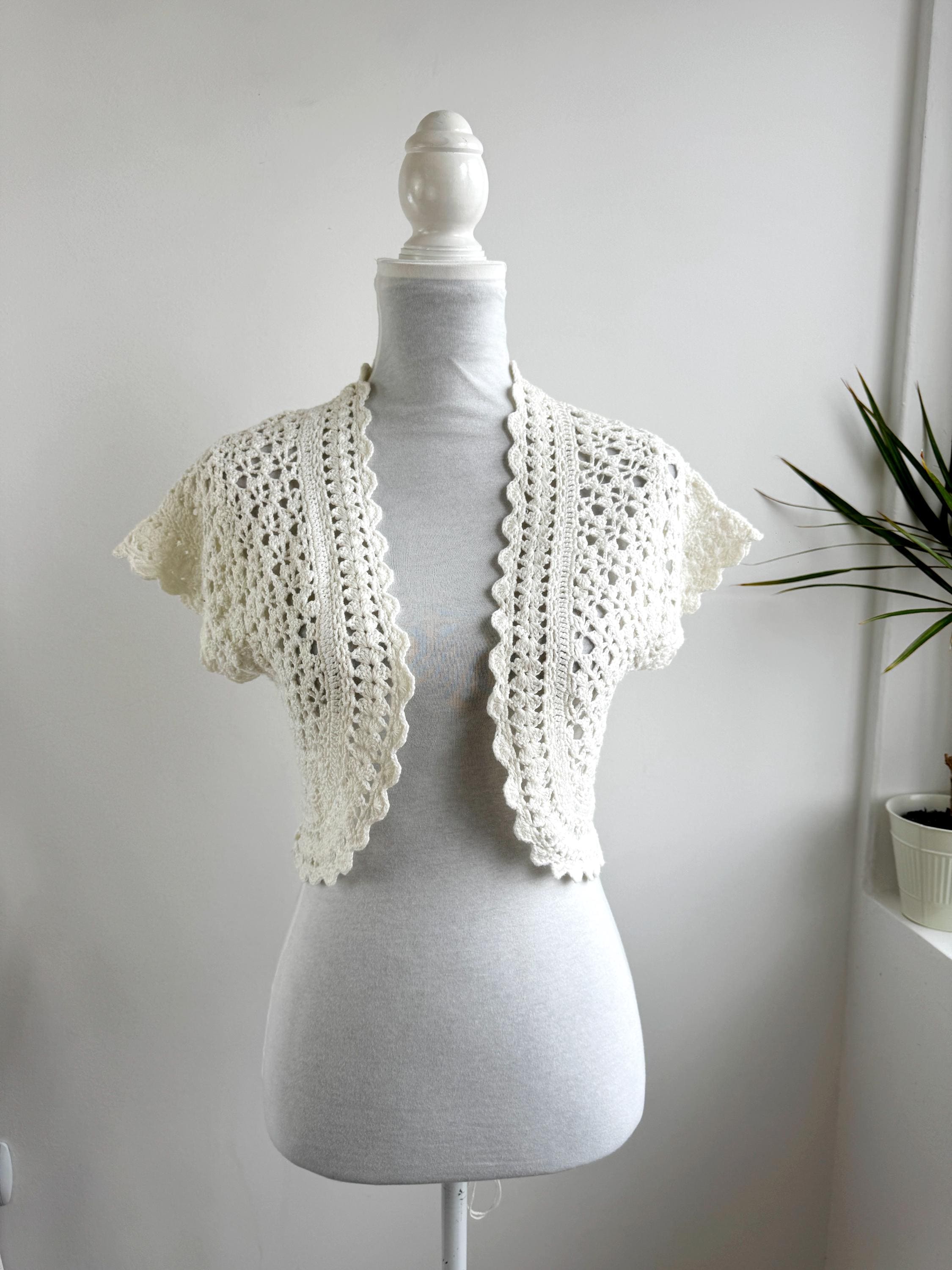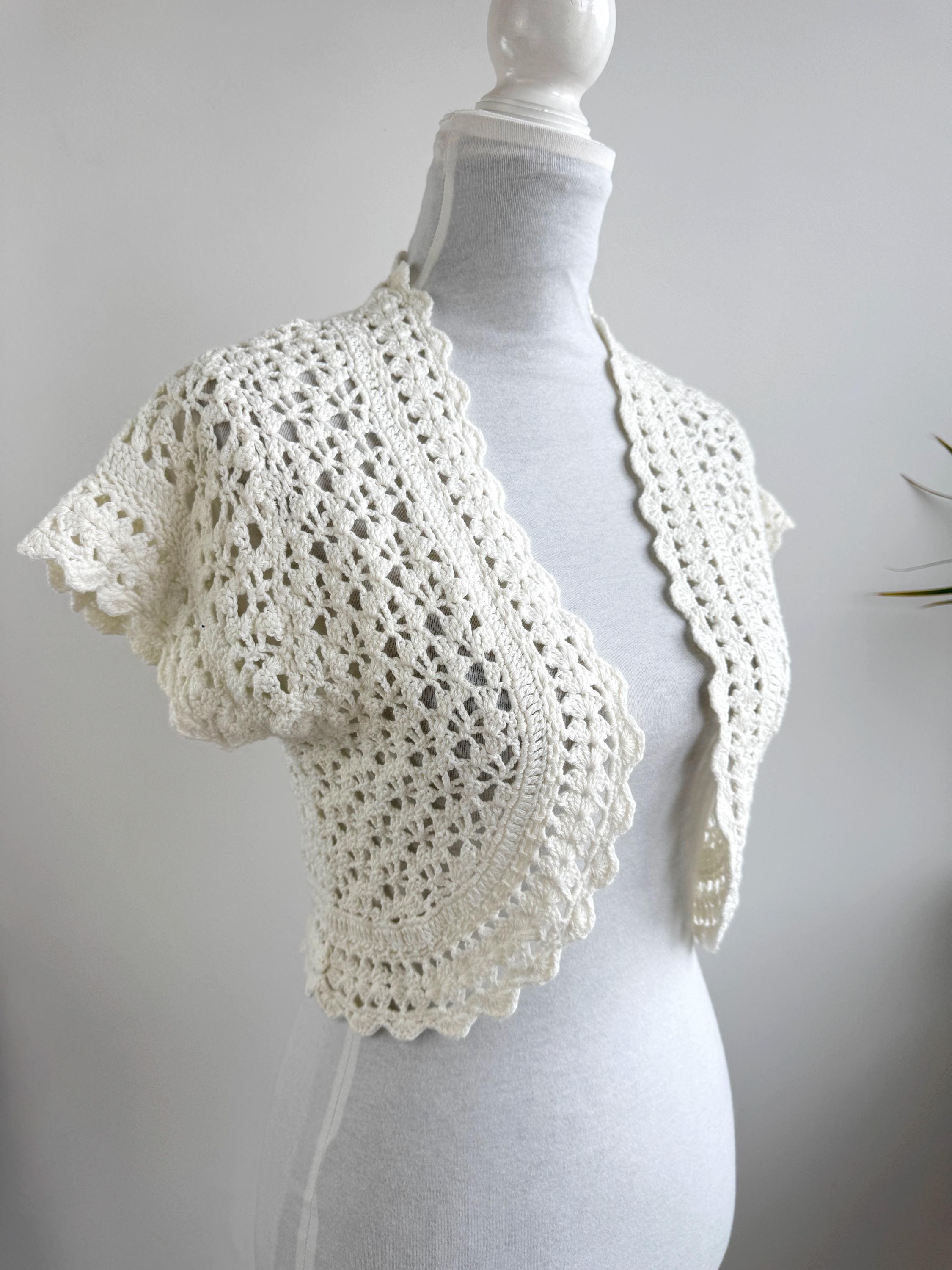 Add a touch of romantic nostalgia to your wardrobe with this exquisite white crochet bolero shrug. Perfectly capturing the essence of bohemian elegance, this delicate lace cardigan features an intricate floral open-knit pattern and a beautifully scalloped "shell" border that frames the face and hemline.