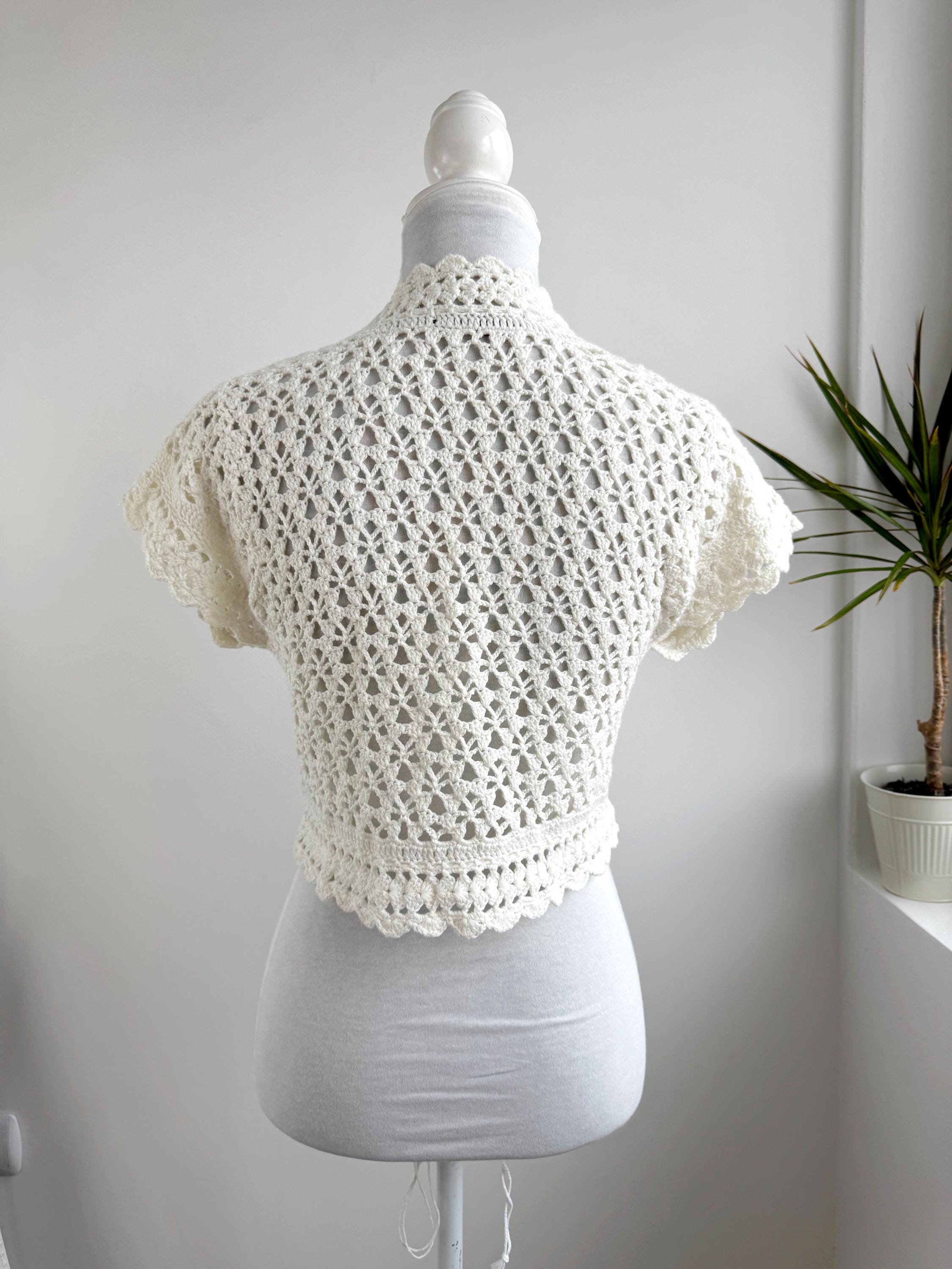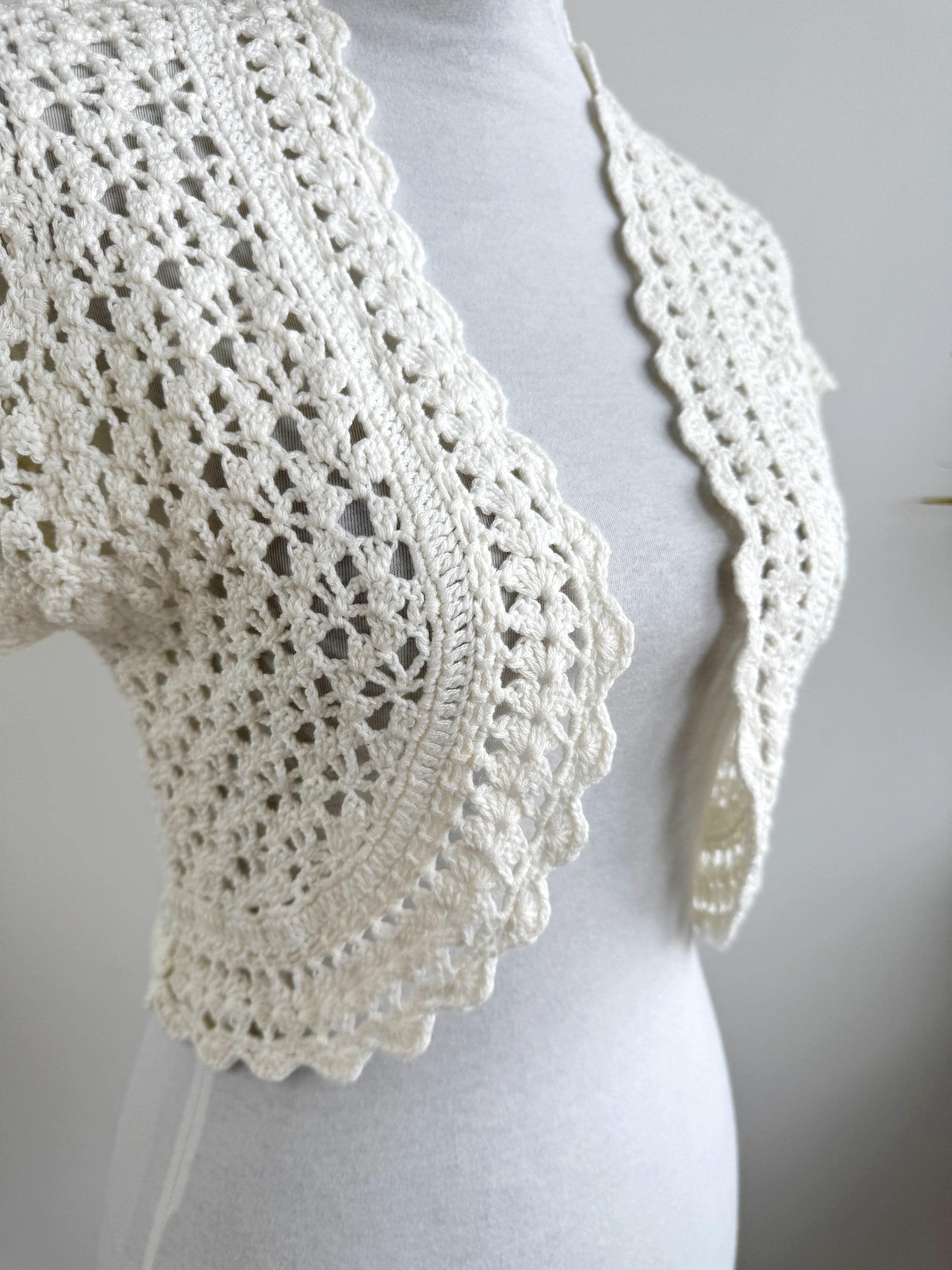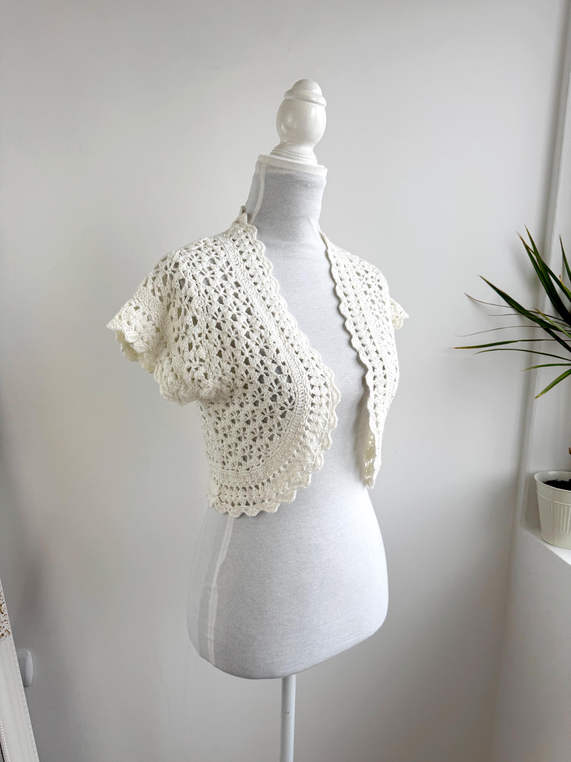 Add a touch of romantic nostalgia to your wardrobe with this exquisite white crochet bolero shrug. Perfectly capturing the essence of bohemian elegance, this delicate lace cardigan features an intricate floral open-knit pattern and a beautifully scalloped "shell" border that frames the face and hemline.