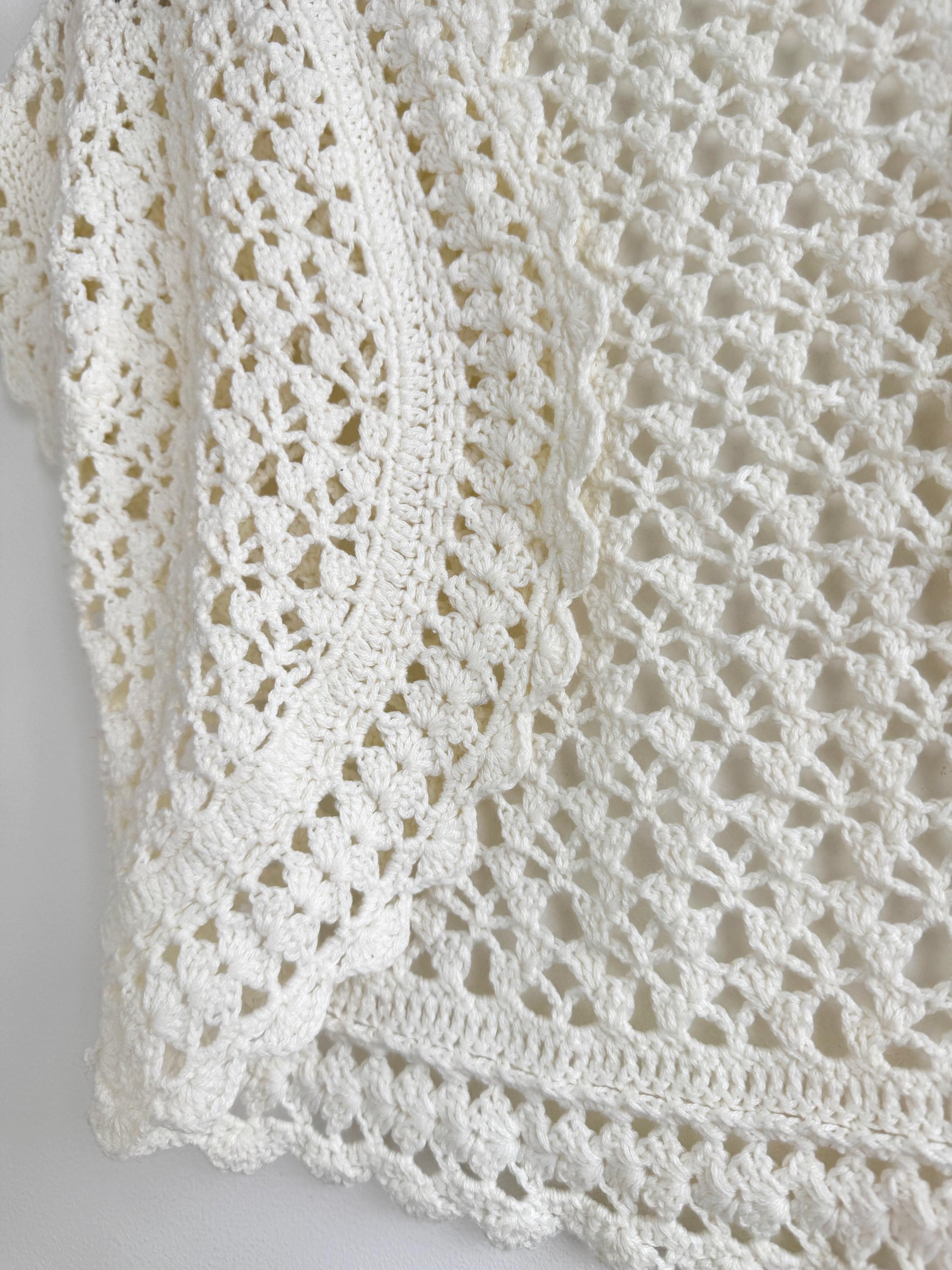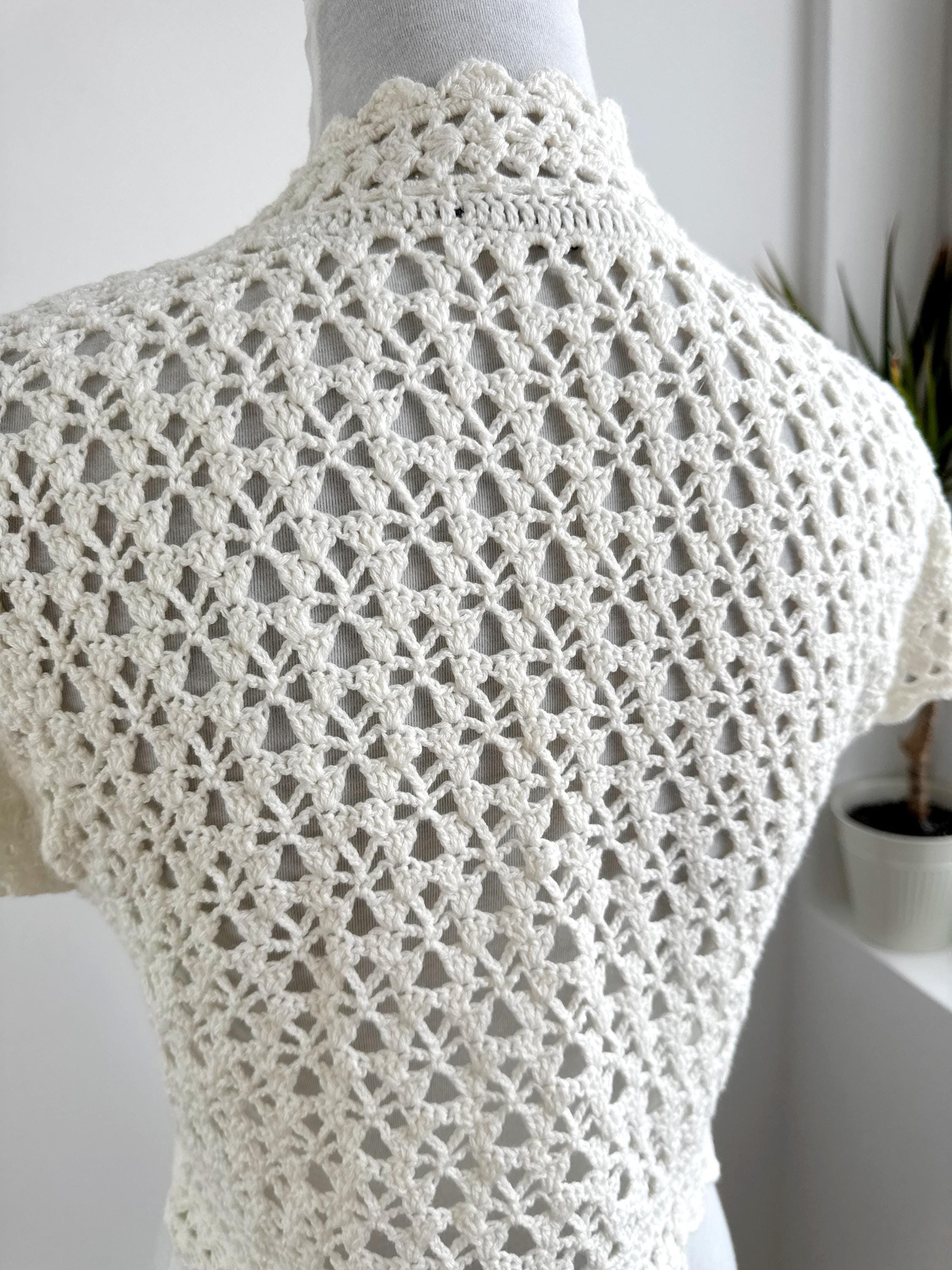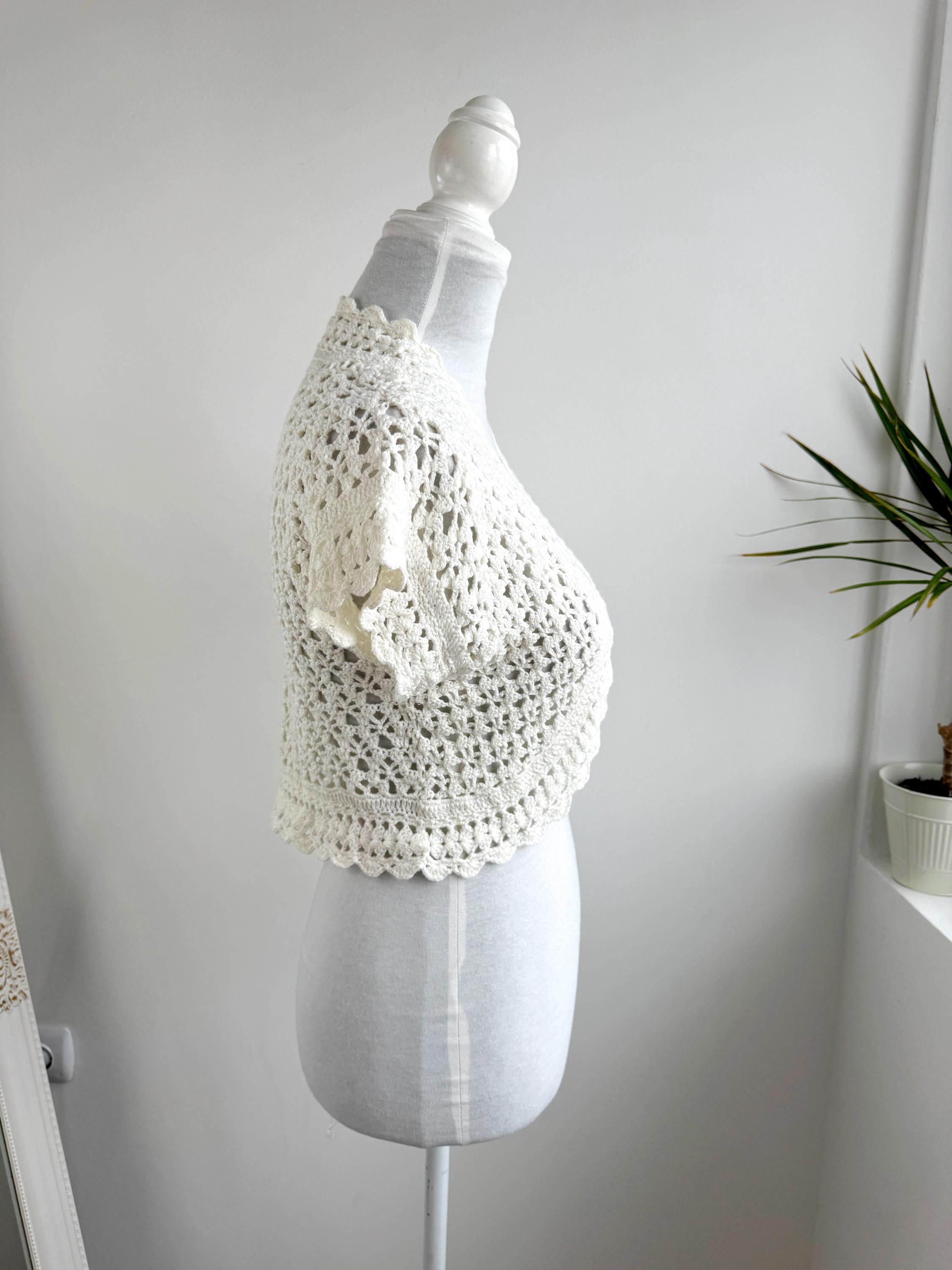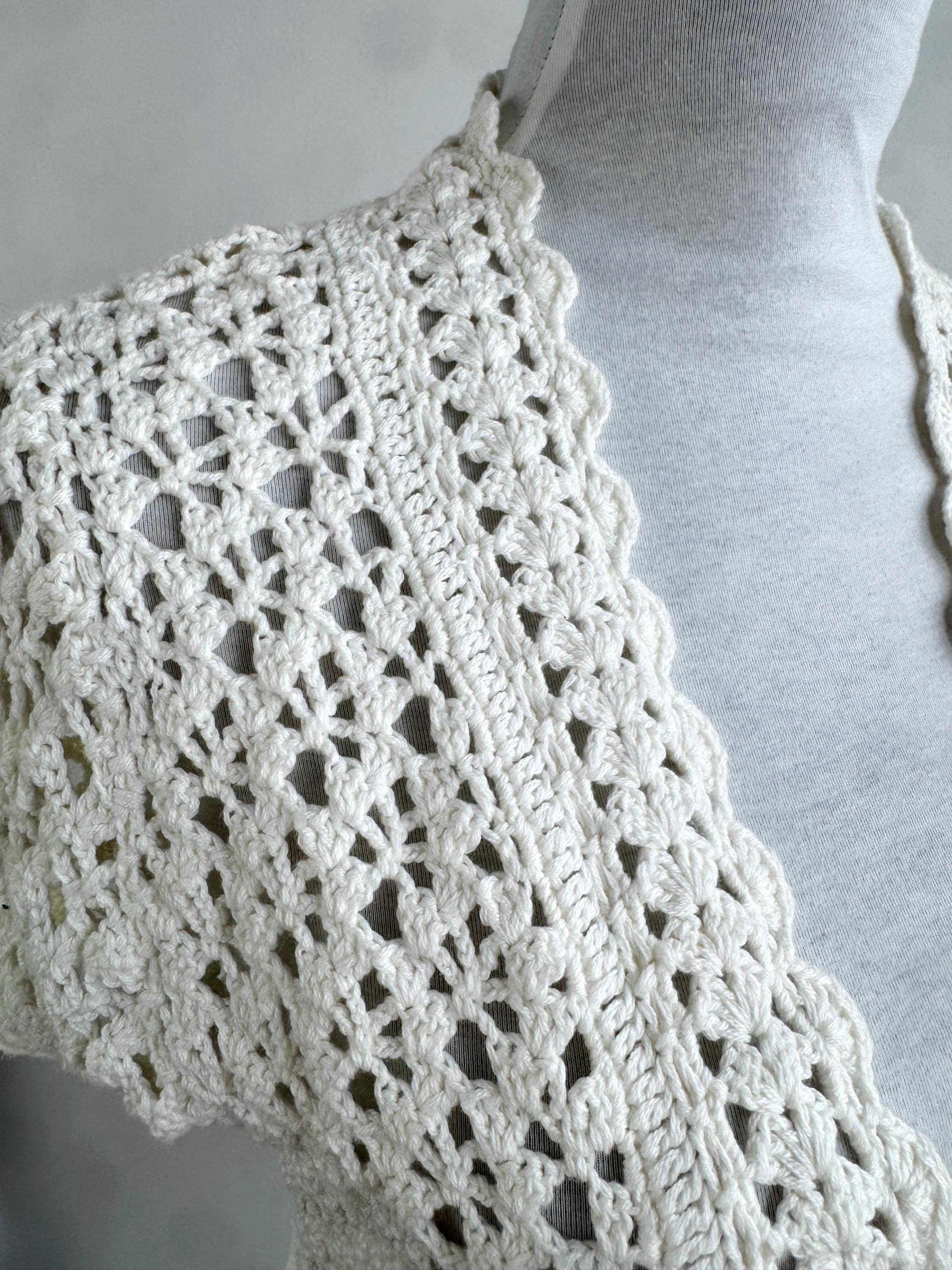 Add a touch of romantic nostalgia to your wardrobe with this exquisite white crochet bolero shrug. Perfectly capturing the essence of bohemian elegance, this delicate lace cardigan features an intricate floral open-knit pattern and a beautifully scalloped "shell" border that frames the face and hemline.