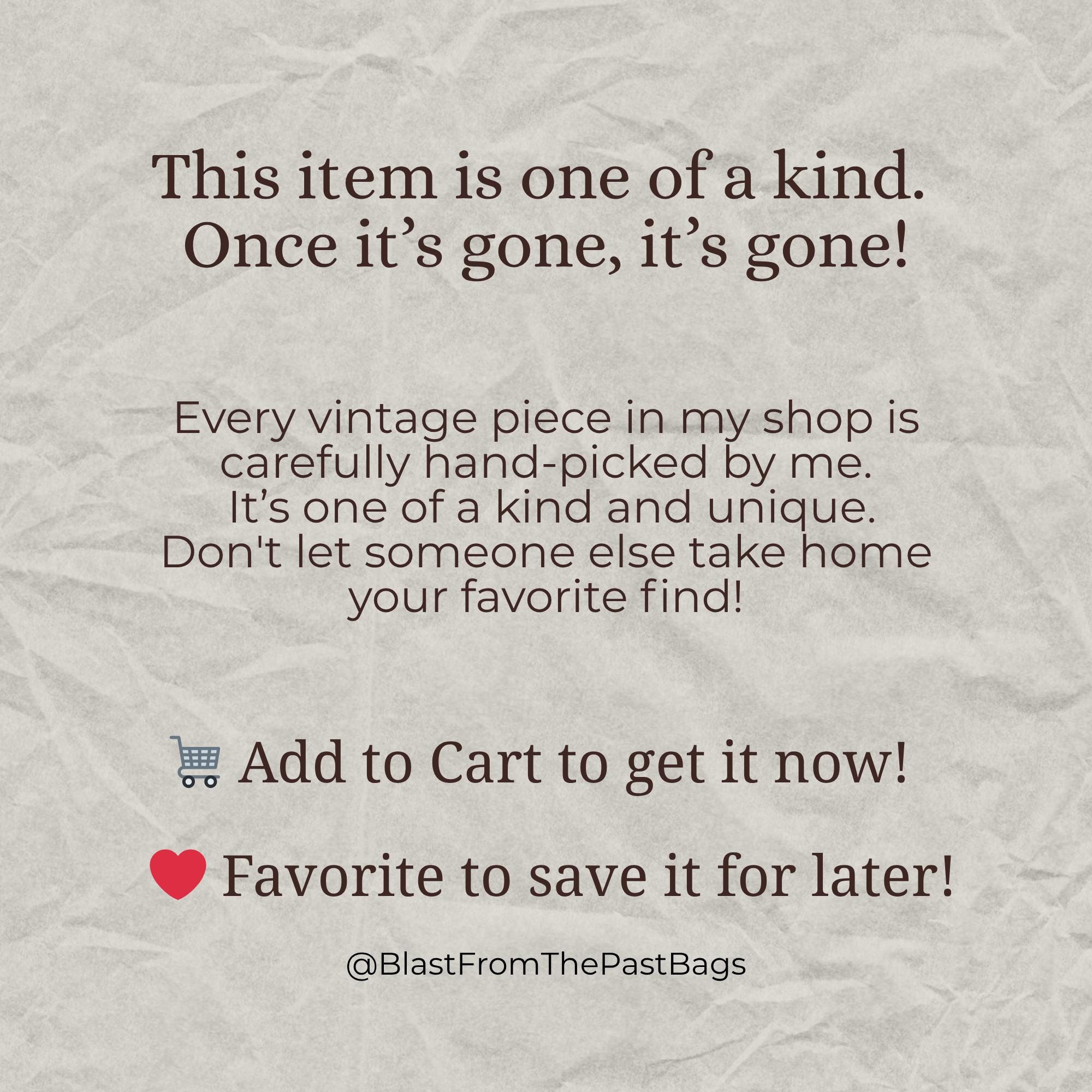 I will prepare and ship your vintage item within 2 working days after you have placed your order. As soon as I ship your vintage bag, belt or accessory, I will update your Etsy order details and mark it as shipped. Handling time may vary sometimes due to national holidays. I will notify you in advance if this happens.