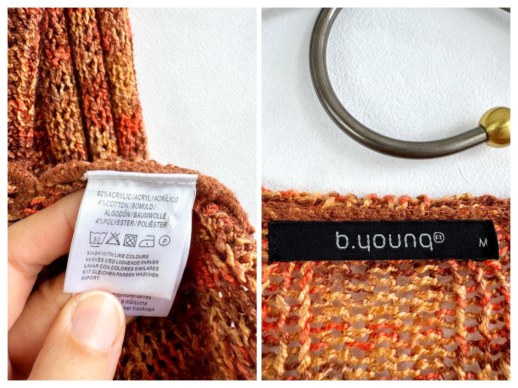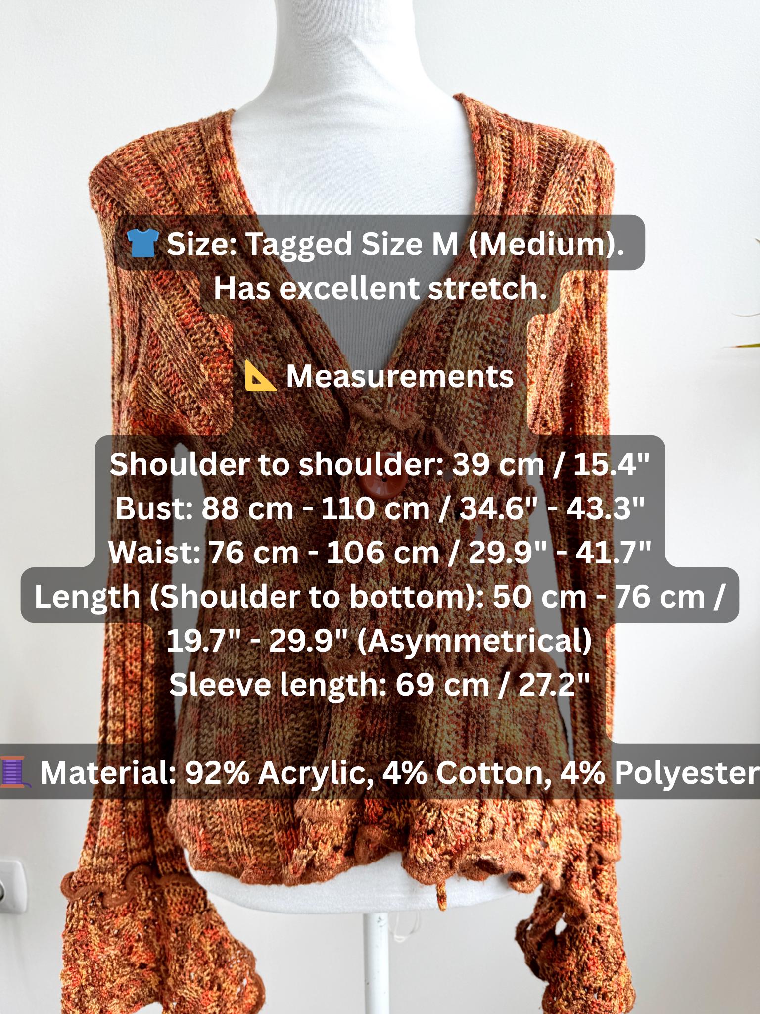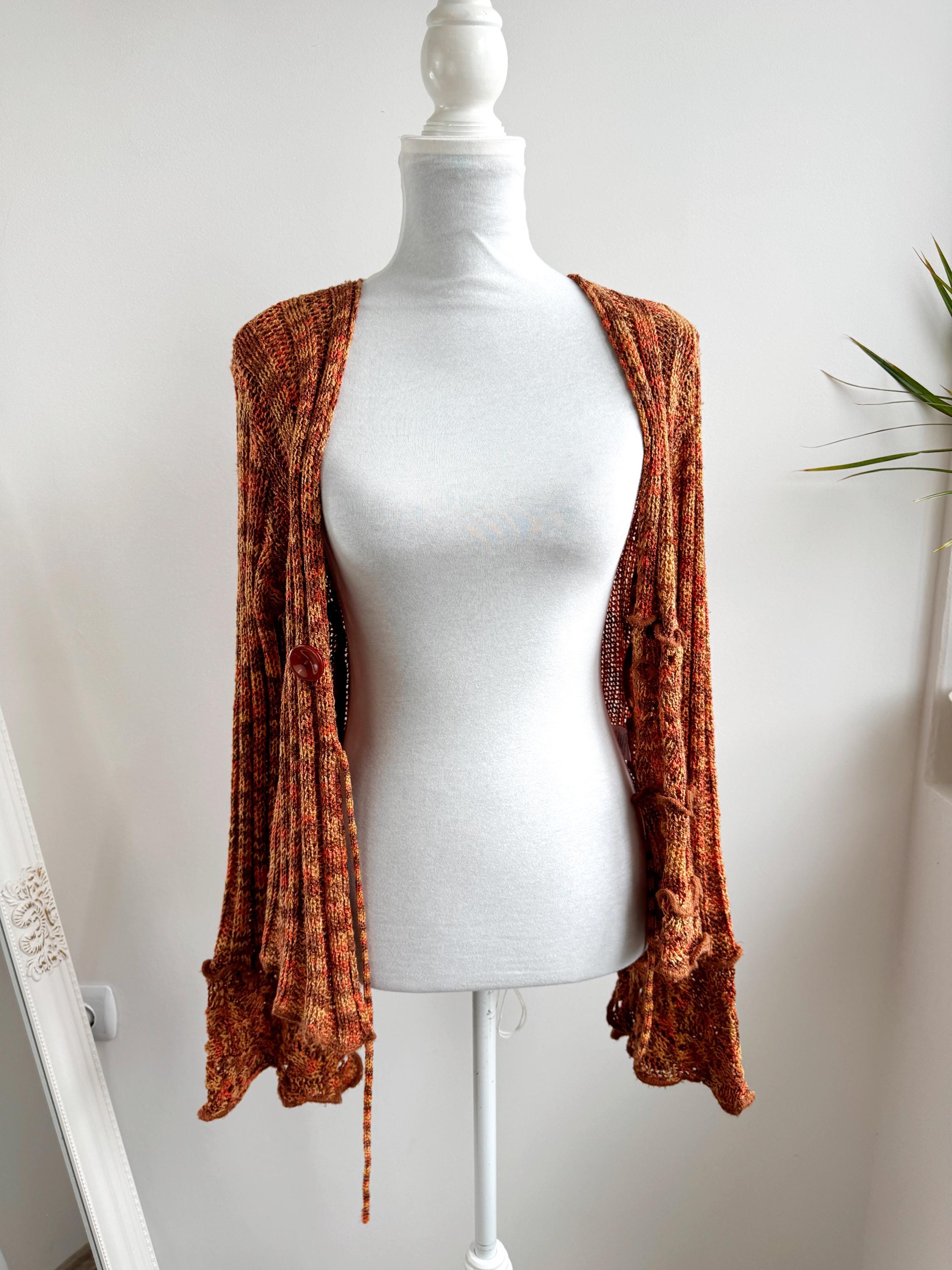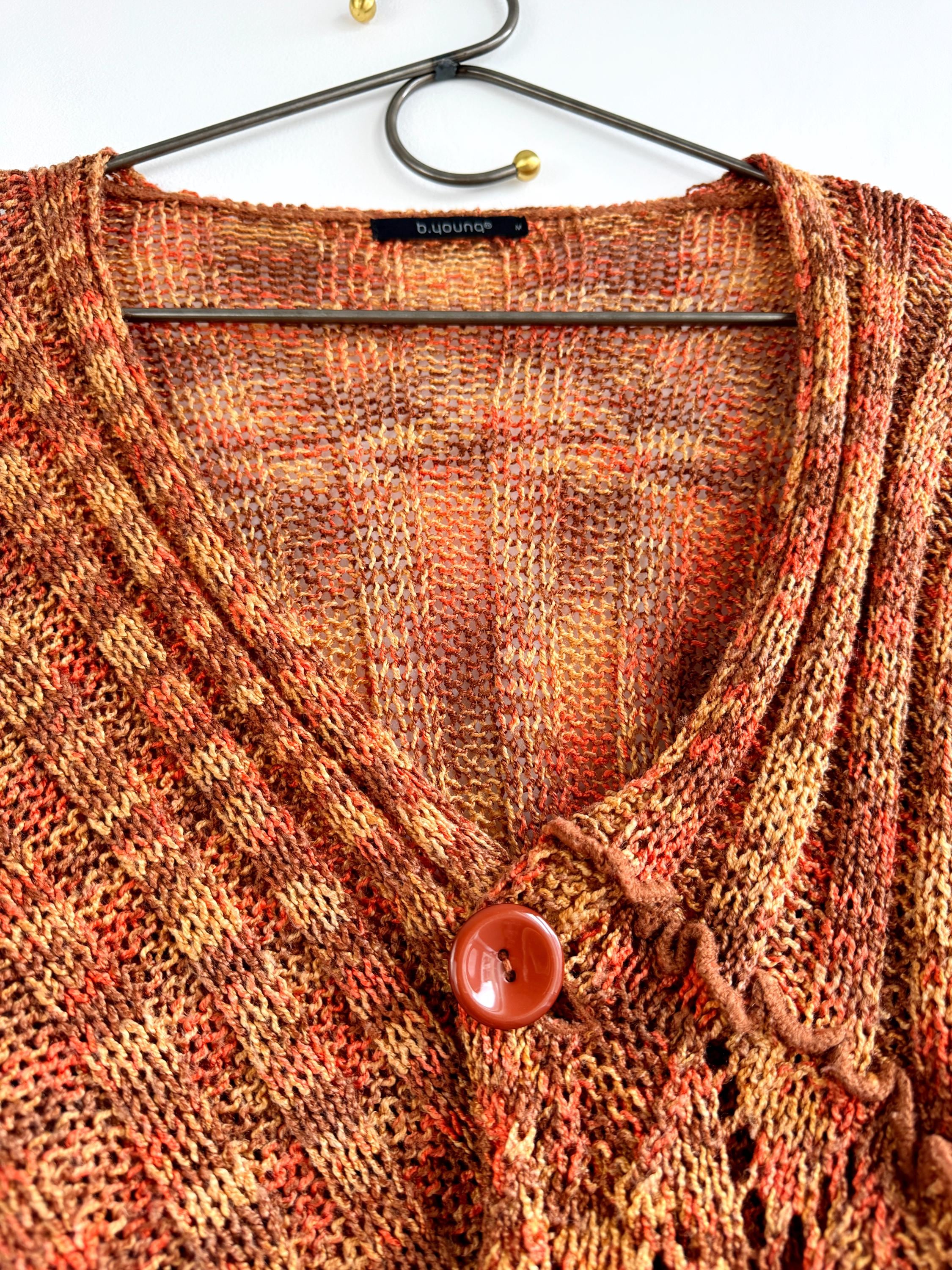 Bring a touch of whimsical, bohemian flair to your wardrobe with this stunning asymmetrical knit cardigan from B.young in size M. This layering piece is the epitome of "fairy core" and "earthy boho" aesthetics, featuring a rich, multi-tonal yarn in shades of rust, burnt orange, and golden ochre.