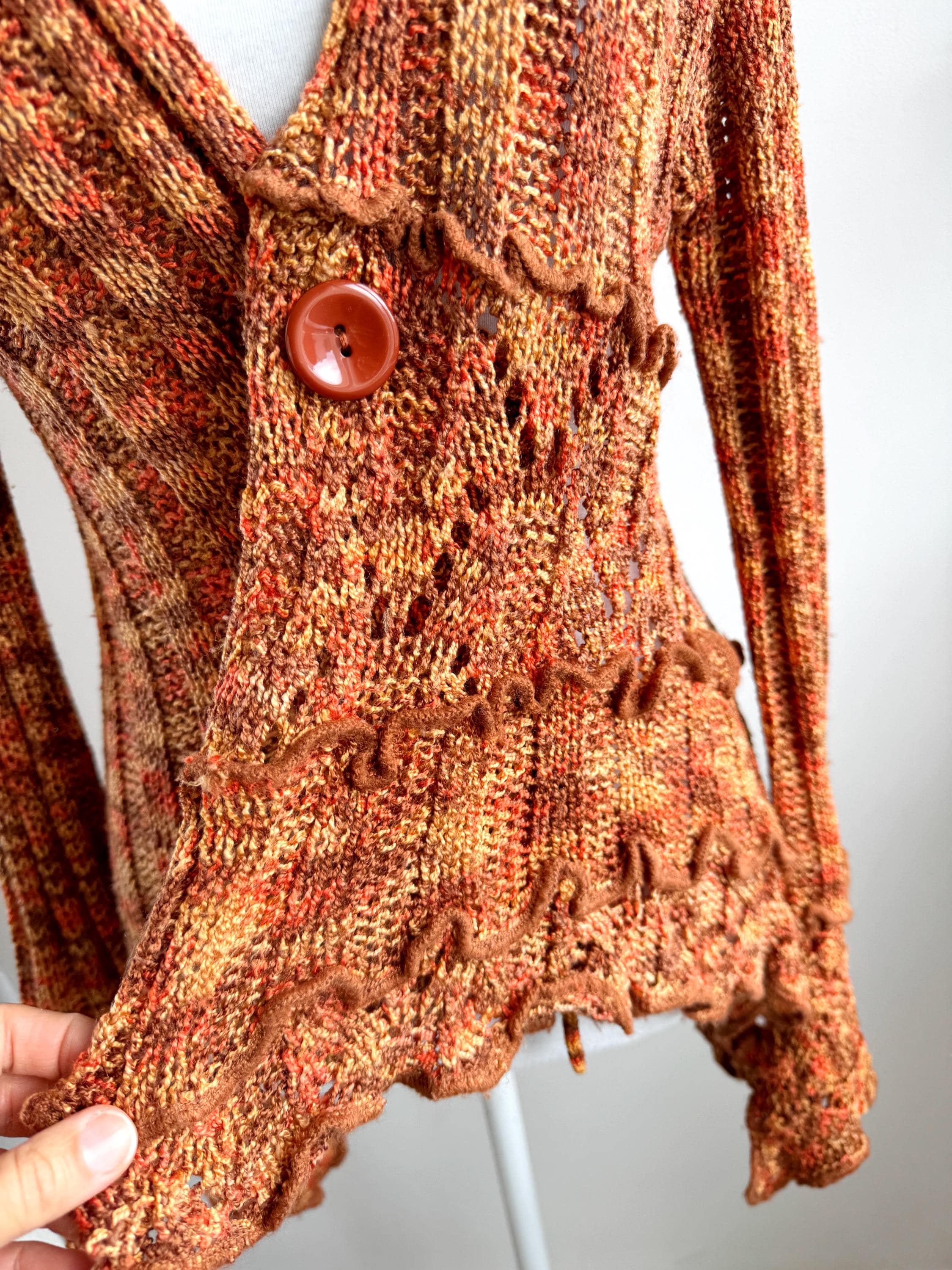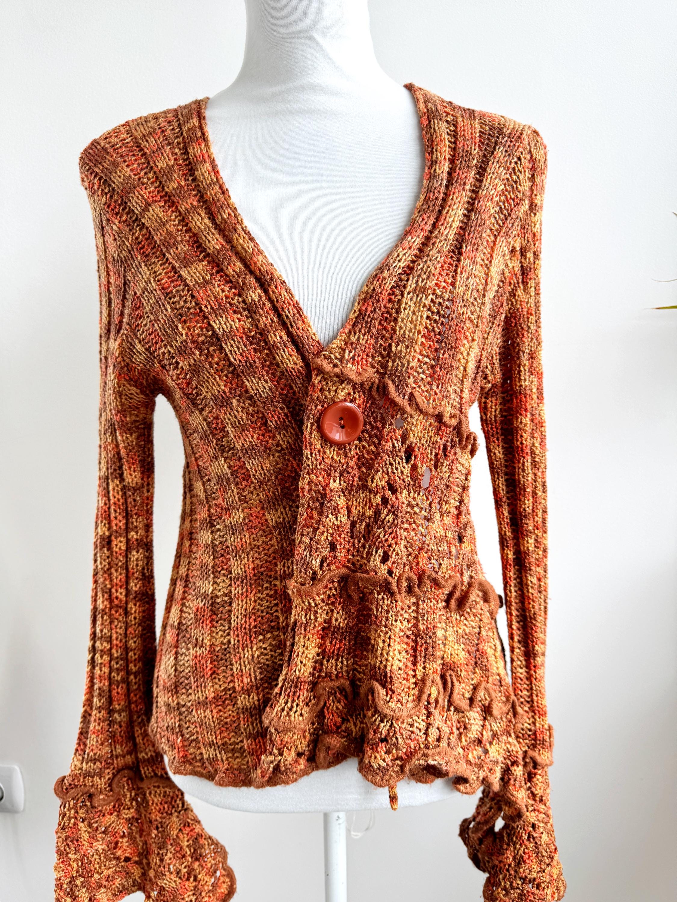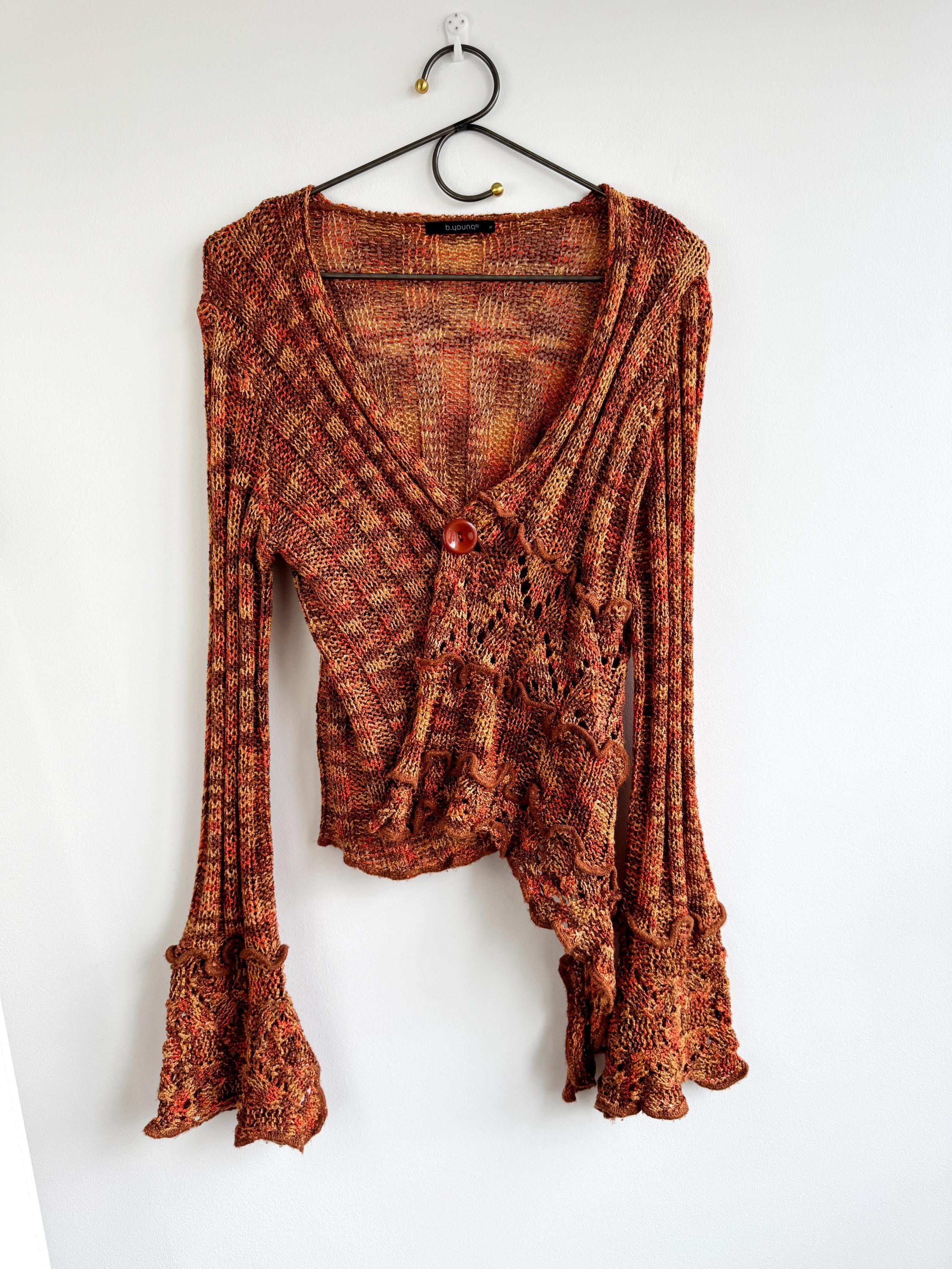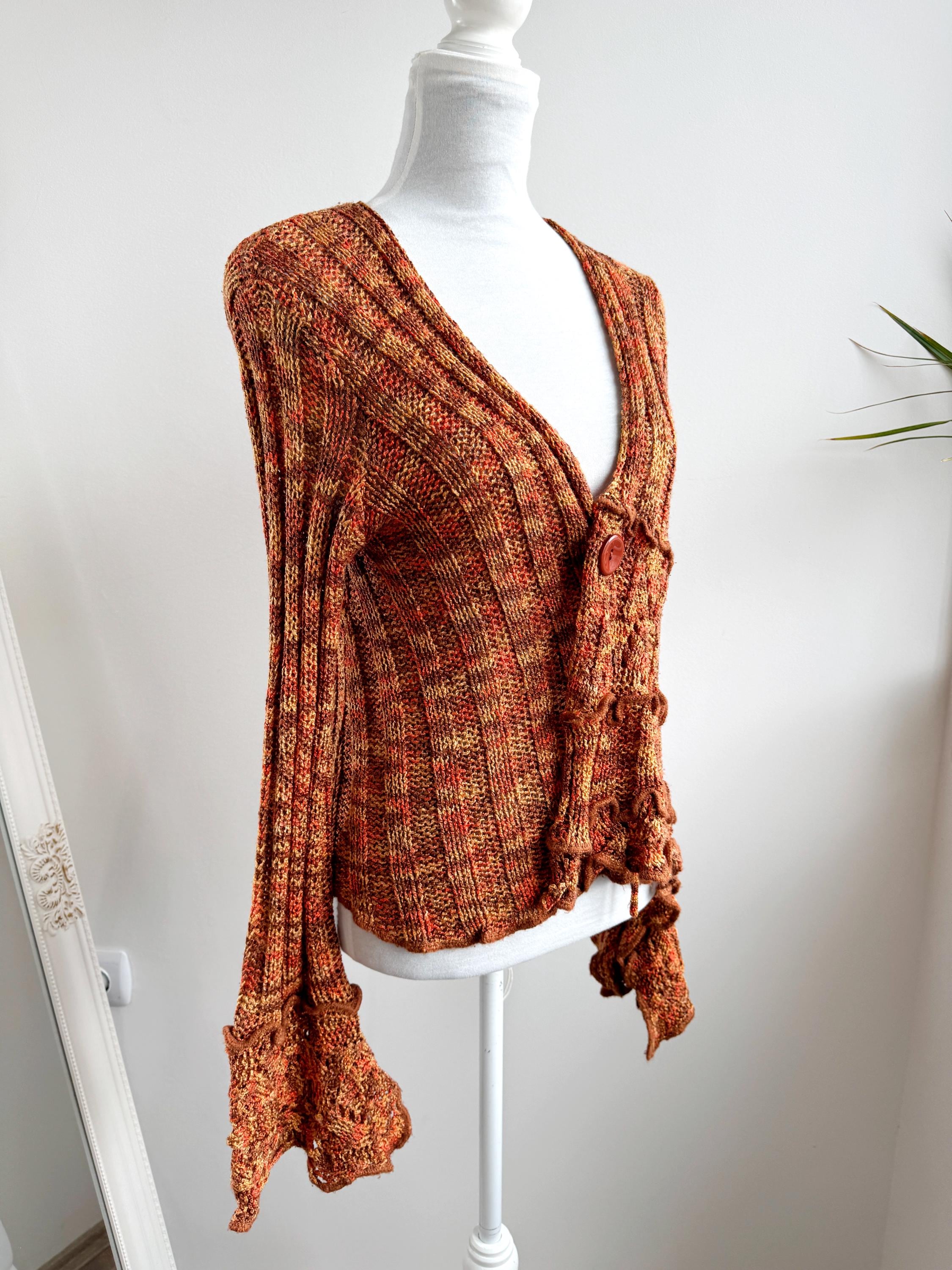 Bring a touch of whimsical, bohemian flair to your wardrobe with this stunning asymmetrical knit cardigan from B.young in size M. This layering piece is the epitome of "fairy core" and "earthy boho" aesthetics, featuring a rich, multi-tonal yarn in shades of rust, burnt orange, and golden ochre.