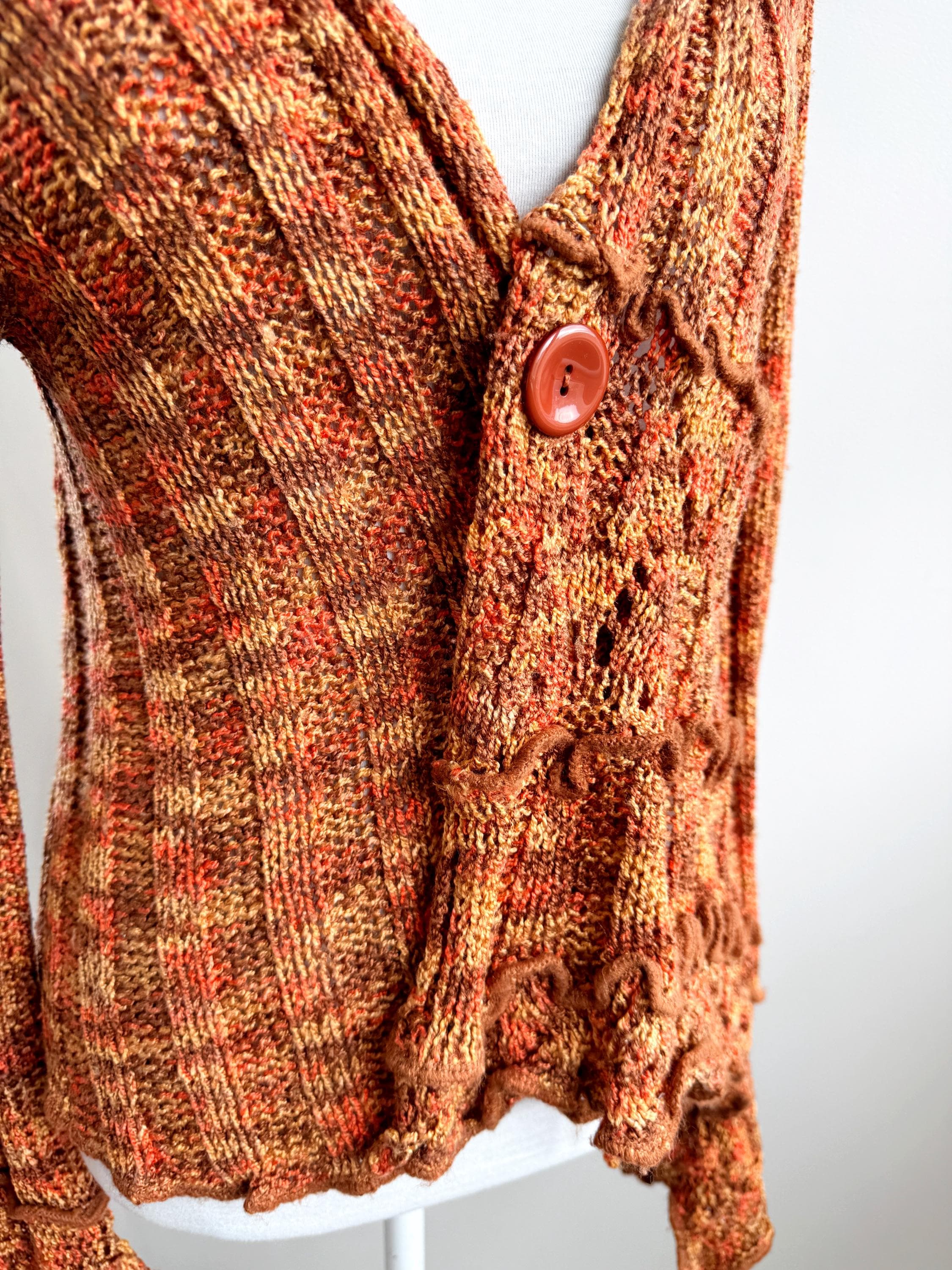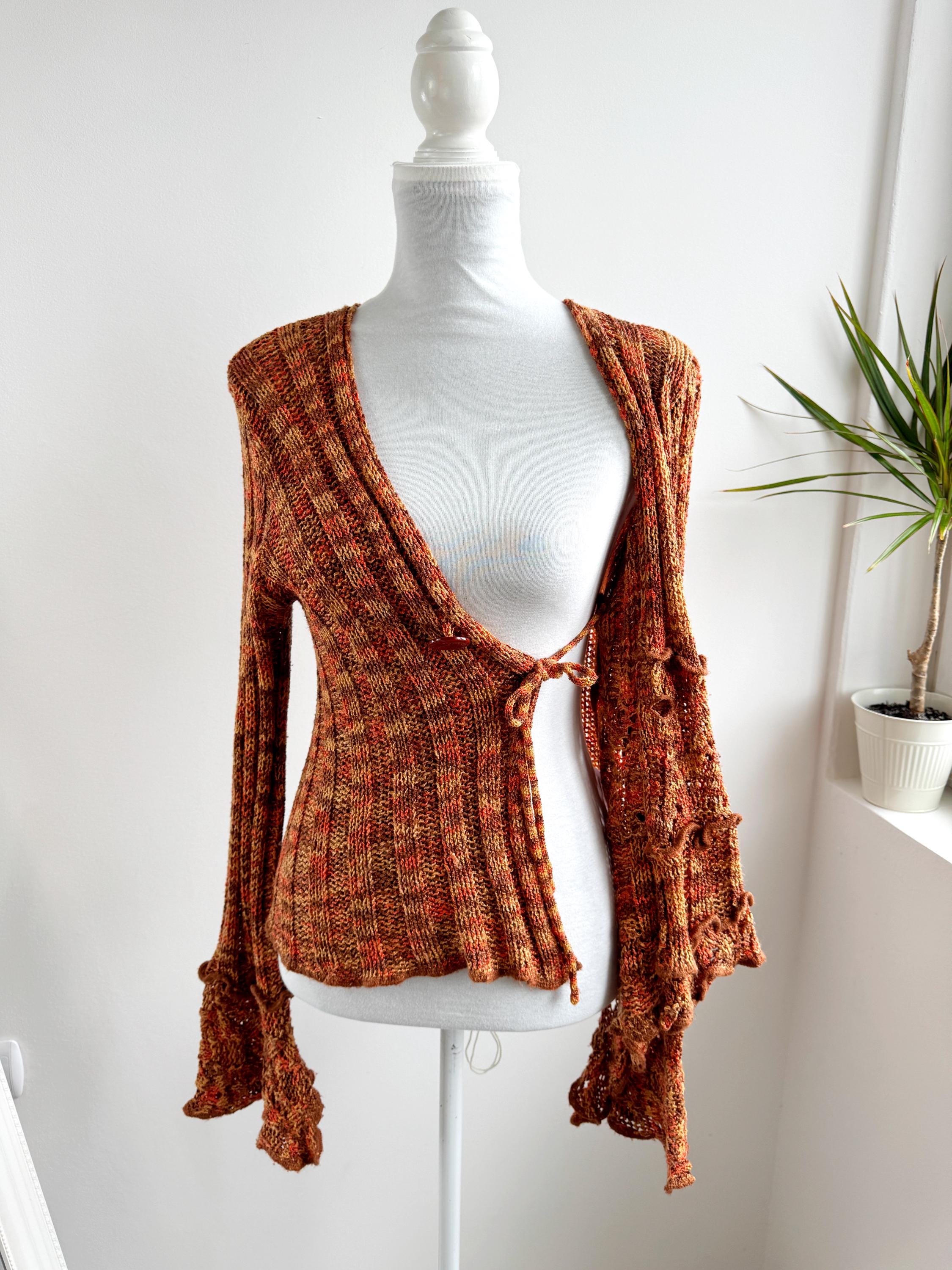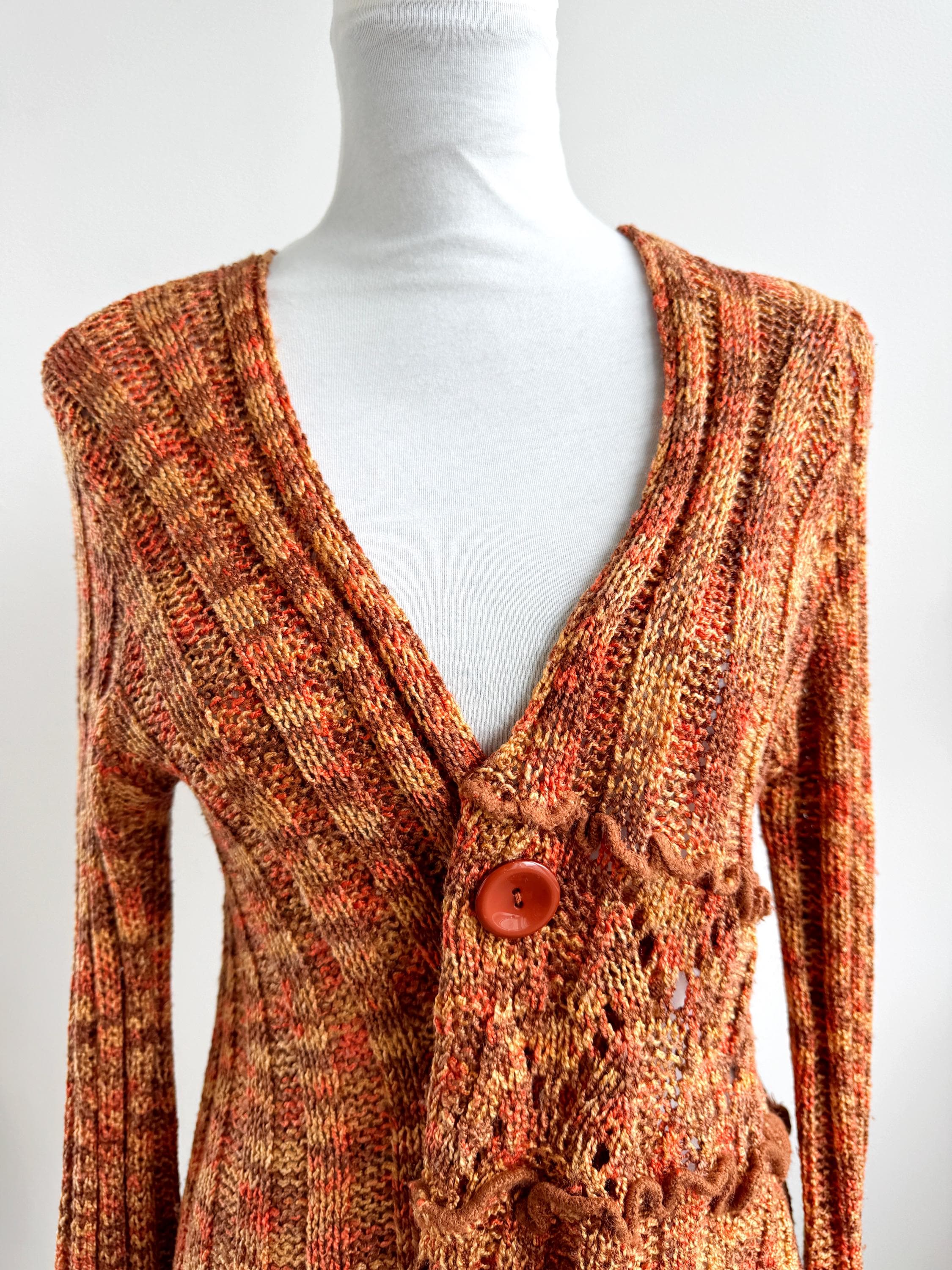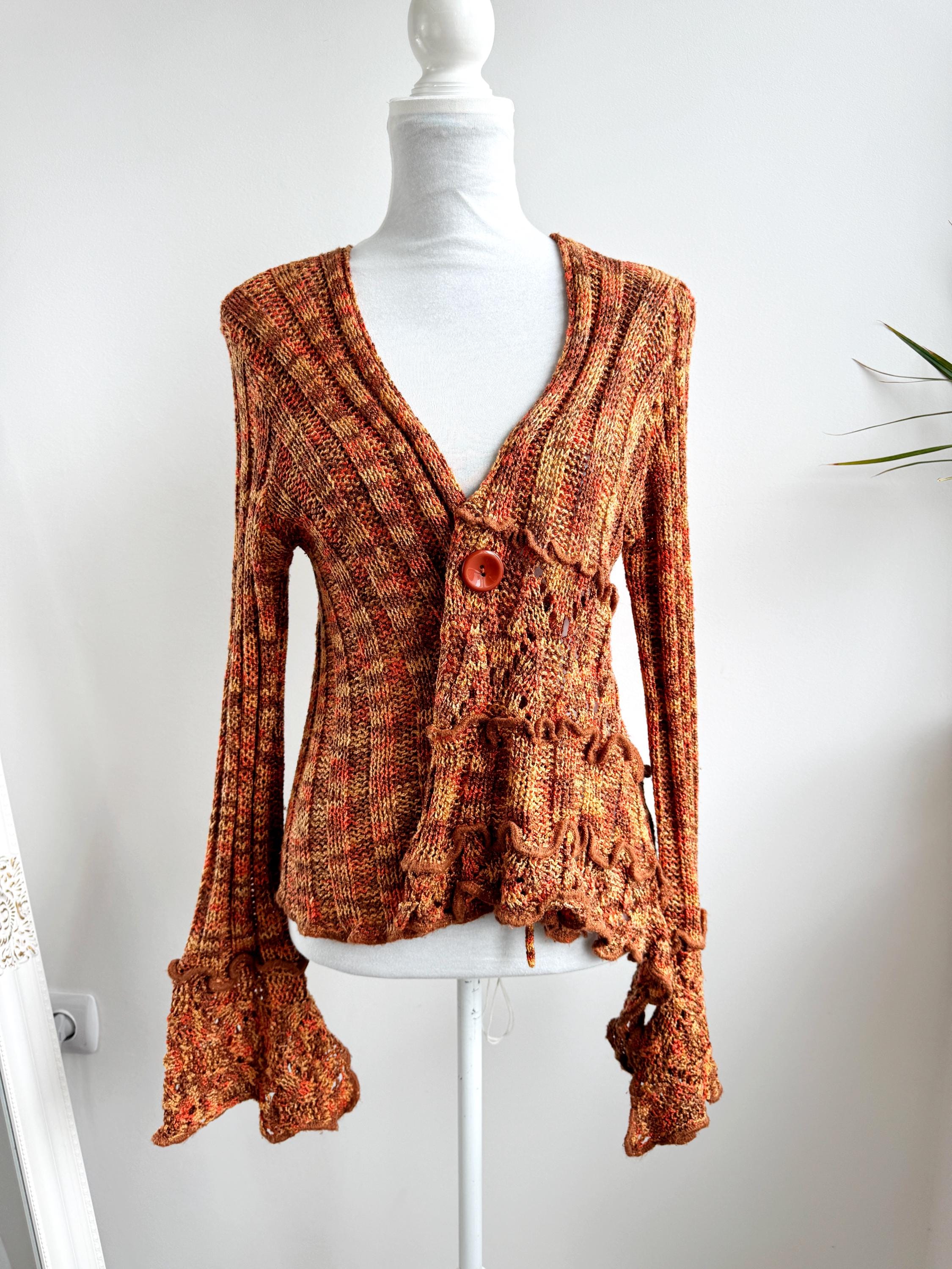 Bring a touch of whimsical, bohemian flair to your wardrobe with this stunning asymmetrical knit cardigan from B.young in size M. This layering piece is the epitome of "fairy core" and "earthy boho" aesthetics, featuring a rich, multi-tonal yarn in shades of rust, burnt orange, and golden ochre.