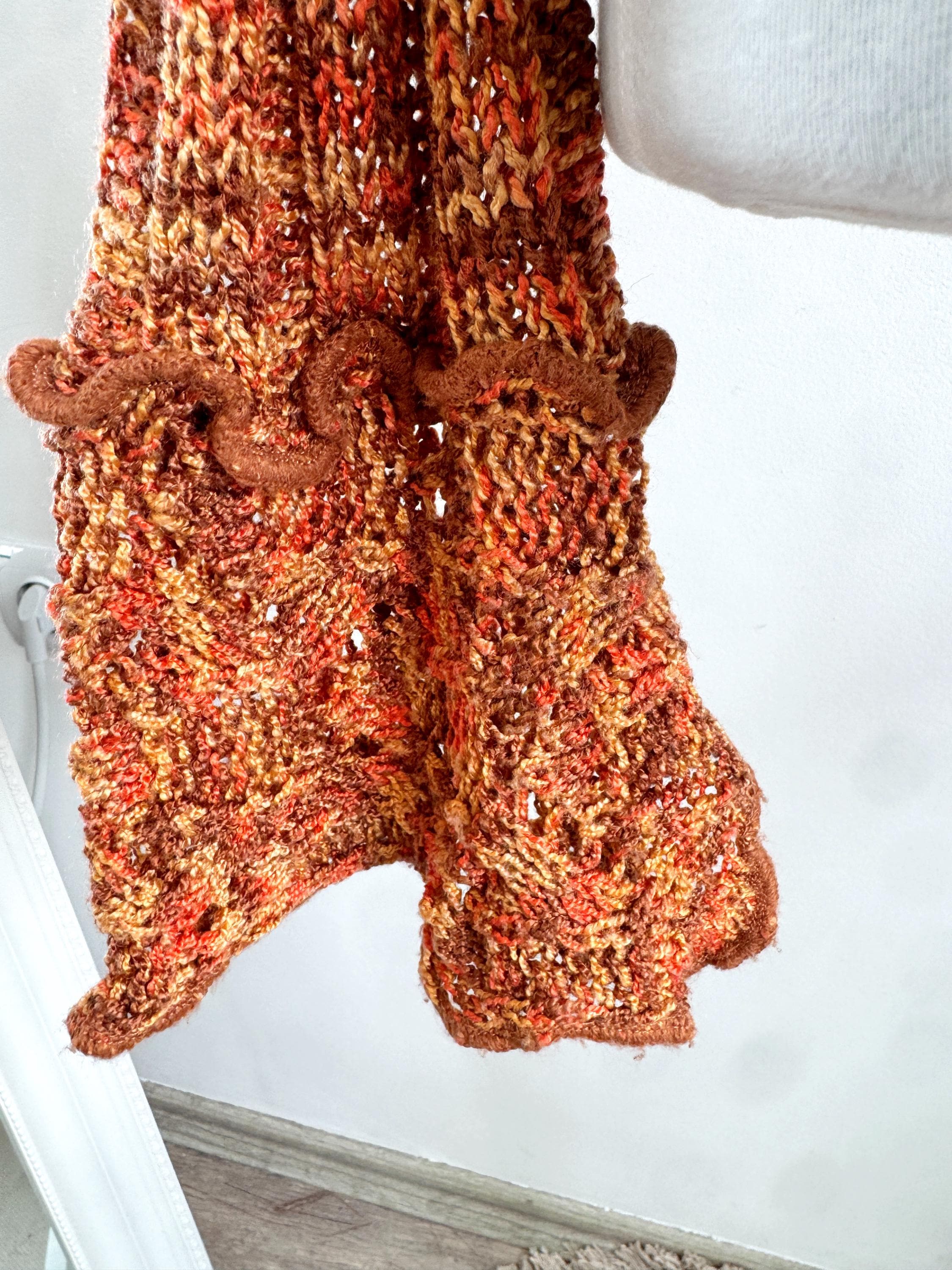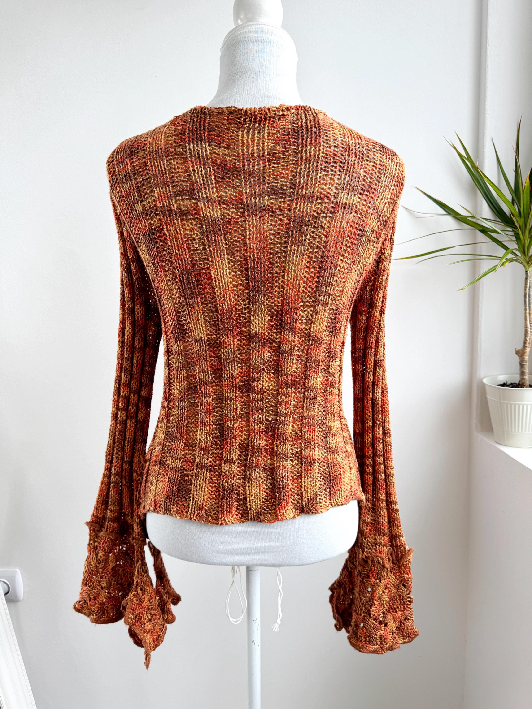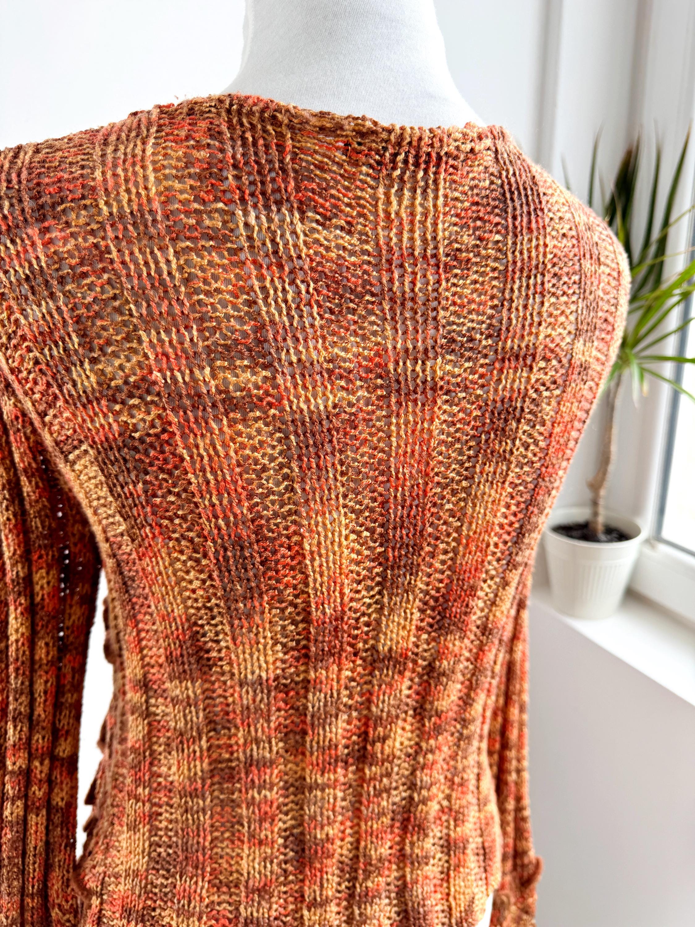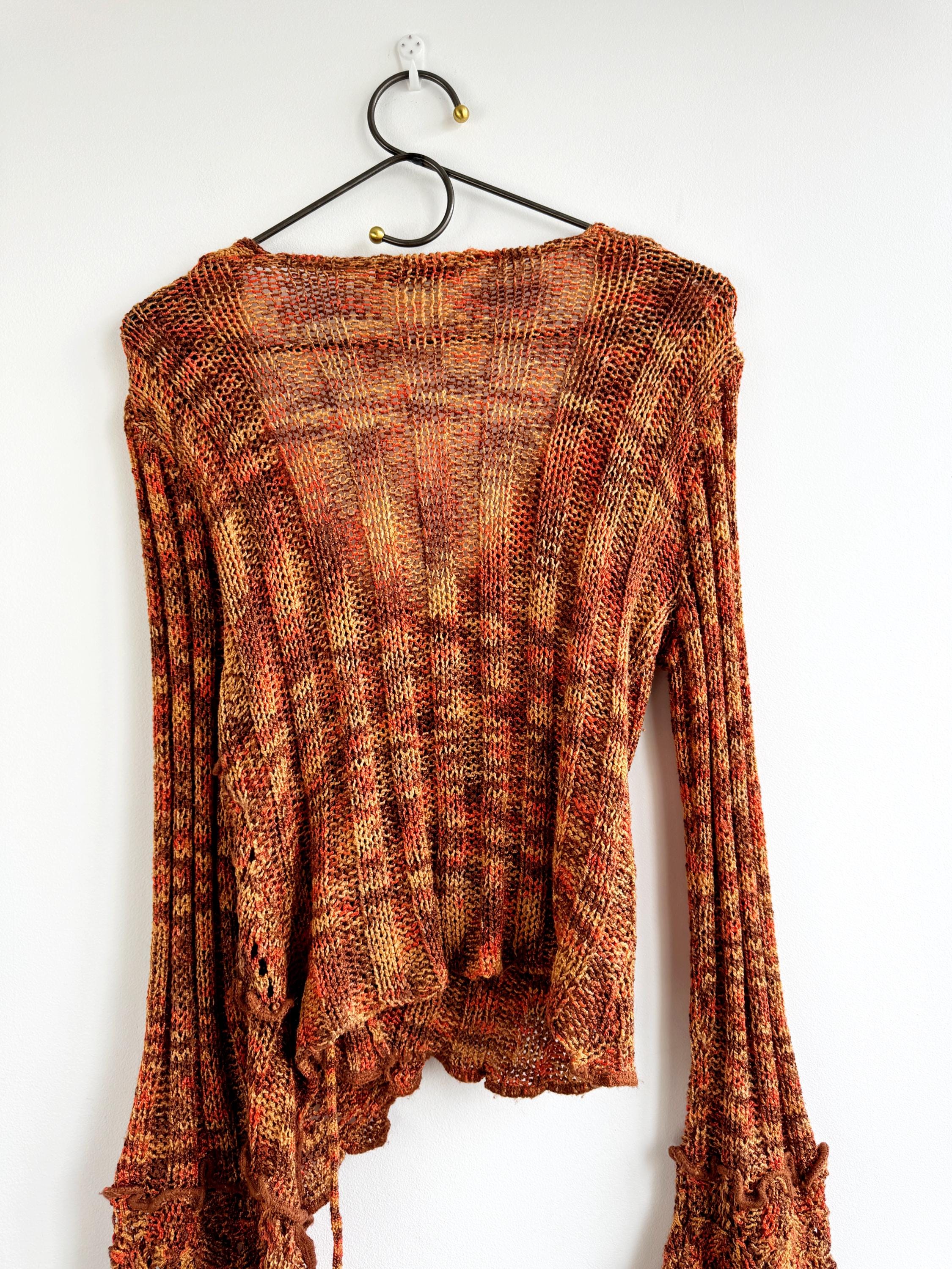 Bring a touch of whimsical, bohemian flair to your wardrobe with this stunning asymmetrical knit cardigan from B.young in size M. This layering piece is the epitome of "fairy core" and "earthy boho" aesthetics, featuring a rich, multi-tonal yarn in shades of rust, burnt orange, and golden ochre.