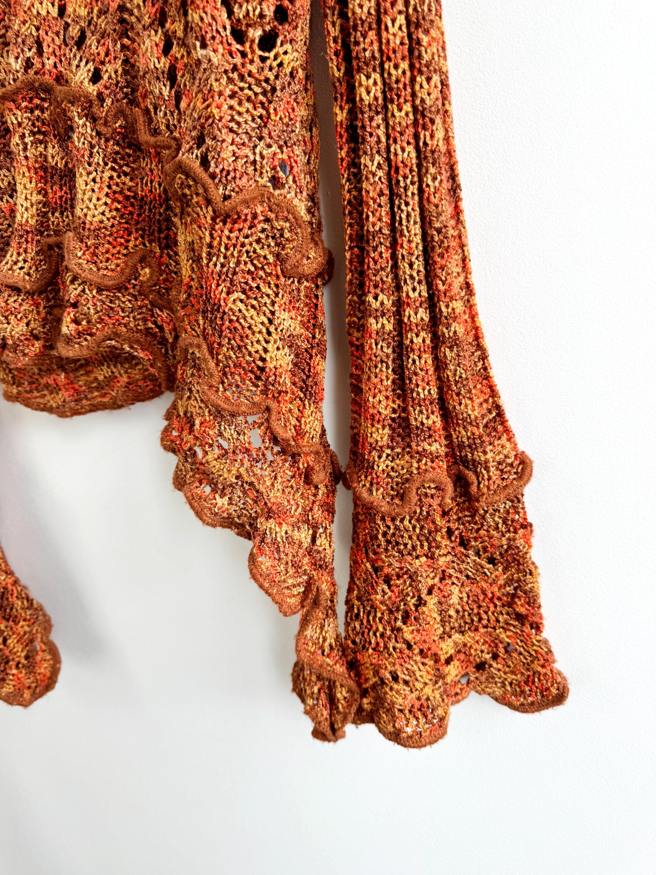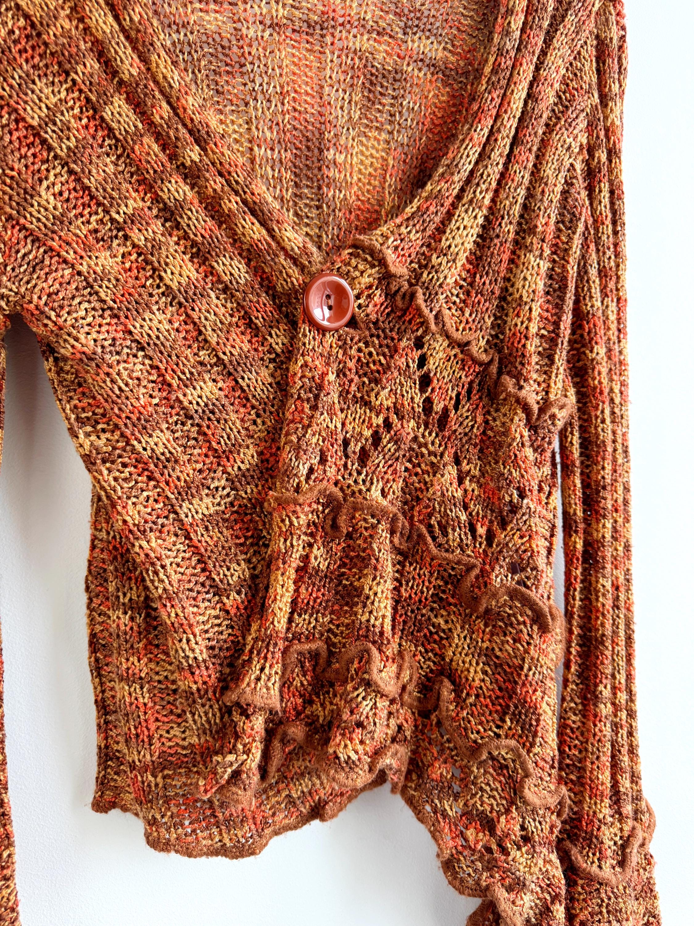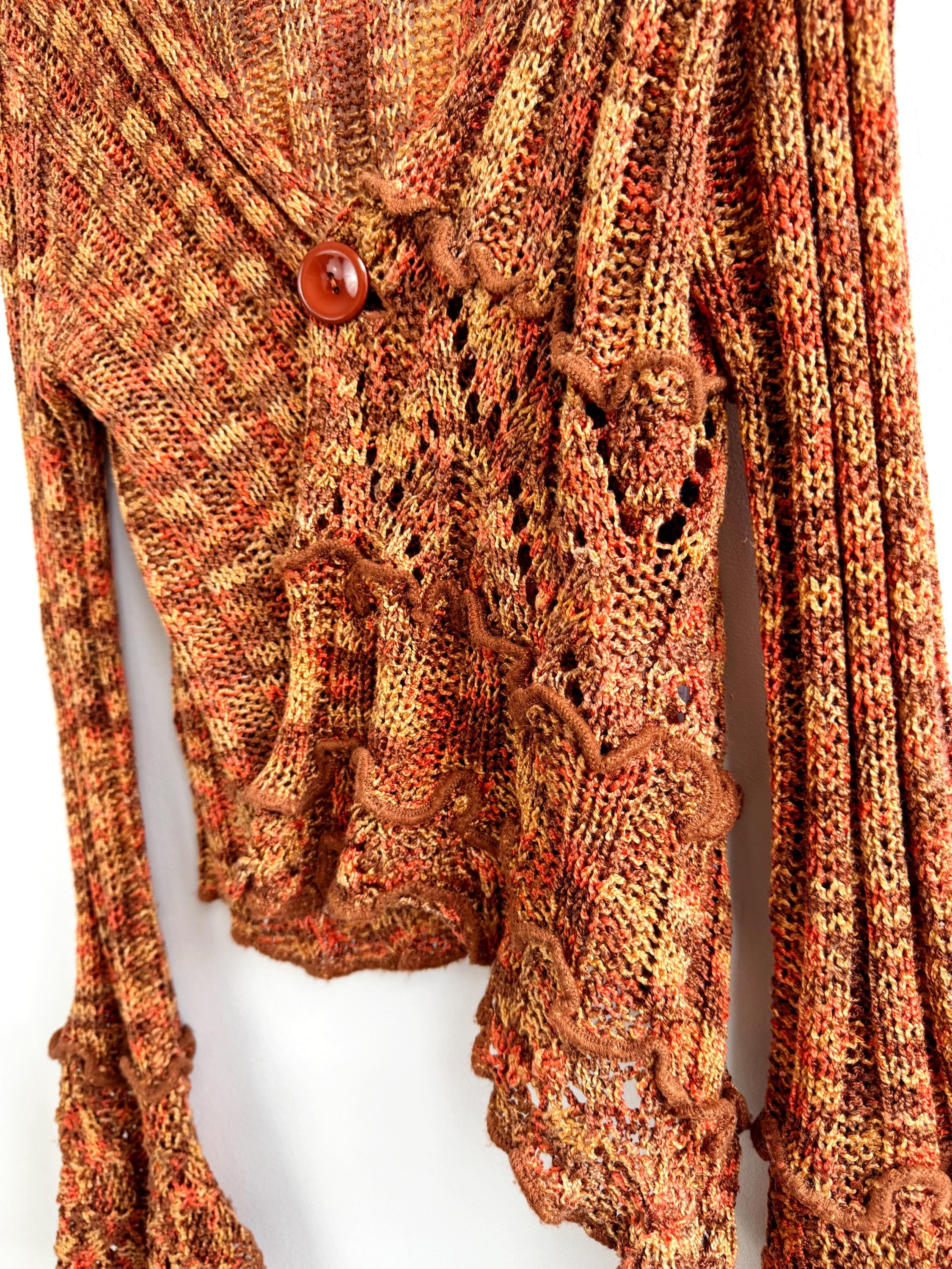 The design is truly unique, boasting a dramatic asymmetrical front that fastens with a single oversized statement button. The knit texture varies throughout, creating a beautiful visual depth, while the extra-long sleeves finish in spectacular flared, lettuce-edge cuffs. Whether you are layering it over a slip dress for a festival look or pairing it with high-waisted denim for a cozy everyday ensemble, this wrap cardigan offers a silhouette that is both flattering and avant-garde.
