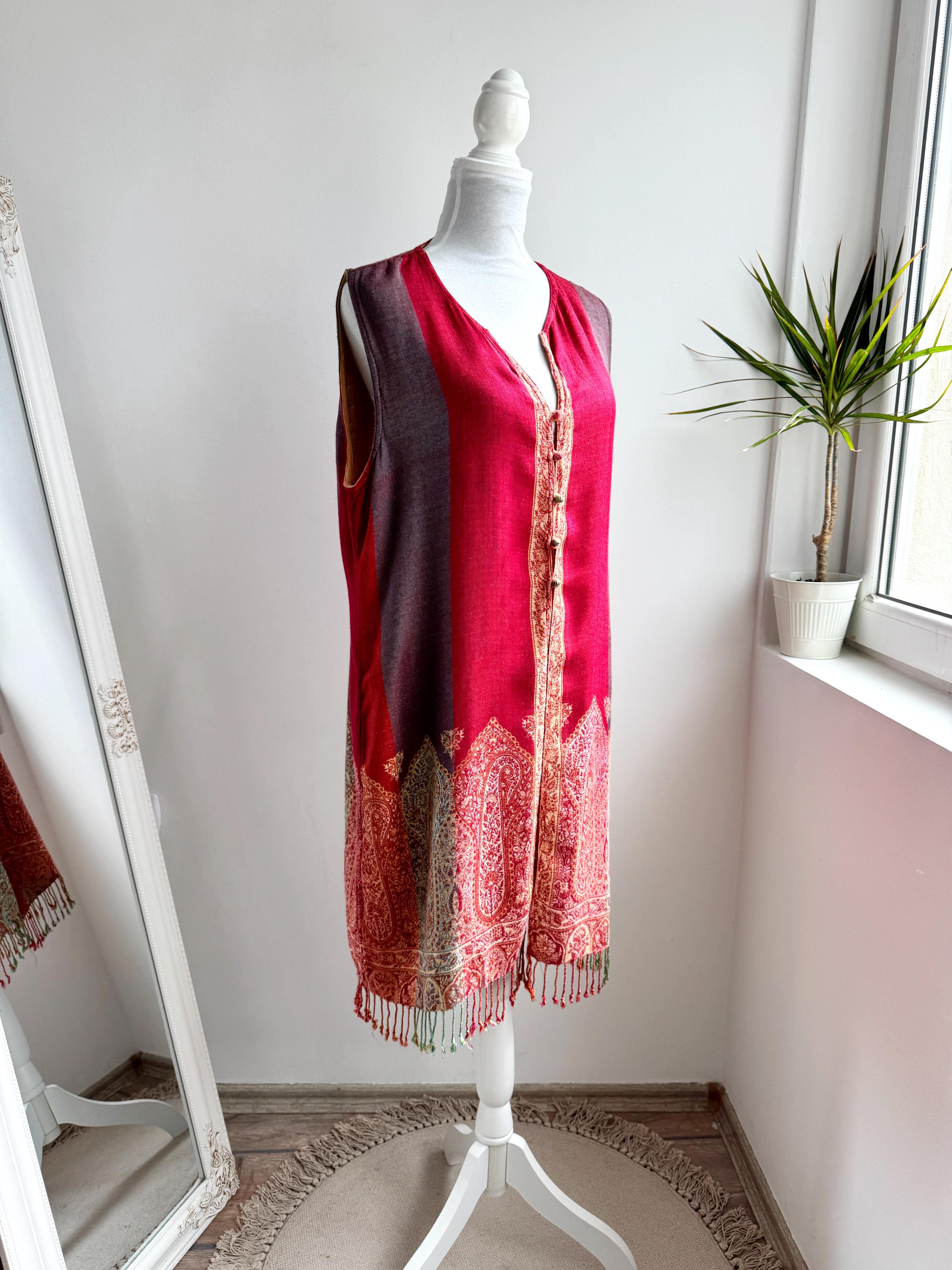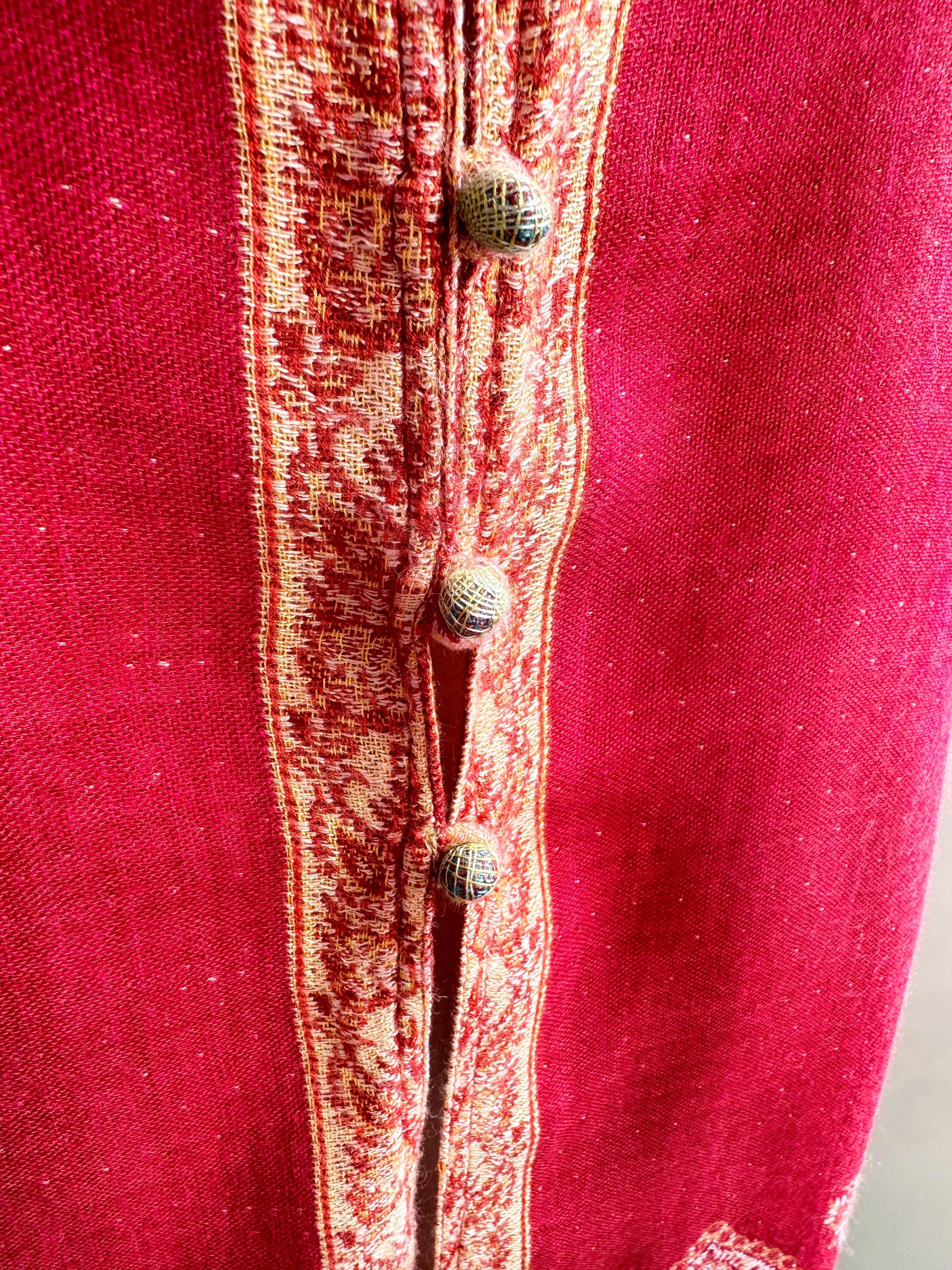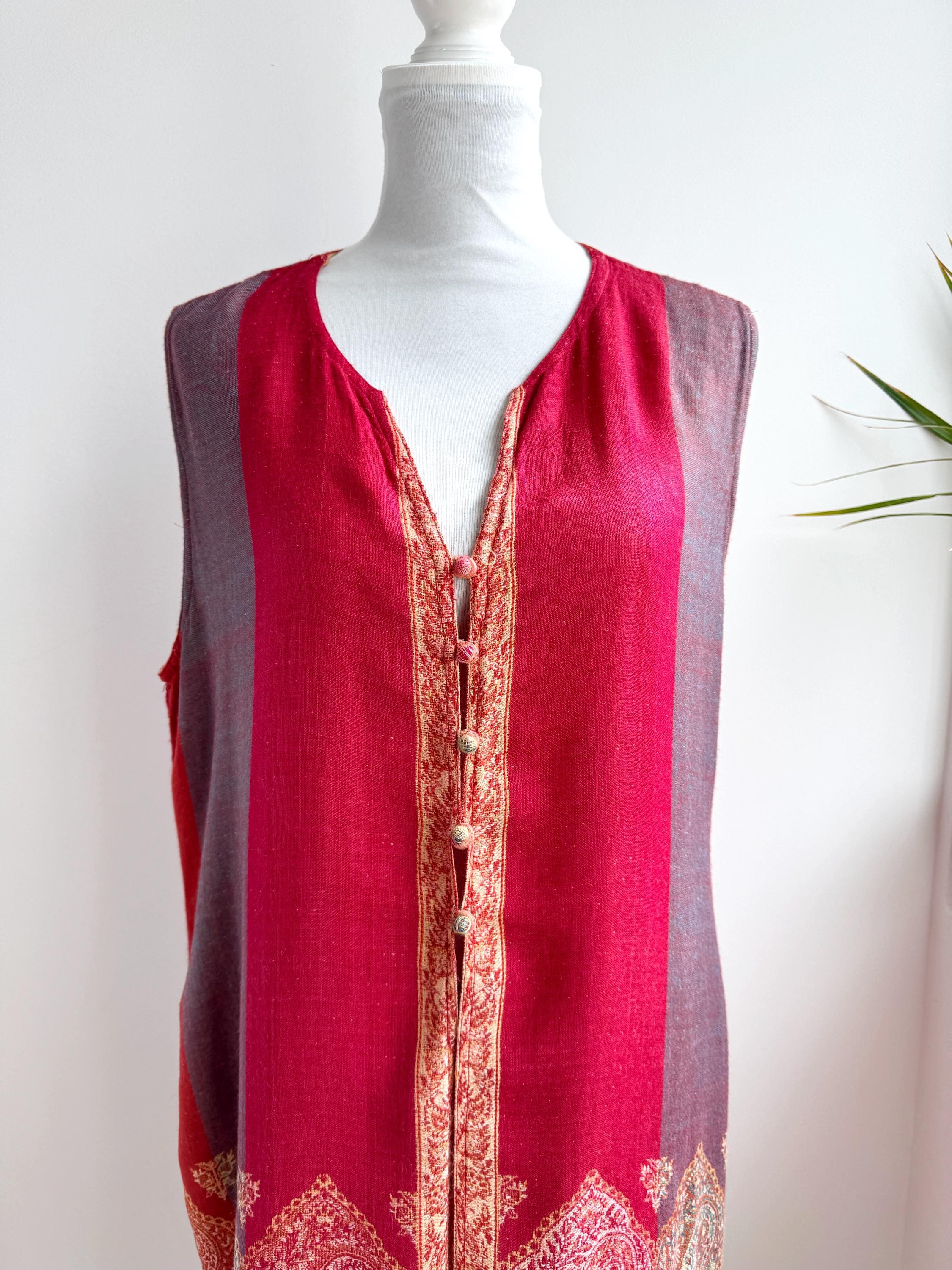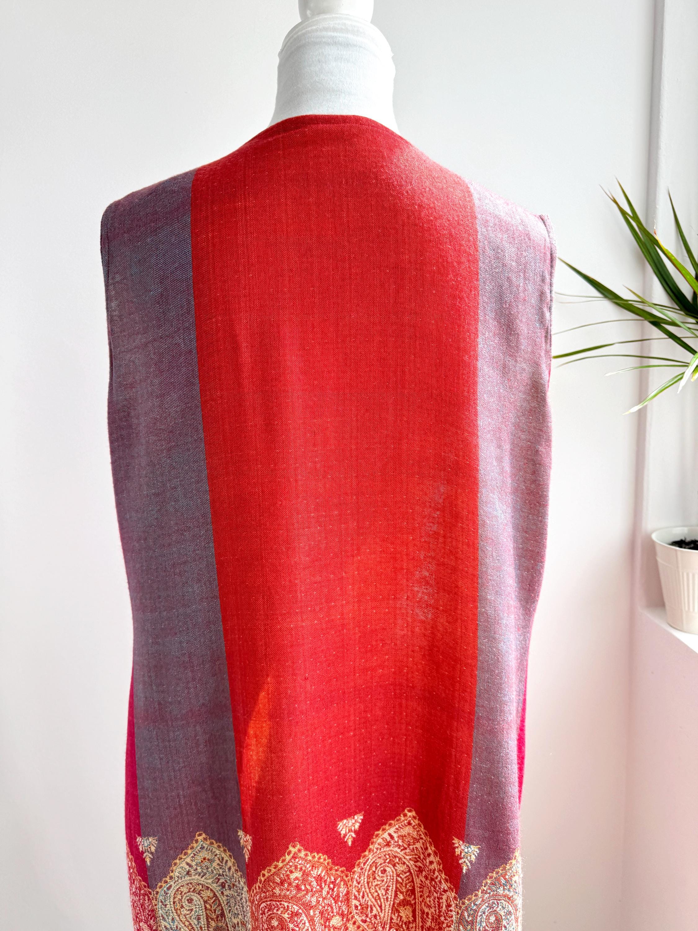 Bring a touch of artisanal elegance to your wardrobe with this stunning vintage longline vest. Featuring a rich color palette of deep crimson red and muted purple, this layering piece is beautifully accented by intricate golden-beige paisley embroidery that flows along the hem and the central fastening.