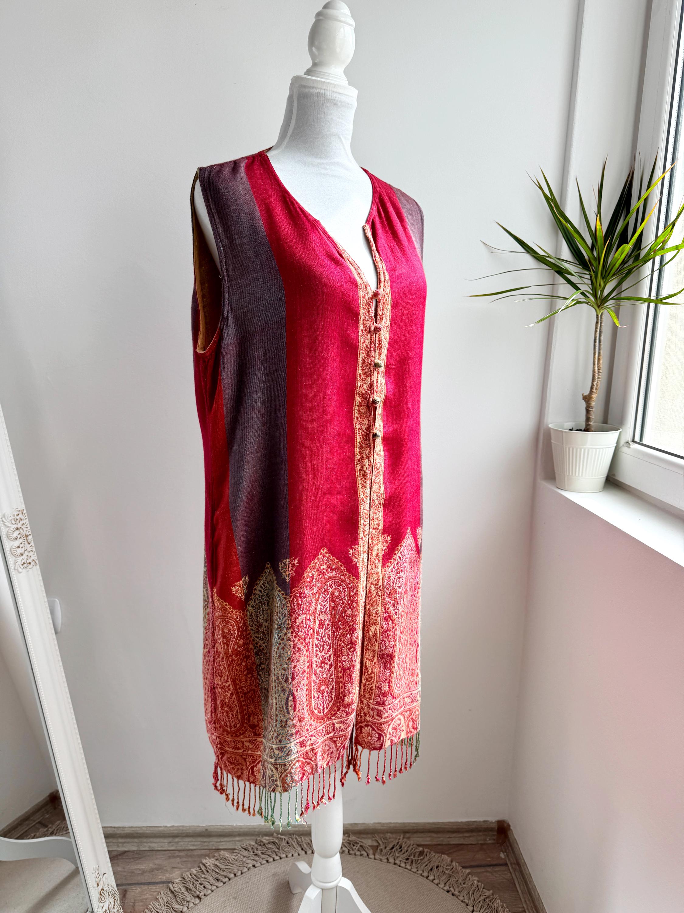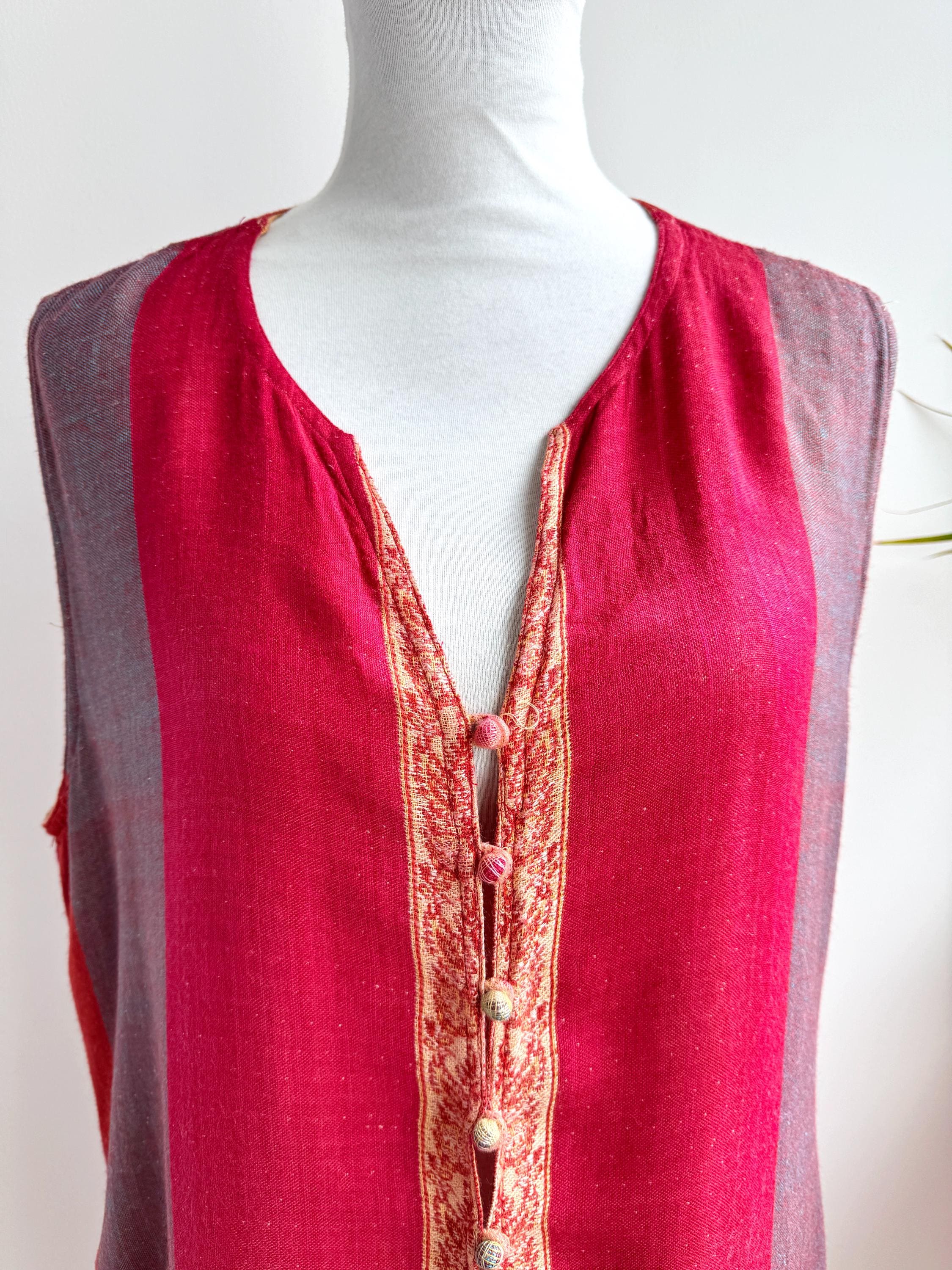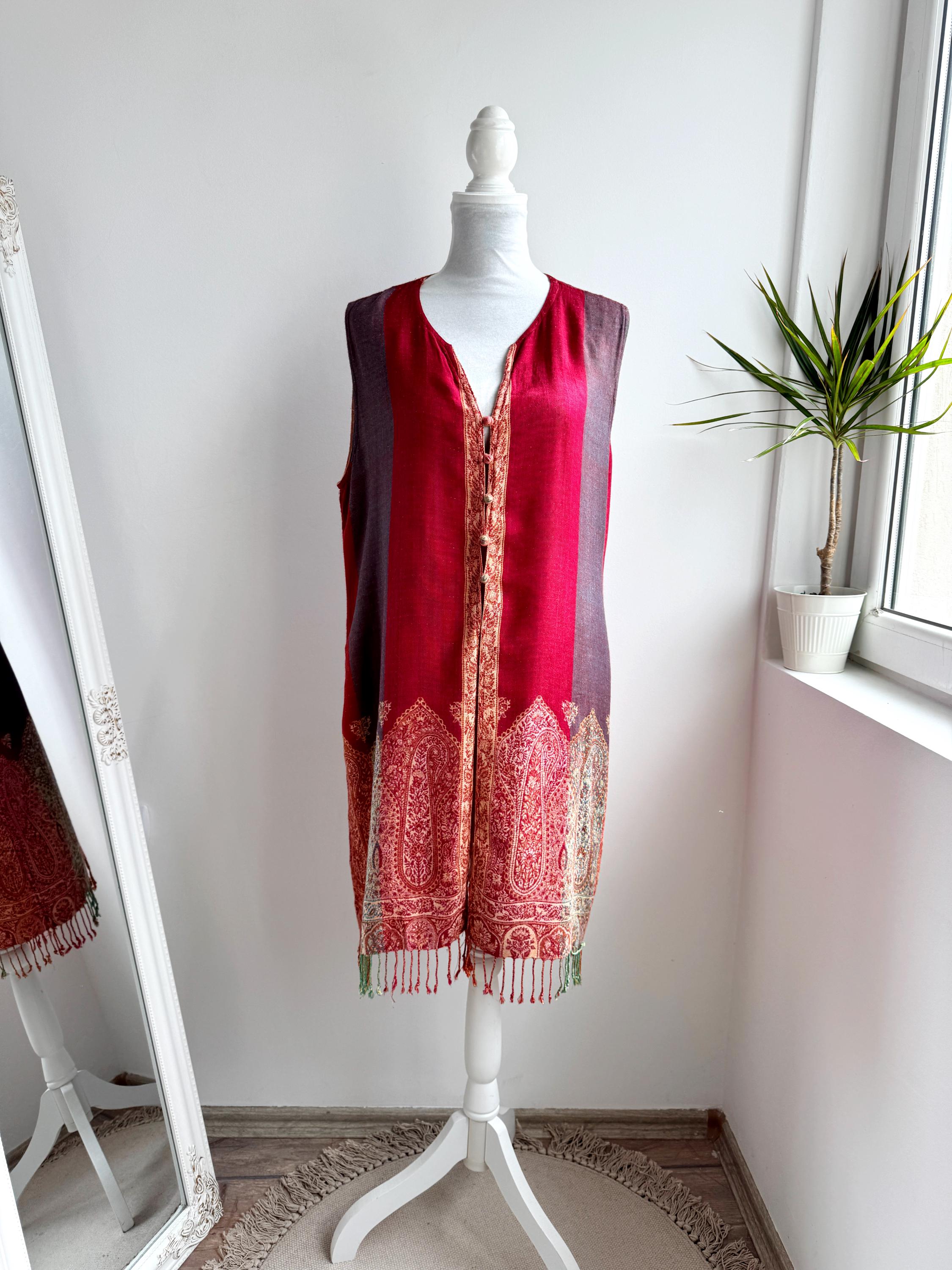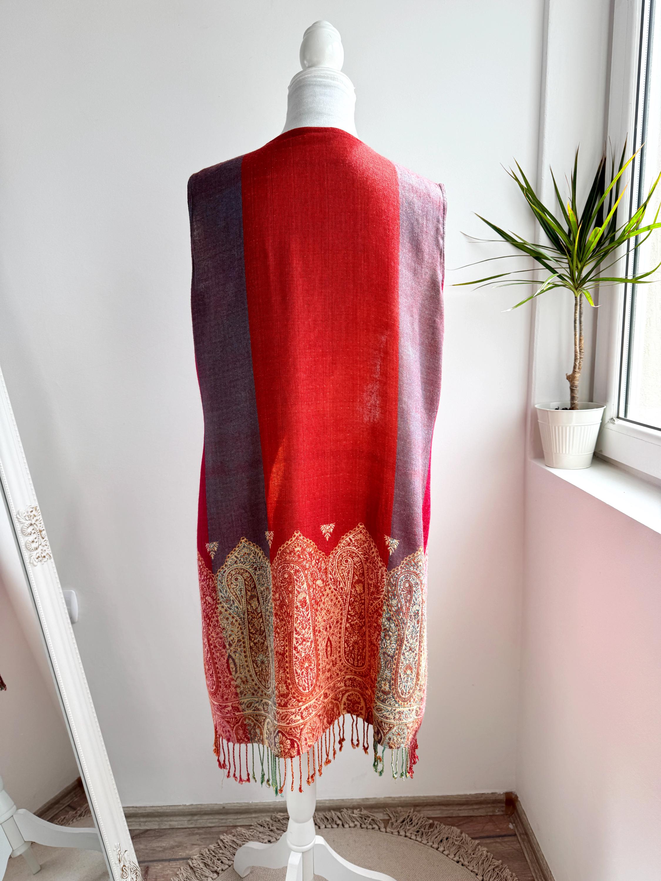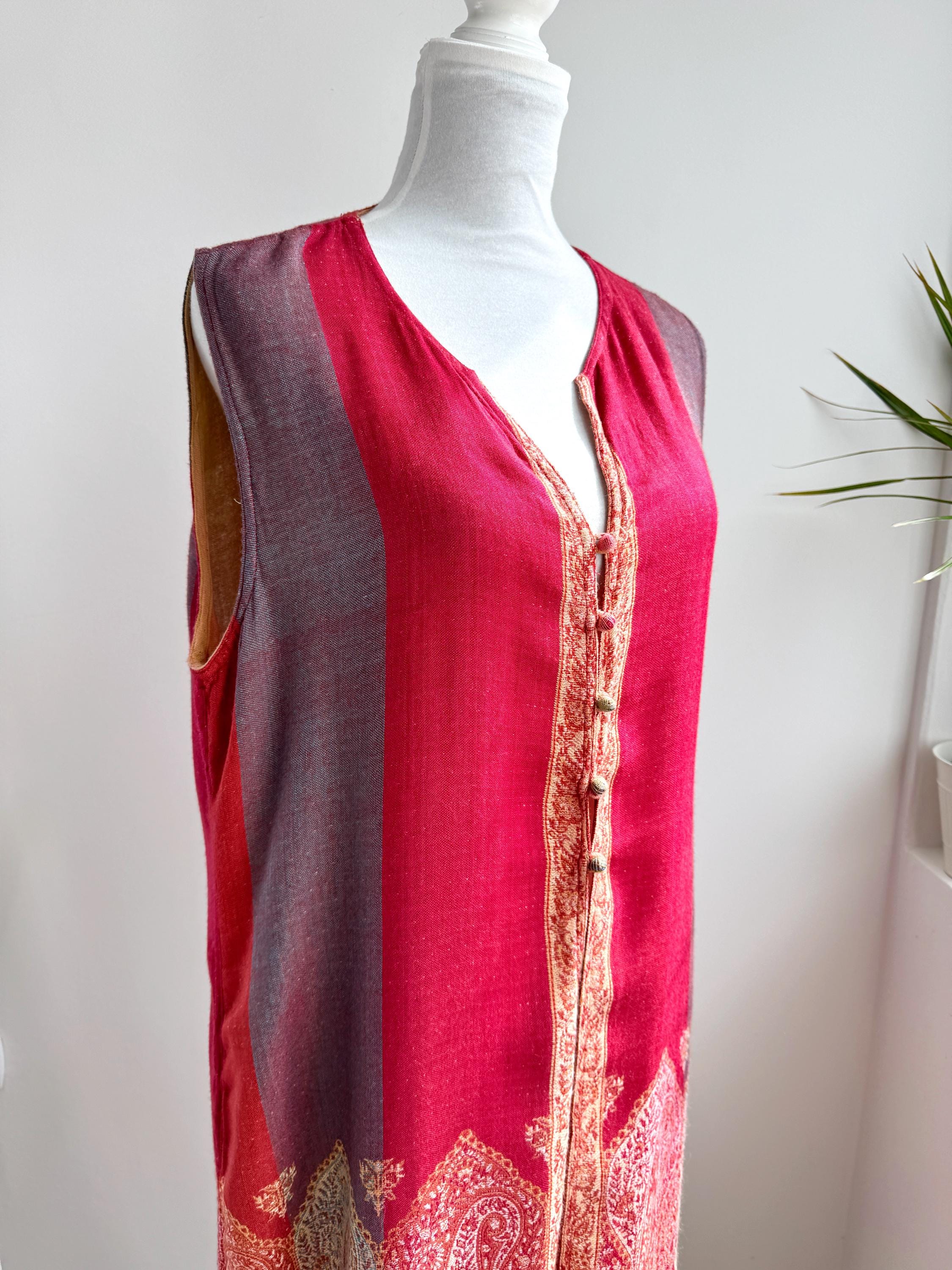 Bring a touch of artisanal elegance to your wardrobe with this stunning vintage longline vest. Featuring a rich color palette of deep crimson red and muted purple, this layering piece is beautifully accented by intricate golden-beige paisley embroidery that flows along the hem and the central fastening.