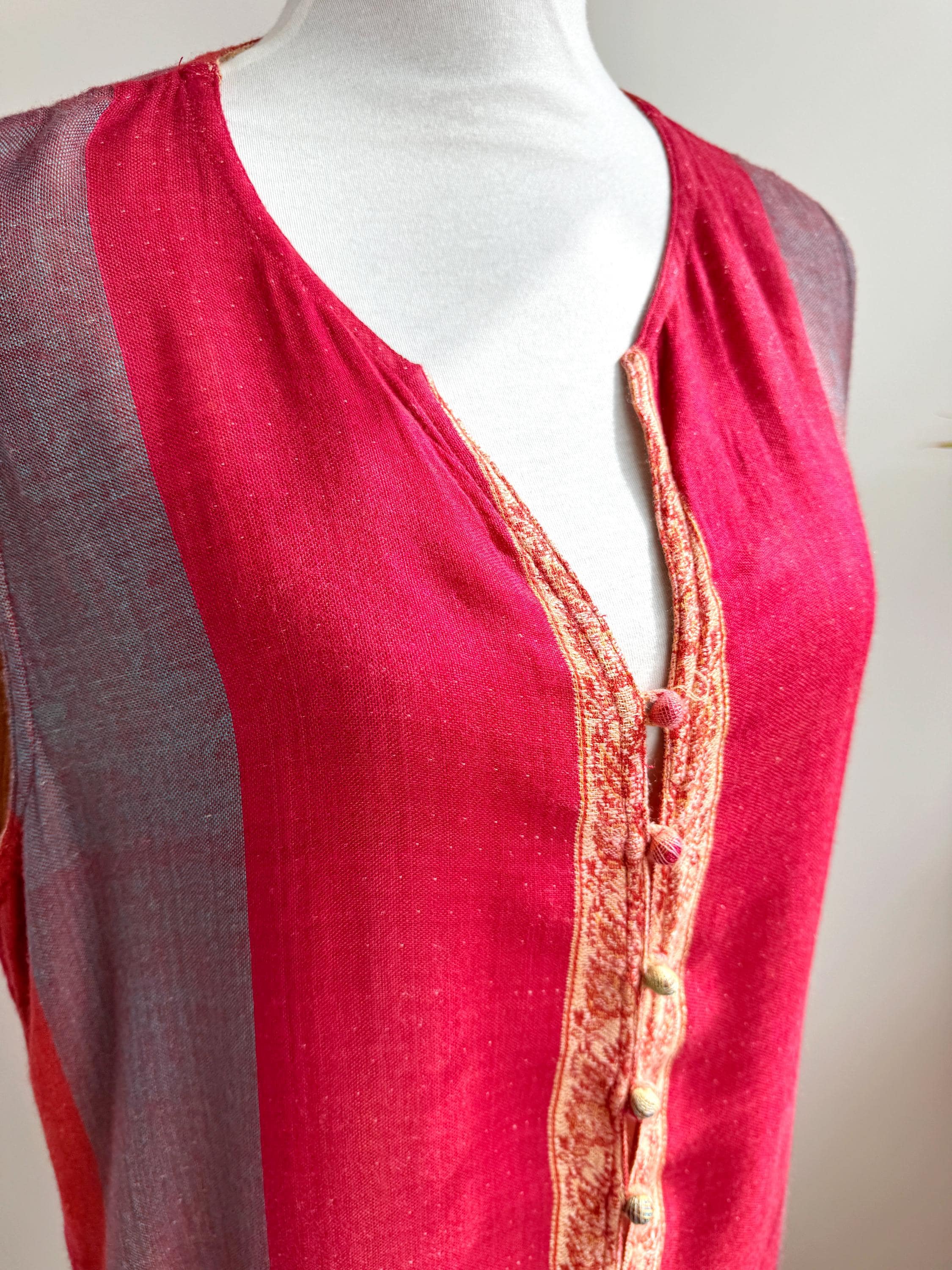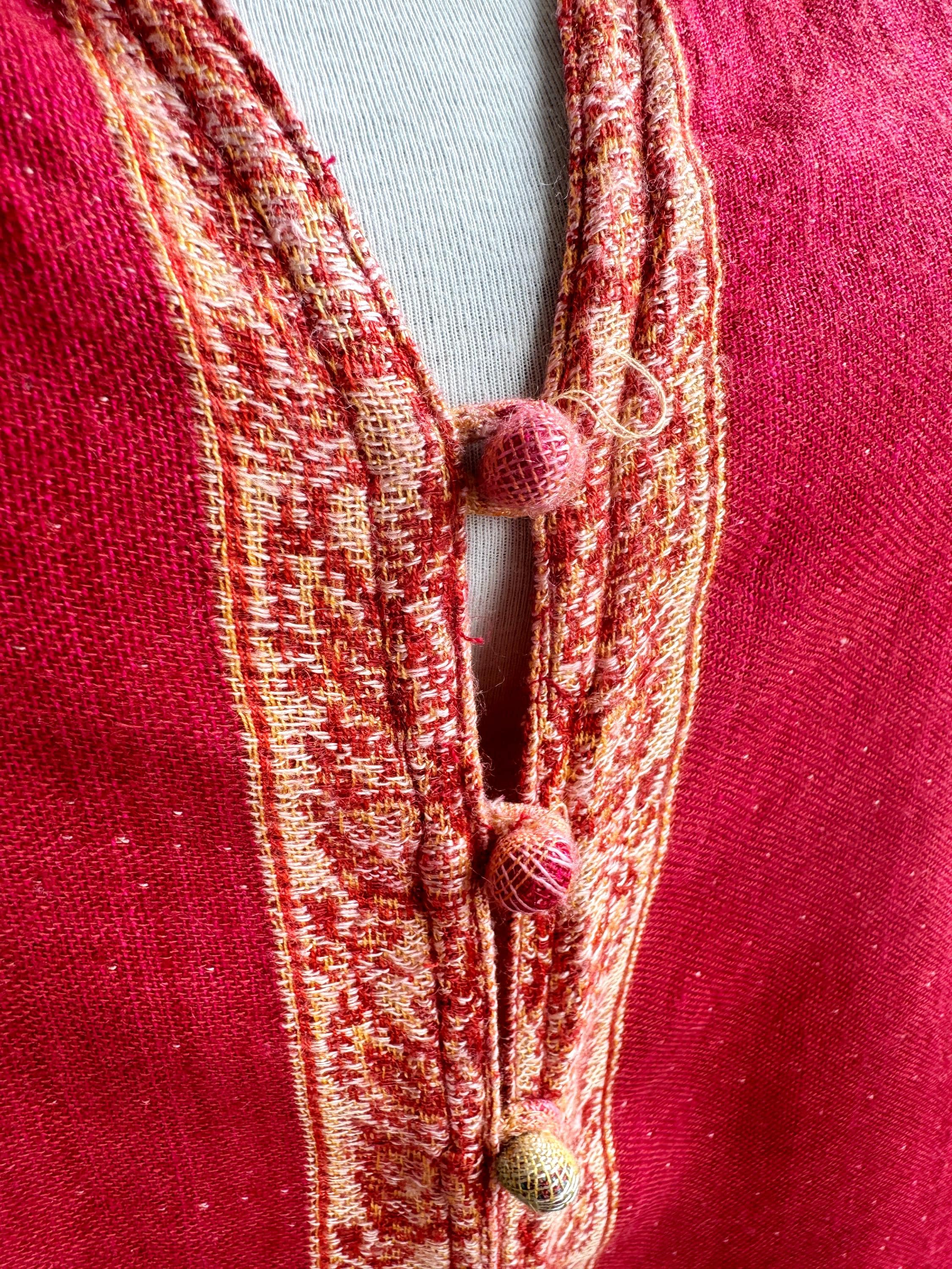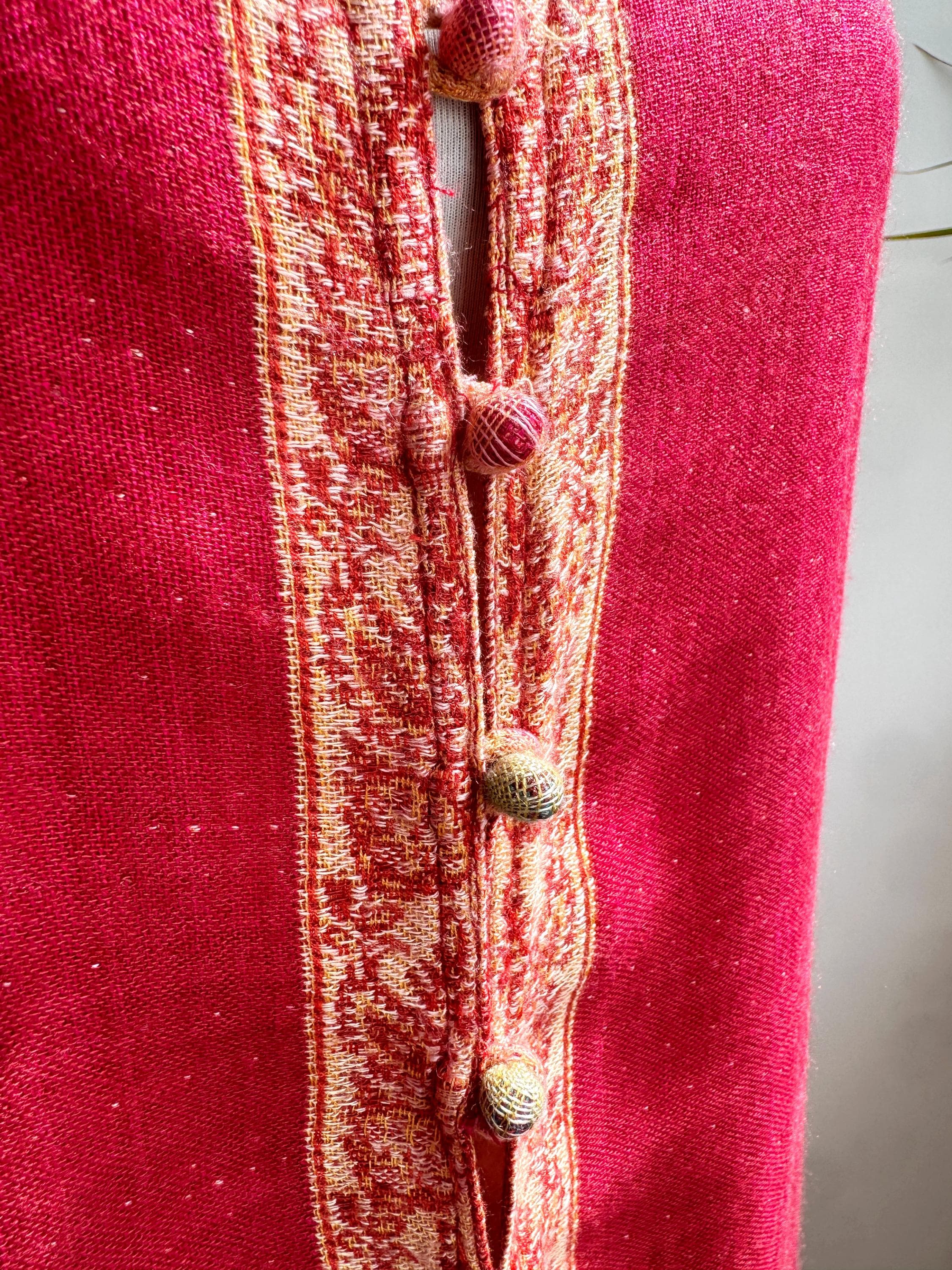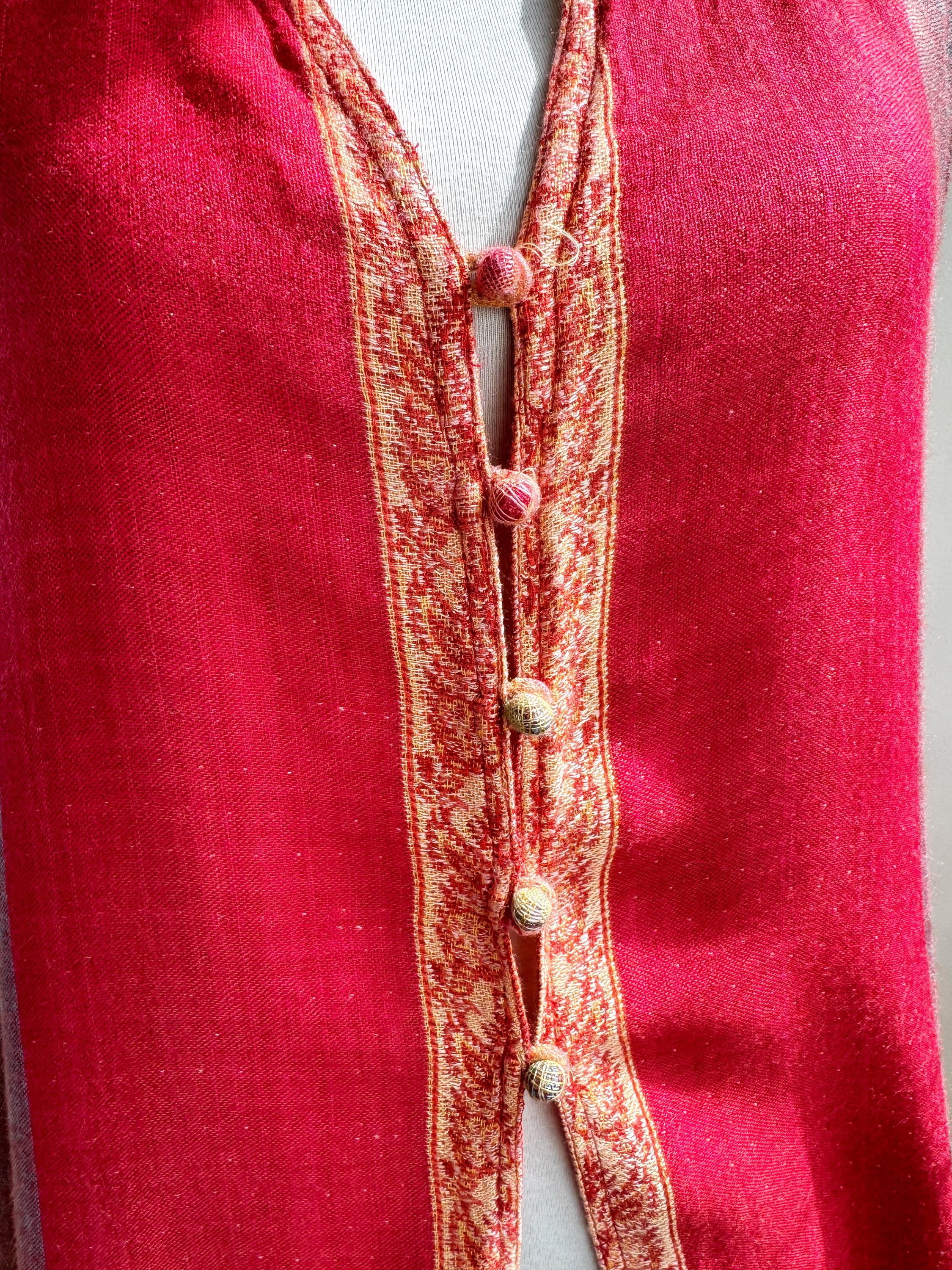 Bring a touch of artisanal elegance to your wardrobe with this stunning vintage longline vest. Featuring a rich color palette of deep crimson red and muted purple, this layering piece is beautifully accented by intricate golden-beige paisley embroidery that flows along the hem and the central fastening.