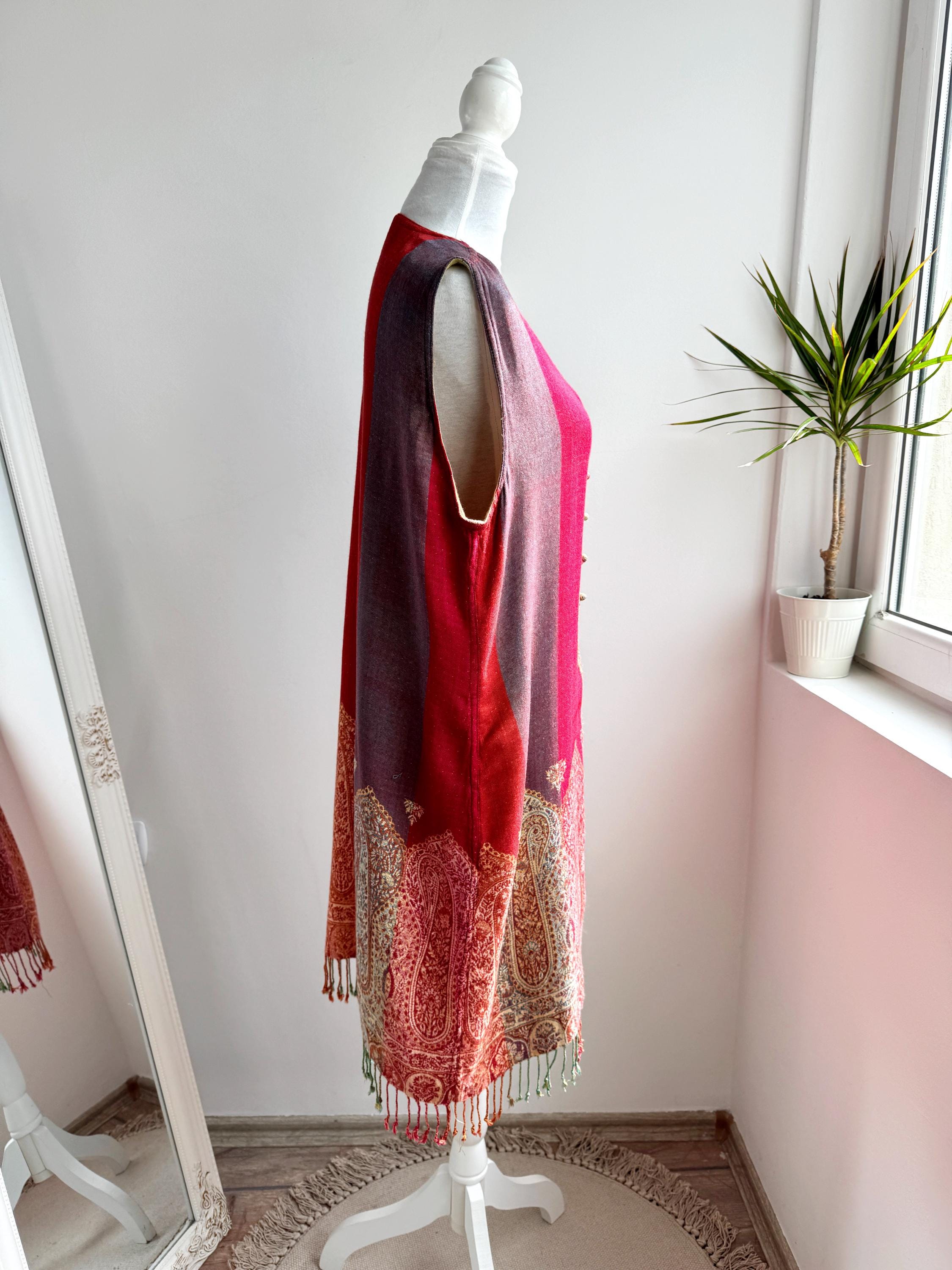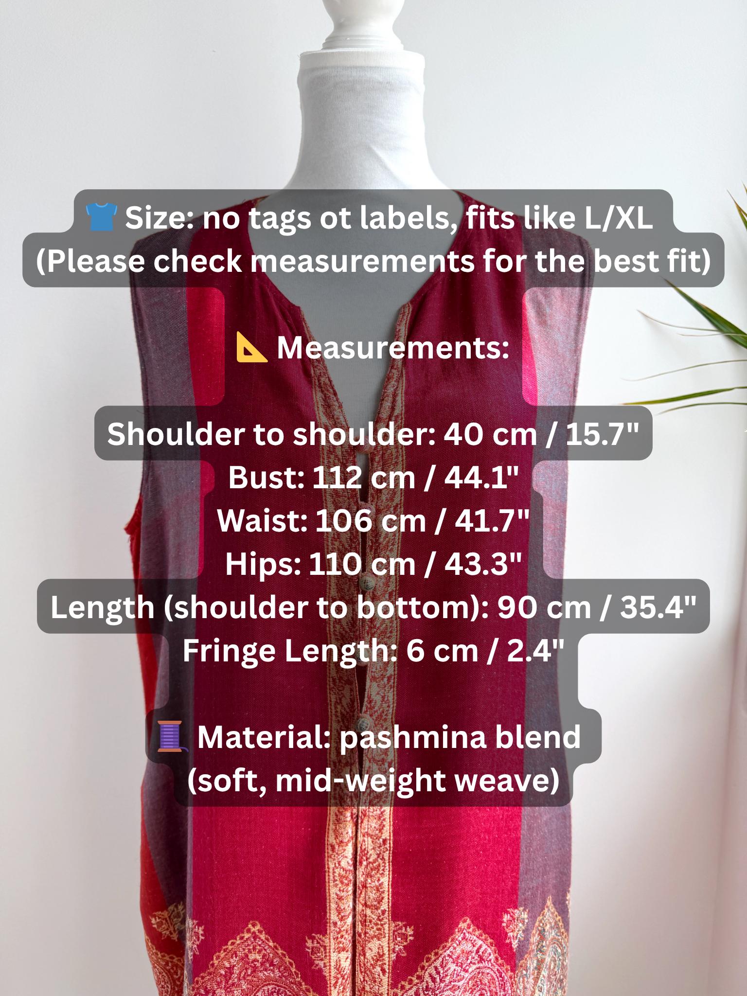 This longline pashmina shawl vest is designed with a flattering V-neckline and a unique front closure consisting of delicate, fabric-covered globe buttons. The bottom is finished with a playful fringe that adds movement and a bohemian flair to the silhouette. Perfect for layering over a simple turtleneck in the autumn or a breezy linen dress in the spring, this versatile layering piece transitions effortlessly between seasons. Whether you are aiming for a chic "art teacher" aesthetic or a layered folk-inspired look, this boho chic vest is a standout addition to any curated vintage collection.