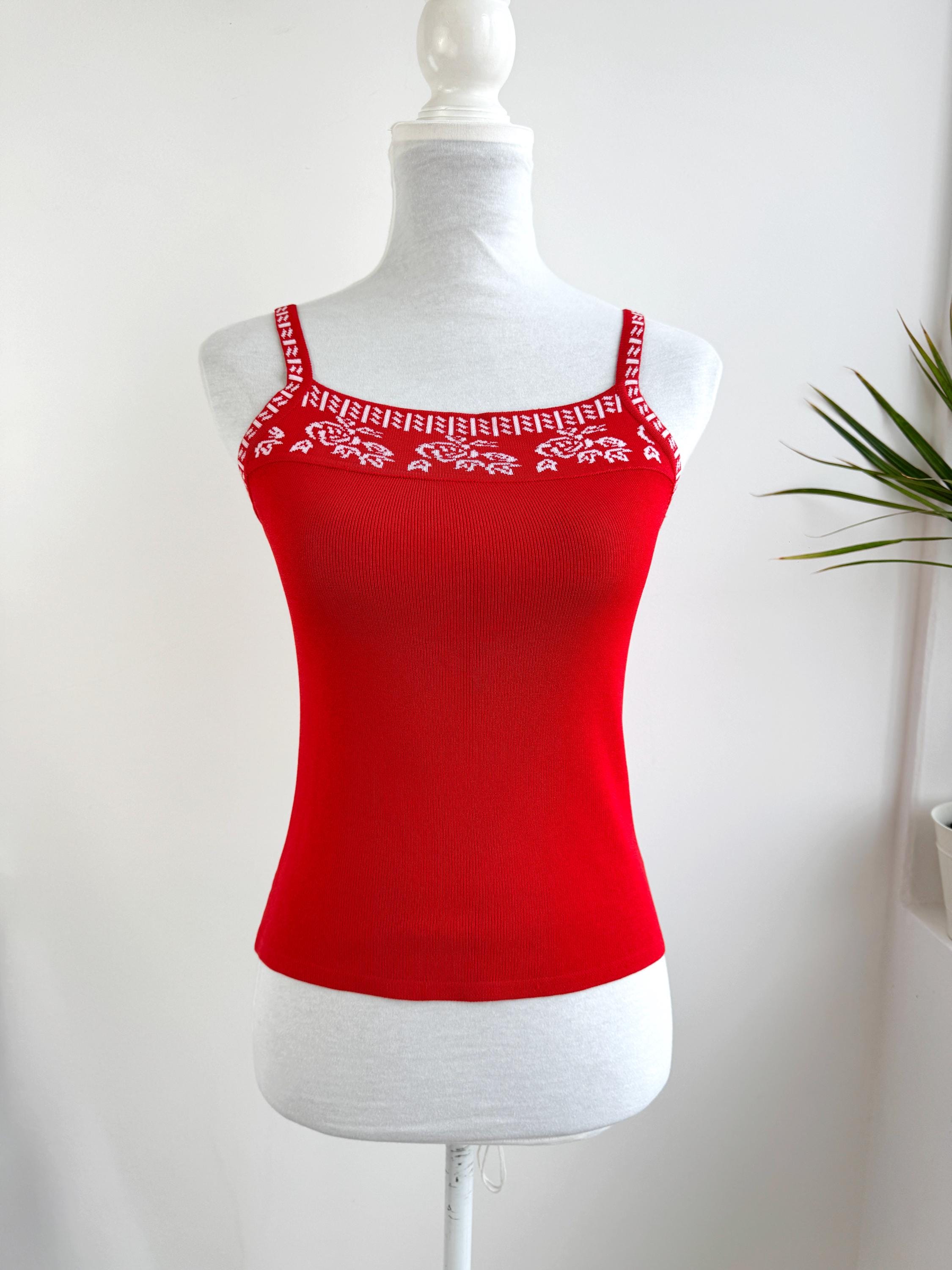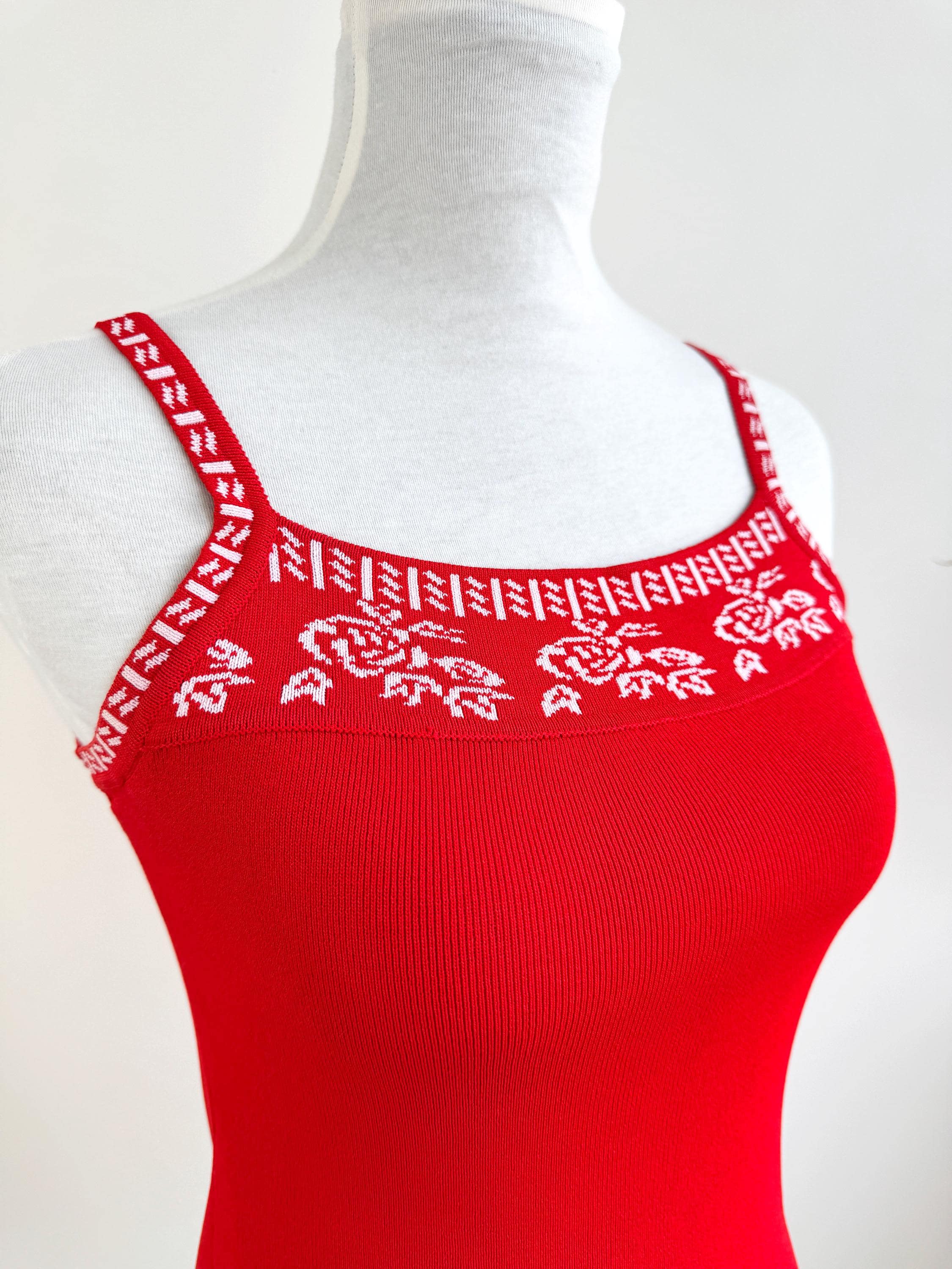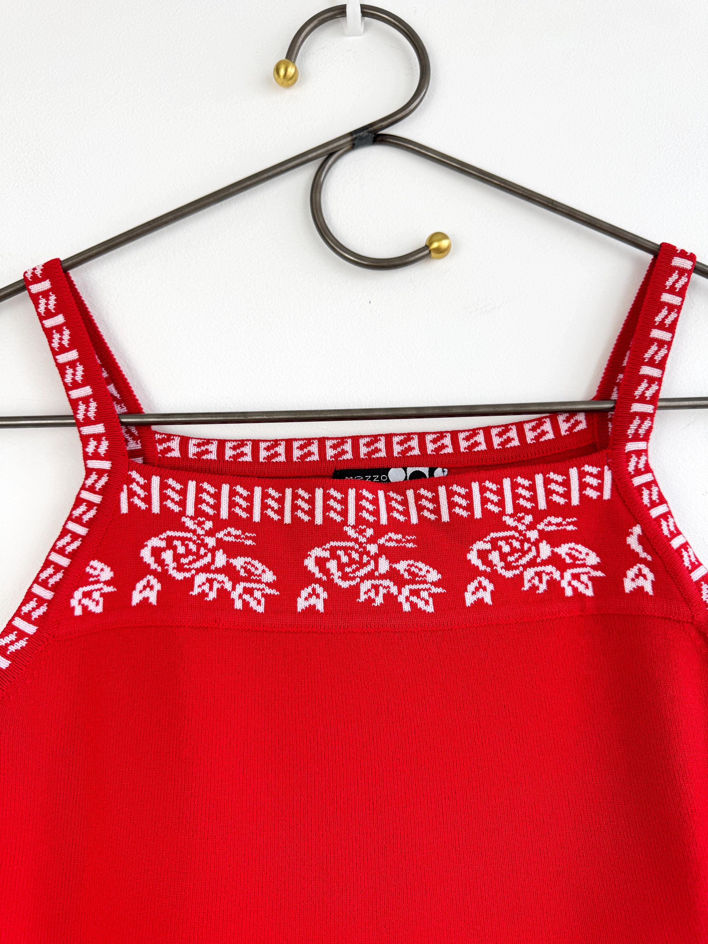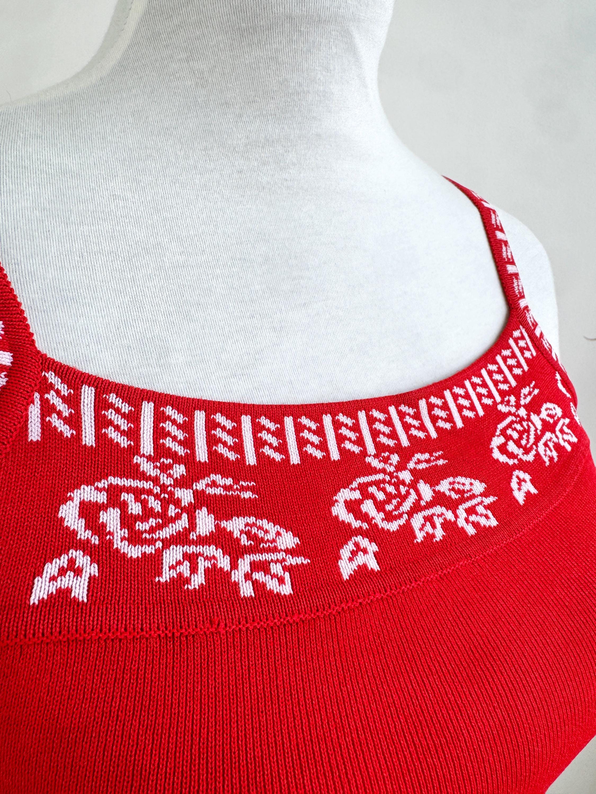 This is a vintage Italian stunning red knit camisole by Mezzo, Made in Italy. The bold cherry-red ribbed body is crowned with an intricate white Fair Isle-style border featuring delicate rose motifs and geometric patterns — a signature detail that makes this piece completely unforgettable. Whether you style it tucked into high-waisted jeans, layered under a blazer, or worn solo on a summer evening, this little knit cami top delivers maximum impact with zero effort.