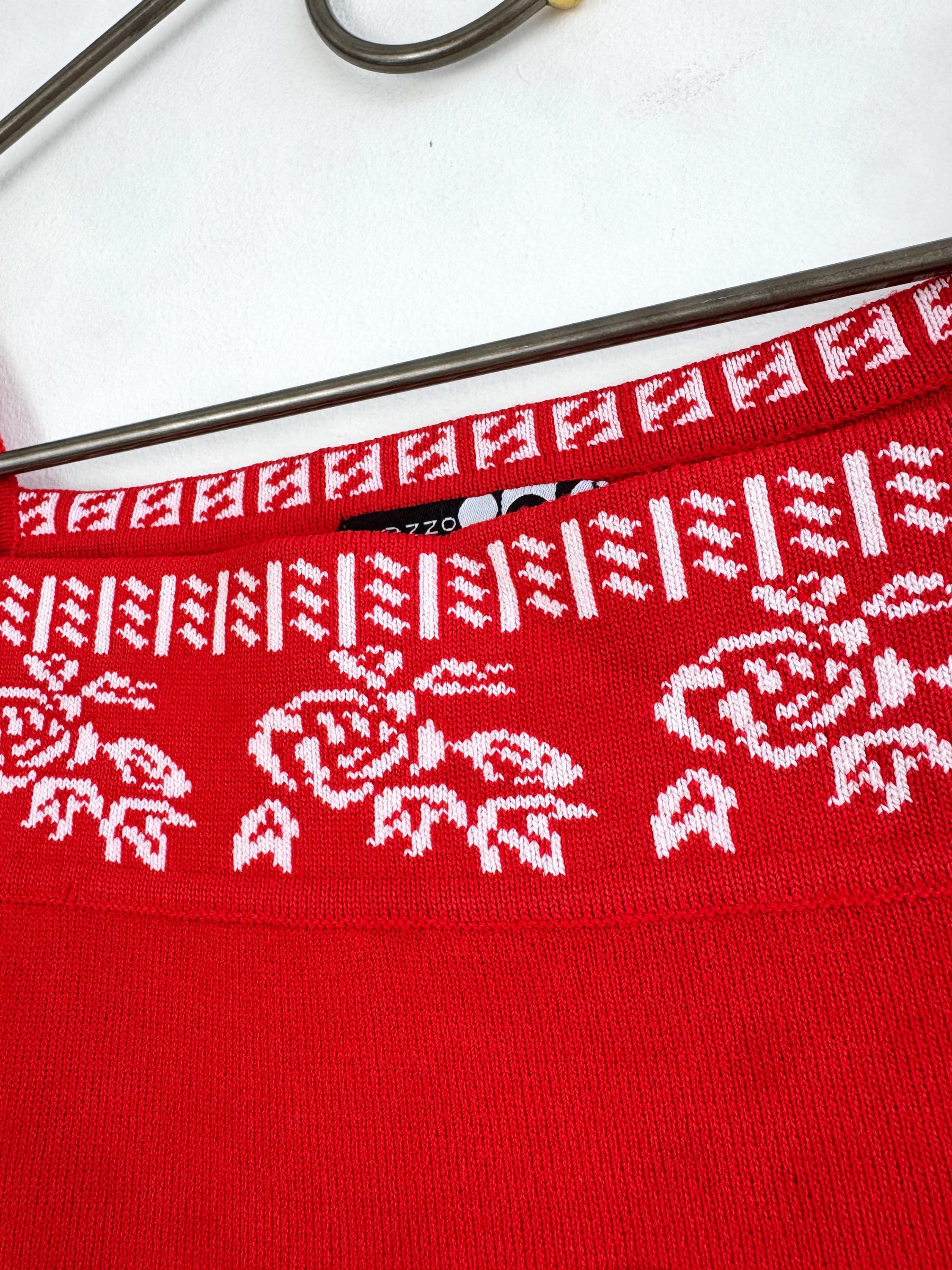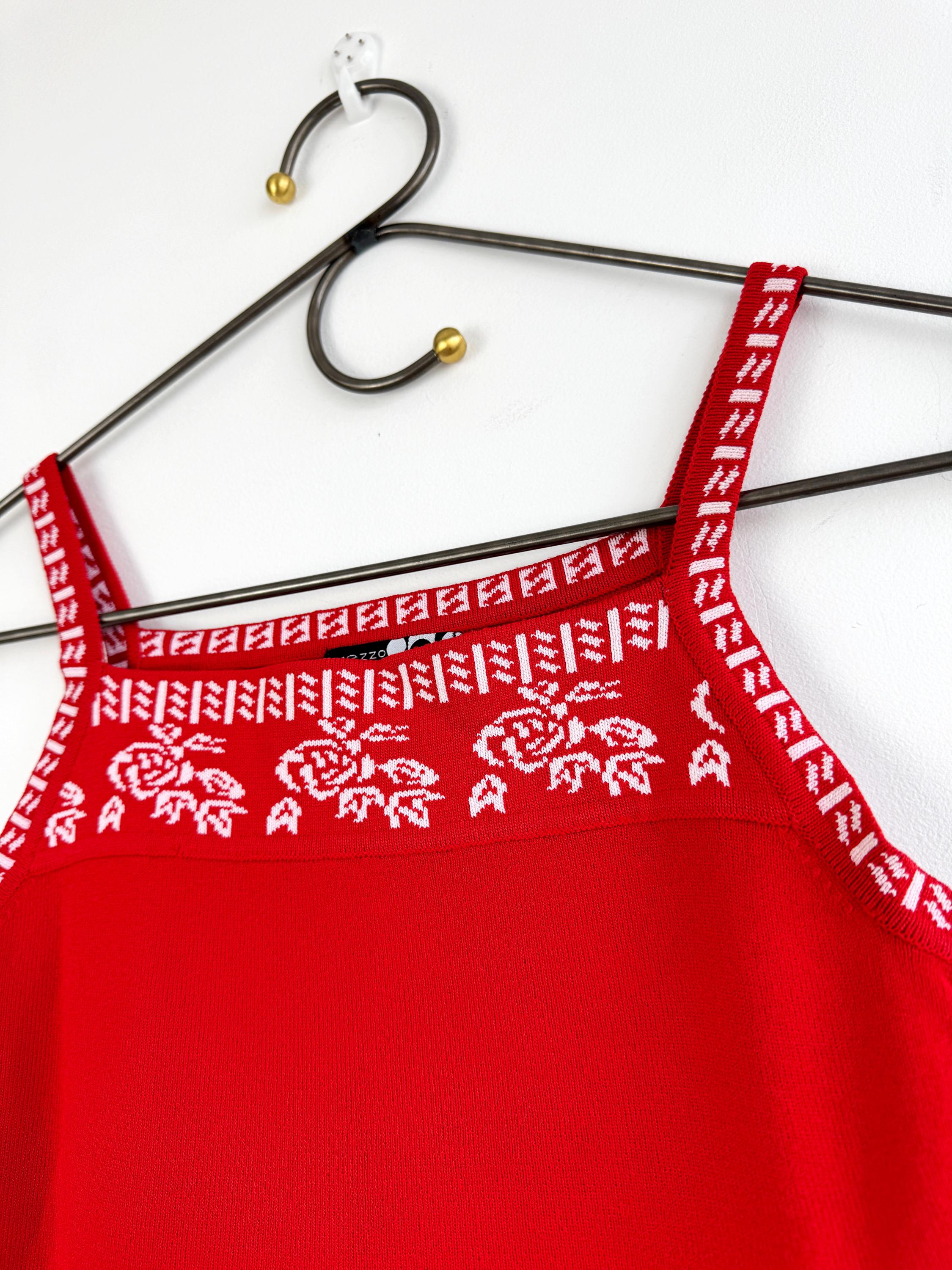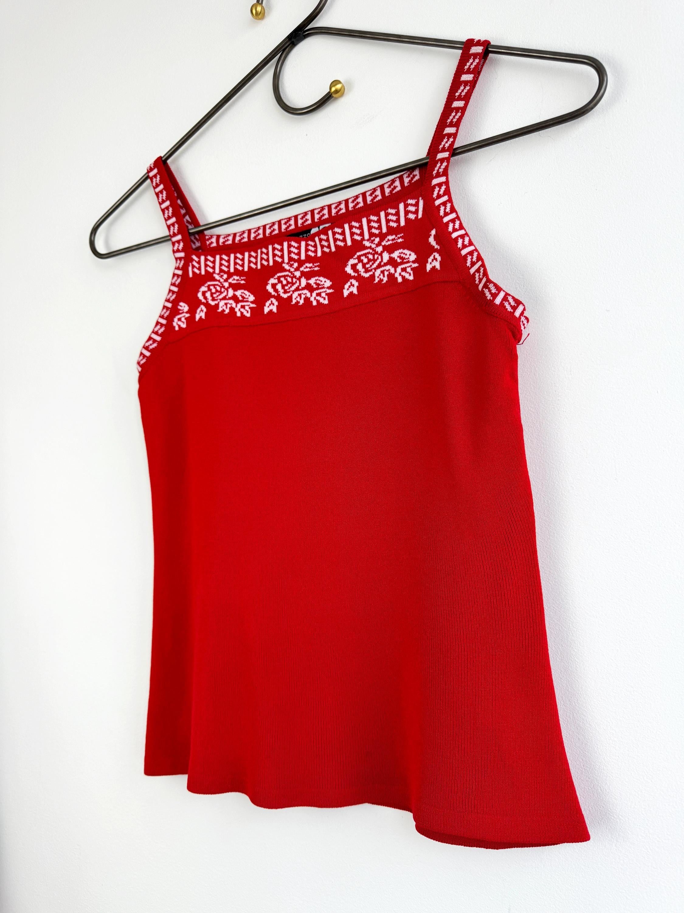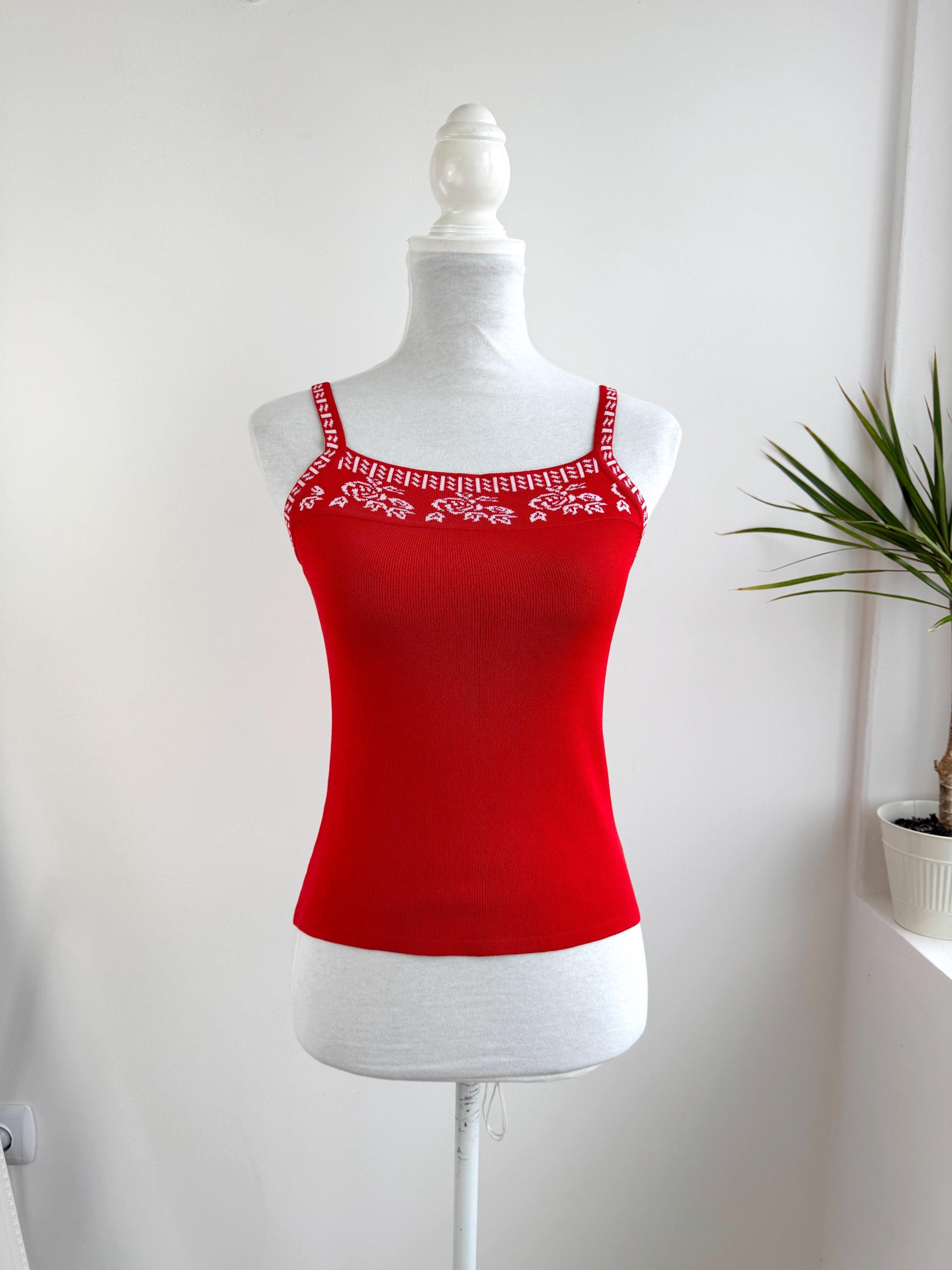 This is a vintage Italian stunning red knit camisole by Mezzo, Made in Italy. The bold cherry-red ribbed body is crowned with an intricate white Fair Isle-style border featuring delicate rose motifs and geometric patterns — a signature detail that makes this piece completely unforgettable. Whether you style it tucked into high-waisted jeans, layered under a blazer, or worn solo on a summer evening, this little knit cami top delivers maximum impact with zero effort.