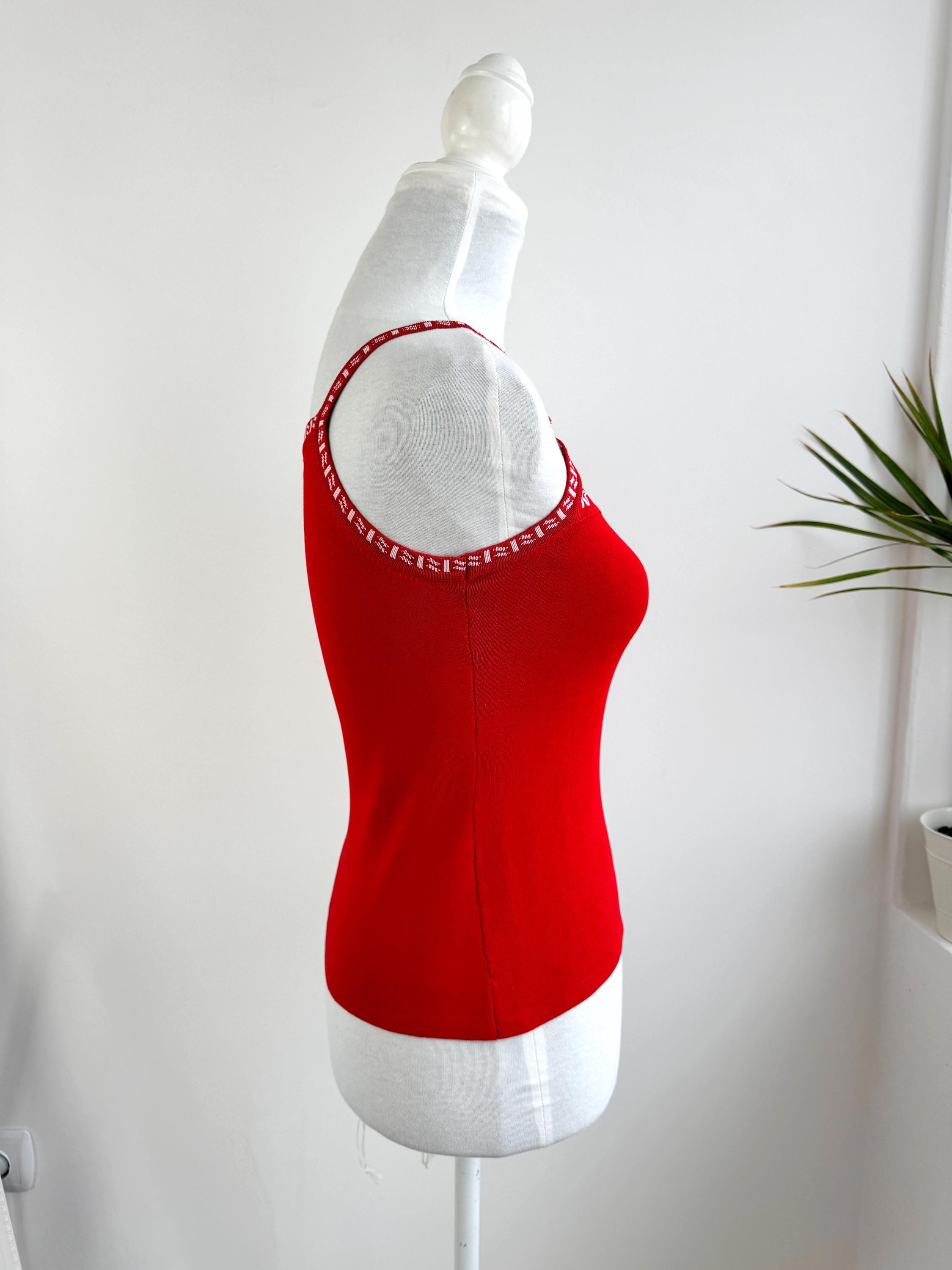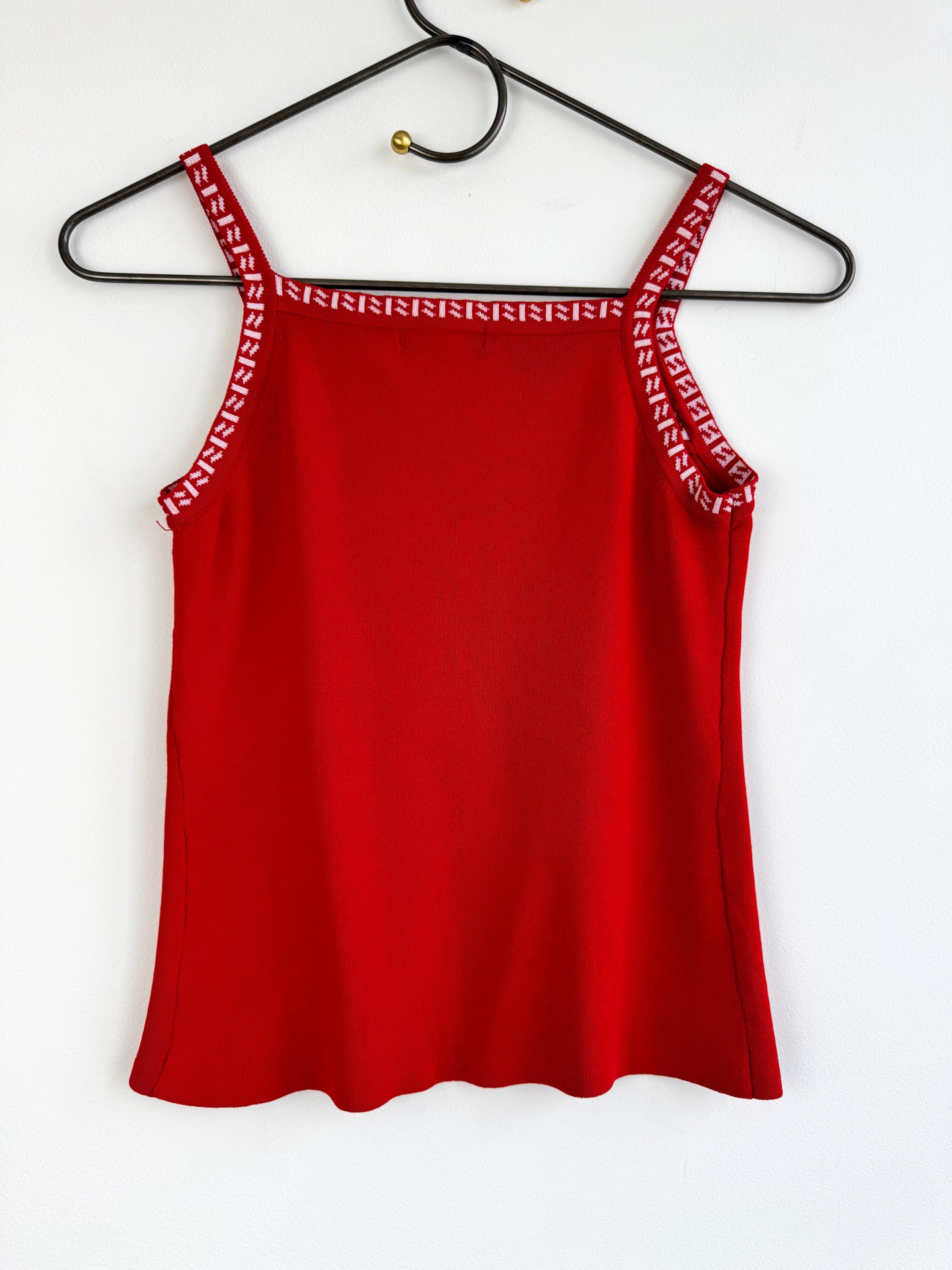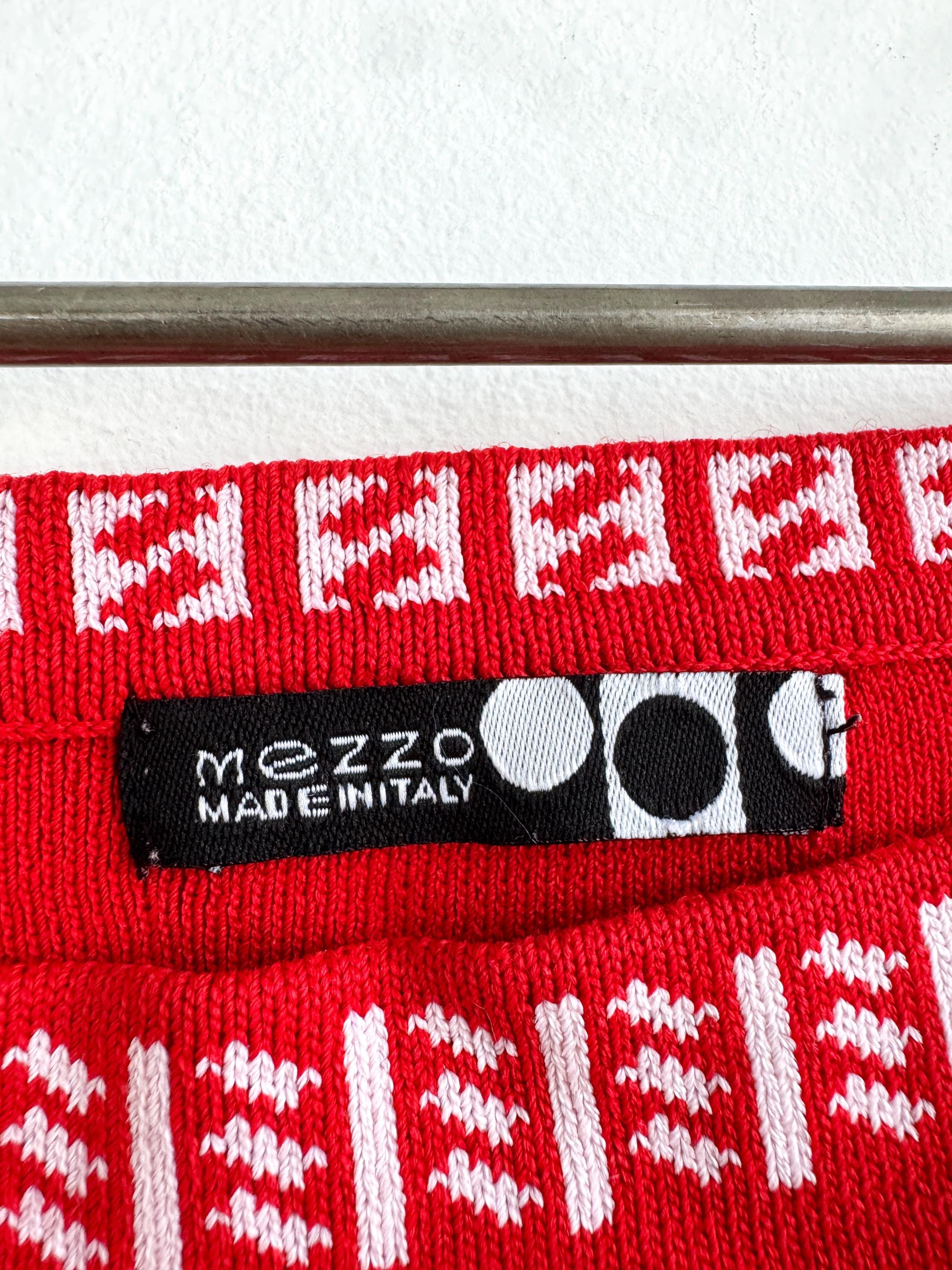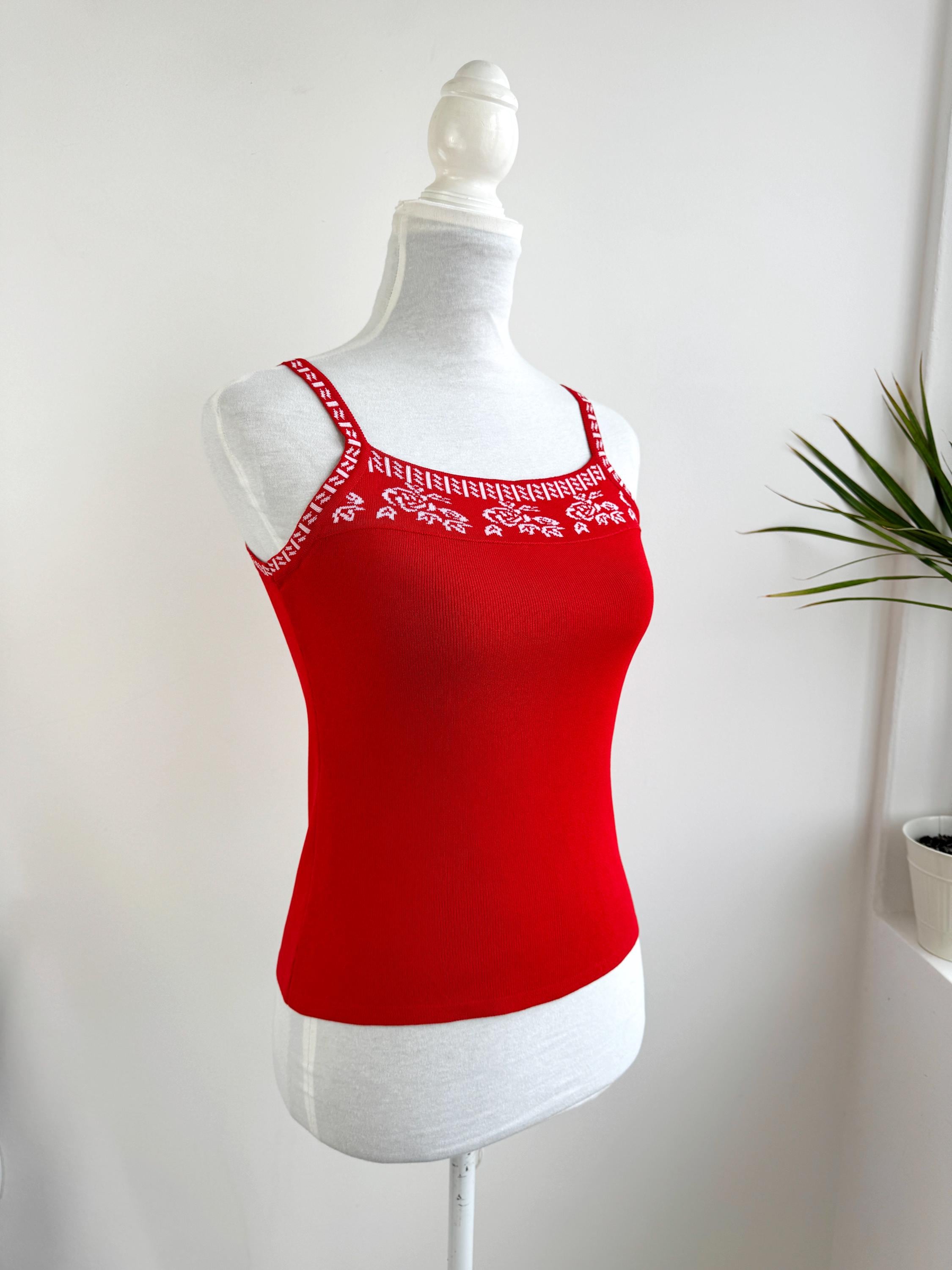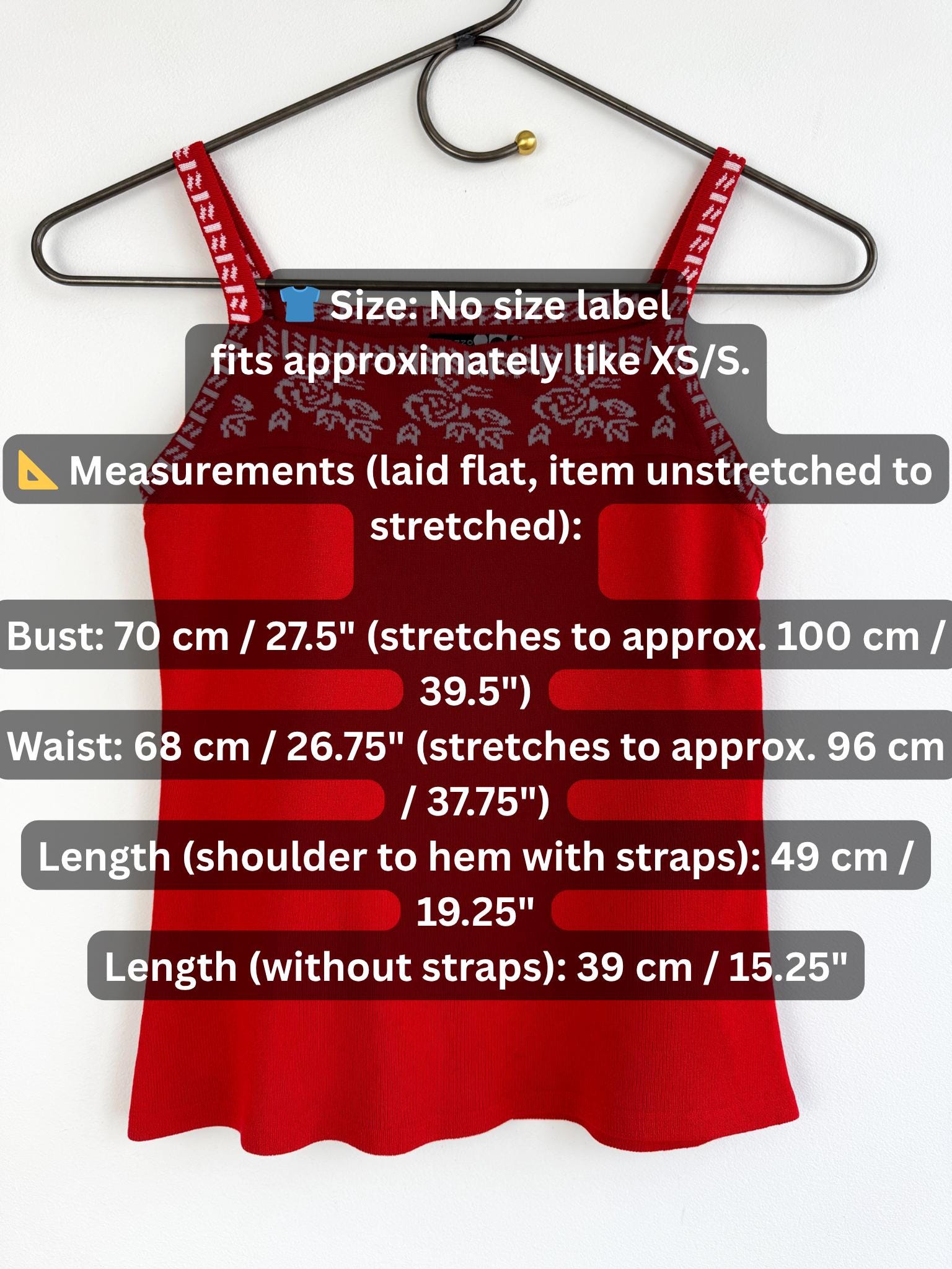 This is a vintage Italian stunning red knit camisole by Mezzo, Made in Italy. The bold cherry-red ribbed body is crowned with an intricate white Fair Isle-style border featuring delicate rose motifs and geometric patterns — a signature detail that makes this piece completely unforgettable. Whether you style it tucked into high-waisted jeans, layered under a blazer, or worn solo on a summer evening, this little knit cami top delivers maximum impact with zero effort.