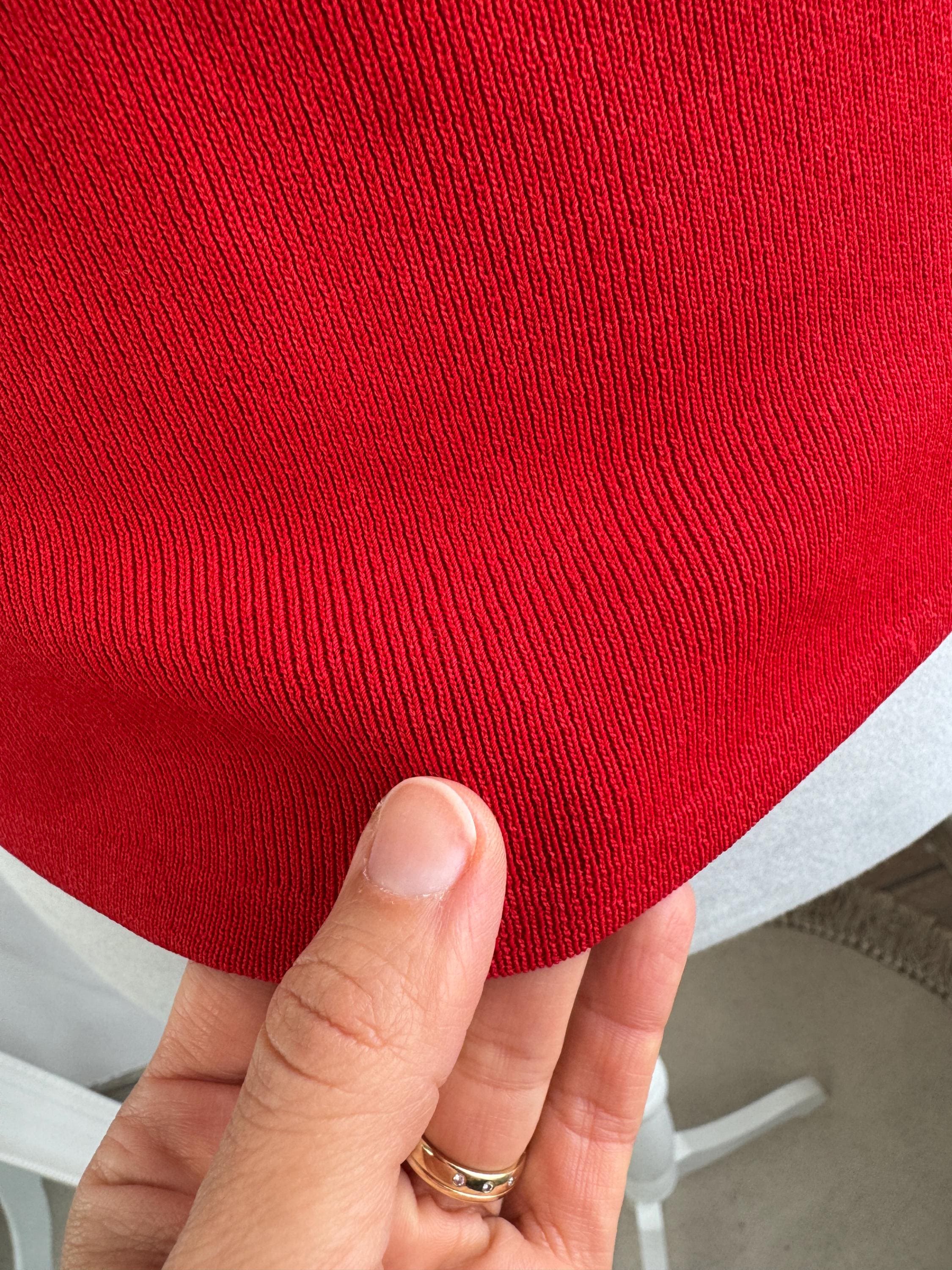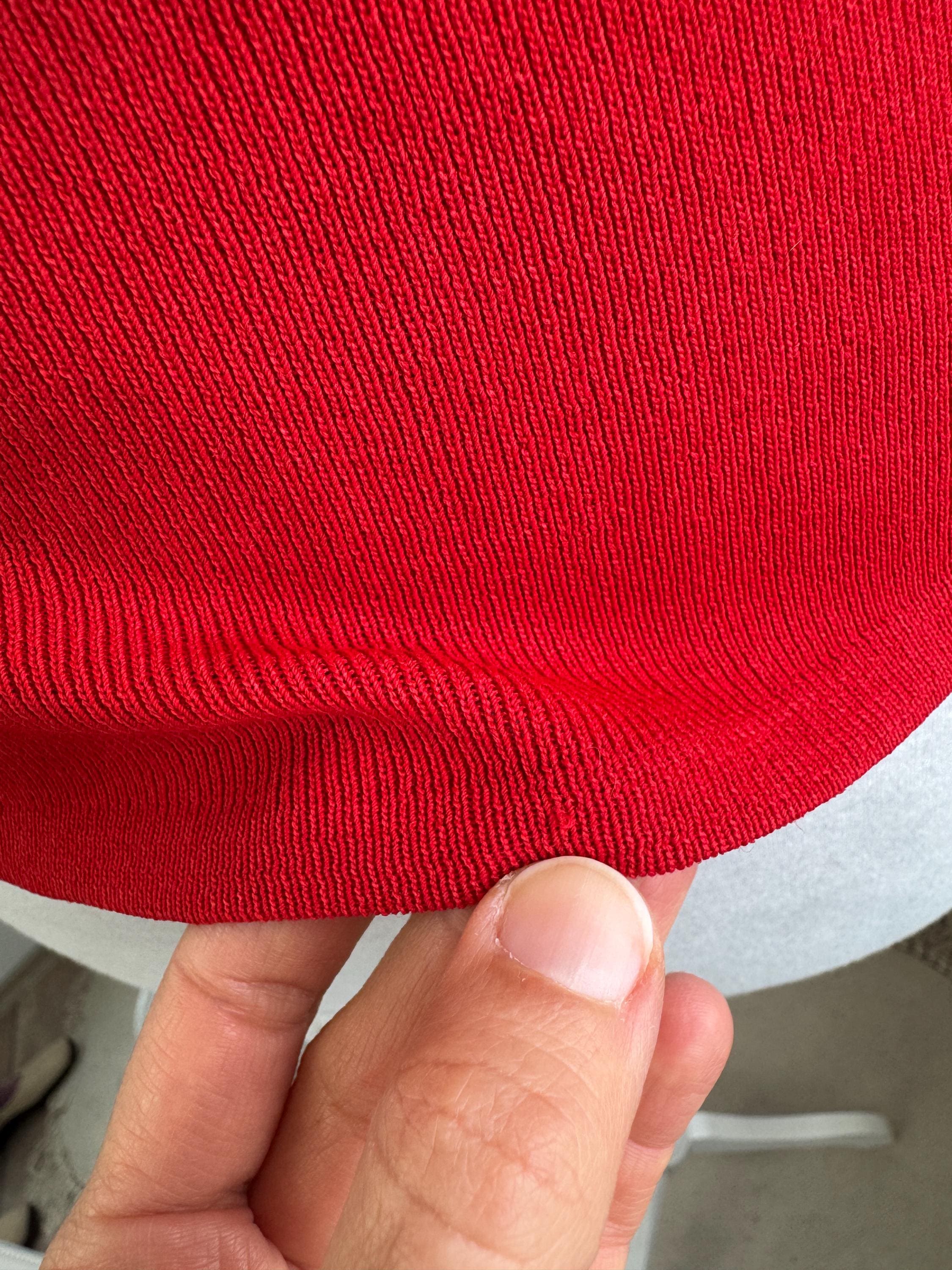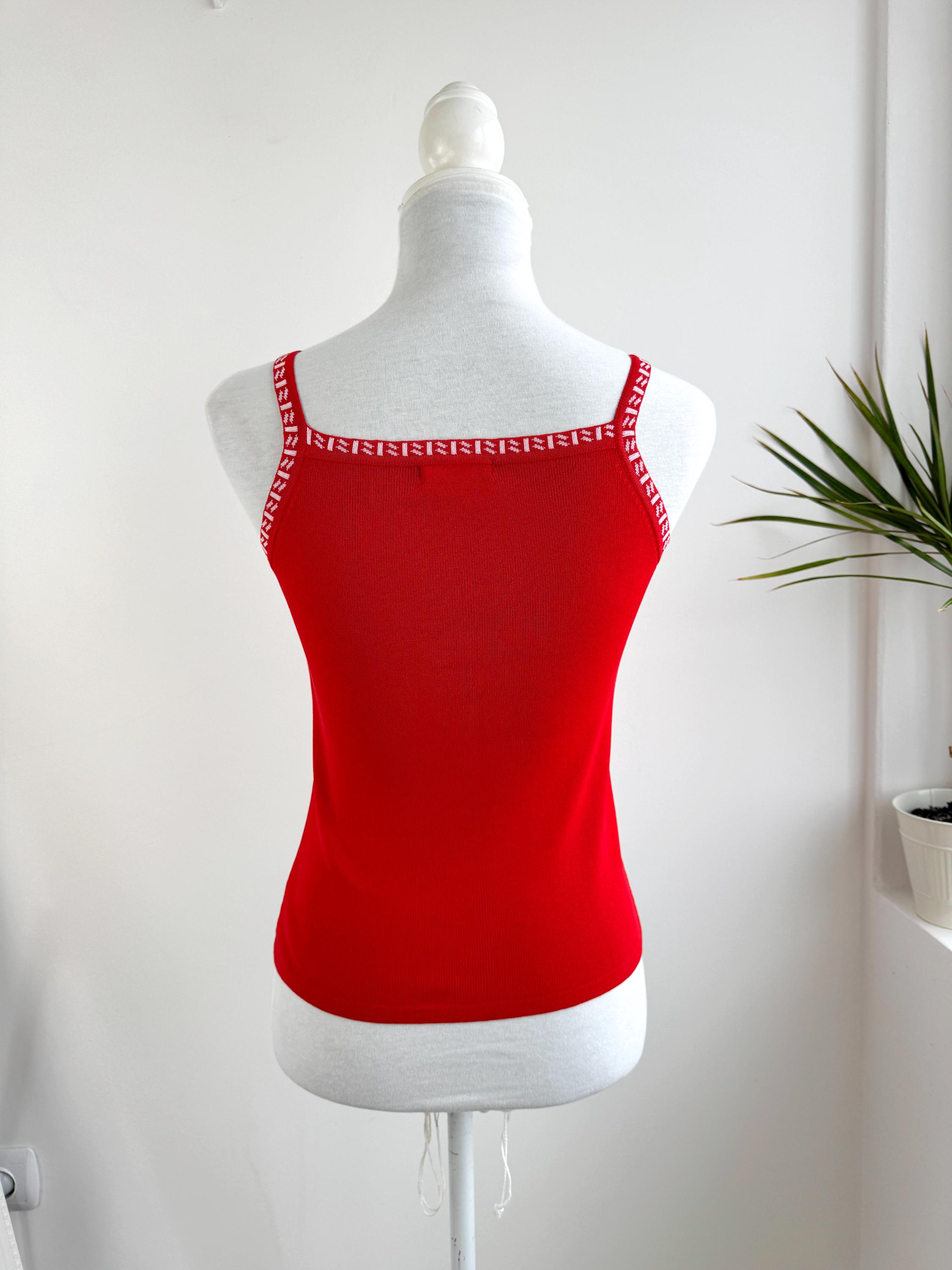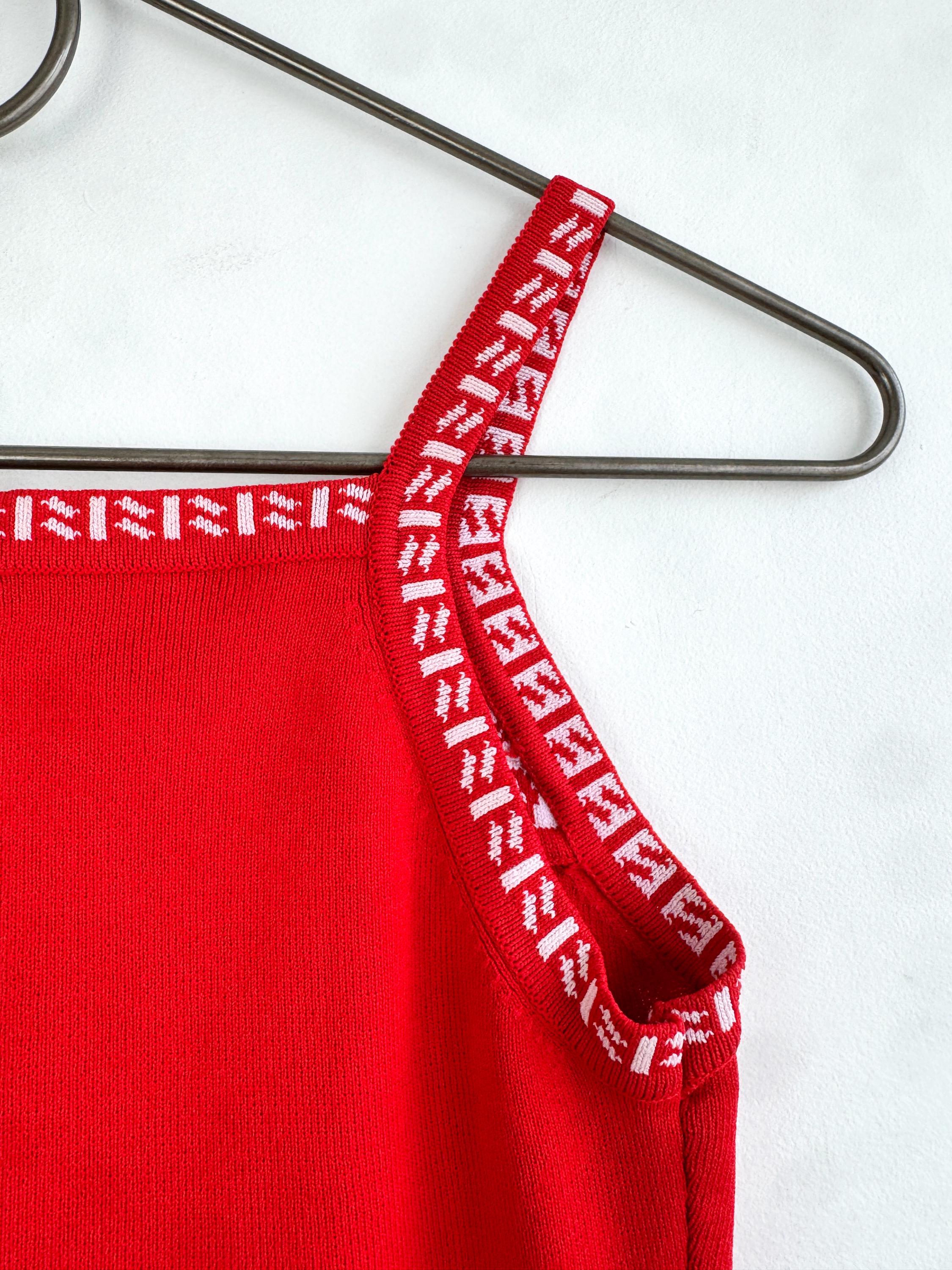 This is a vintage Italian stunning red knit camisole by Mezzo, Made in Italy. The bold cherry-red ribbed body is crowned with an intricate white Fair Isle-style border featuring delicate rose motifs and geometric patterns — a signature detail that makes this piece completely unforgettable. Whether you style it tucked into high-waisted jeans, layered under a blazer, or worn solo on a summer evening, this little knit cami top delivers maximum impact with zero effort.
