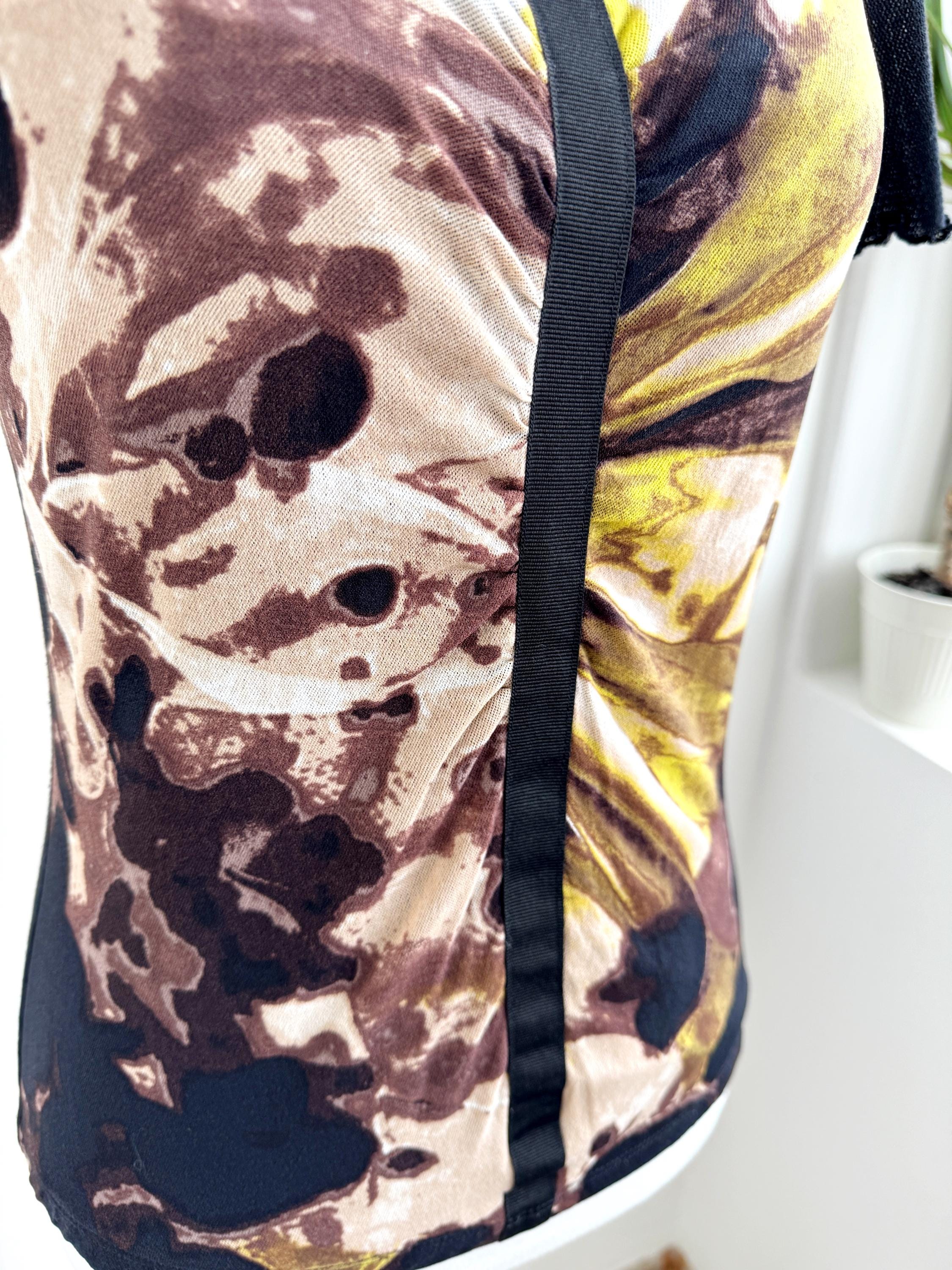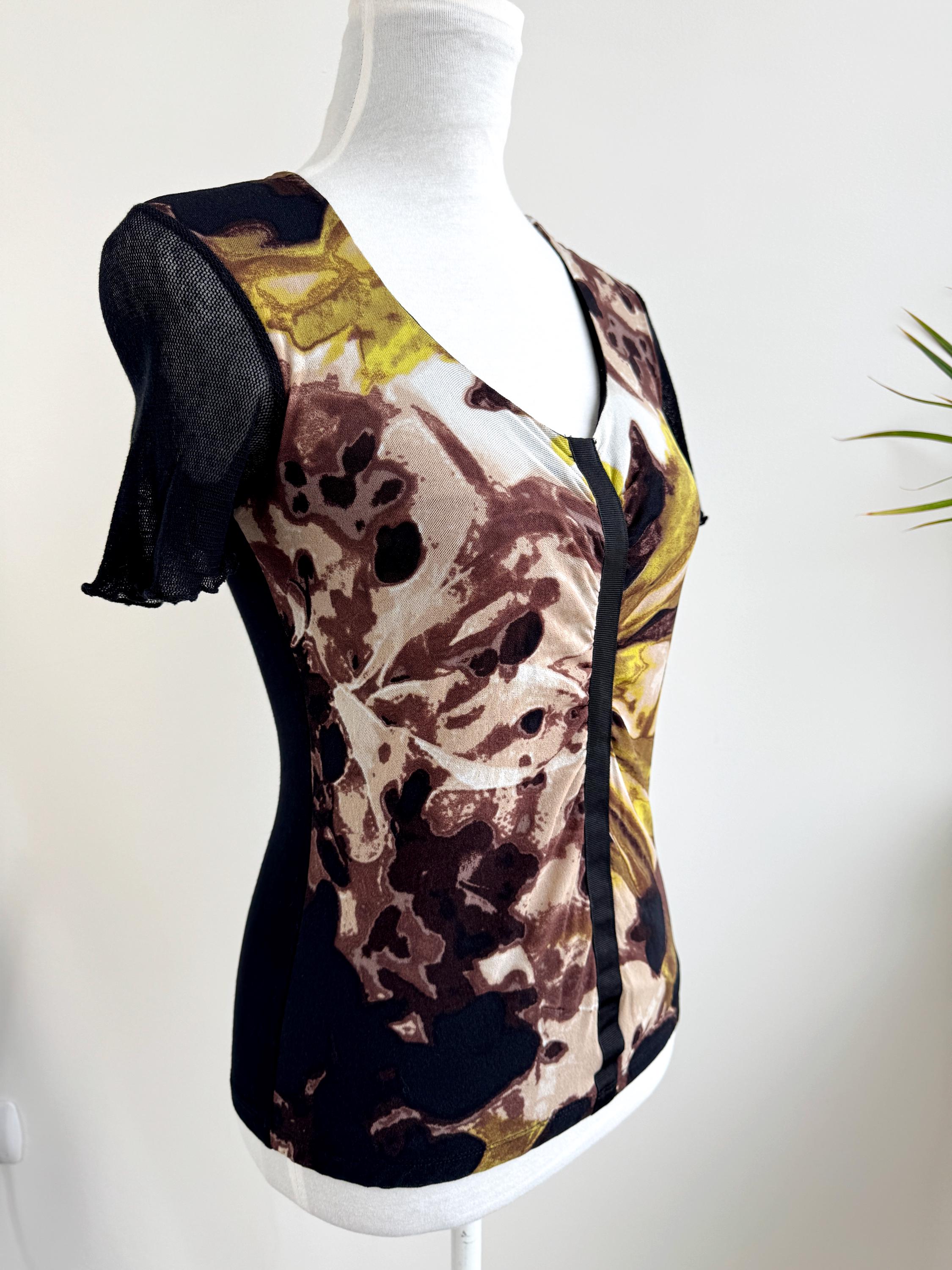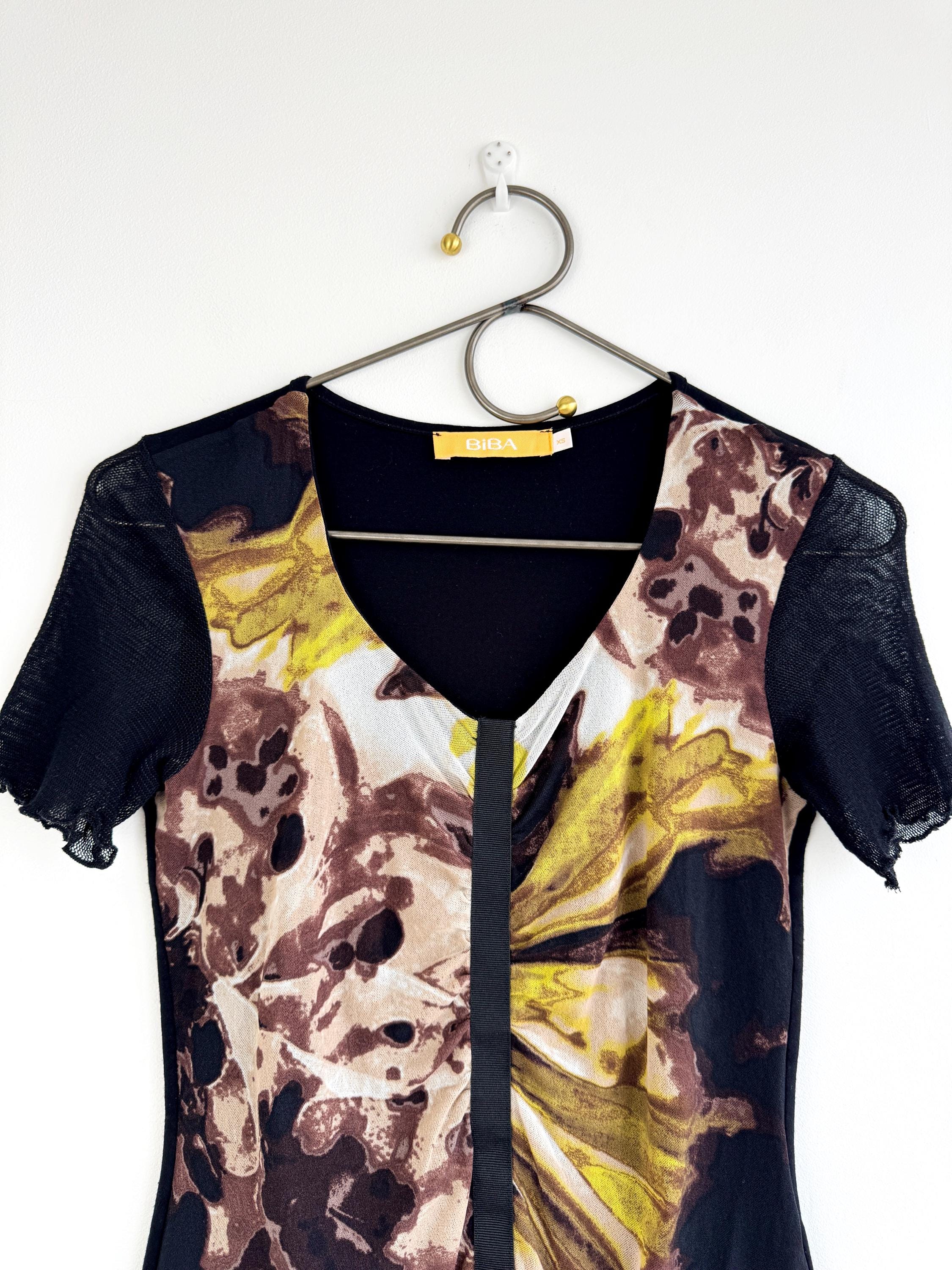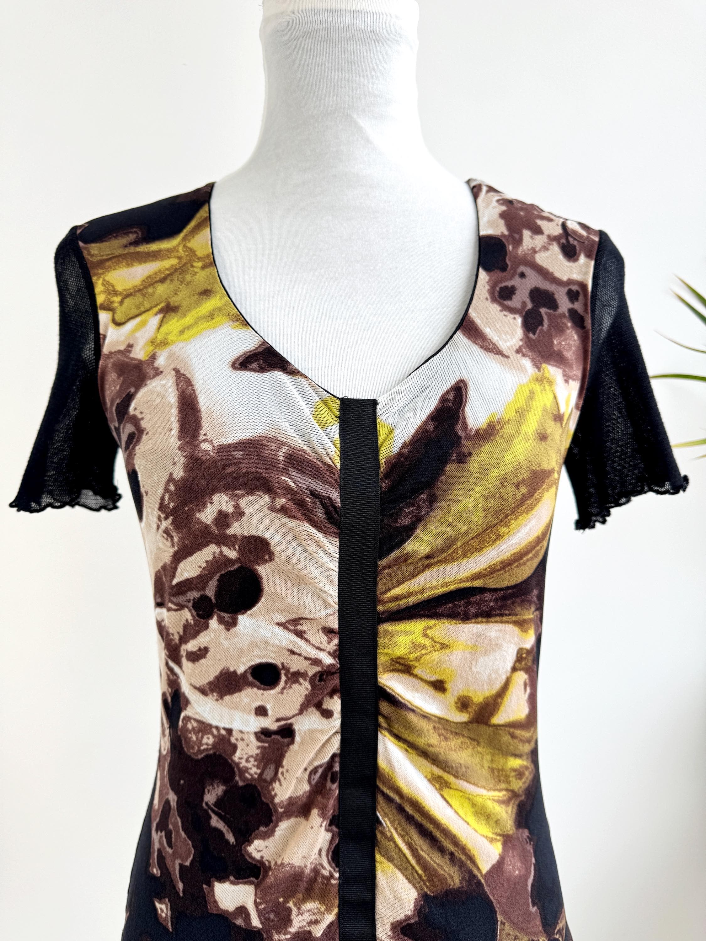 This striking vintage BiBA top features a captivating blend of textures and art-style prints. Designed in Germany, this piece showcases a vibrant abstract floral pattern in earthy browns, mustard yellows, lime green and deep blacks. The front is uniquely constructed with a layered mesh bodice and a vertical ribbon detail that creates elegant ruching across the chest.