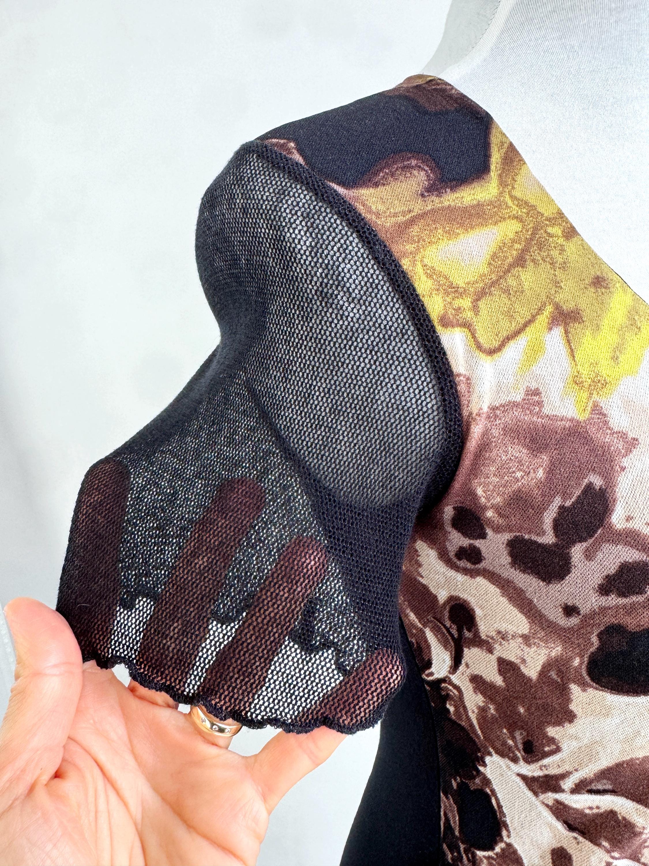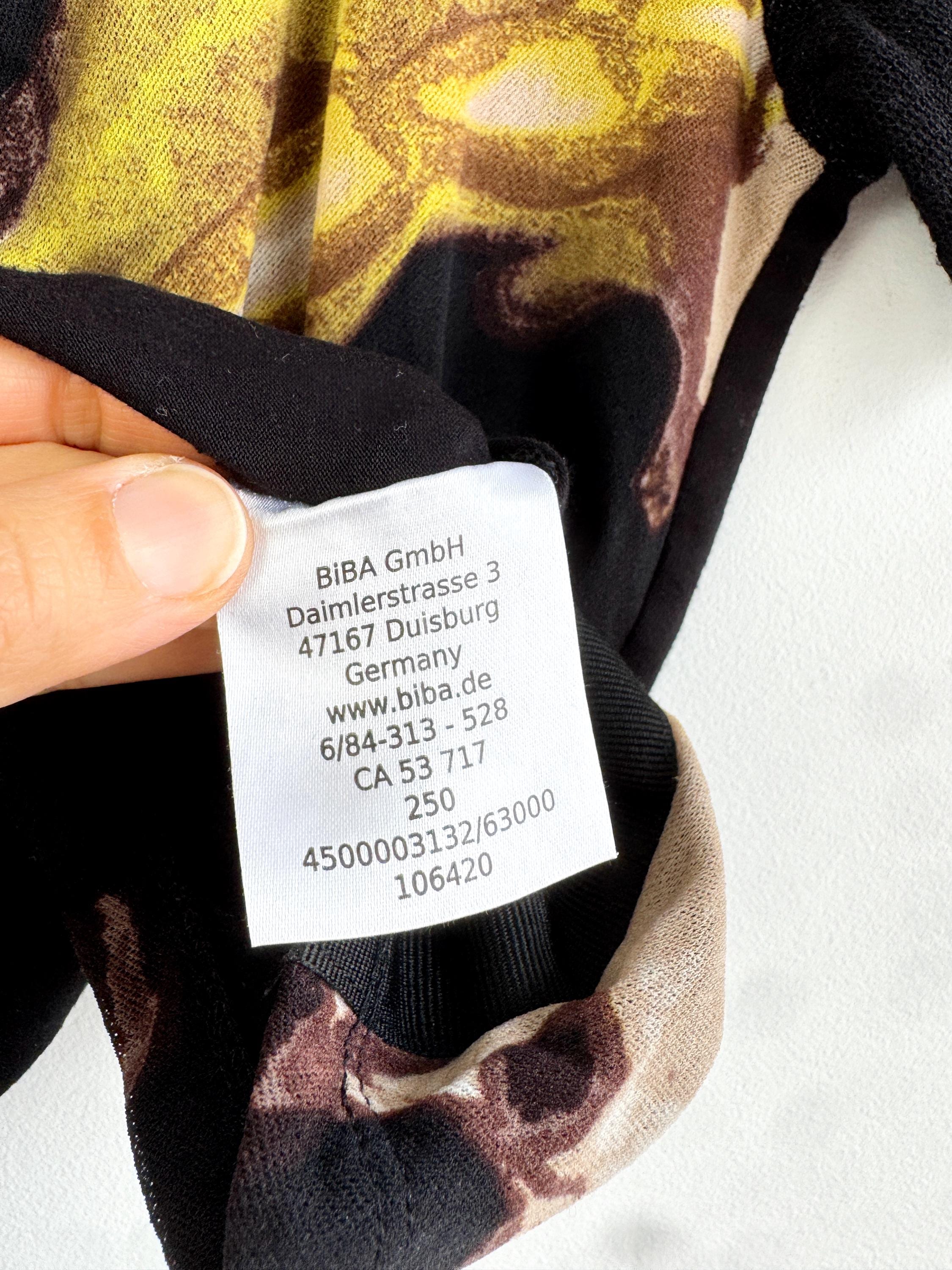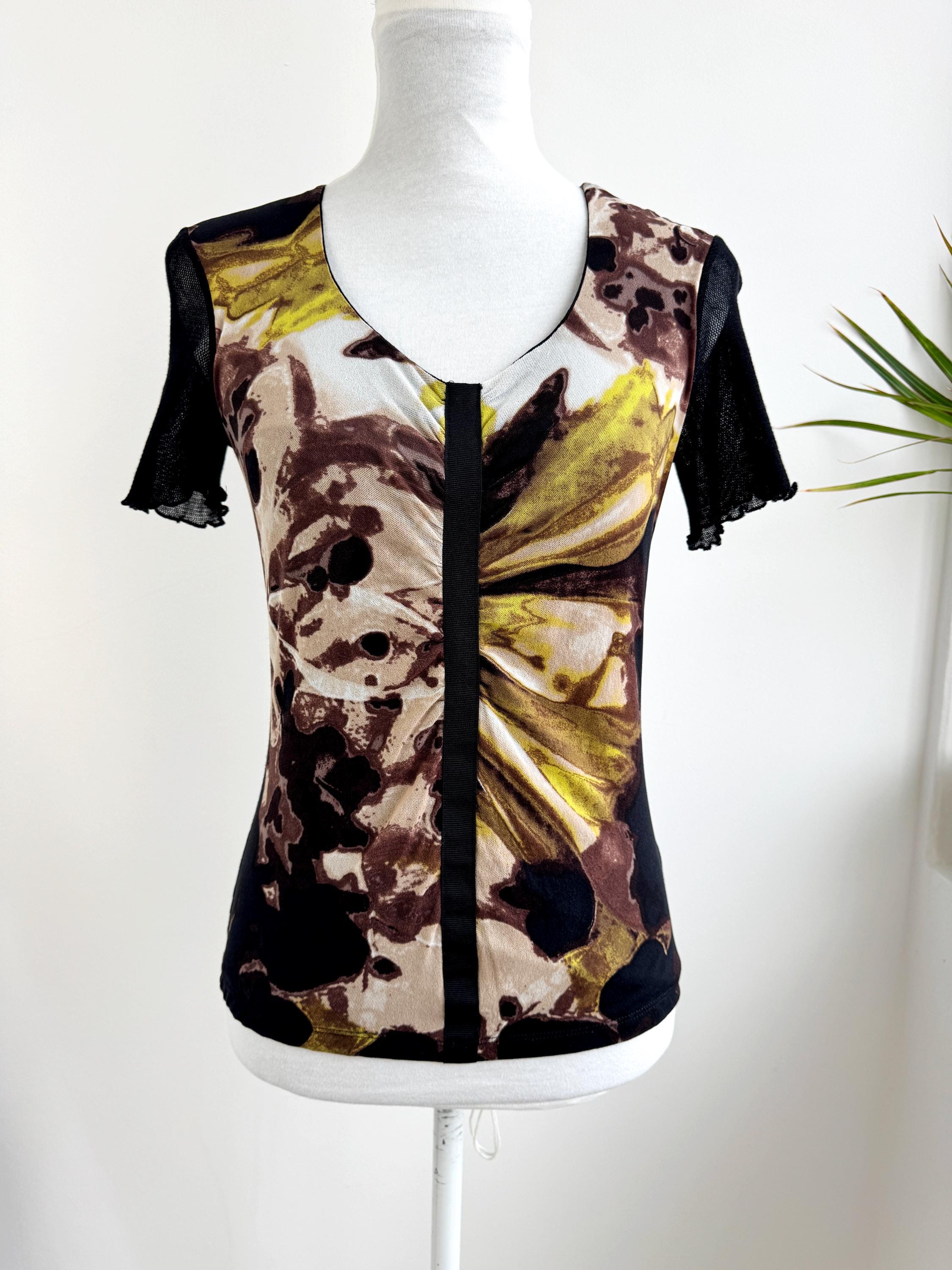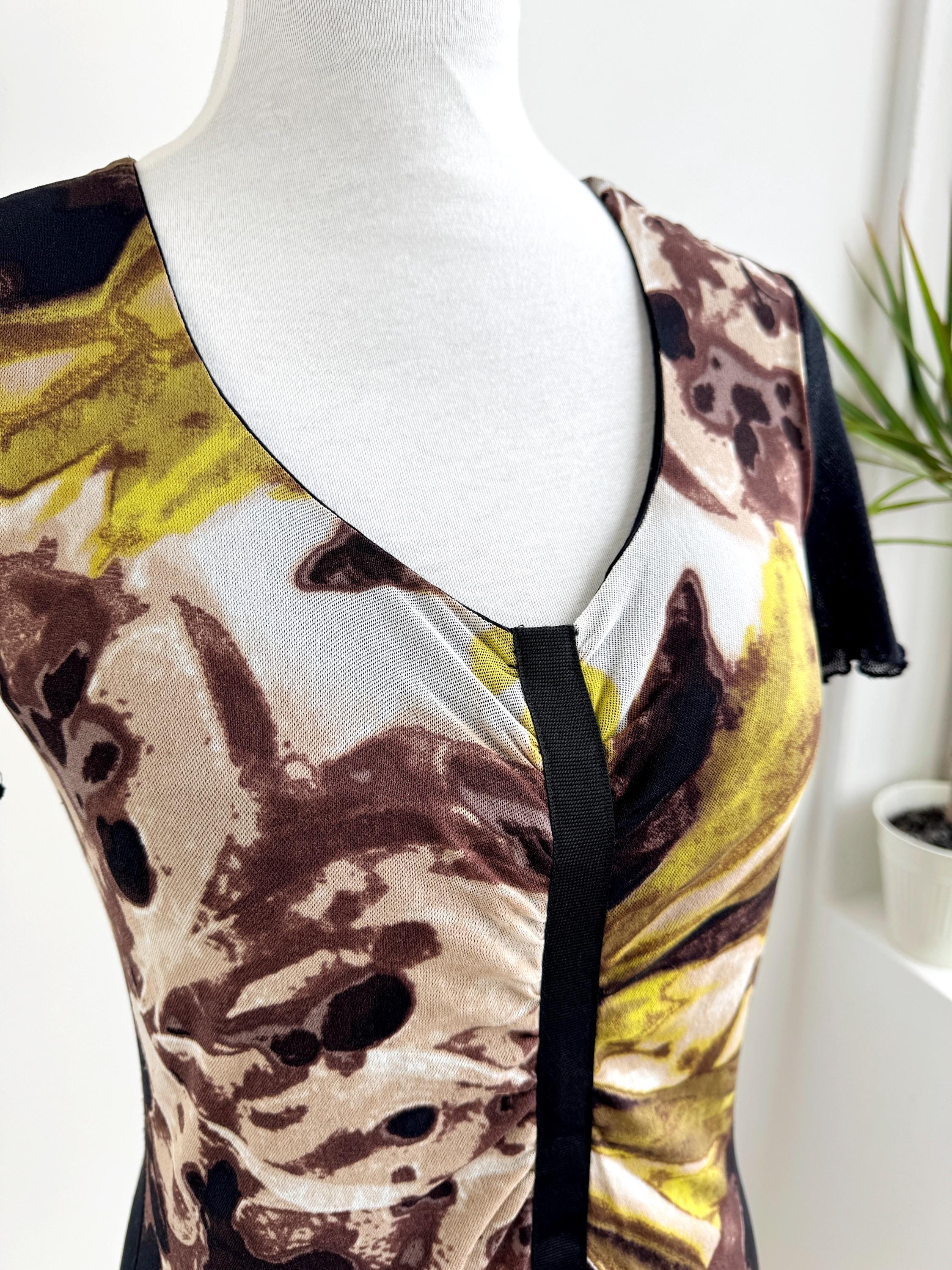 This striking vintage BiBA top features a captivating blend of textures and art-style prints. Designed in Germany, this piece showcases a vibrant abstract floral pattern in earthy browns, mustard yellows, lime green and deep blacks. The front is uniquely constructed with a layered mesh bodice and a vertical ribbon detail that creates elegant ruching across the chest.