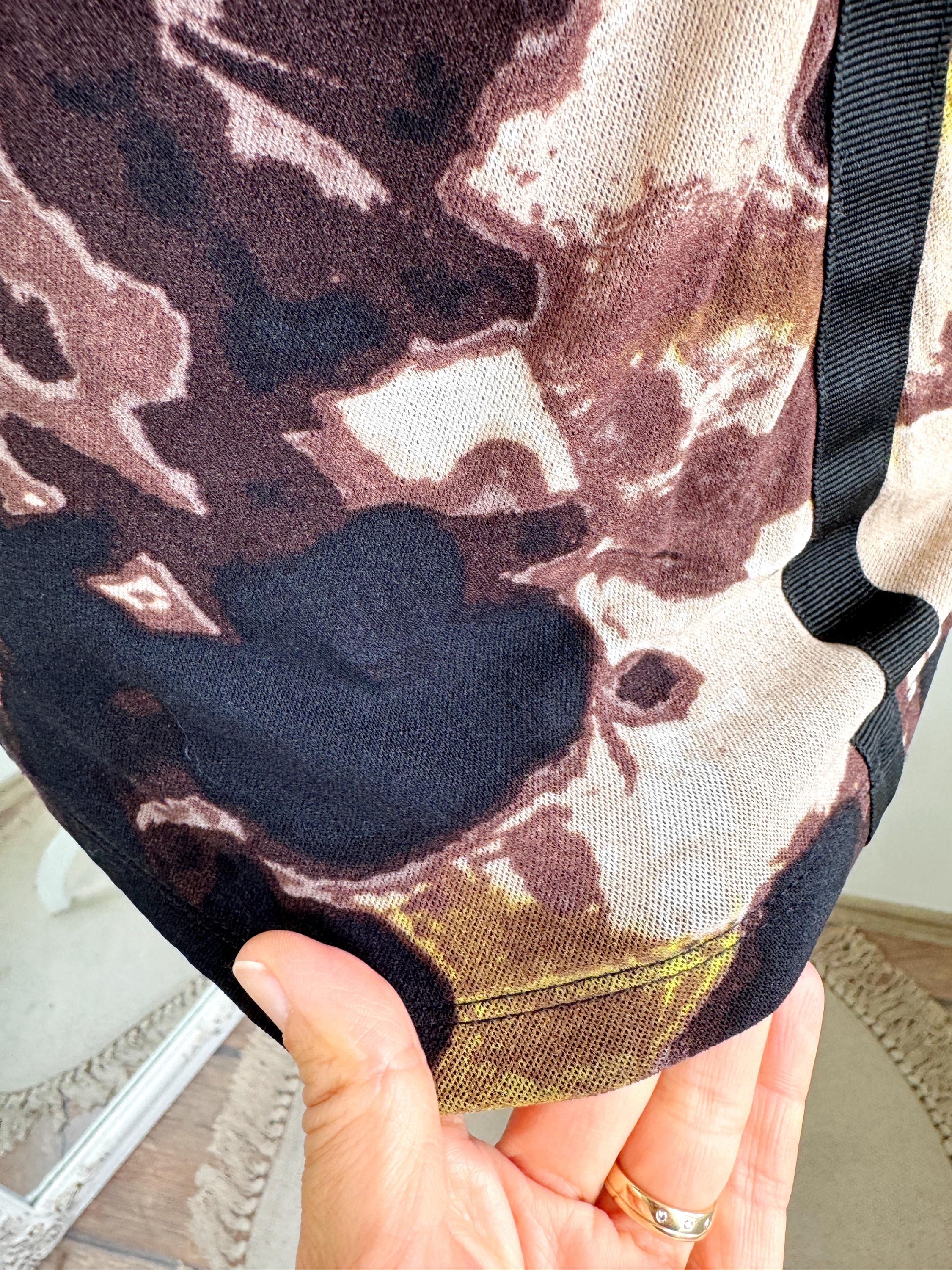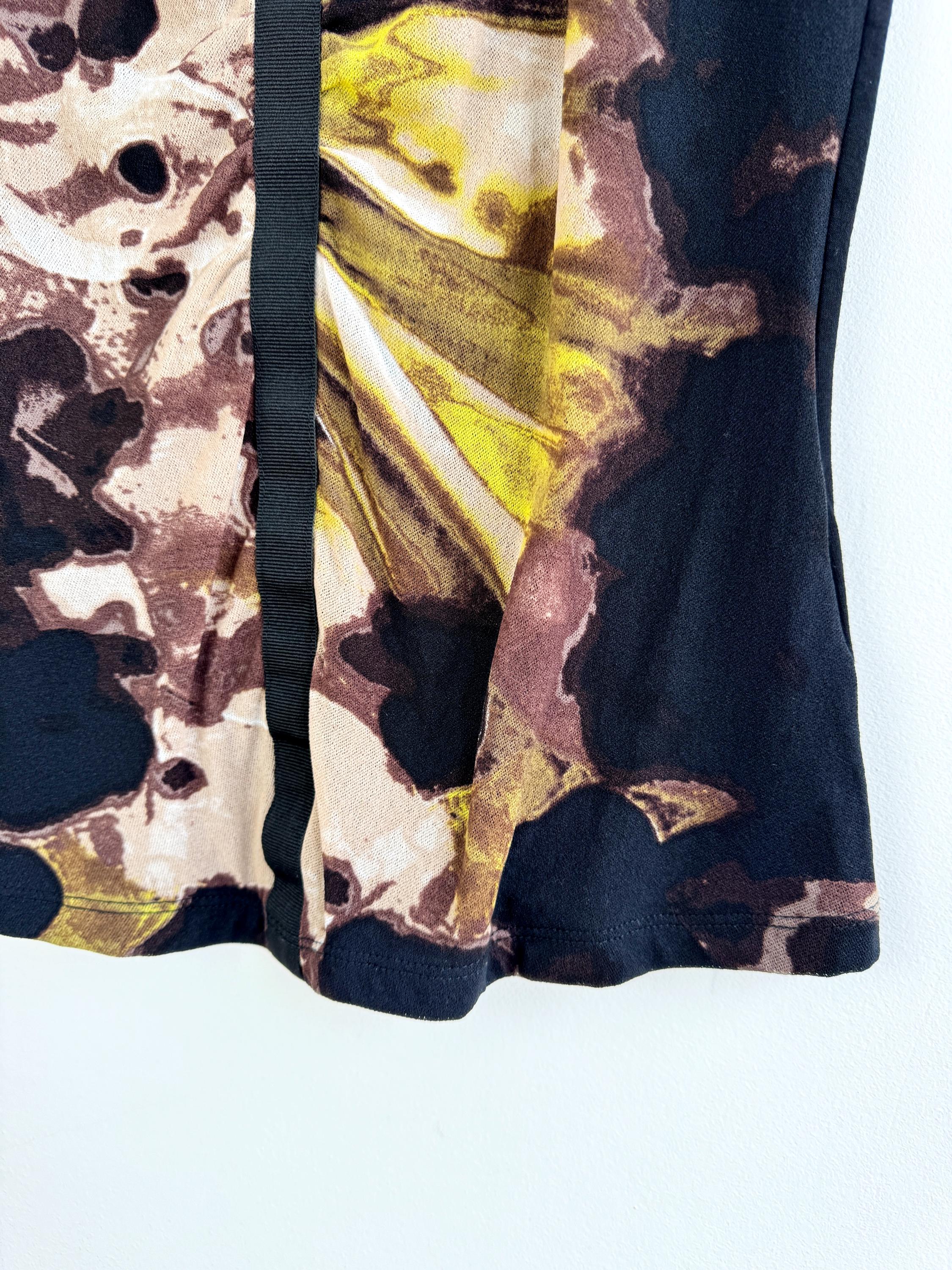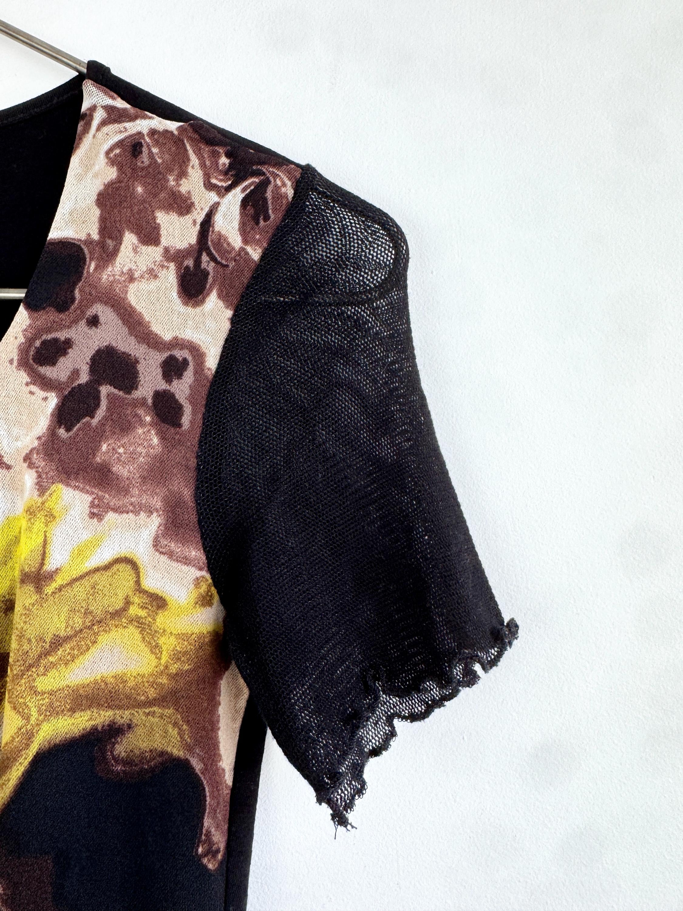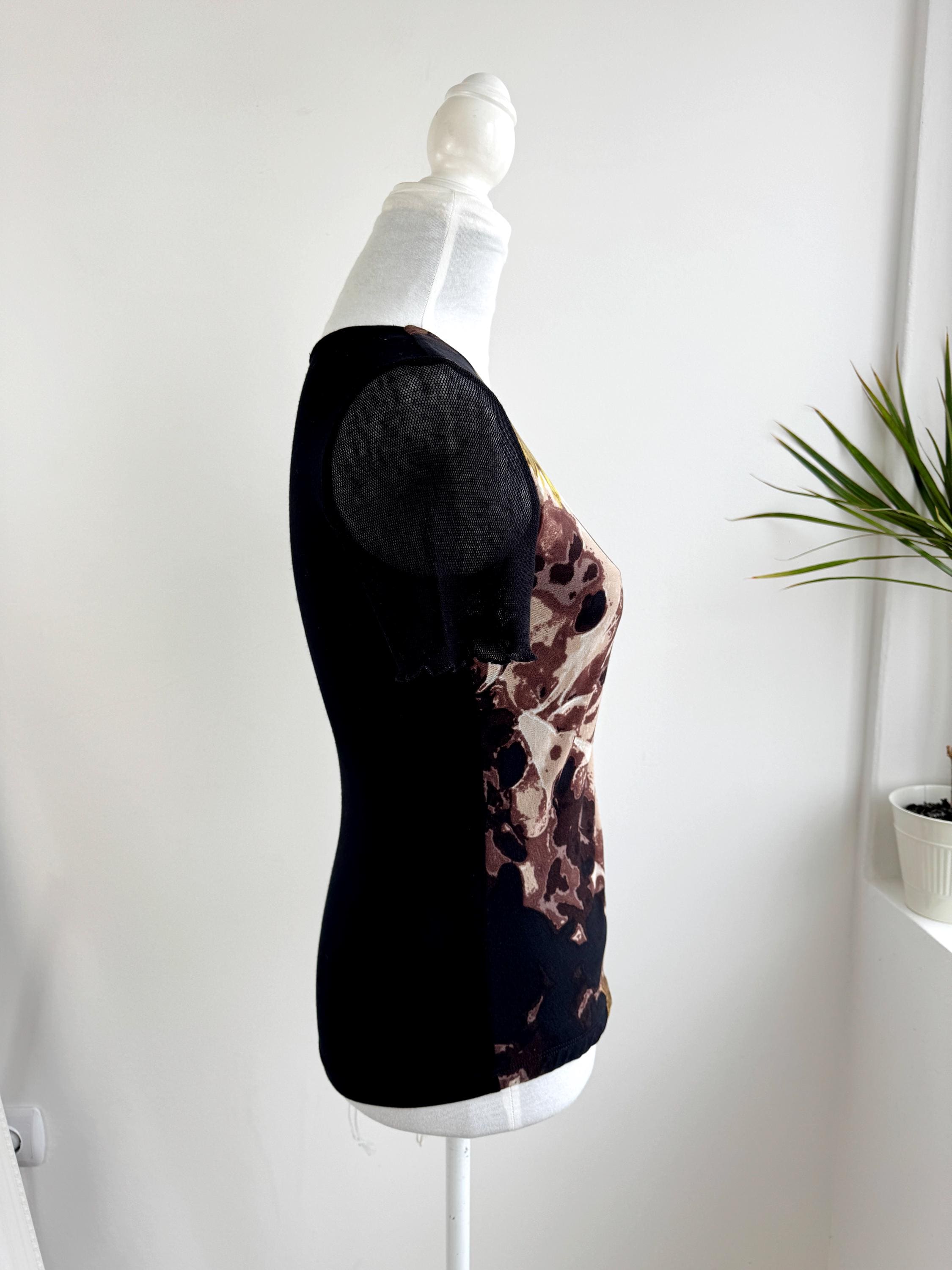 This striking vintage BiBA top features a captivating blend of textures and art-style prints. Designed in Germany, this piece showcases a vibrant abstract floral pattern in earthy browns, mustard yellows, lime green and deep blacks. The front is uniquely constructed with a layered mesh bodice and a vertical ribbon detail that creates elegant ruching across the chest.
