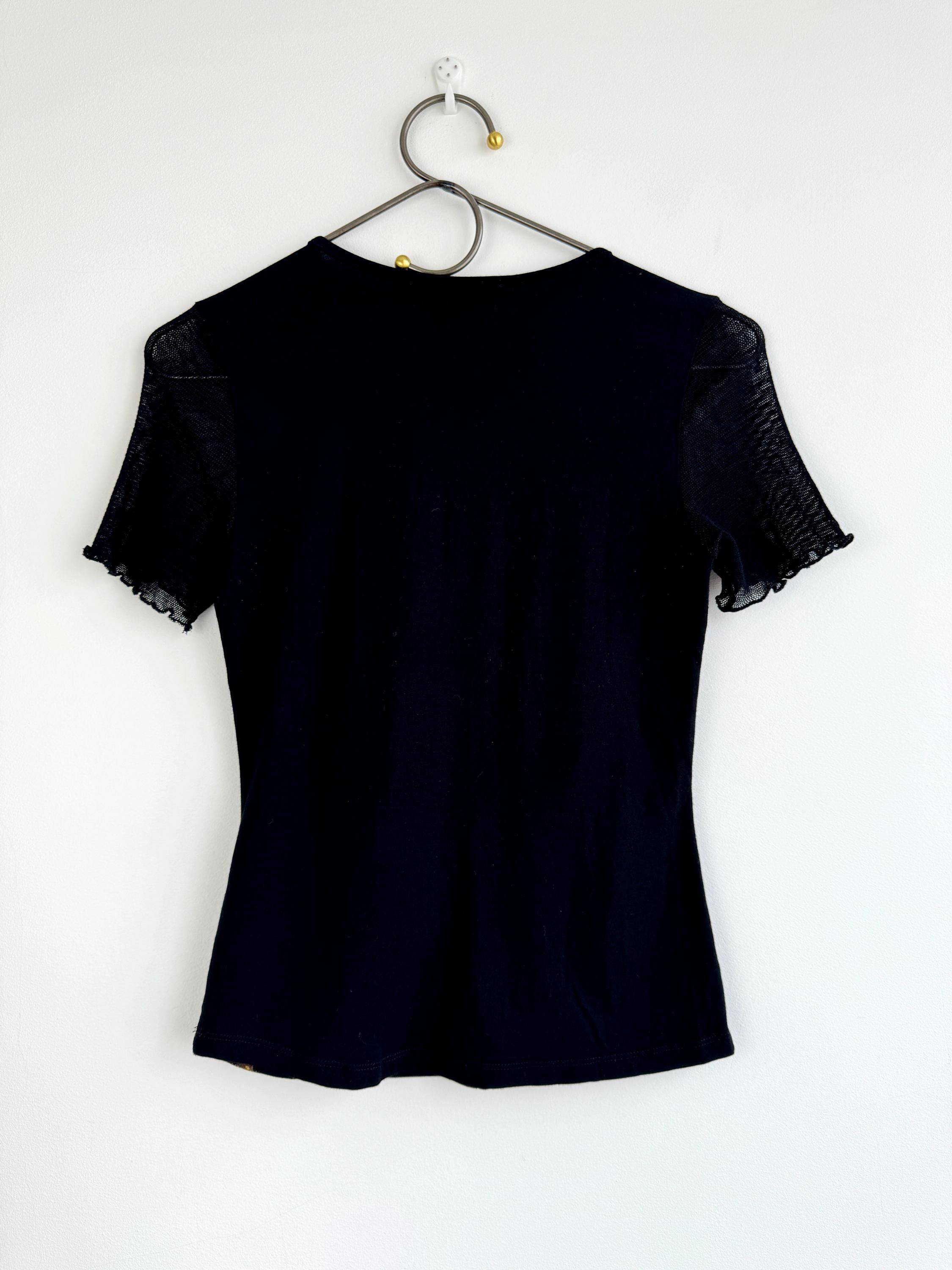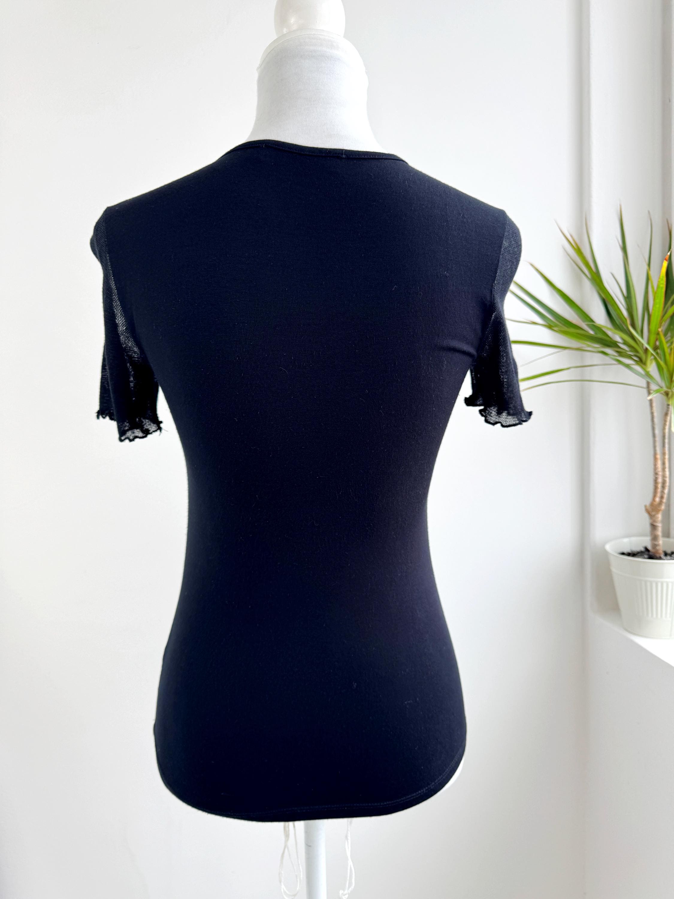 The standout feature is the sheer, black open-knit mesh sleeves with a delicate lettuce-edge hem, giving it a true Y2K bohemian flair. The back is a solid, soft black viscose blend that offers a comfortable, form-fitting silhouette. This is a versatile designer piece that pairs perfectly with high-waisted denim or a sleek midi skirt for a contemporary take on 90s high-fashion. A lightweight, multi-texture designer blouse featuring a V-neckline and decorative central ribbing. The front panel is a double-layered mesh for coverage, while the sleeves remain daringly sheer.