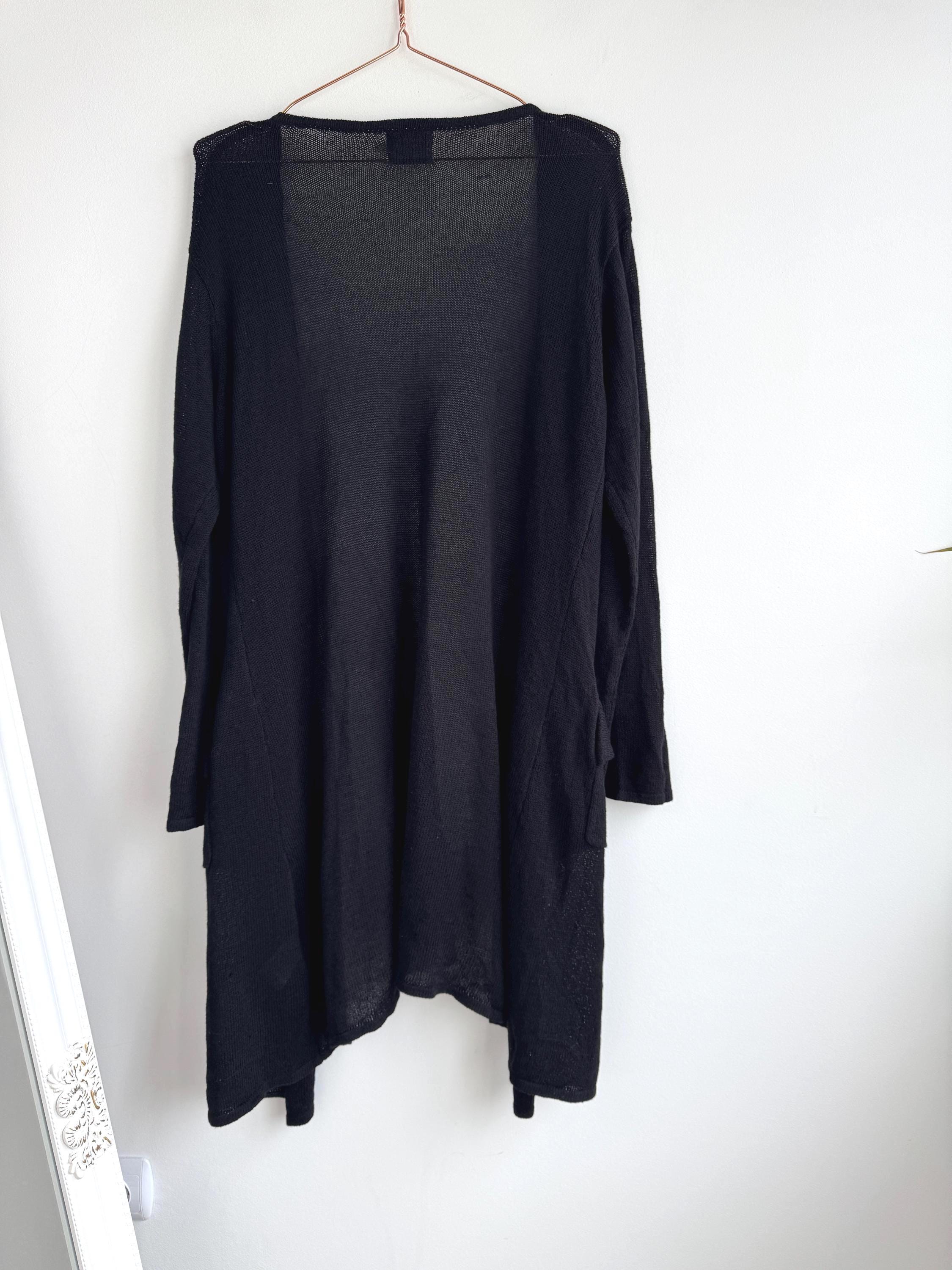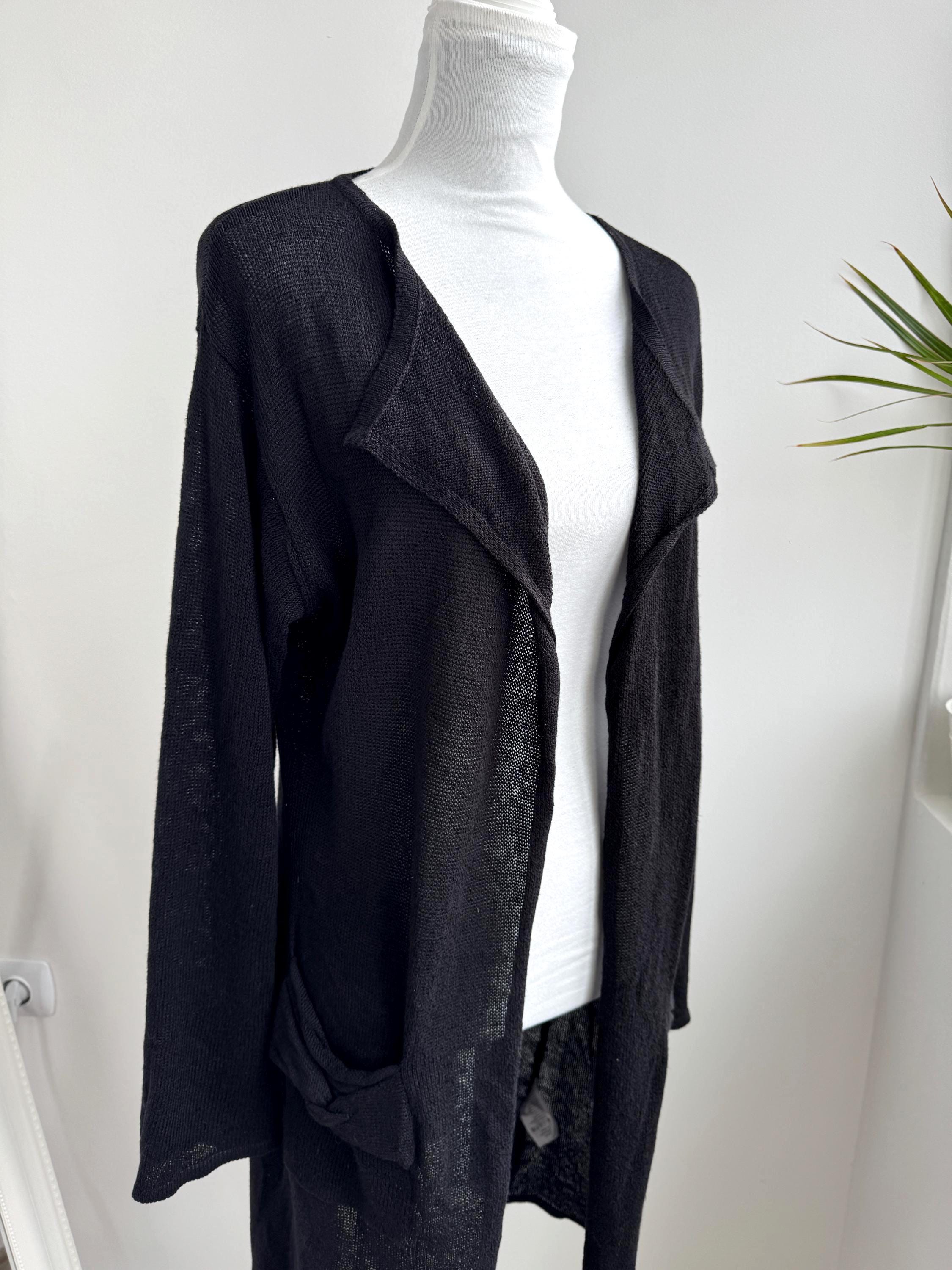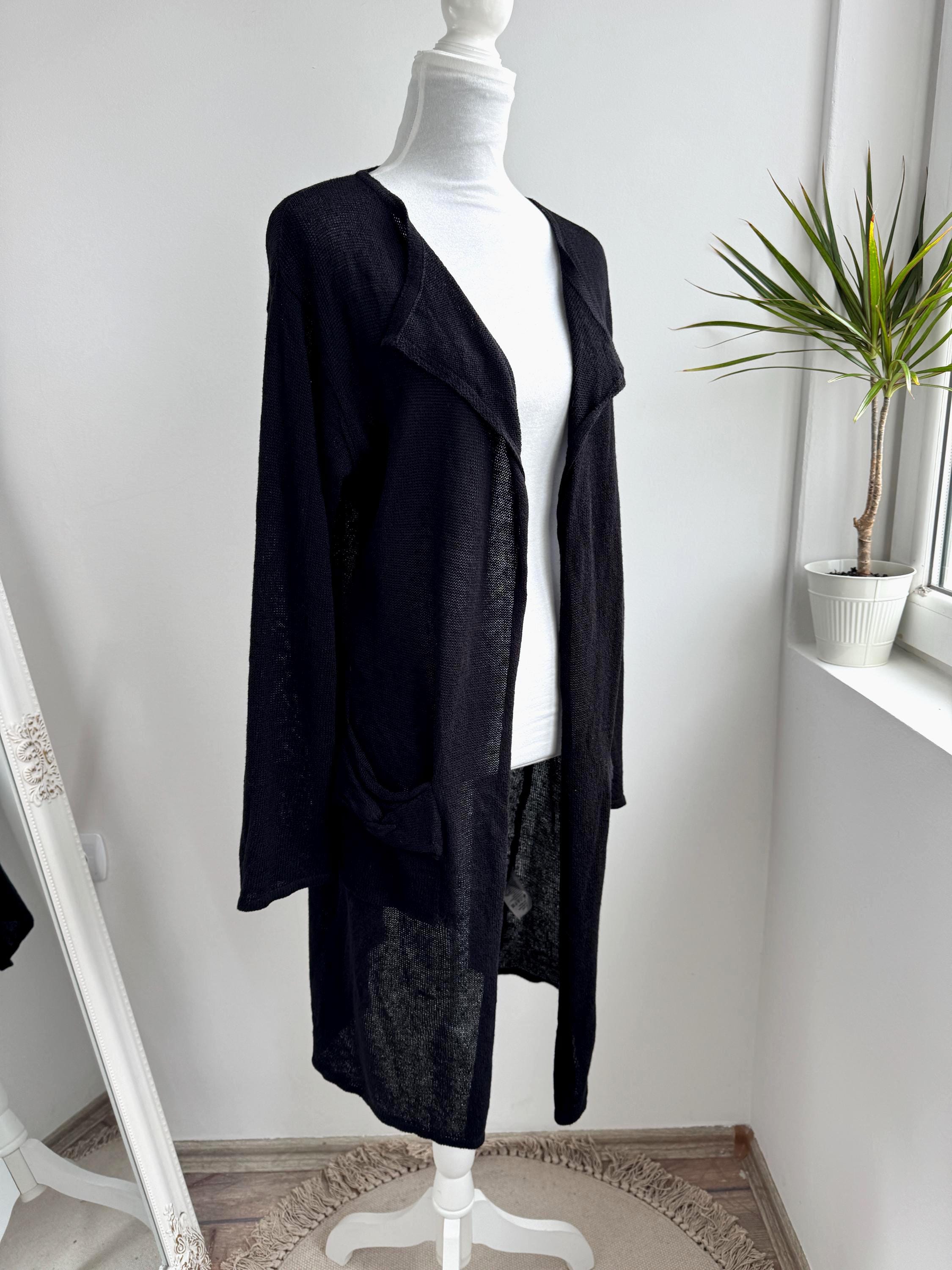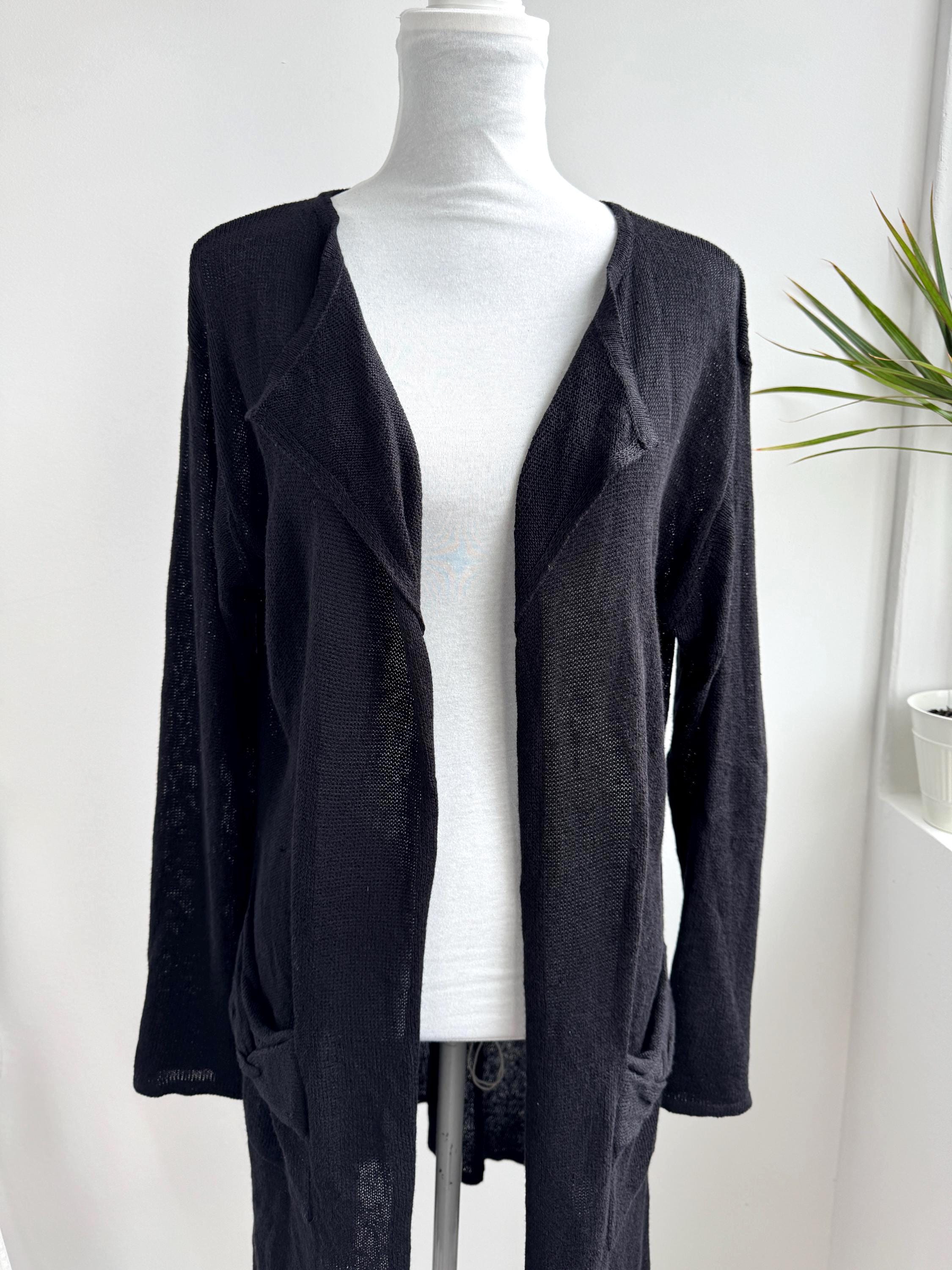 This is a lightweight, fine-knit cardigan with a longline silhouette. It features an open front (no buttons), long sleeves, and front pockets. The fabric has a beautiful natural slub texture characteristic of high-quality linen.