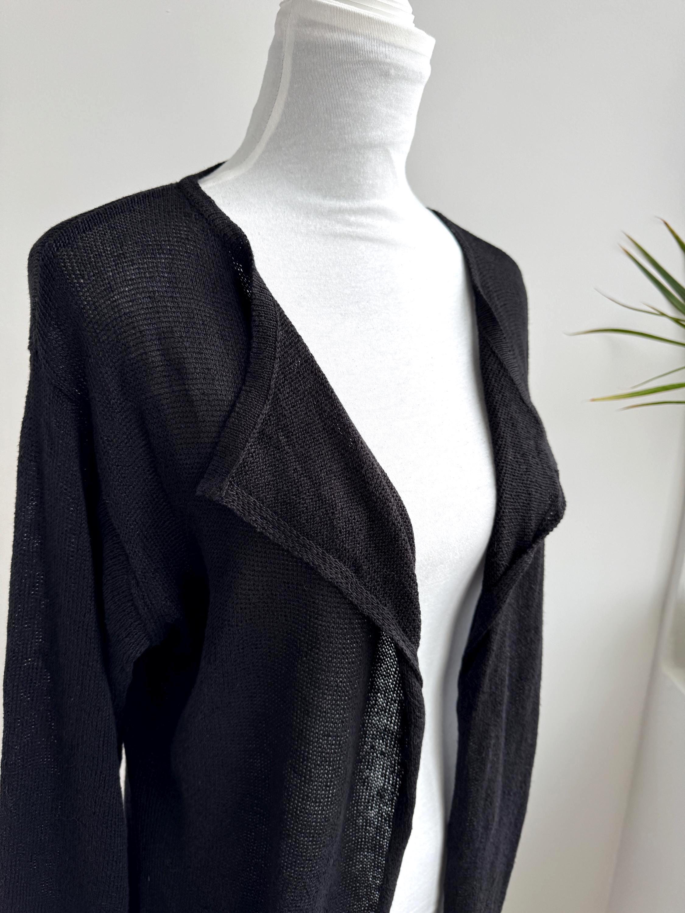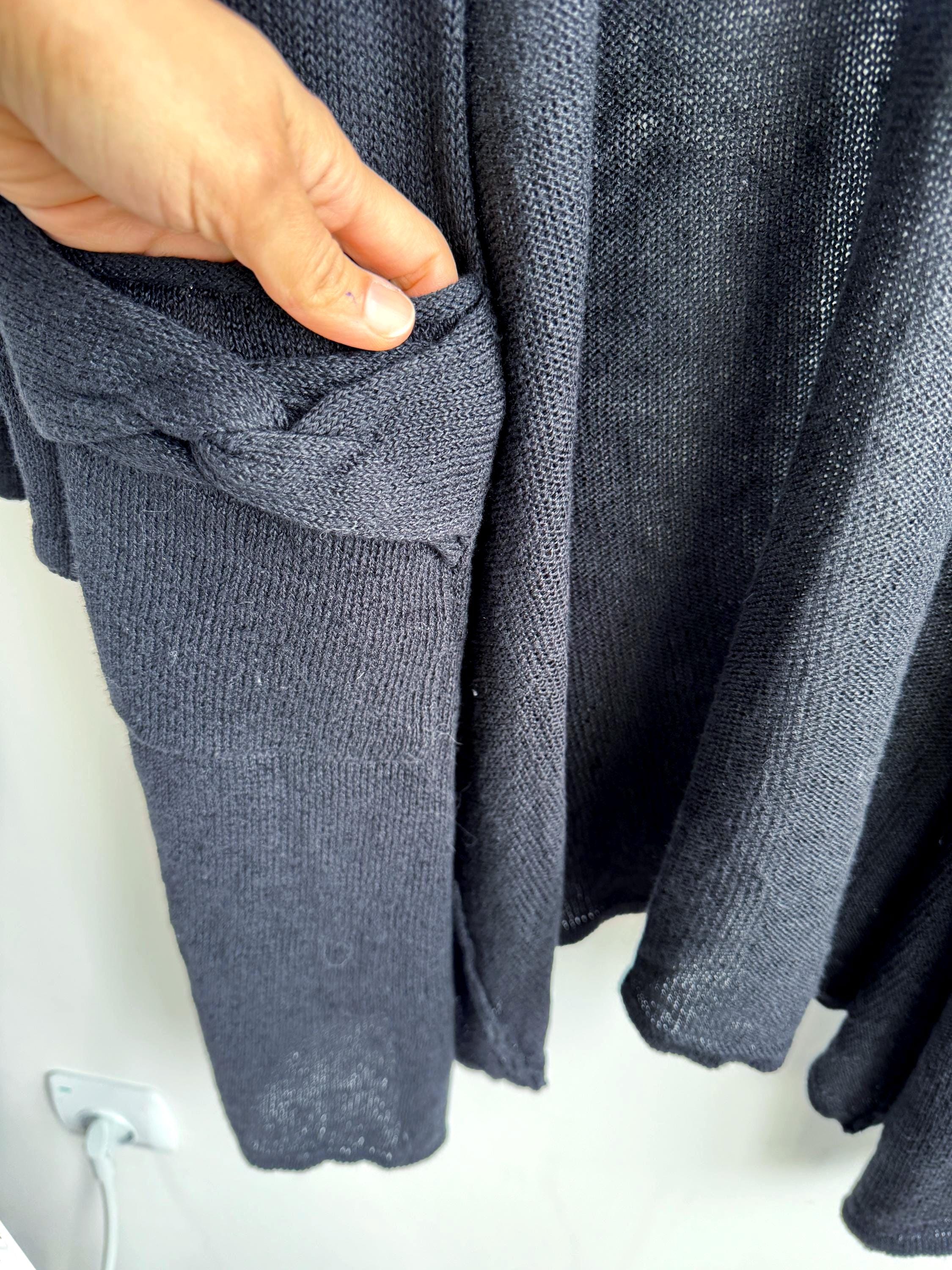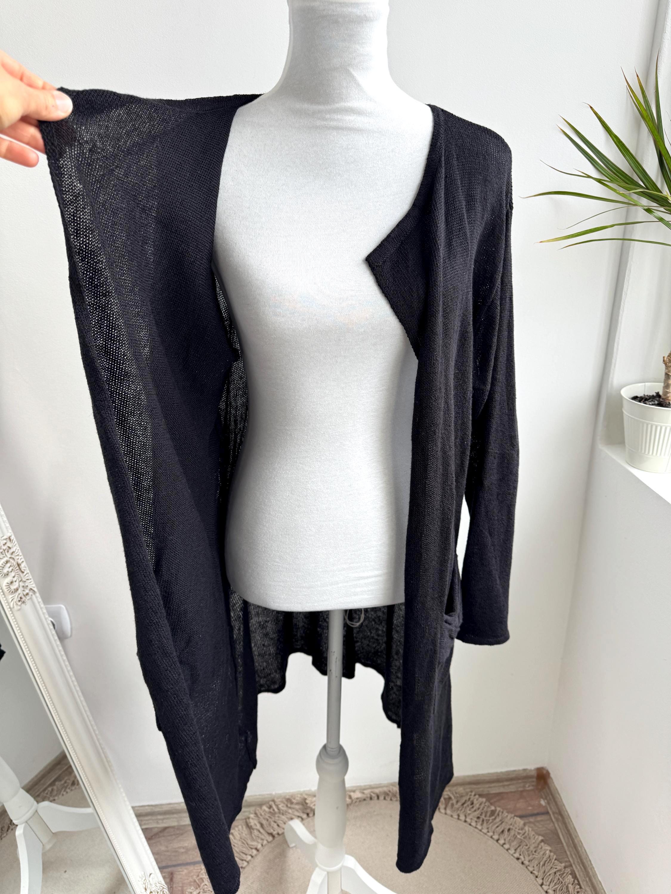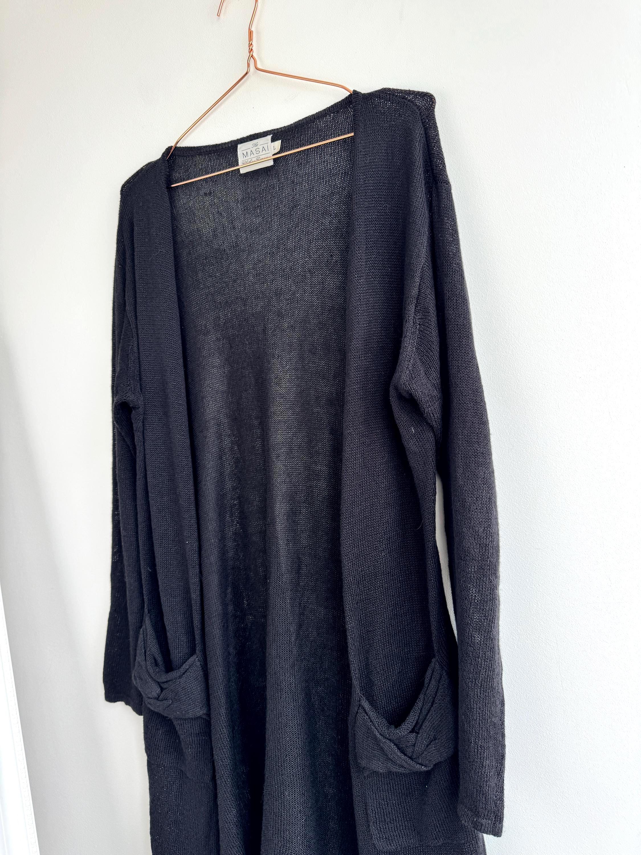 This is a lightweight, fine-knit cardigan with a longline silhouette. It features an open front (no buttons), long sleeves, and front pockets. The fabric has a beautiful natural slub texture characteristic of high-quality linen.