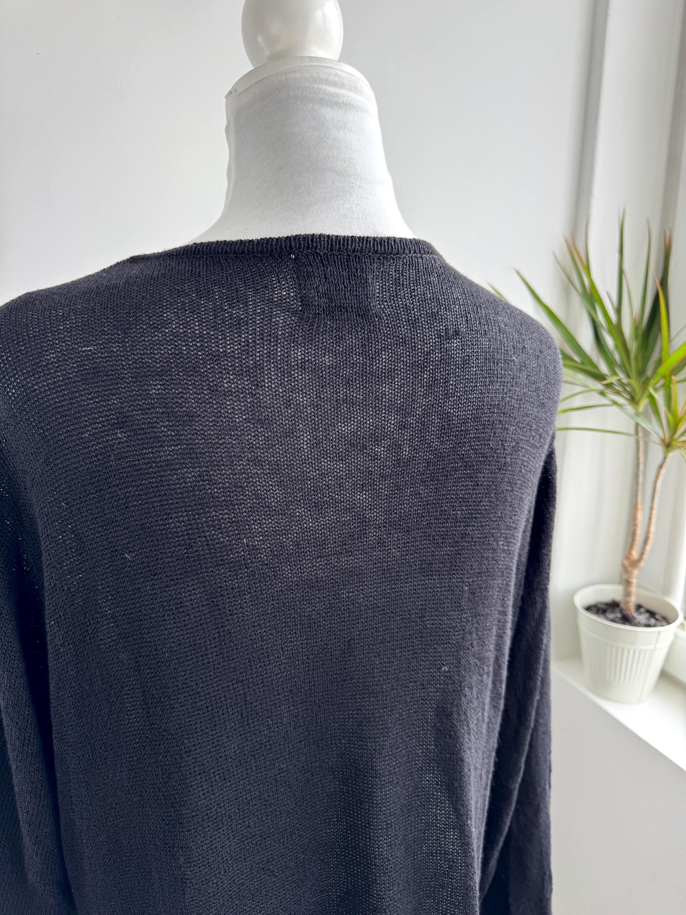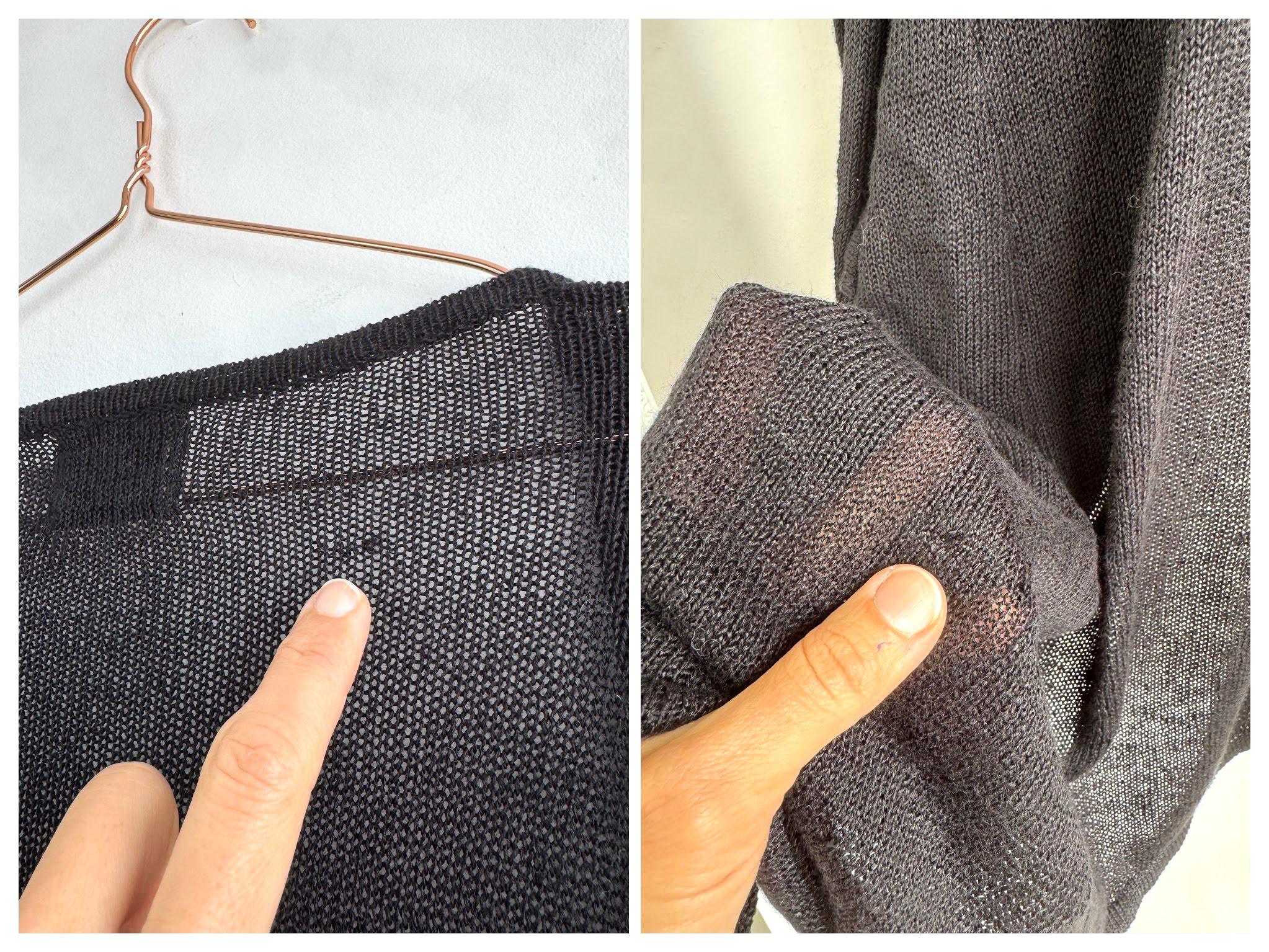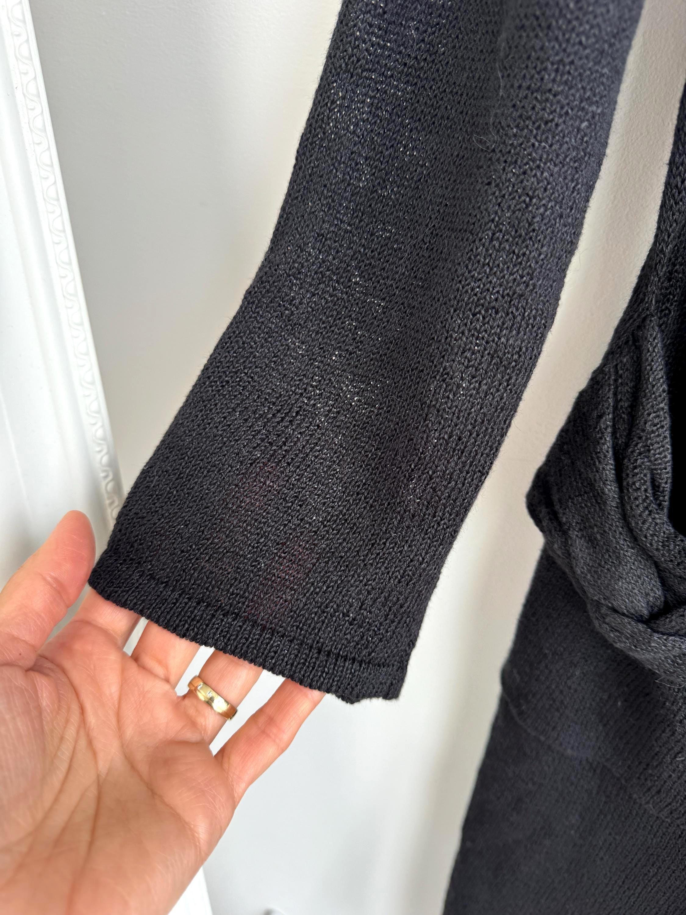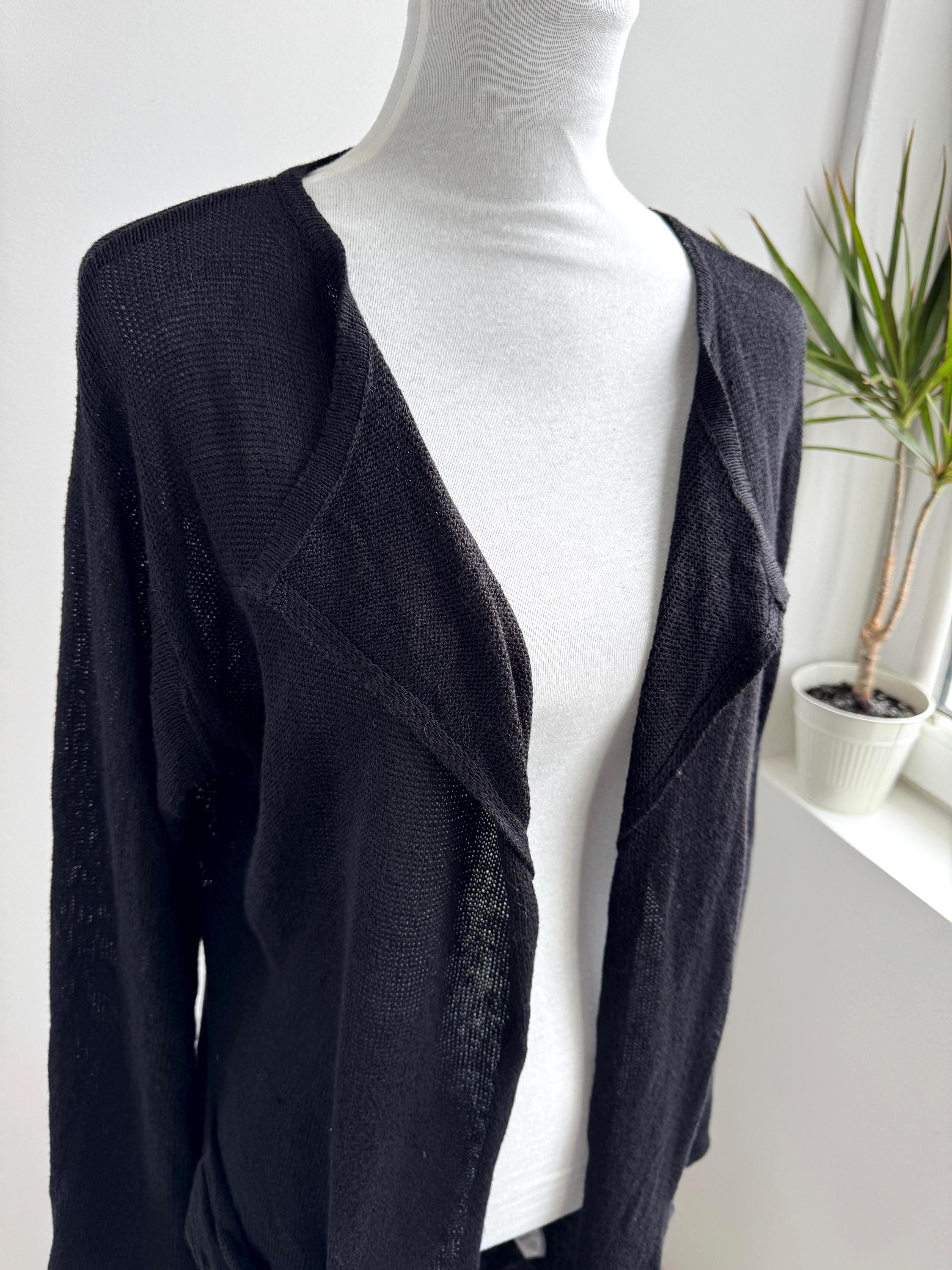 This is a lightweight, fine-knit cardigan with a longline silhouette. It features an open front (no buttons), long sleeves, and front pockets. The fabric has a beautiful natural slub texture characteristic of high-quality linen.
