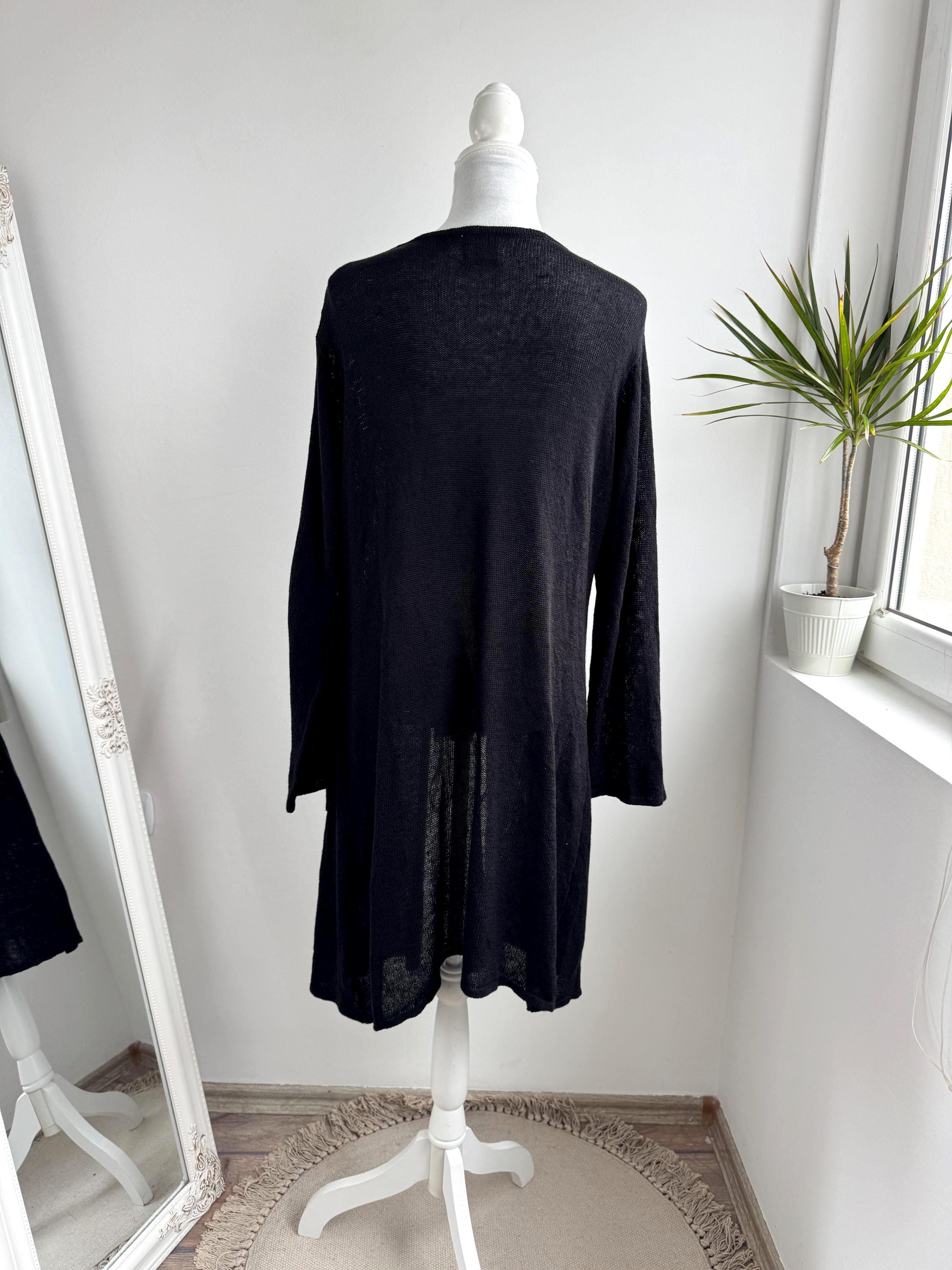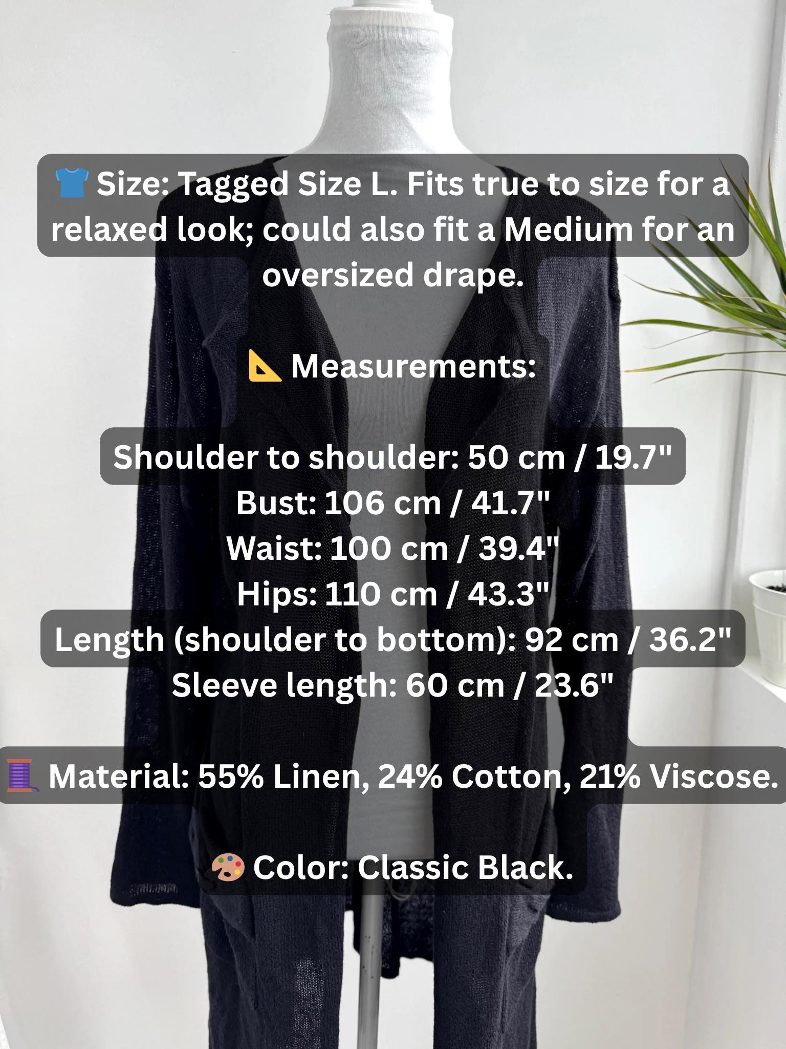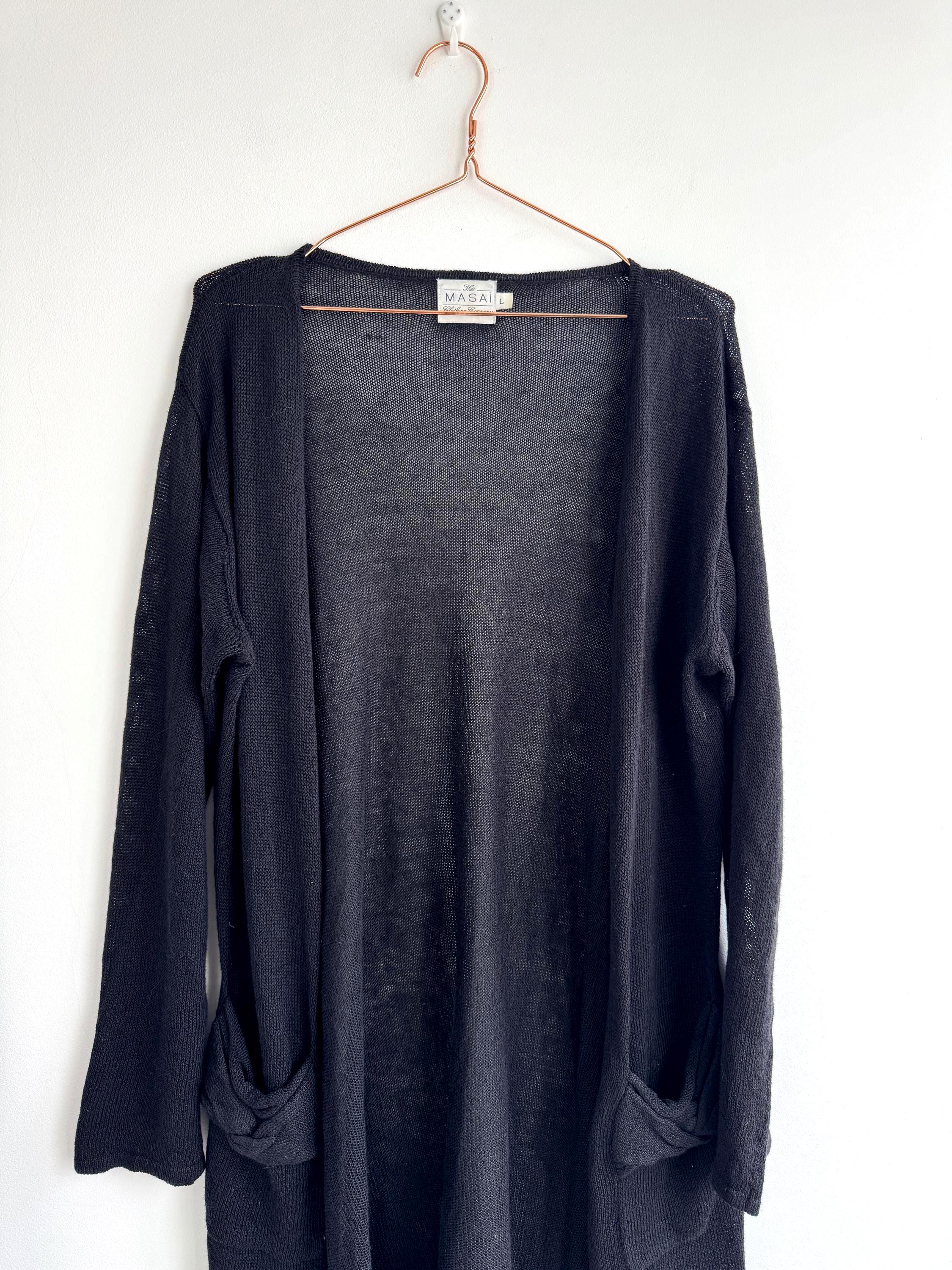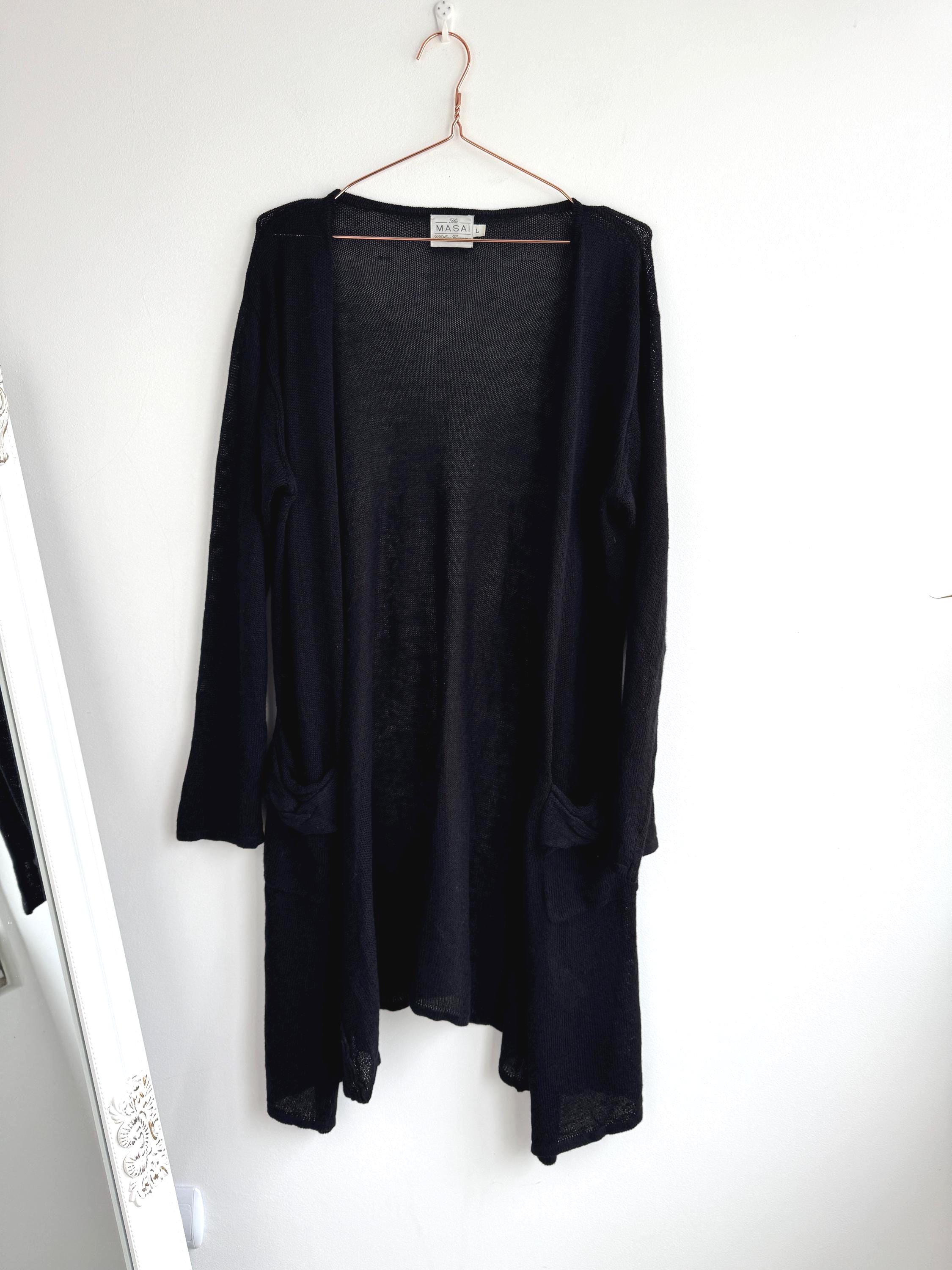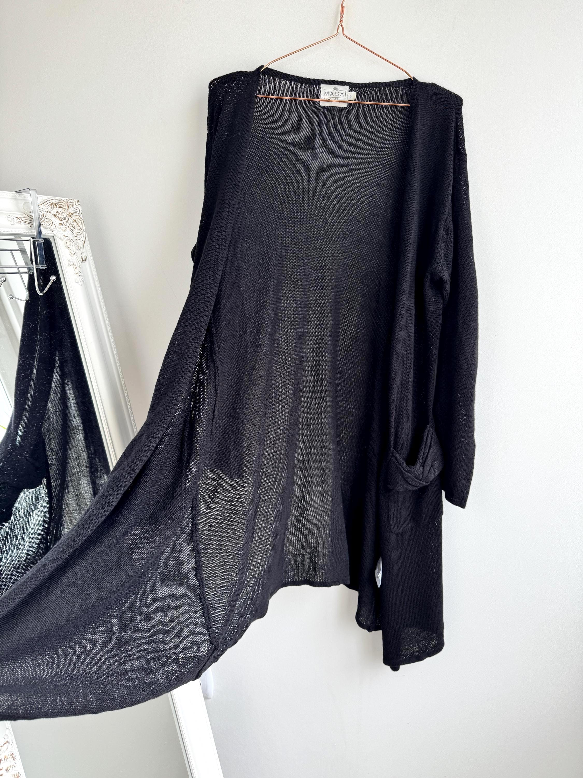 This is a sophisticated black longline cardigan from The Masai Clothing Company. Crafted from a premium linen blend, this lightweight knit is the perfect transitional piece for your wardrobe. Its breathable, semi-sheer texture makes it an ideal summer duster coat or a chic cover-up for cooler evenings.