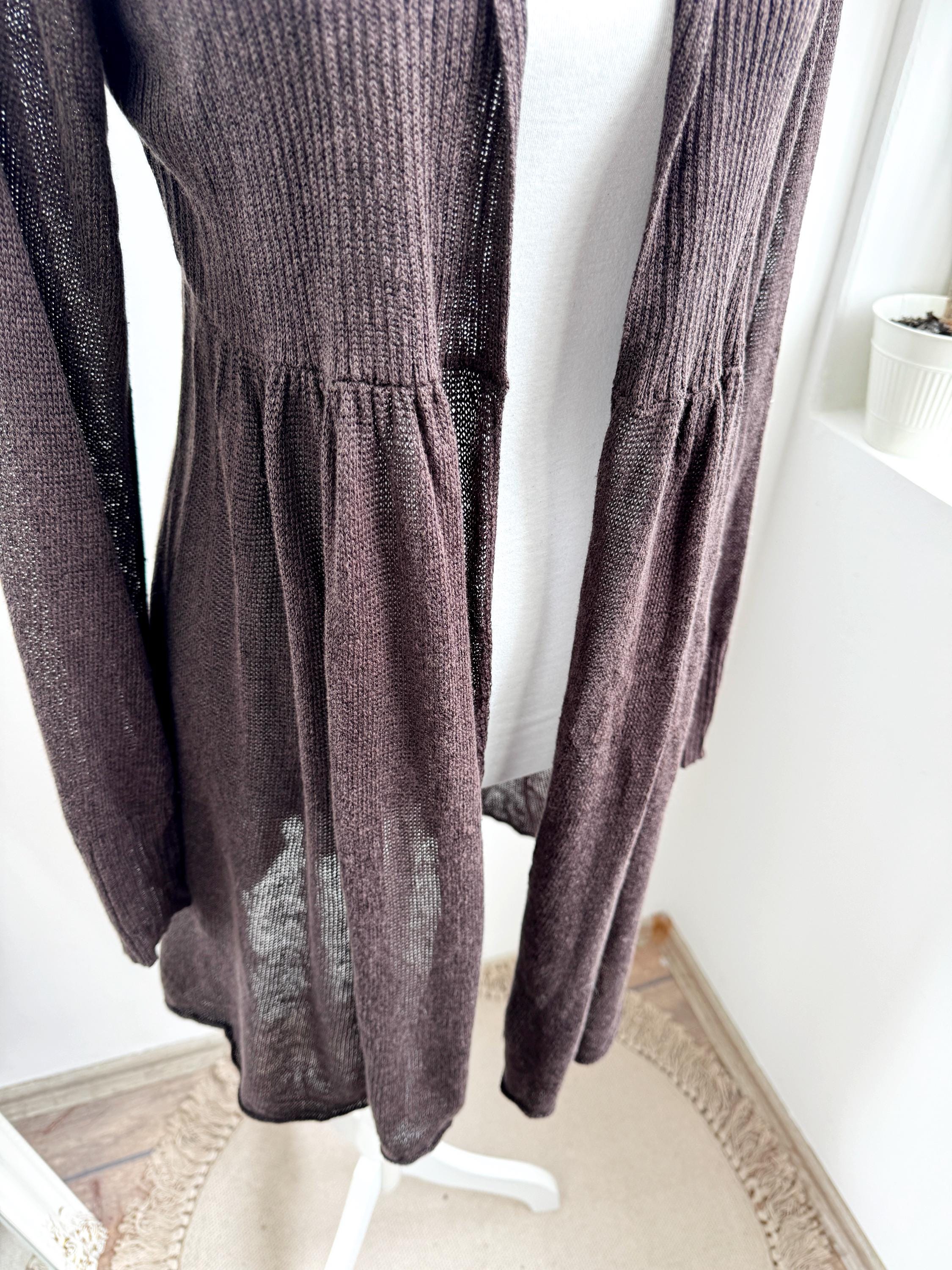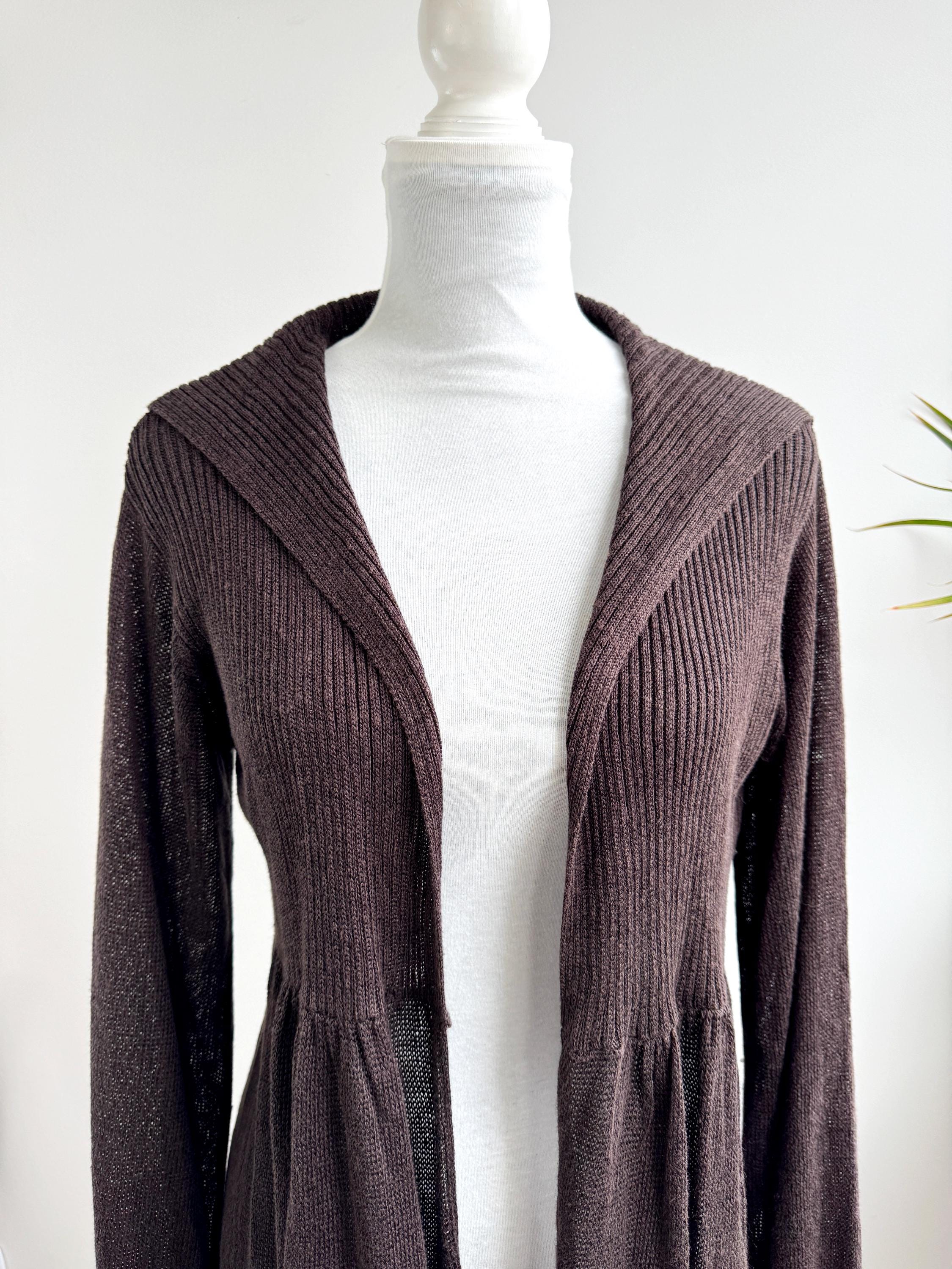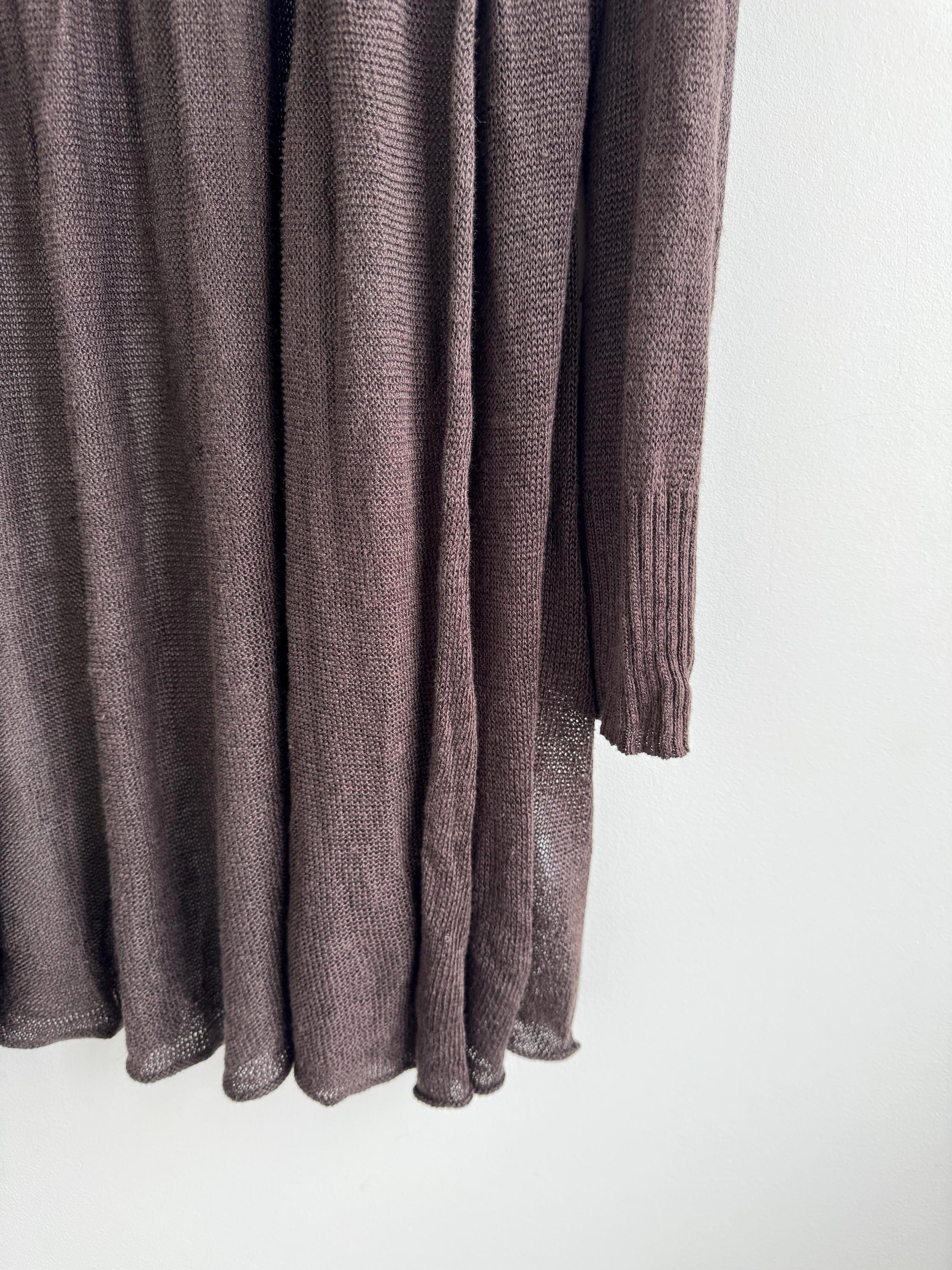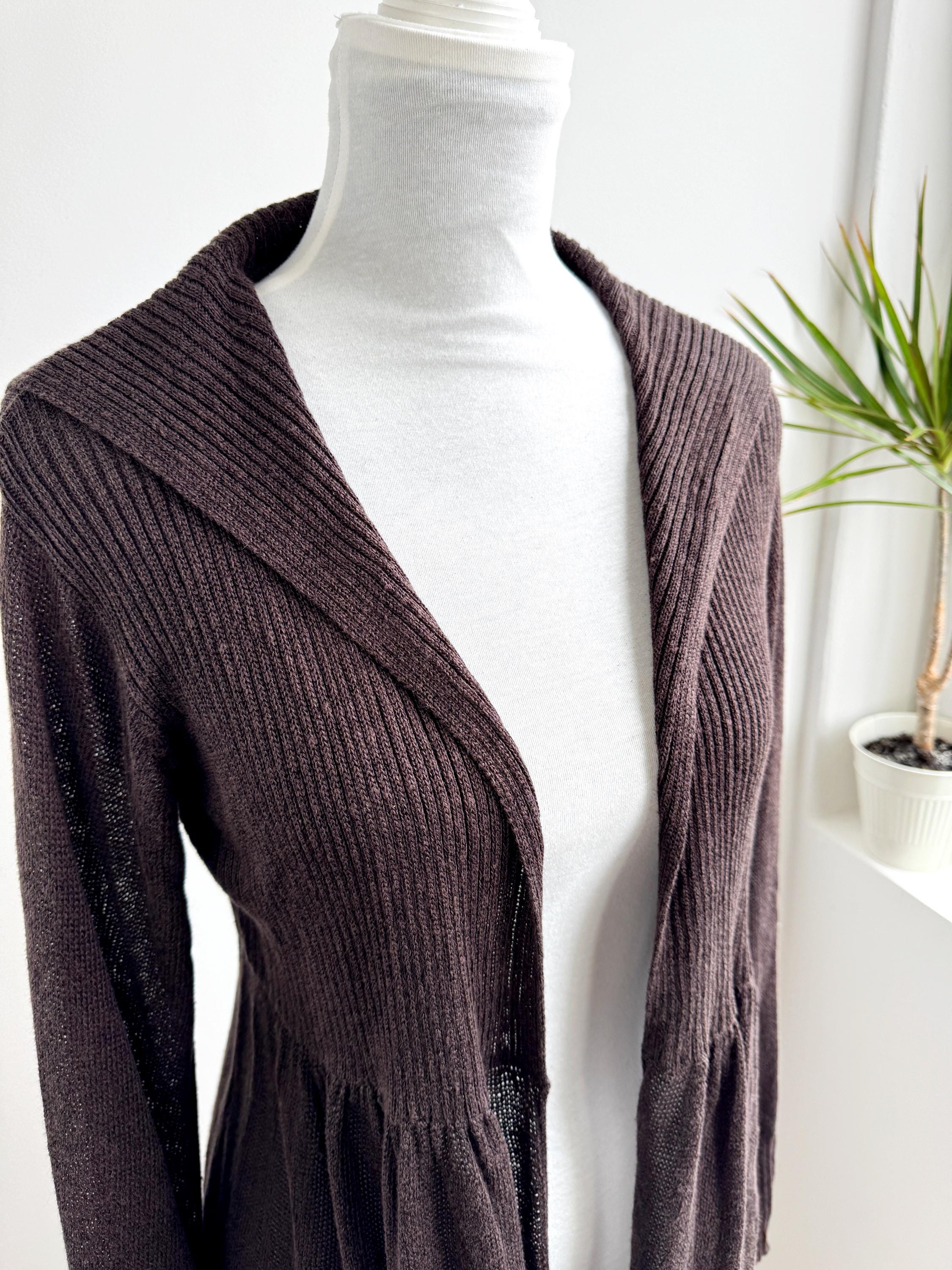 The rich chocolate brown hue is versatile and timeless, while the unique design features a ribbed knit upper that flows into a softly pleated, flared hem. This "duster" style silhouette adds movement and elegance to any outfit, whether paired with simple leggings or layered over a floral midi dress. The open front and relaxed fit provide comfort without sacrificing sophisticated style.