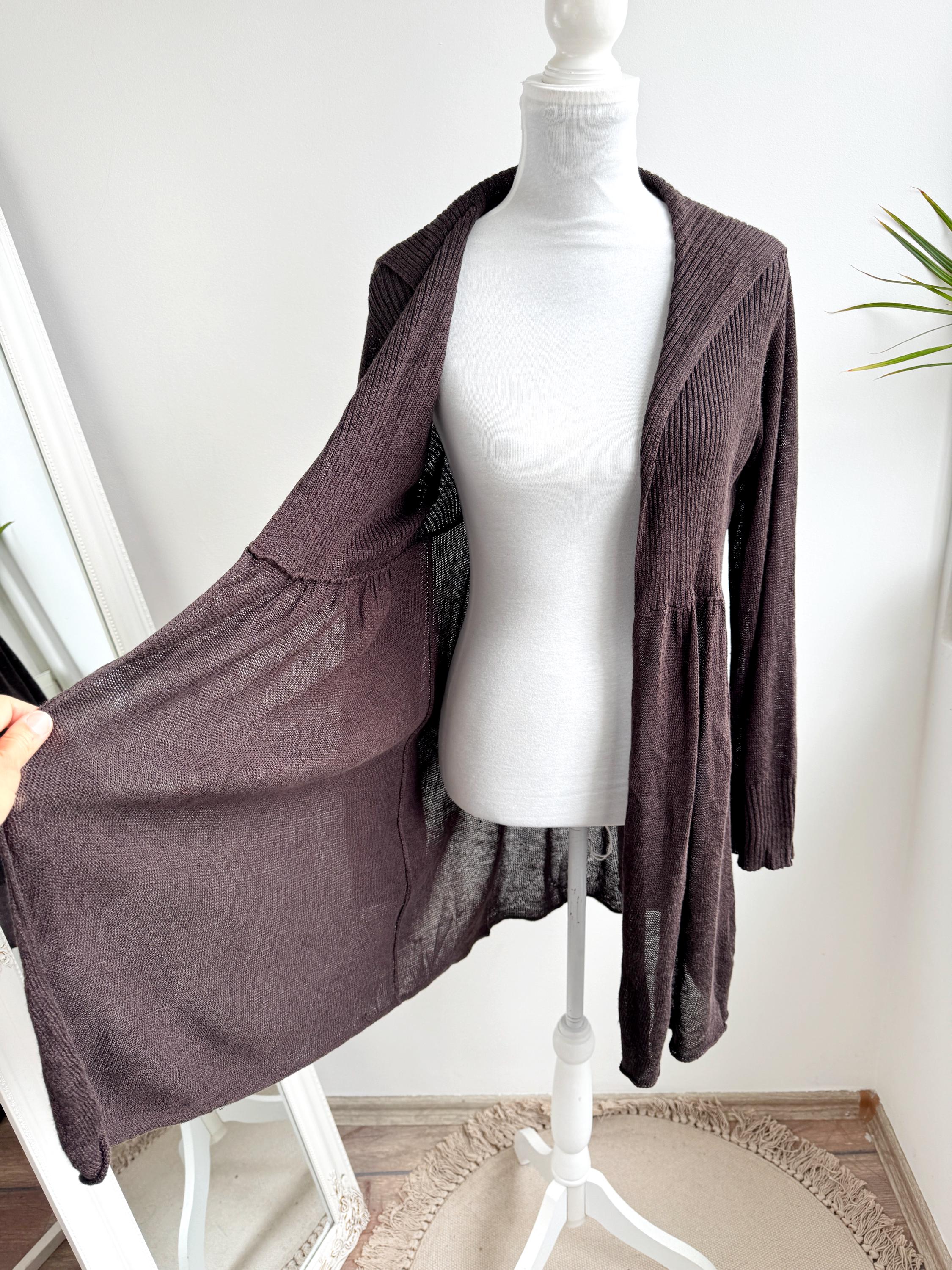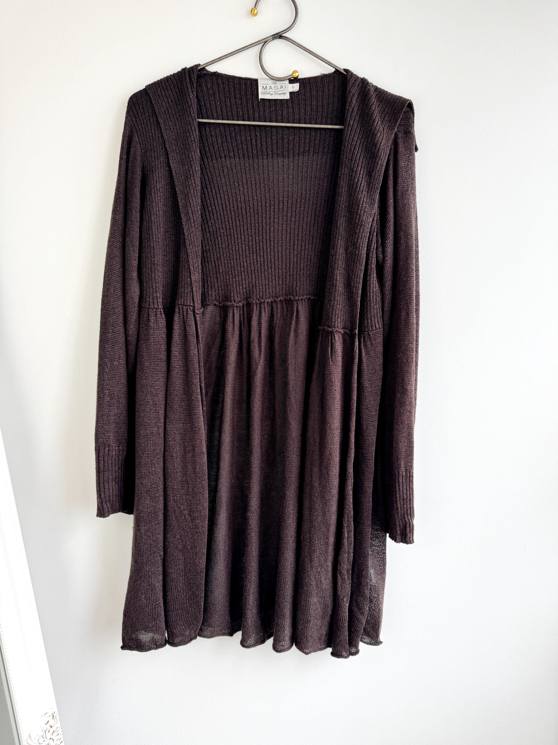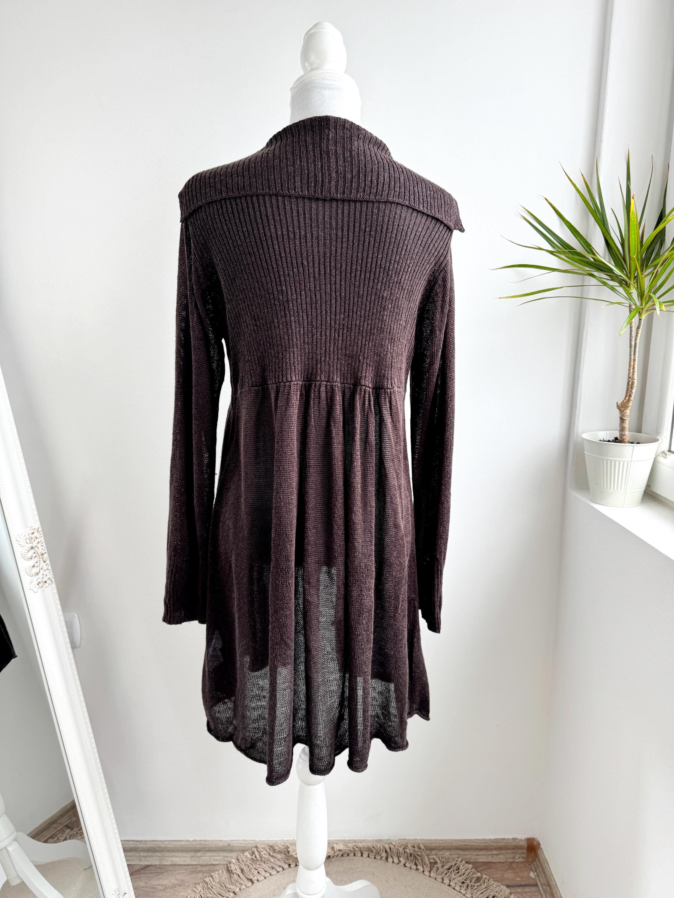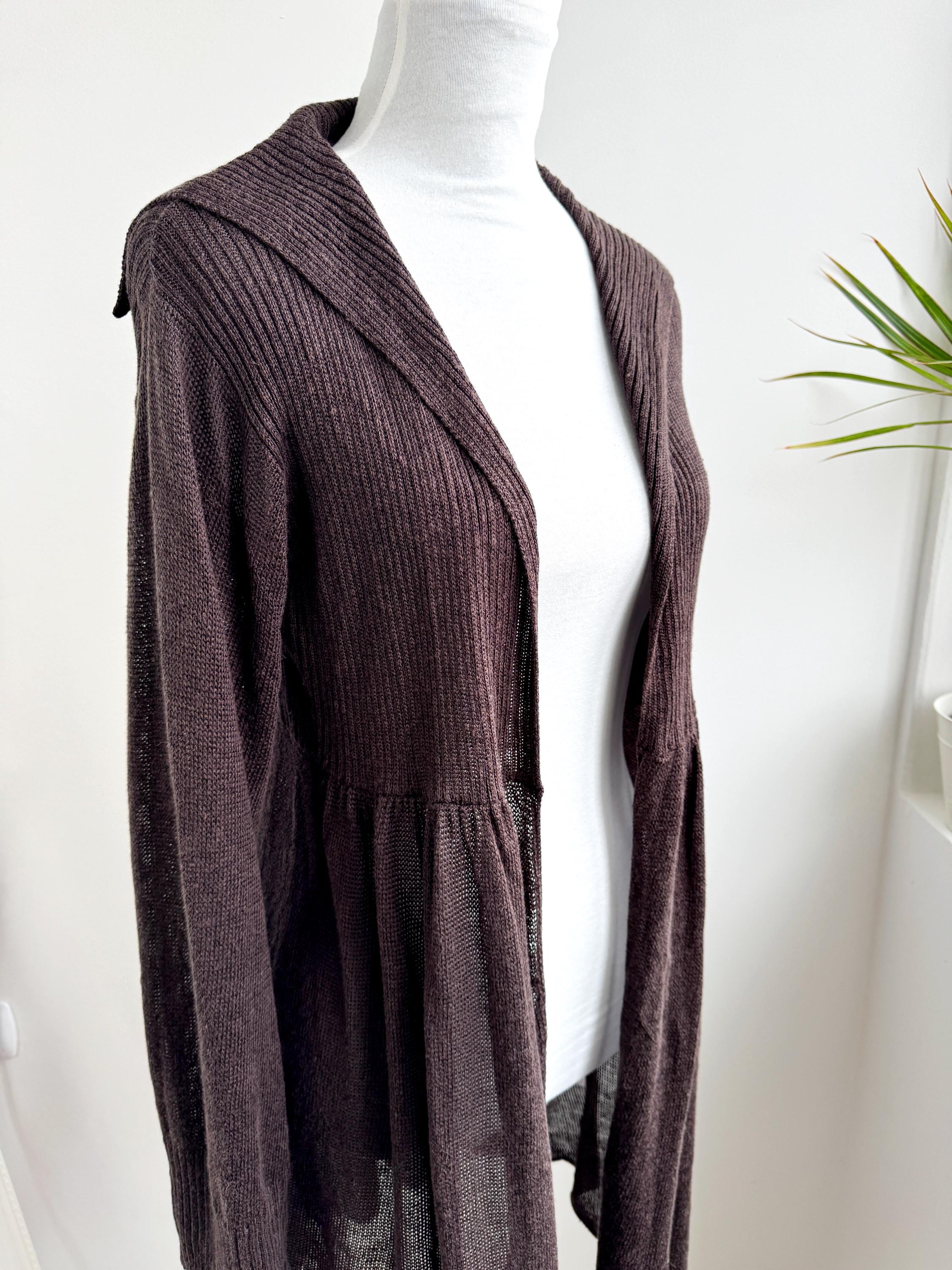 The rich chocolate brown hue is versatile and timeless, while the unique design features a ribbed knit upper that flows into a softly pleated, flared hem. This "duster" style silhouette adds movement and elegance to any outfit, whether paired with simple leggings or layered over a floral midi dress. The open front and relaxed fit provide comfort without sacrificing sophisticated style.