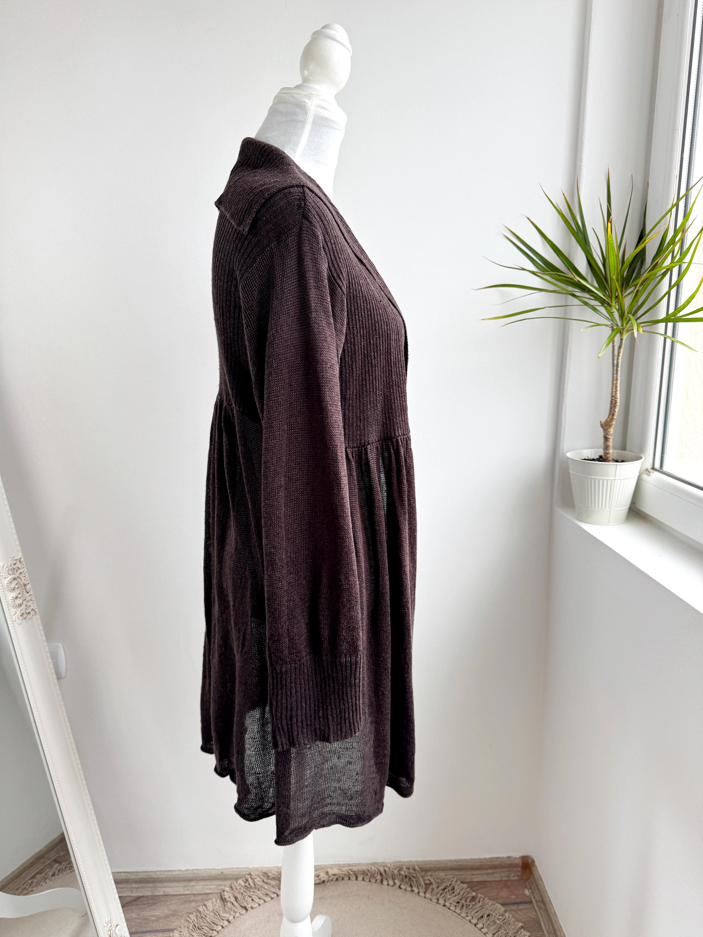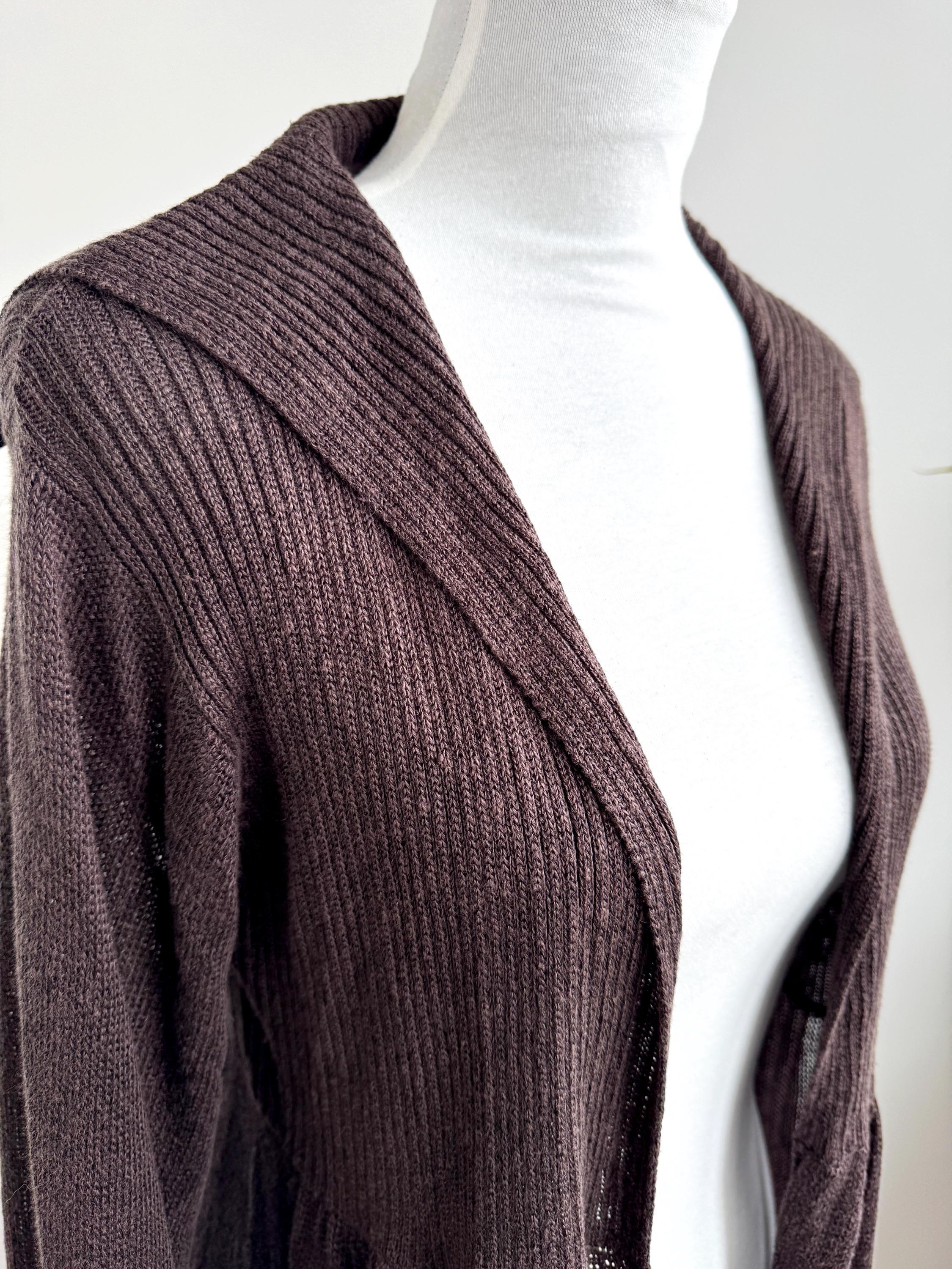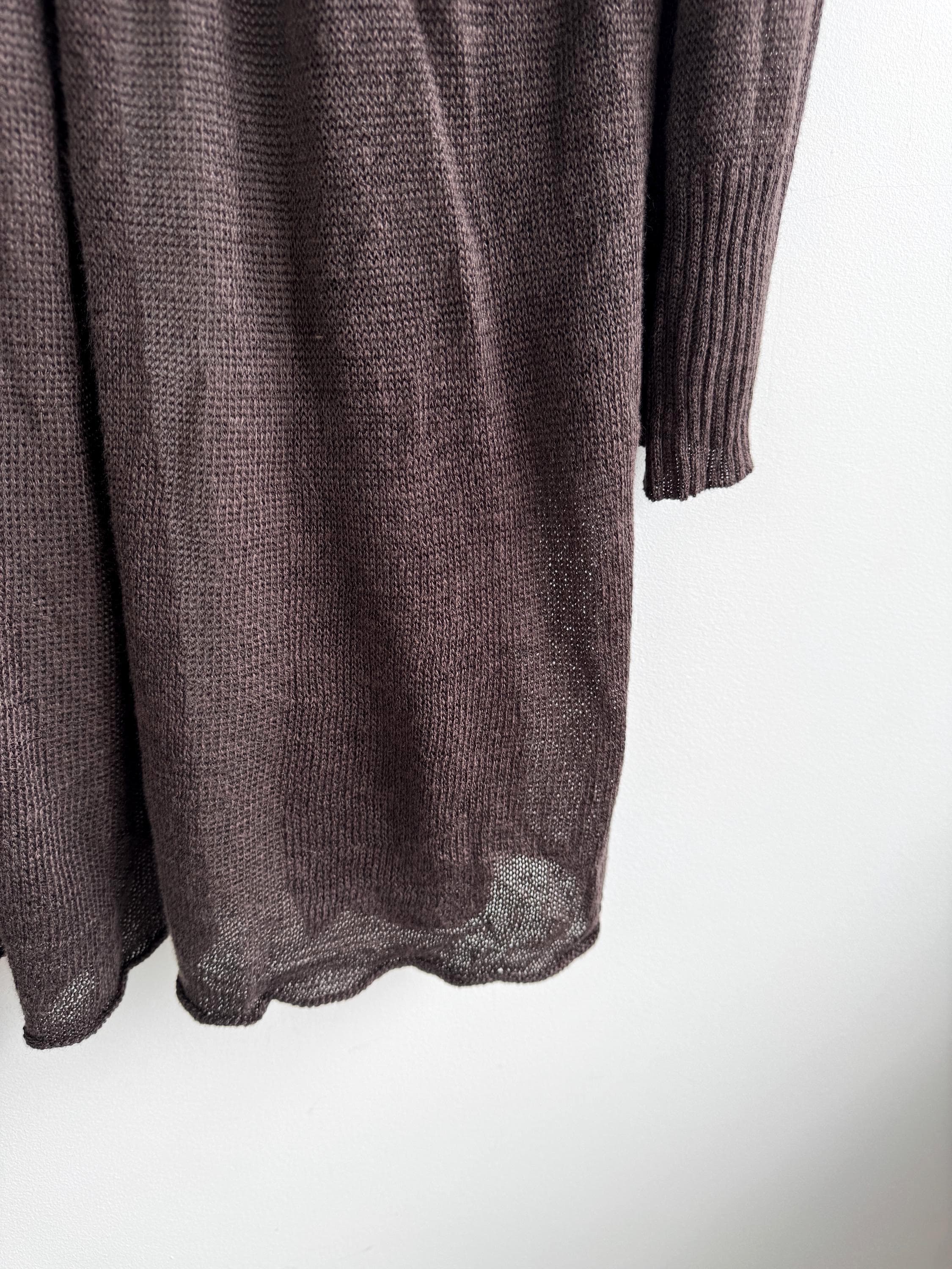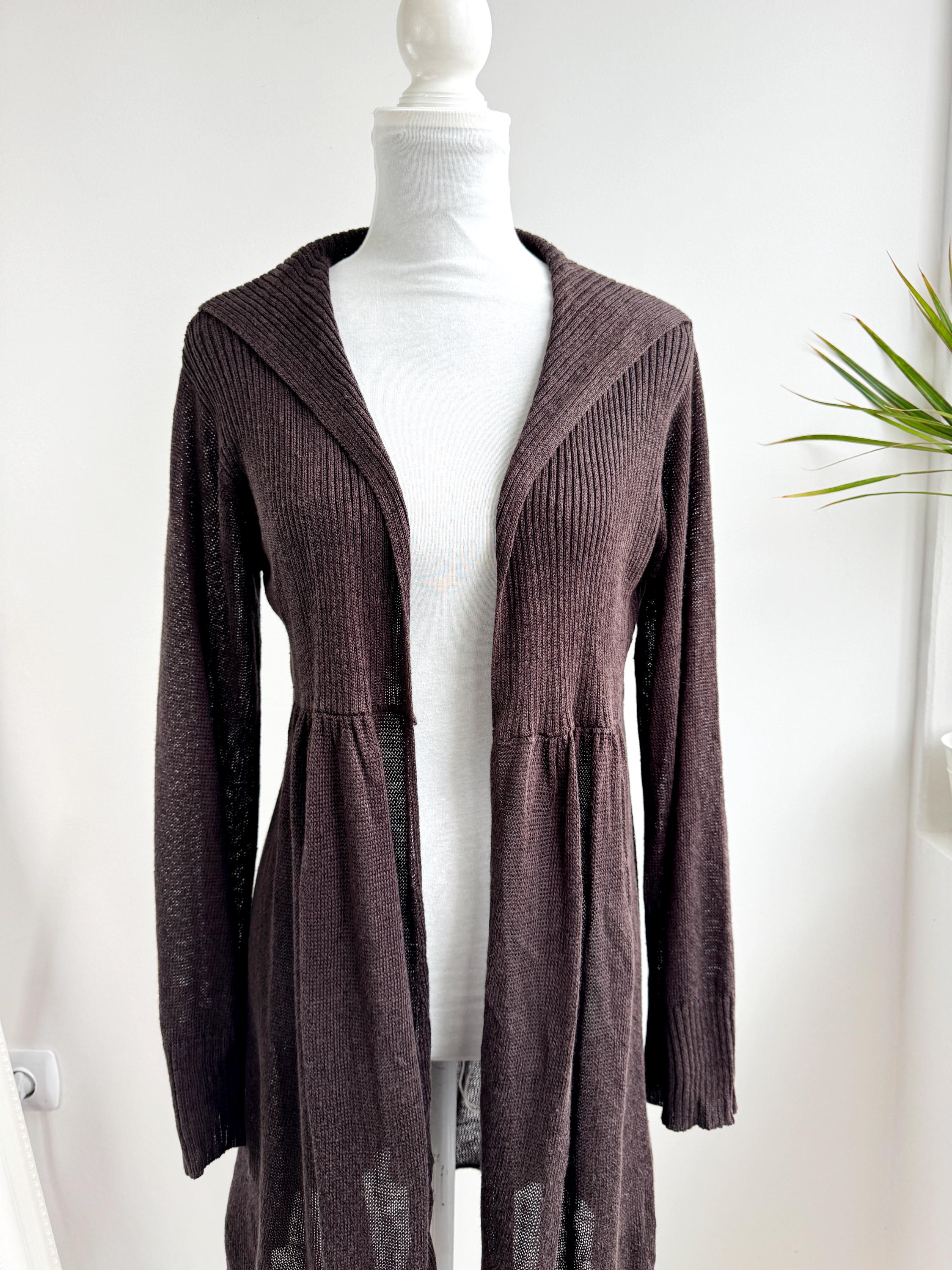 The rich chocolate brown hue is versatile and timeless, while the unique design features a ribbed knit upper that flows into a softly pleated, flared hem. This "duster" style silhouette adds movement and elegance to any outfit, whether paired with simple leggings or layered over a floral midi dress. The open front and relaxed fit provide comfort without sacrificing sophisticated style.