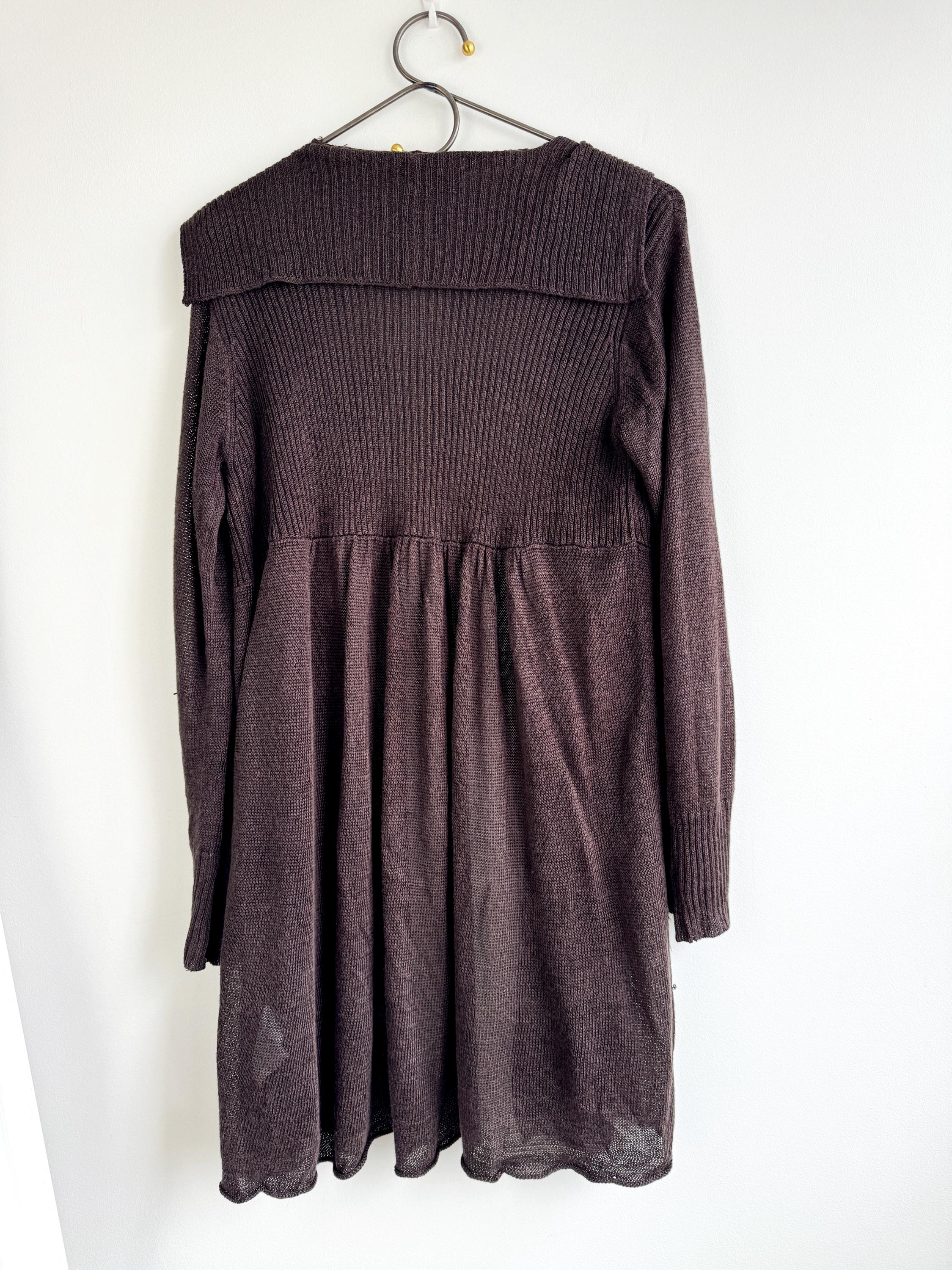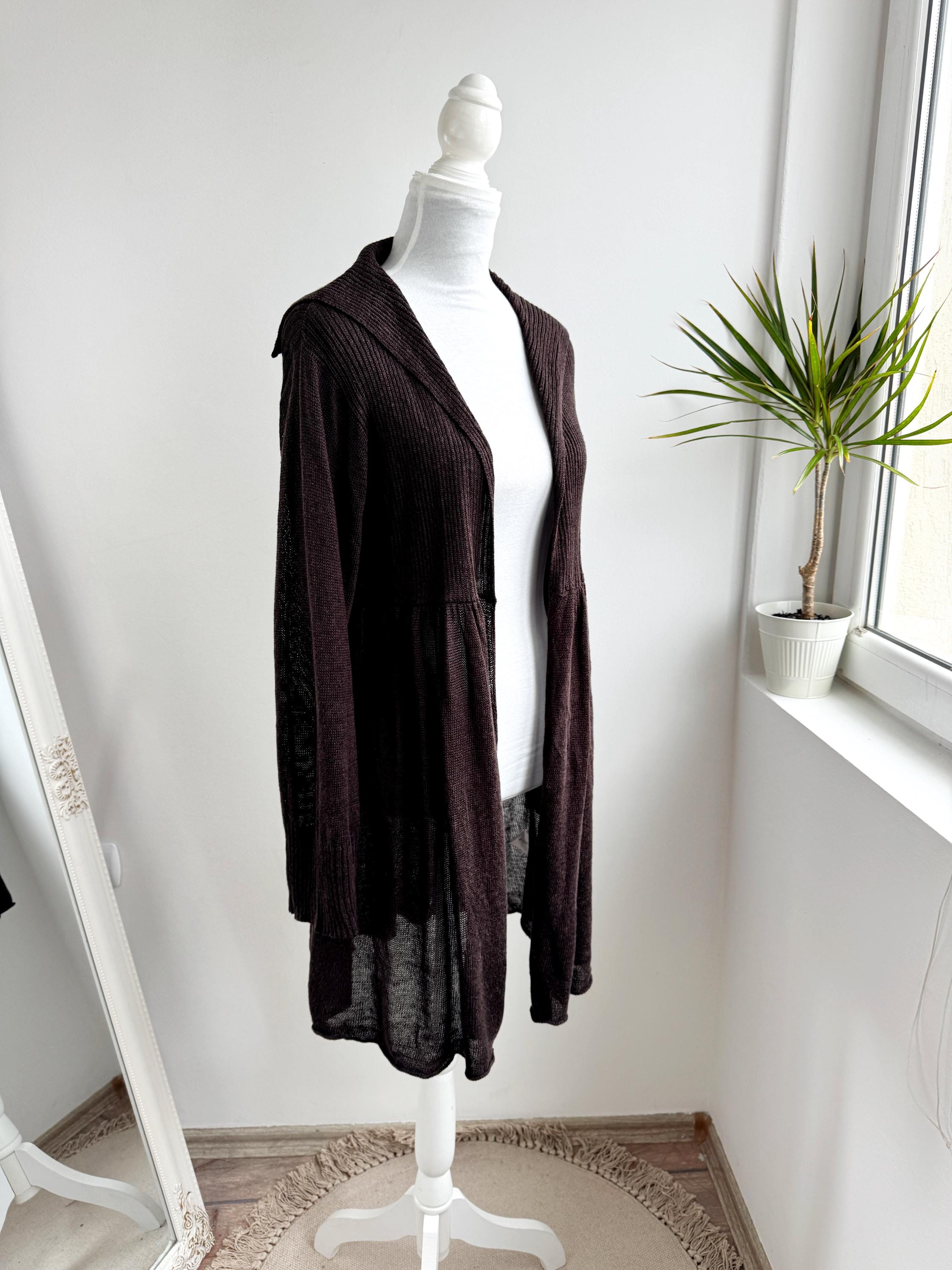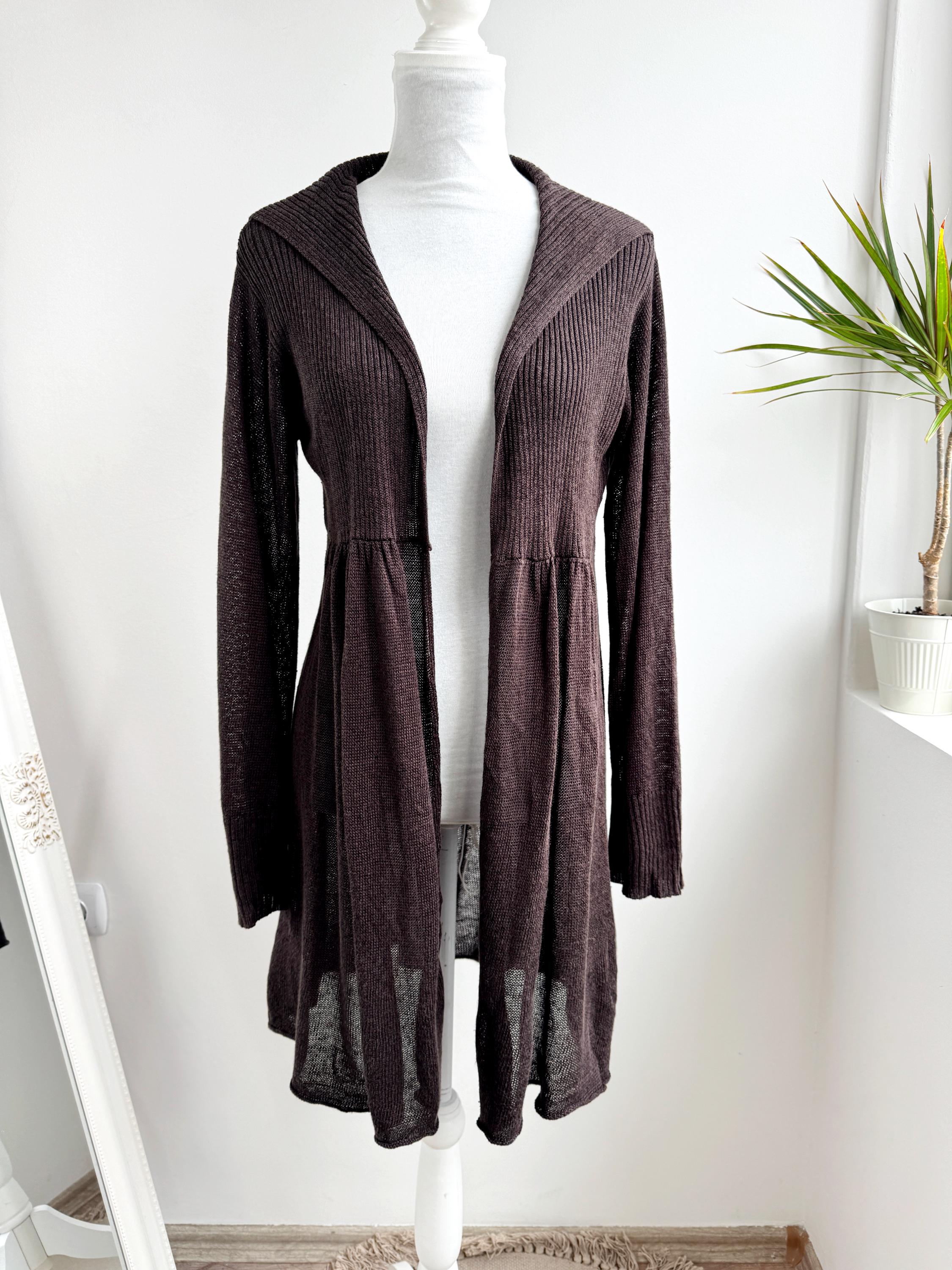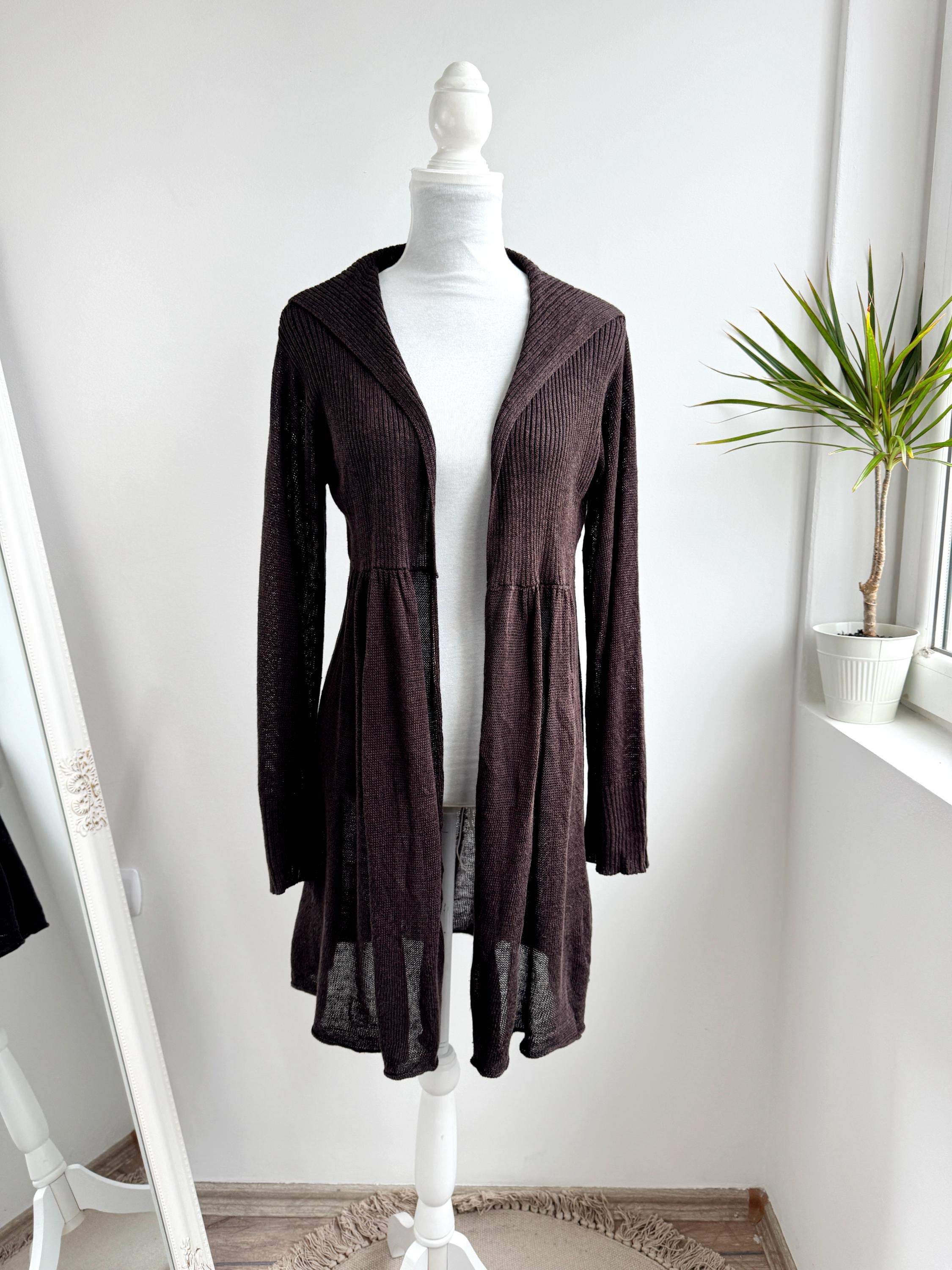 The rich chocolate brown hue is versatile and timeless, while the unique design features a ribbed knit upper that flows into a softly pleated, flared hem. This "duster" style silhouette adds movement and elegance to any outfit, whether paired with simple leggings or layered over a floral midi dress. The open front and relaxed fit provide comfort without sacrificing sophisticated style.