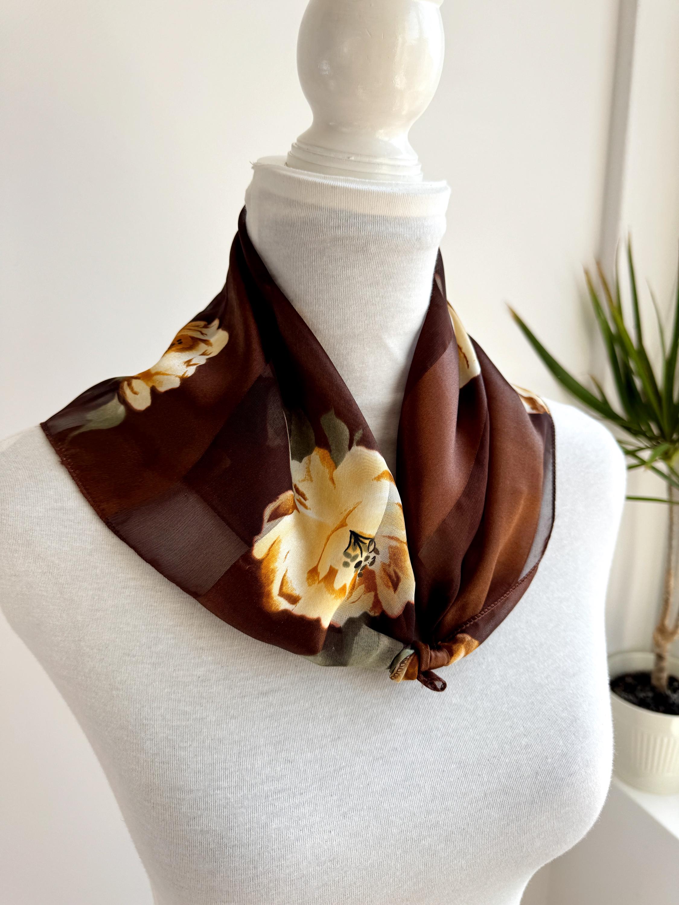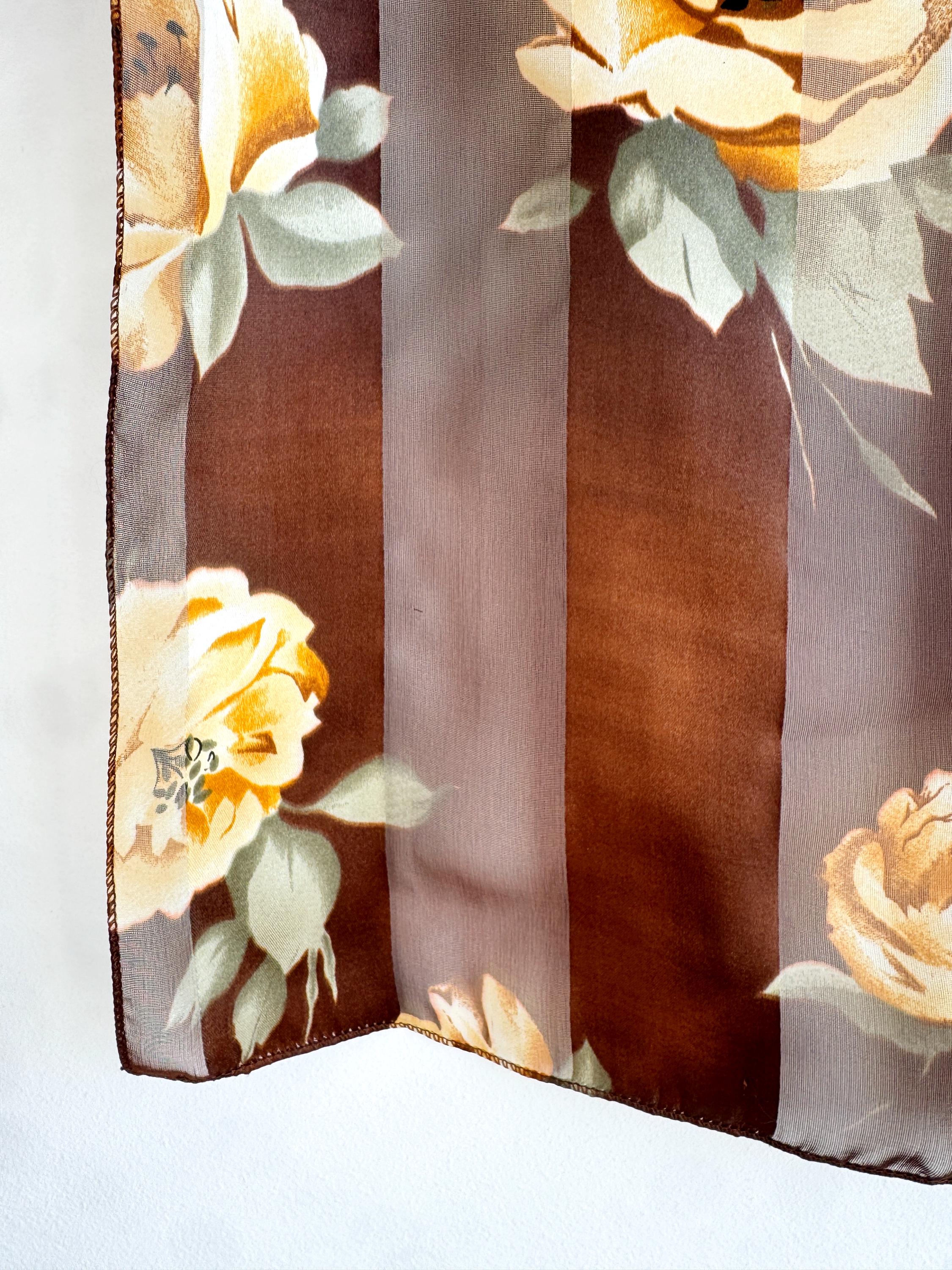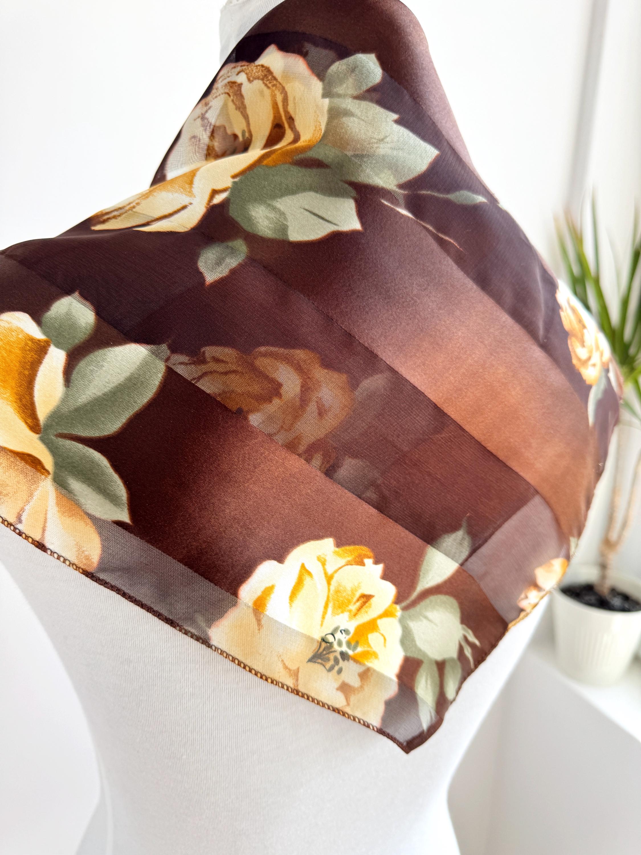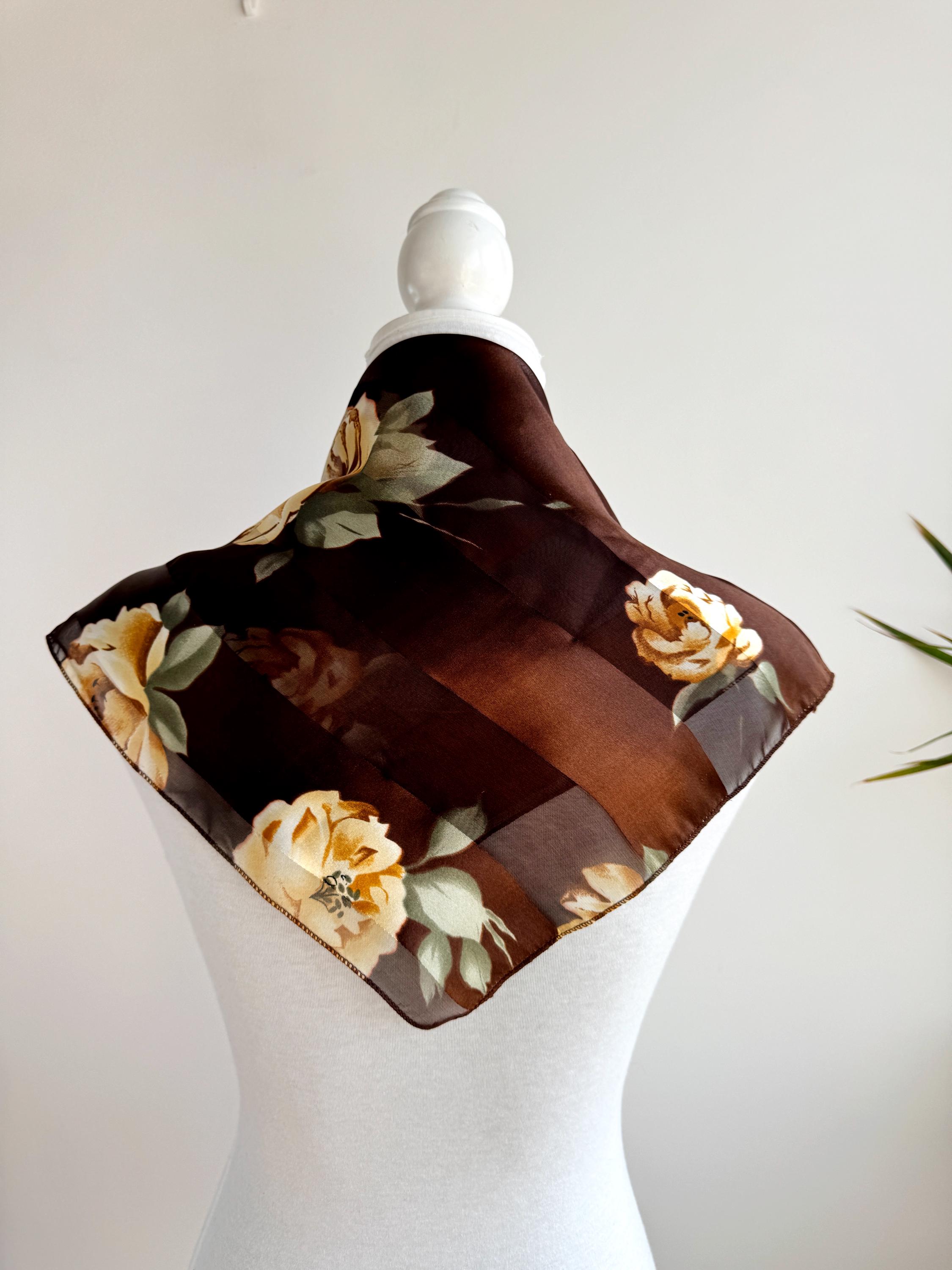 There's something about a beautifully printed square scarf that never goes out of style — and this one is a real find. A deep chocolate brown base with alternating sheer organza and rich satin stripes, printed all over with large, painterly yellow roses and soft sage green leaves. It's the kind of print that looks like it was lifted straight from a Dutch Old Masters painting — warm, rich, romantic and utterly timeless.