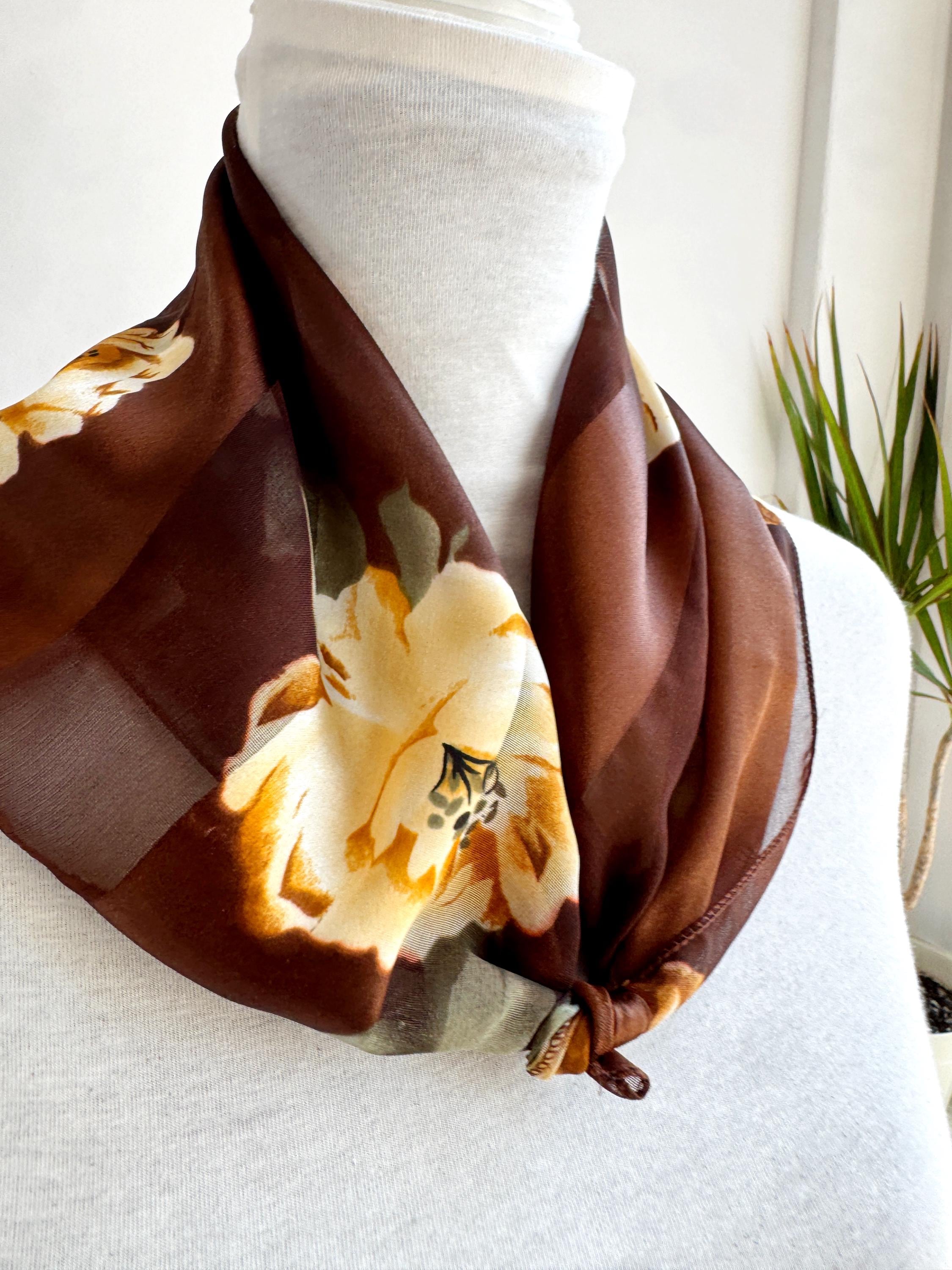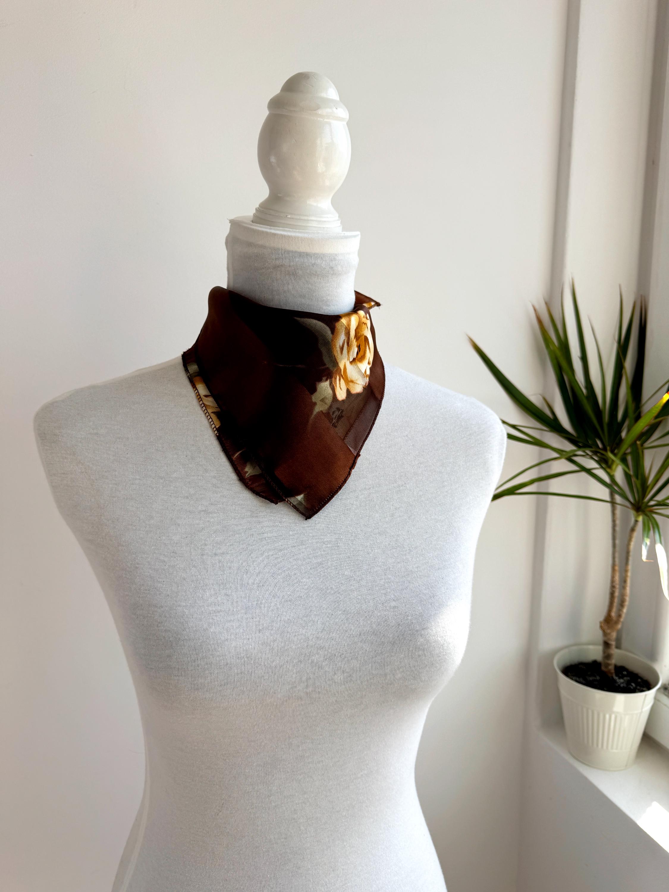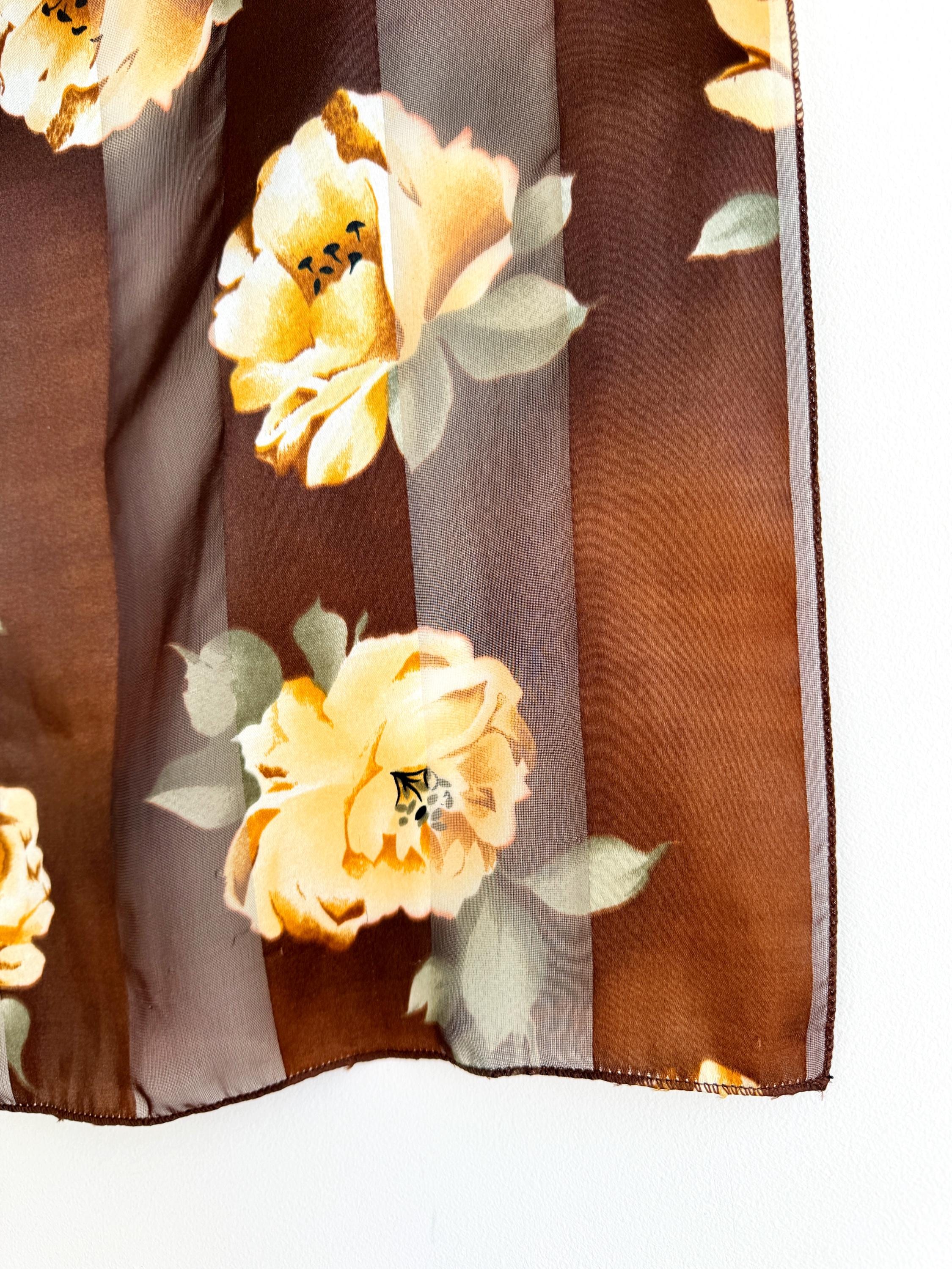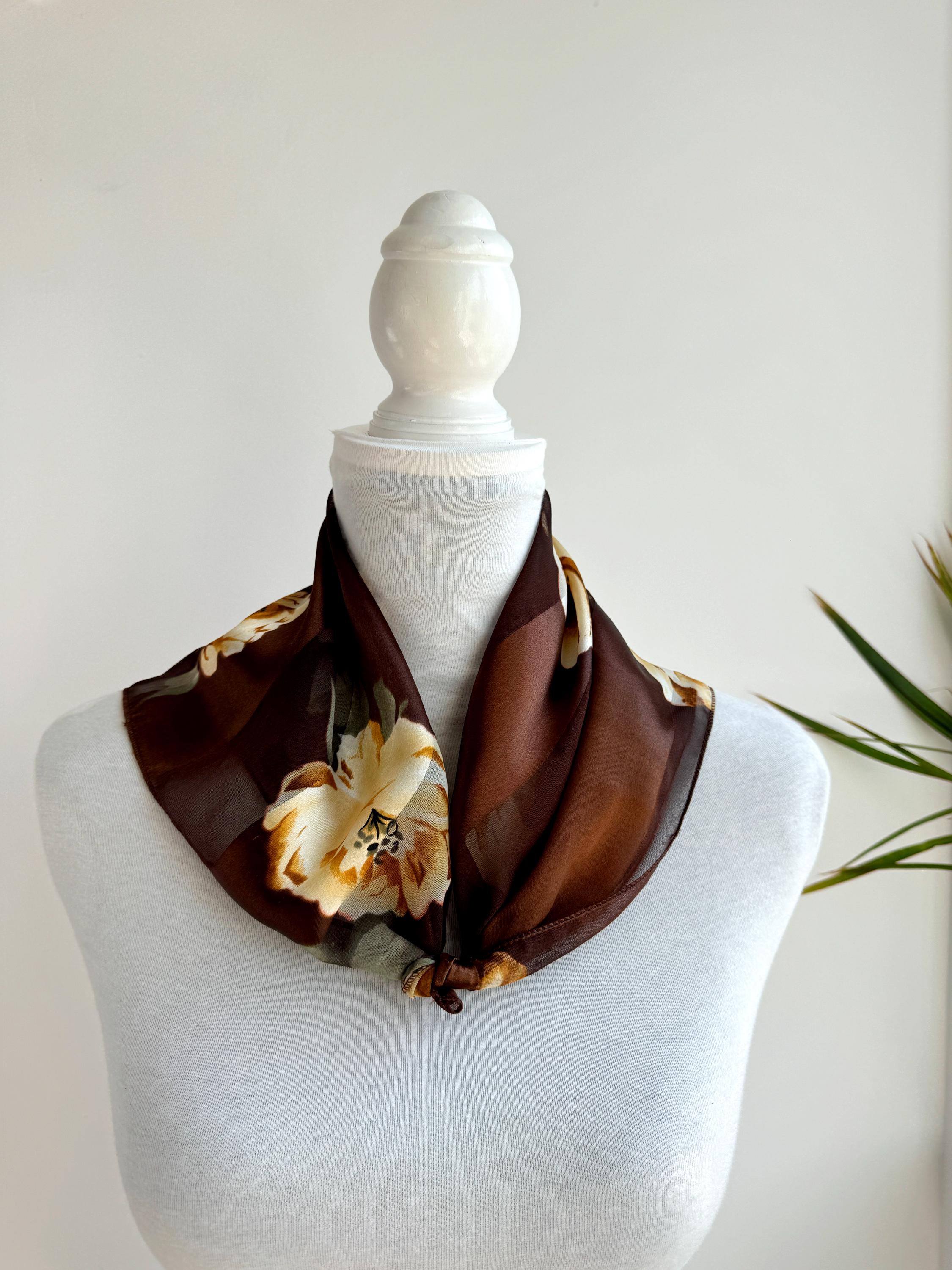 There's something about a beautifully printed square scarf that never goes out of style — and this one is a real find. A deep chocolate brown base with alternating sheer organza and rich satin stripes, printed all over with large, painterly yellow roses and soft sage green leaves. It's the kind of print that looks like it was lifted straight from a Dutch Old Masters painting — warm, rich, romantic and utterly timeless.