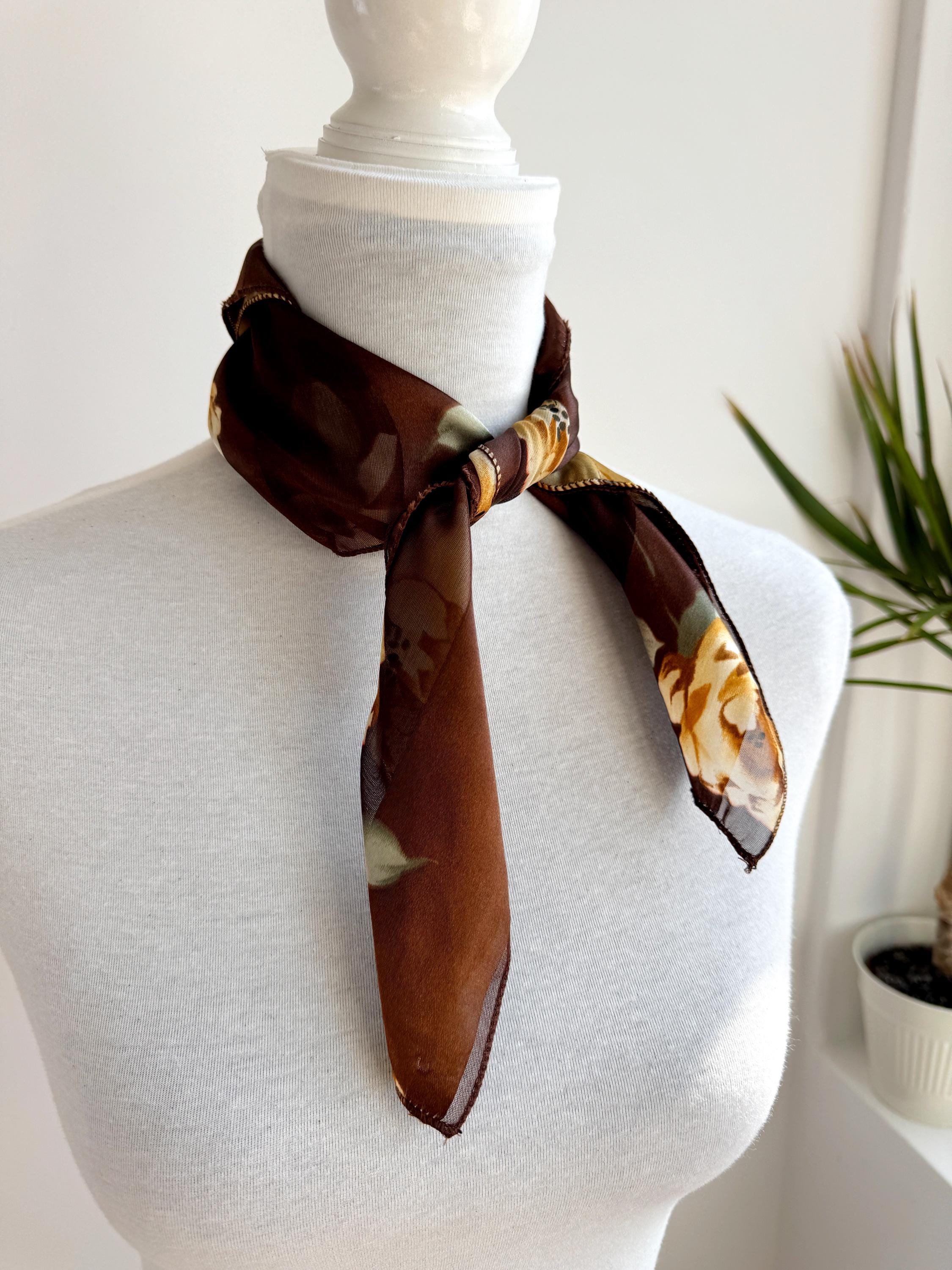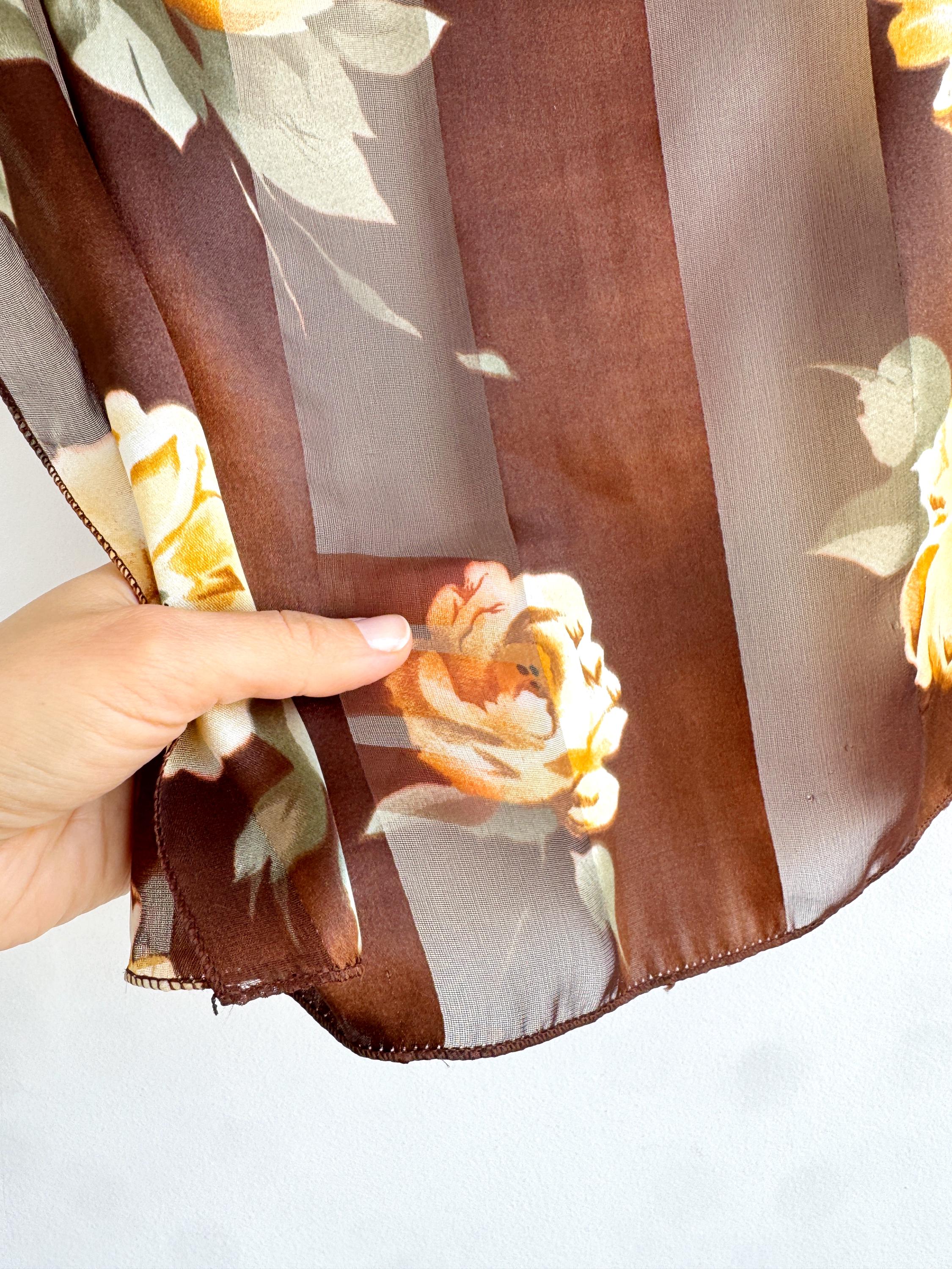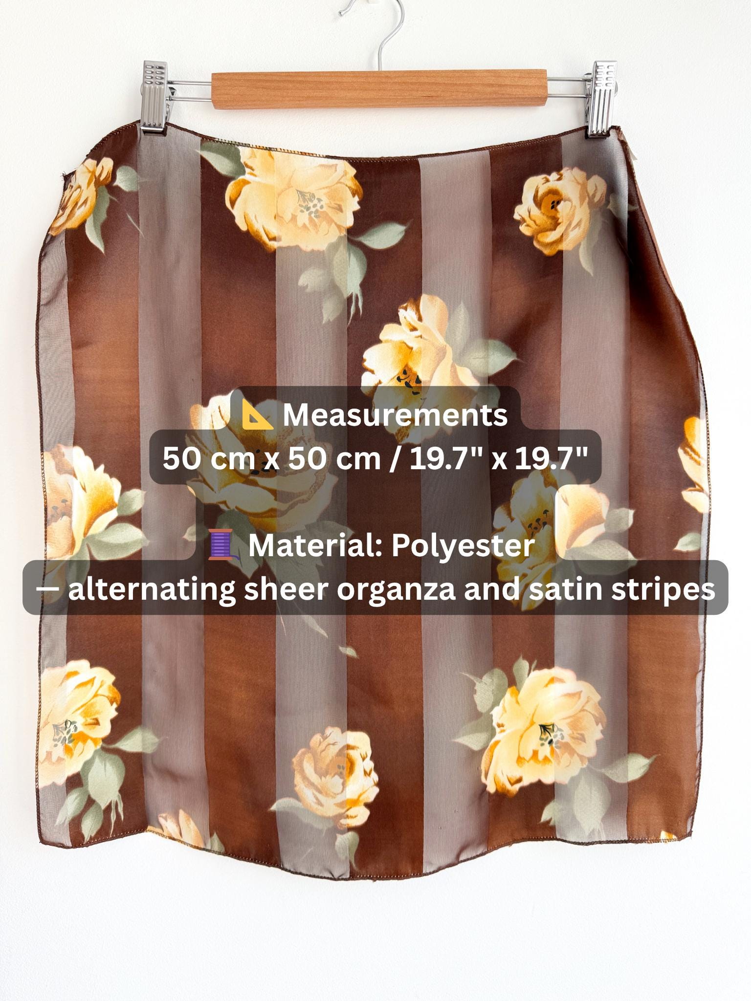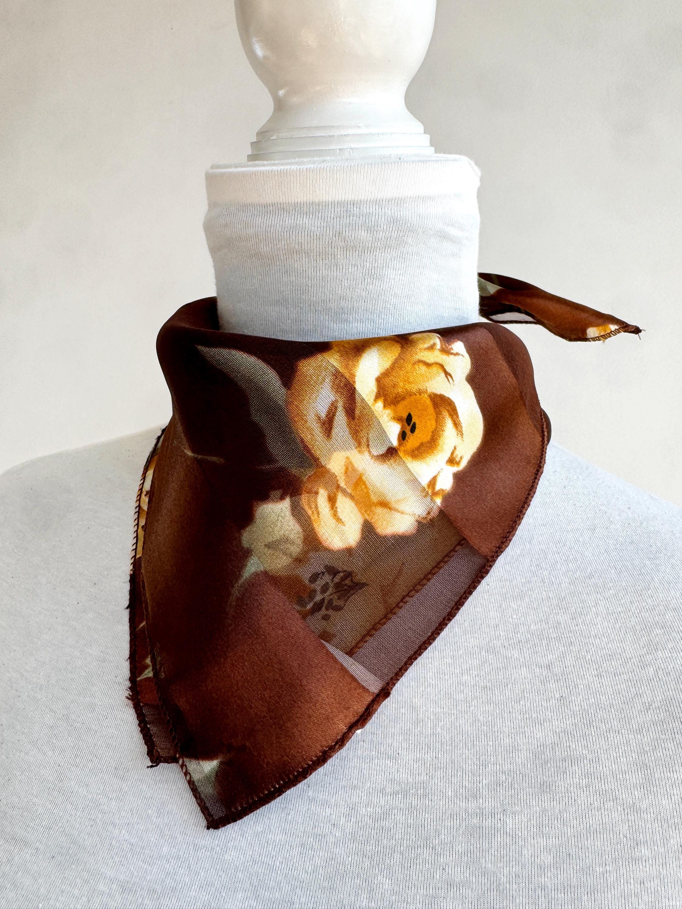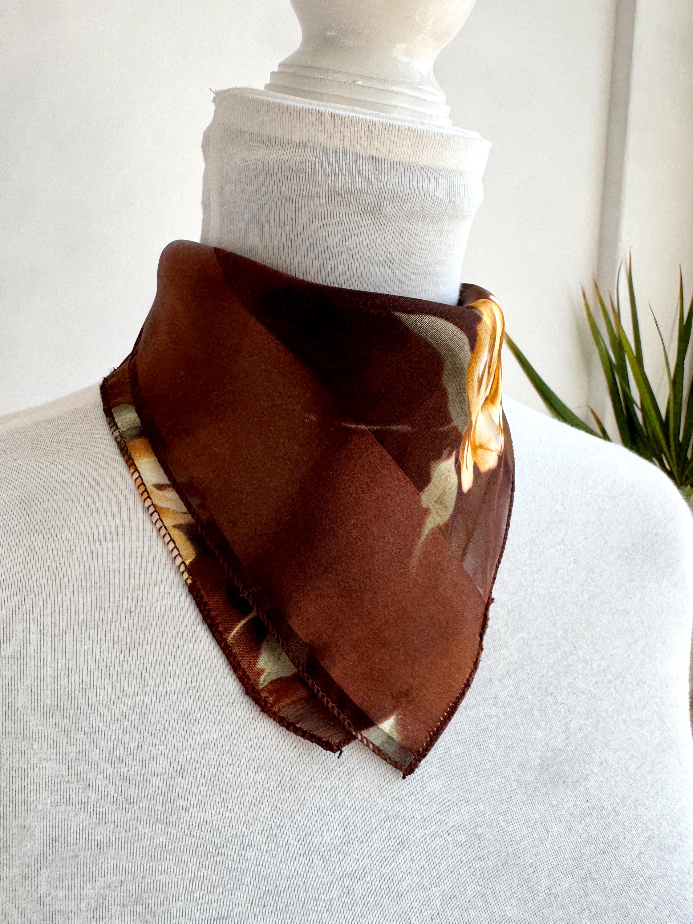 There's something about a beautifully printed square scarf that never goes out of style — and this one is a real find. A deep chocolate brown base with alternating sheer organza and rich satin stripes, printed all over with large, painterly yellow roses and soft sage green leaves. It's the kind of print that looks like it was lifted straight from a Dutch Old Masters painting — warm, rich, romantic and utterly timeless.