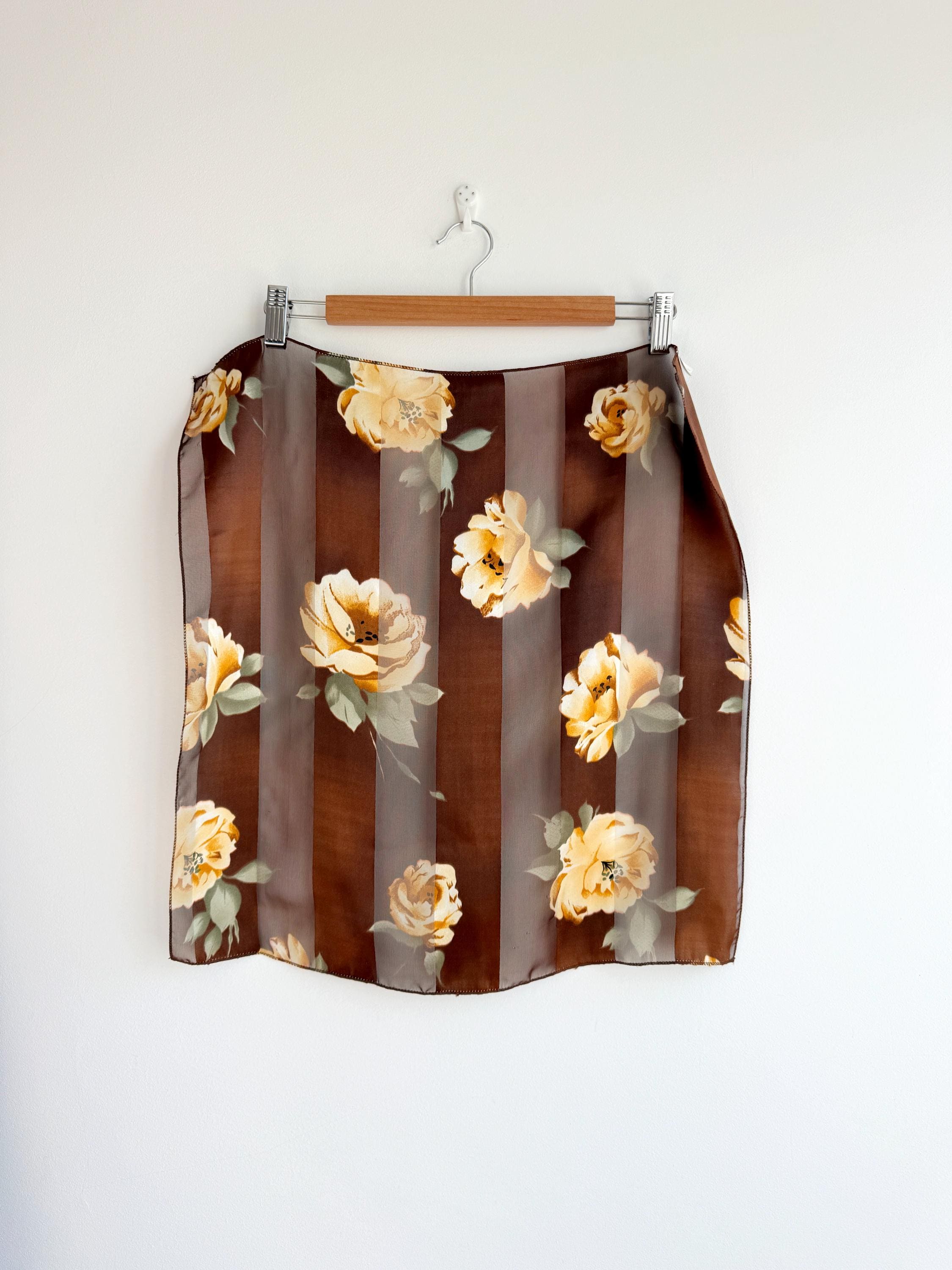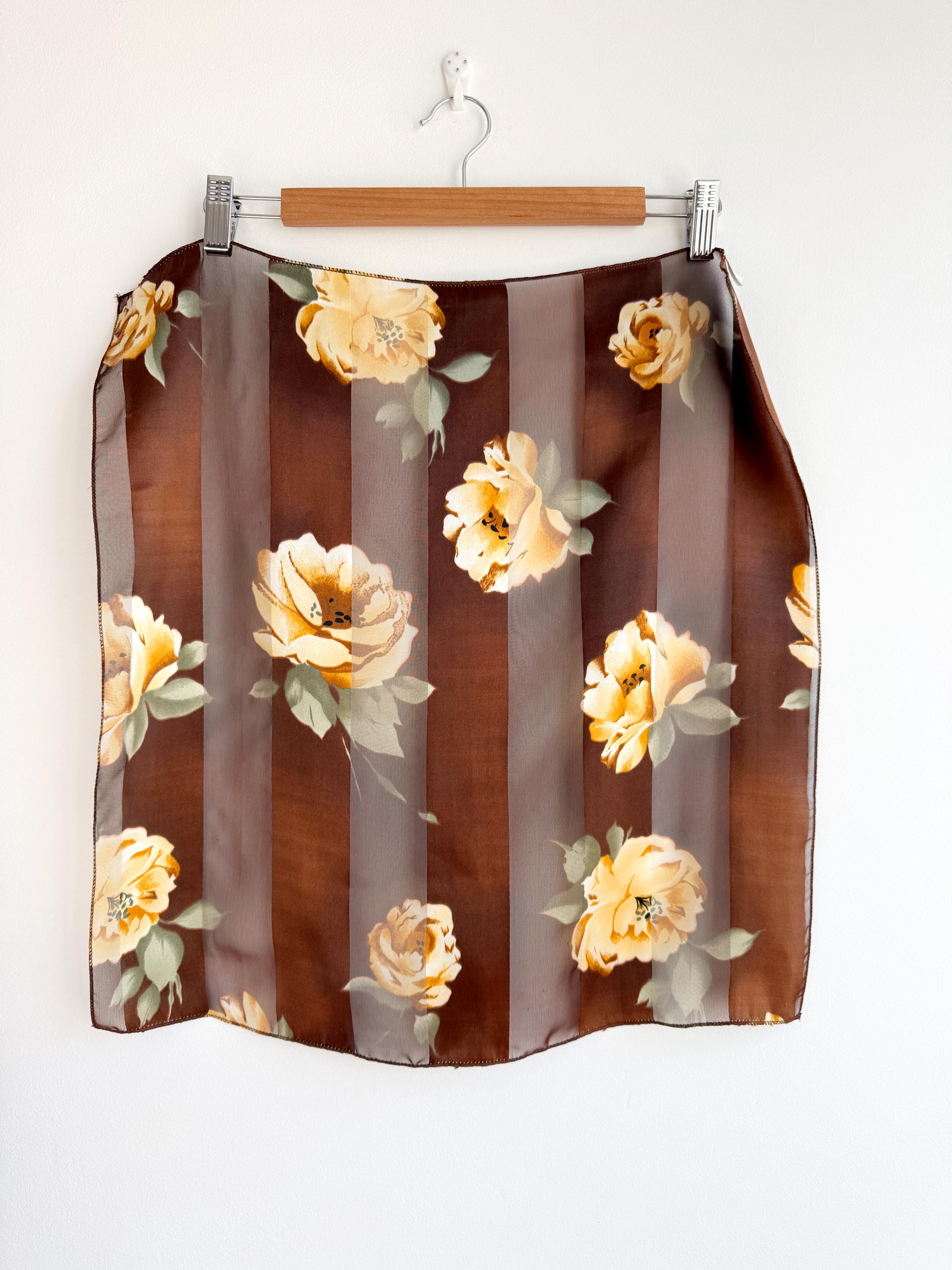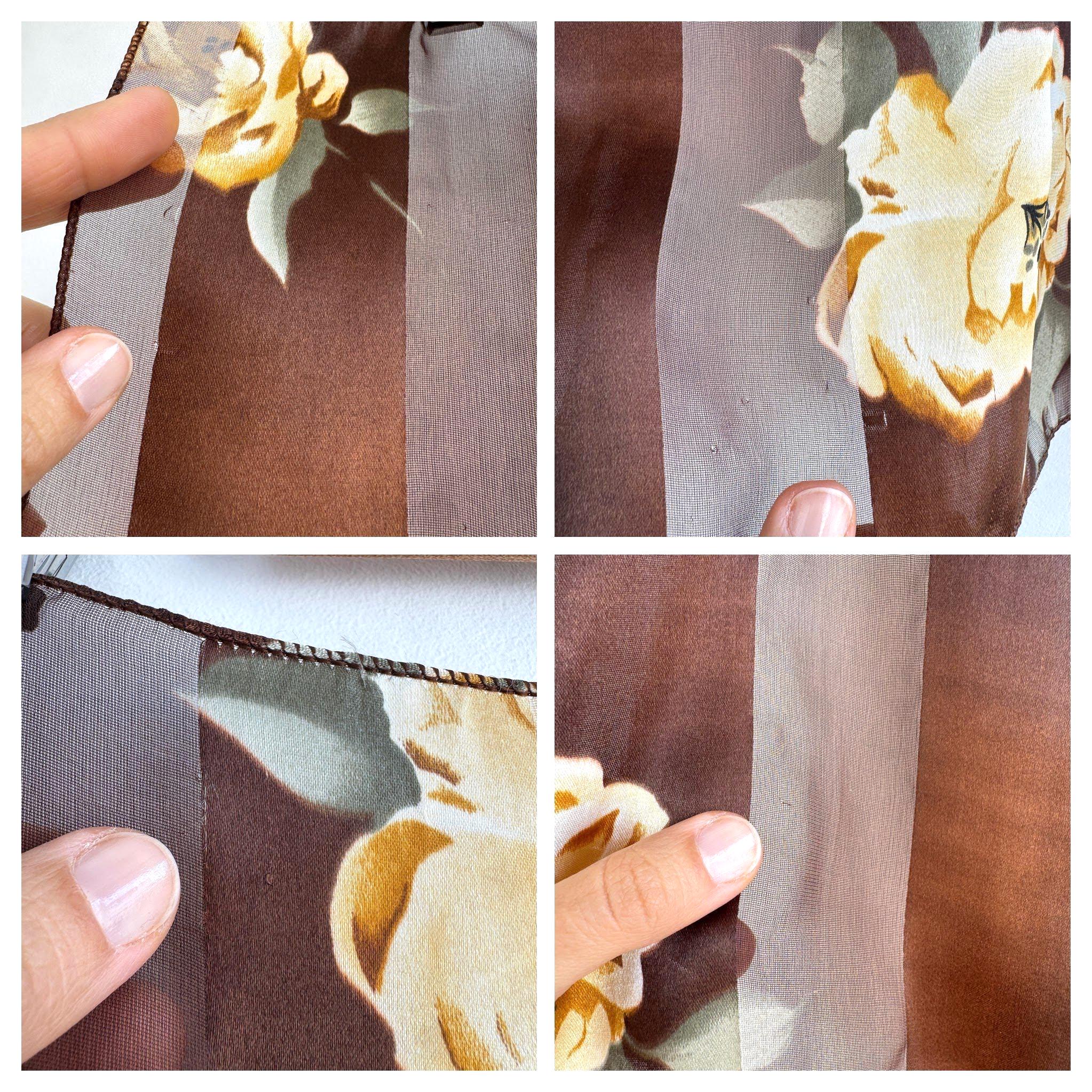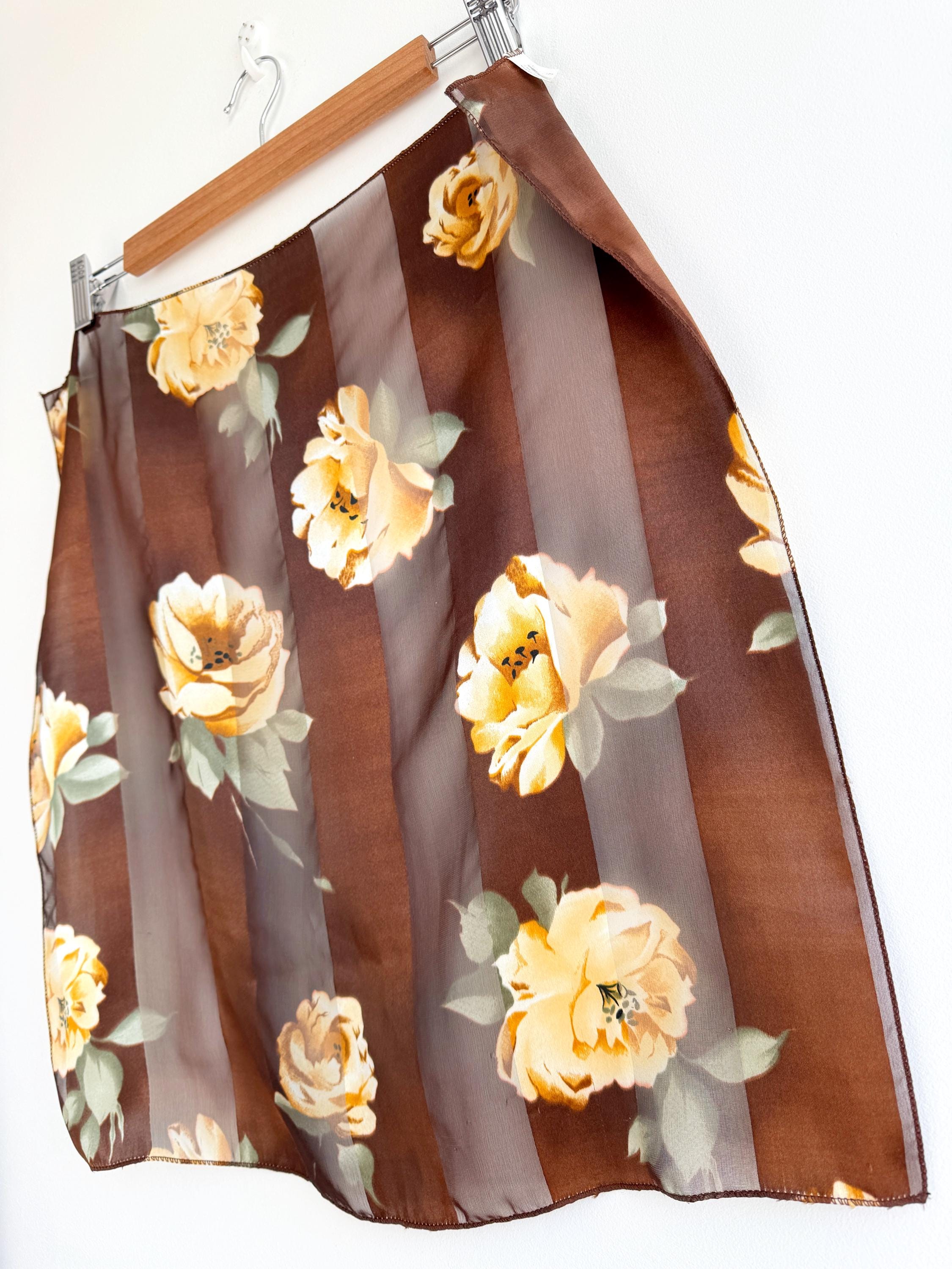 There's something about a beautifully printed square scarf that never goes out of style — and this one is a real find. A deep chocolate brown base with alternating sheer organza and rich satin stripes, printed all over with large, painterly yellow roses and soft sage green leaves. It's the kind of print that looks like it was lifted straight from a Dutch Old Masters painting — warm, rich, romantic and utterly timeless.