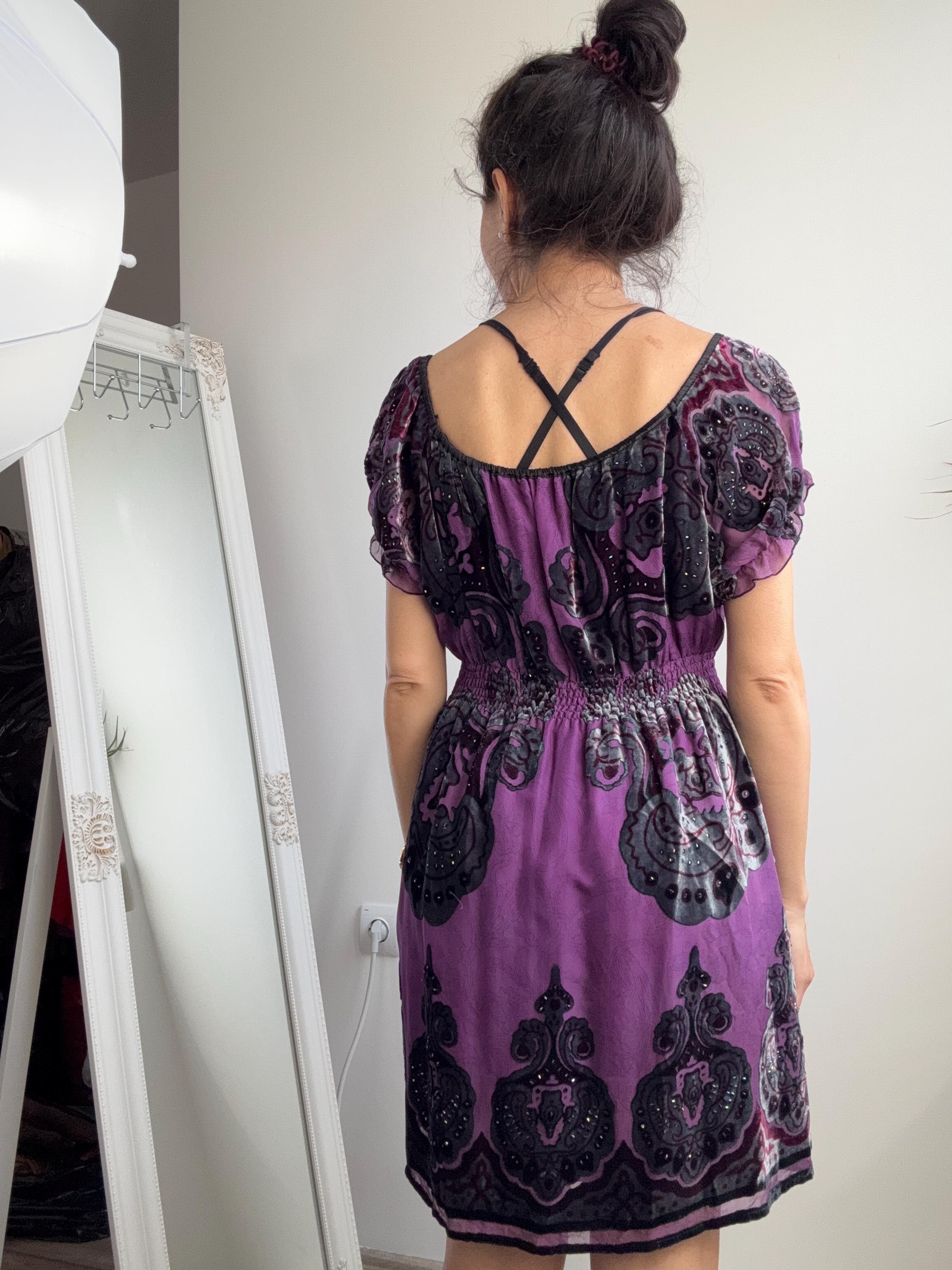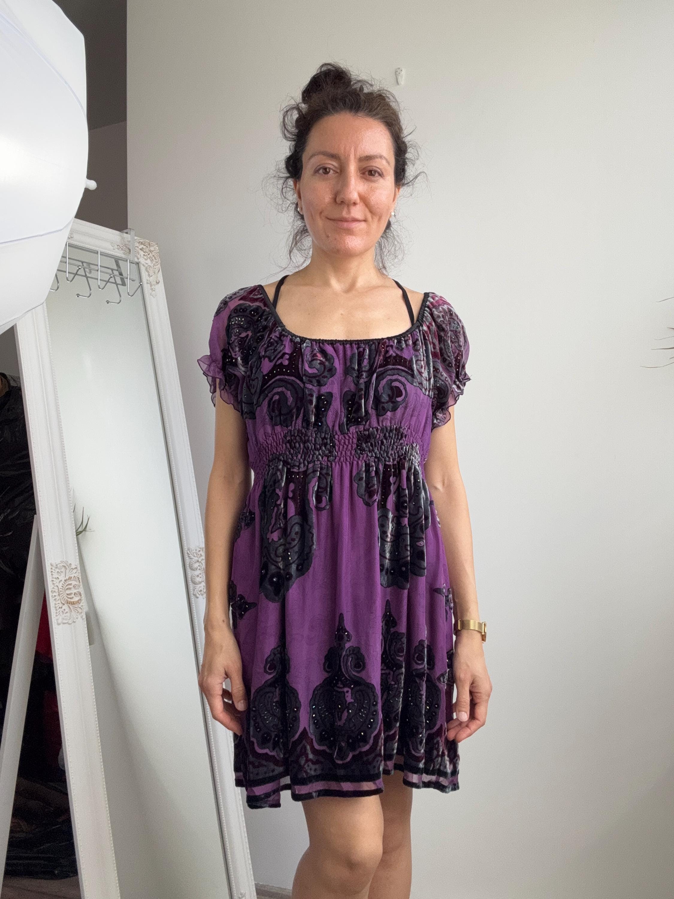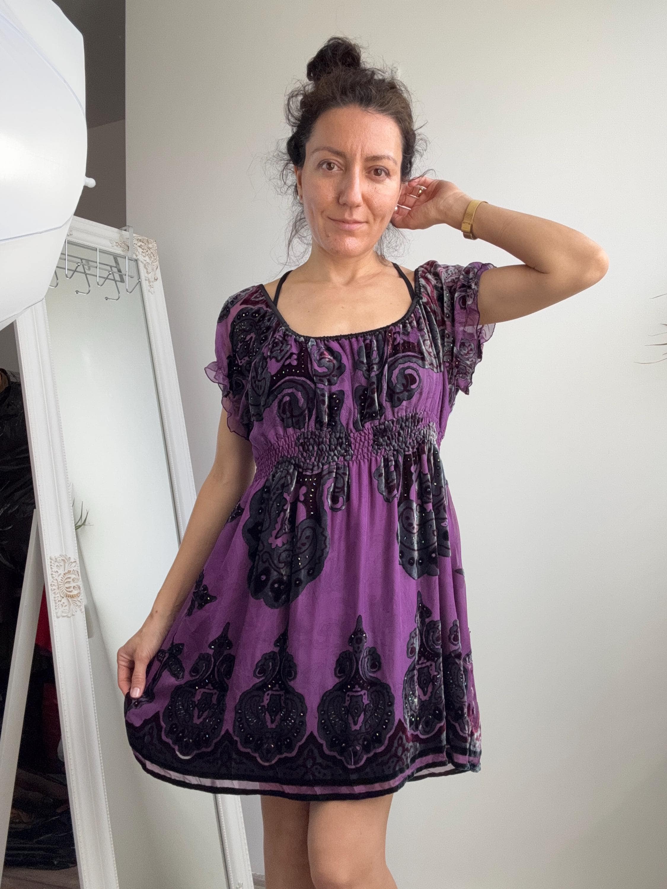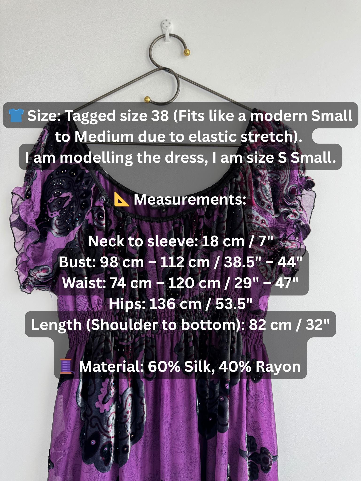👕 Size: Tagged size 38 (Fits like a modern S/M Small to Medium due to elastic stretch). I am modelling the dress, I am size S Small.