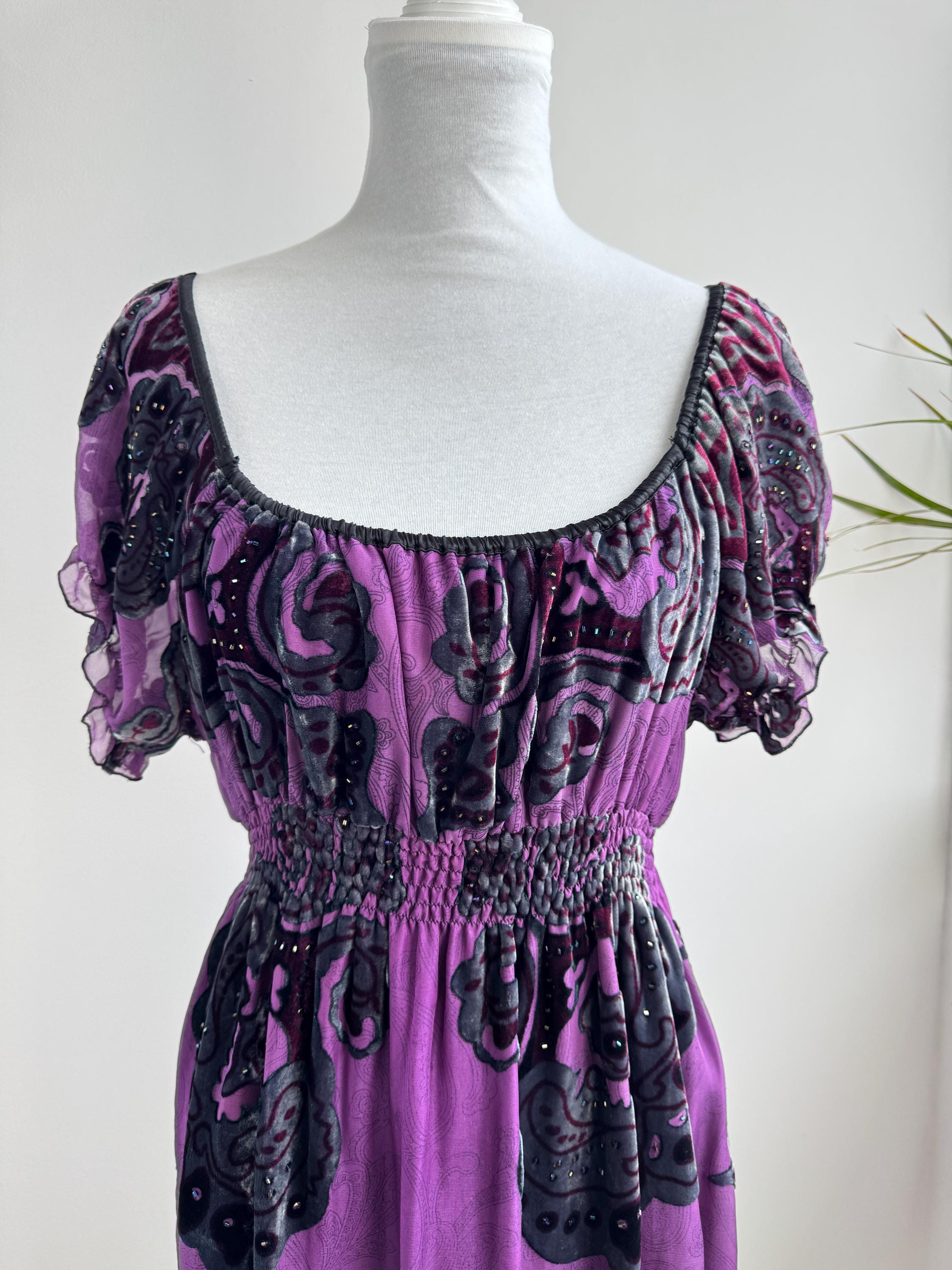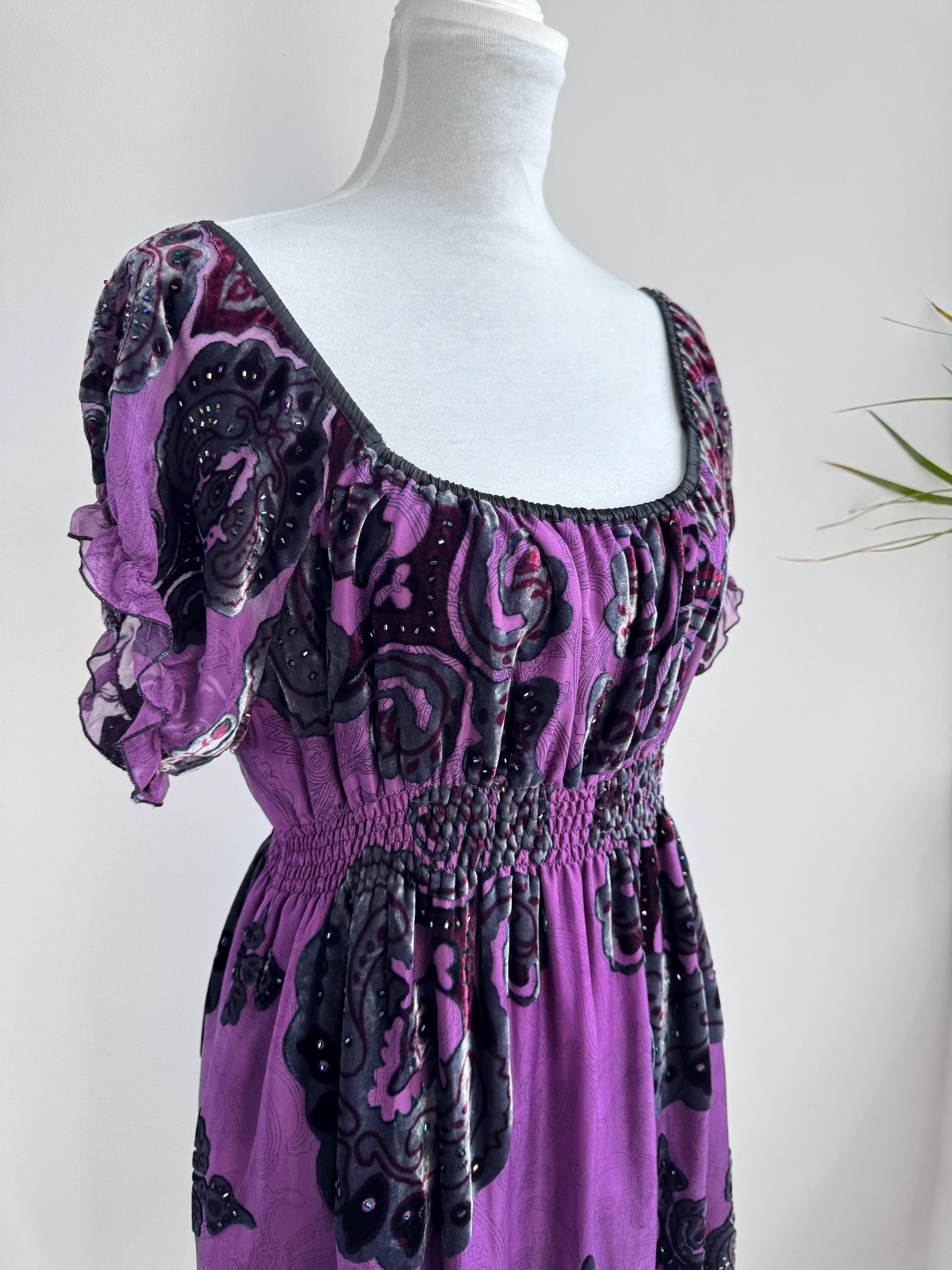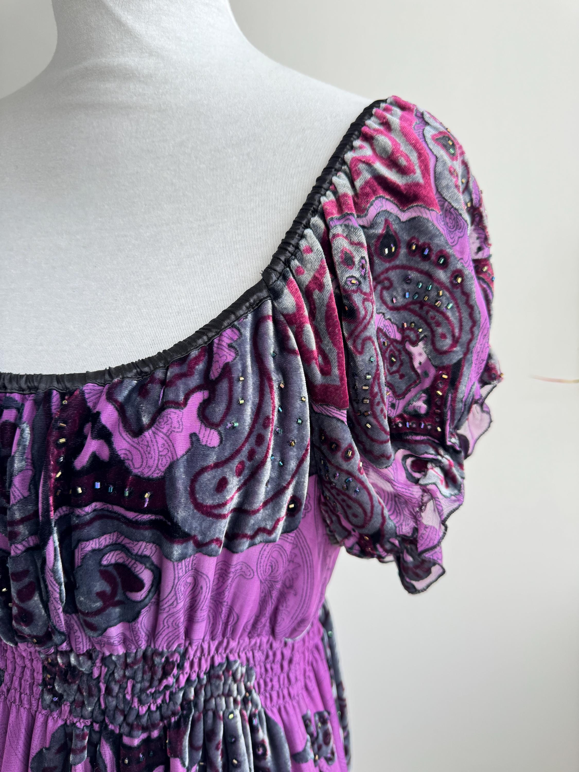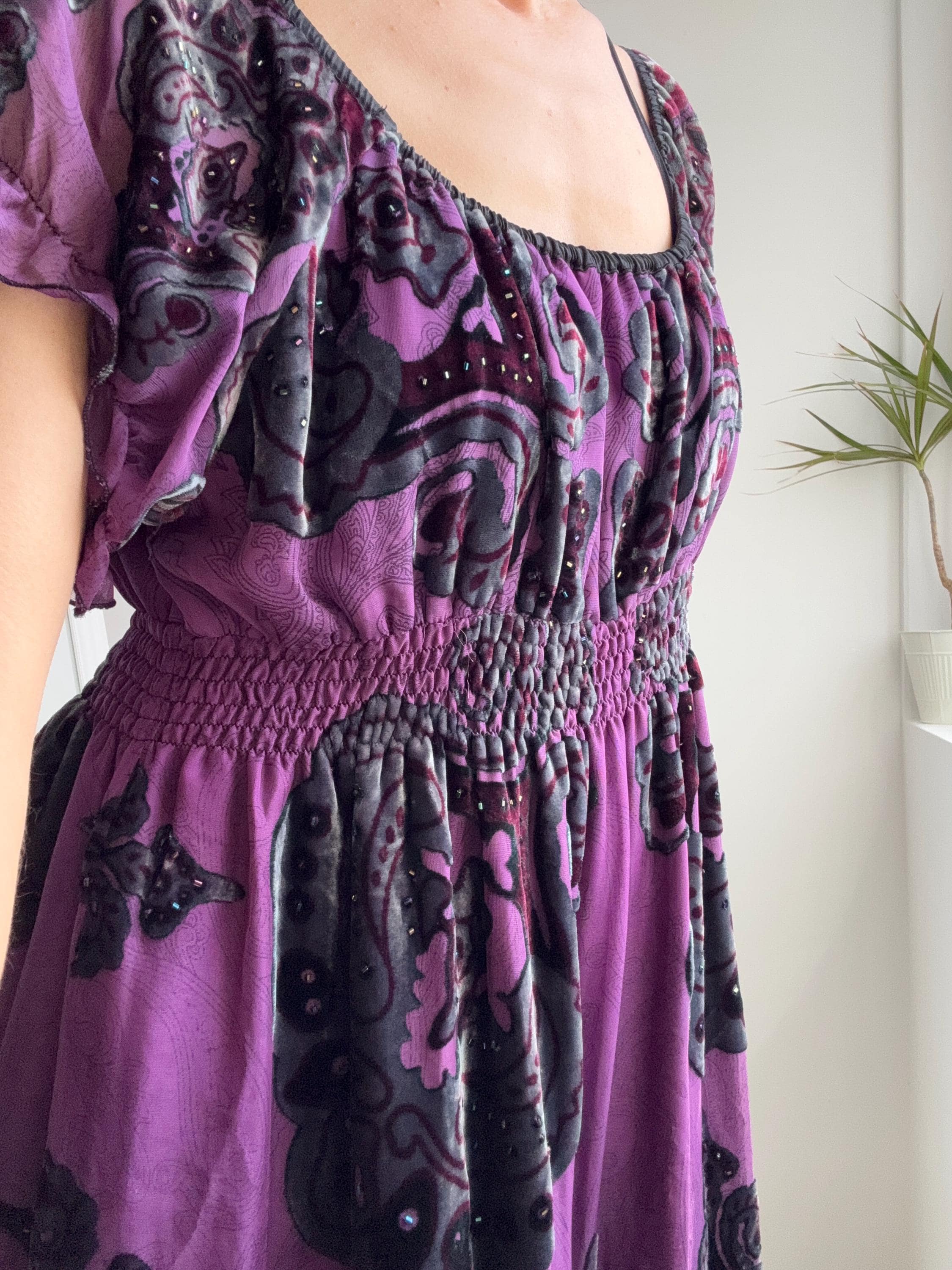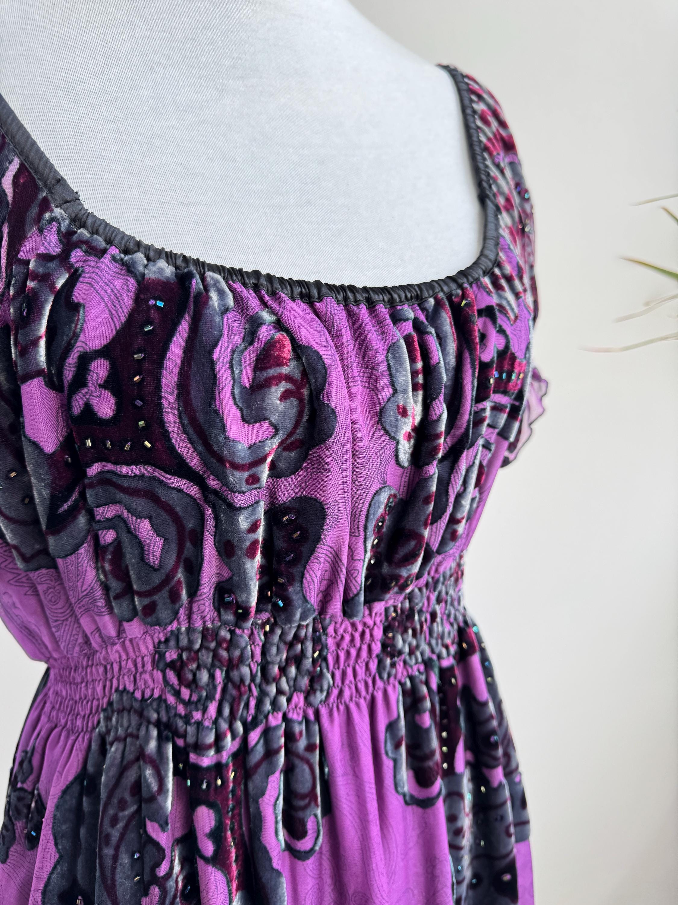 Step into bohemian elegance with this stunning "Exclusive by Tara" devore mini dress with paisley burnt velvet pattern and seed bead decoration. Crafted from a luxurious silk and rayon blend, this piece features a breathtaking velvet devoré (burnout) paisley pattern in shades of deep purple and charcoal grey. The intricate fabric is further elevated by delicate hand-beaded accents throughout the bodice and sleeves, catching the light with every movement.