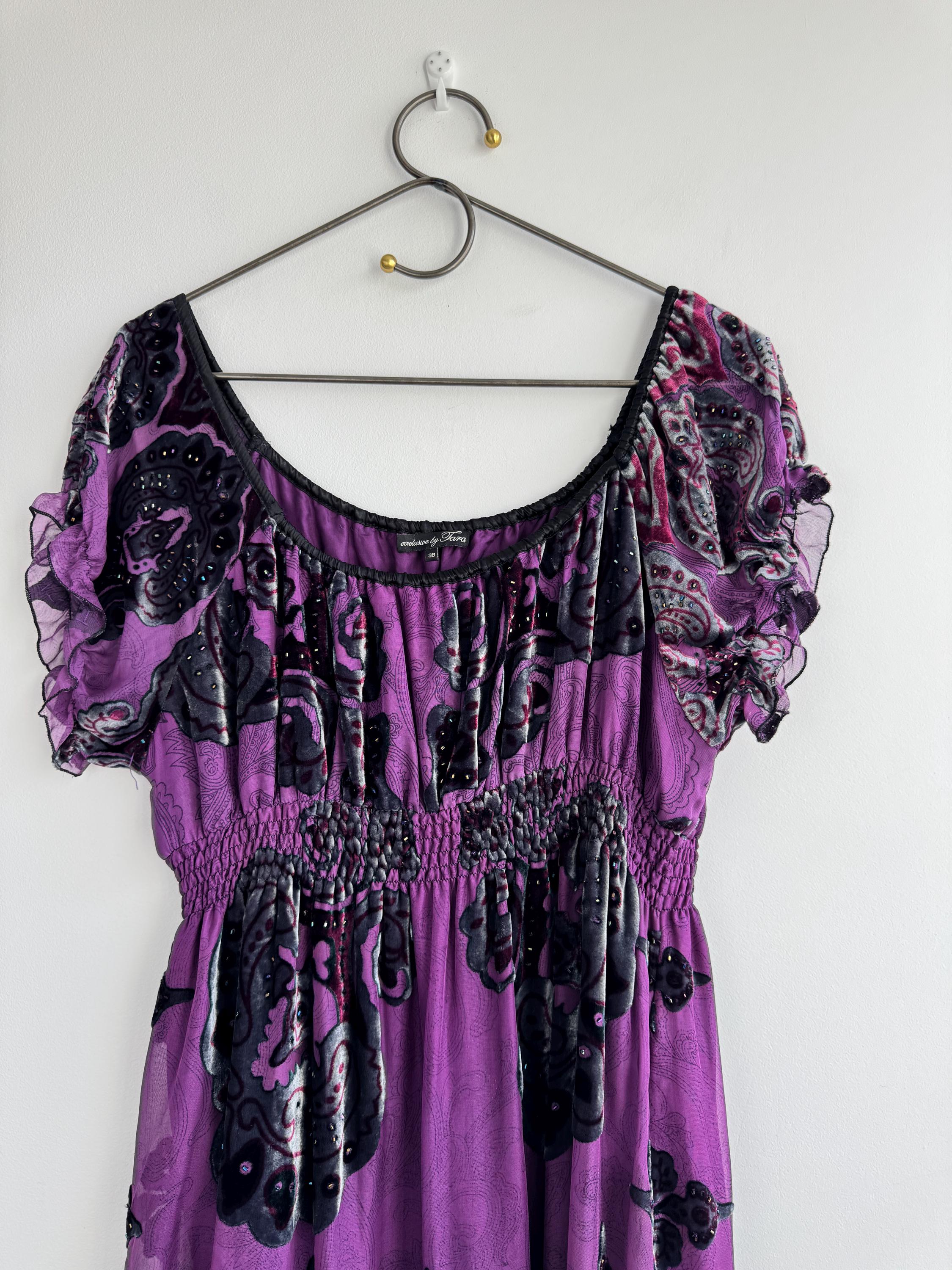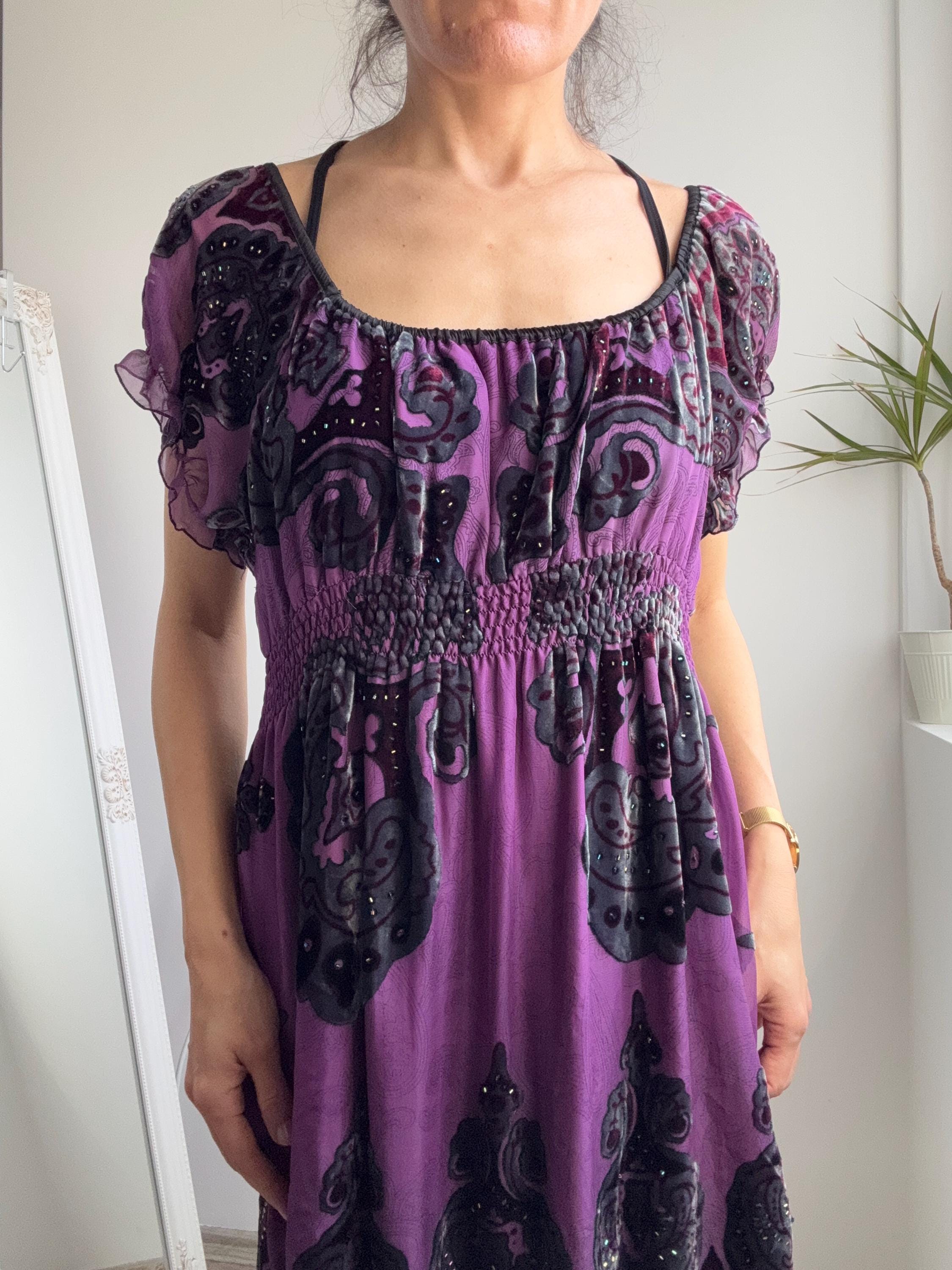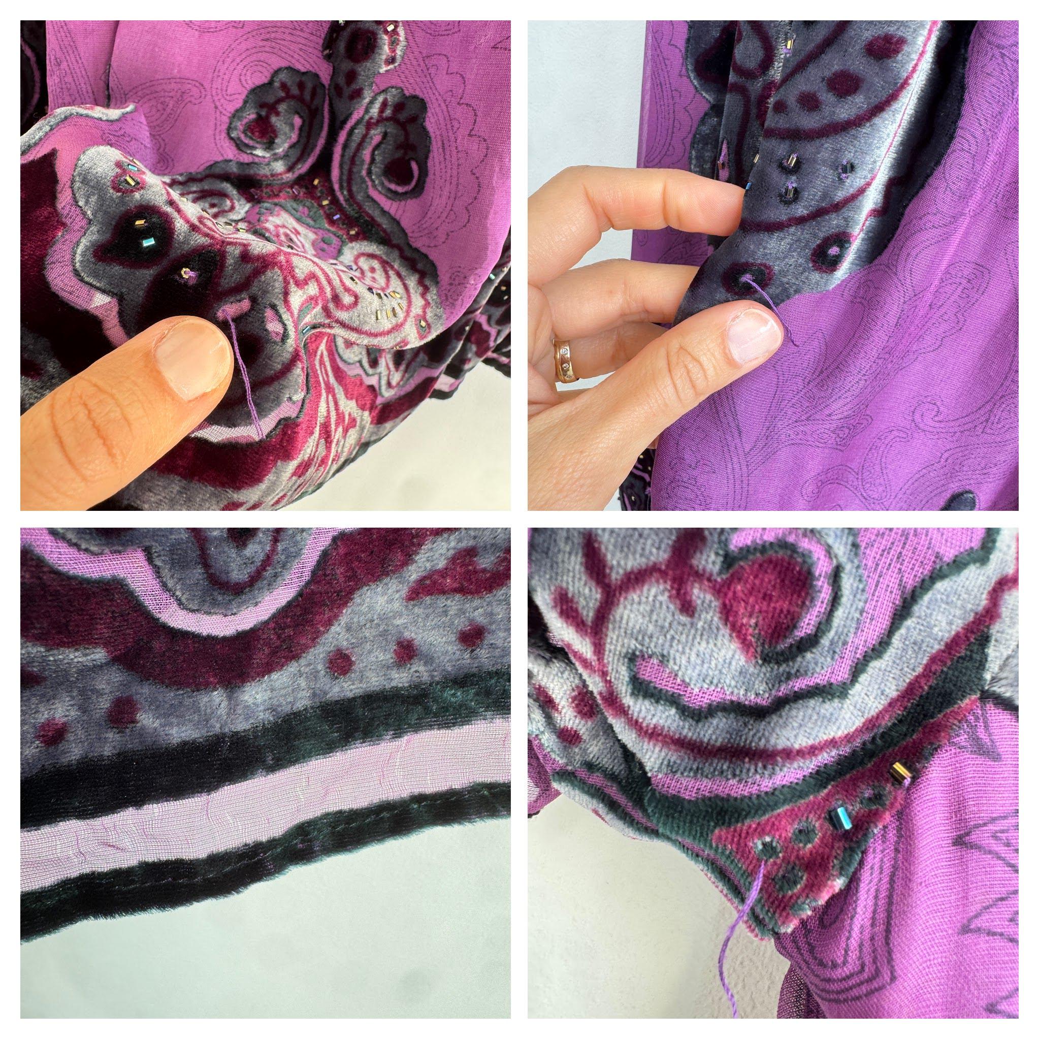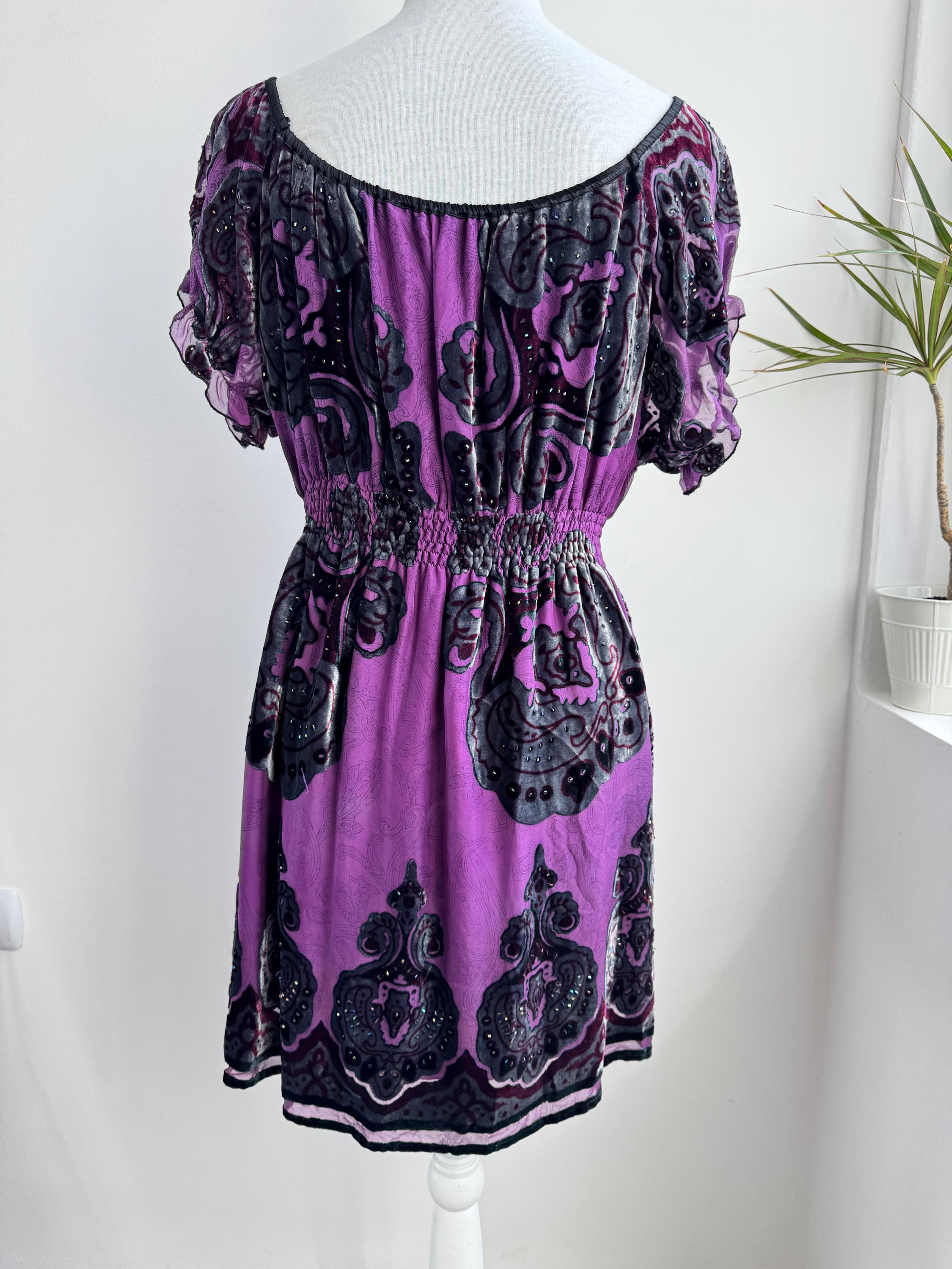 Step into bohemian elegance with this stunning "Exclusive by Tara" devore mini dress with paisley burnt velvet pattern and seed bead decoration. Crafted from a luxurious silk and rayon blend, this piece features a breathtaking velvet devoré (burnout) paisley pattern in shades of deep purple and charcoal grey. The intricate fabric is further elevated by delicate hand-beaded accents throughout the bodice and sleeves, catching the light with every movement.