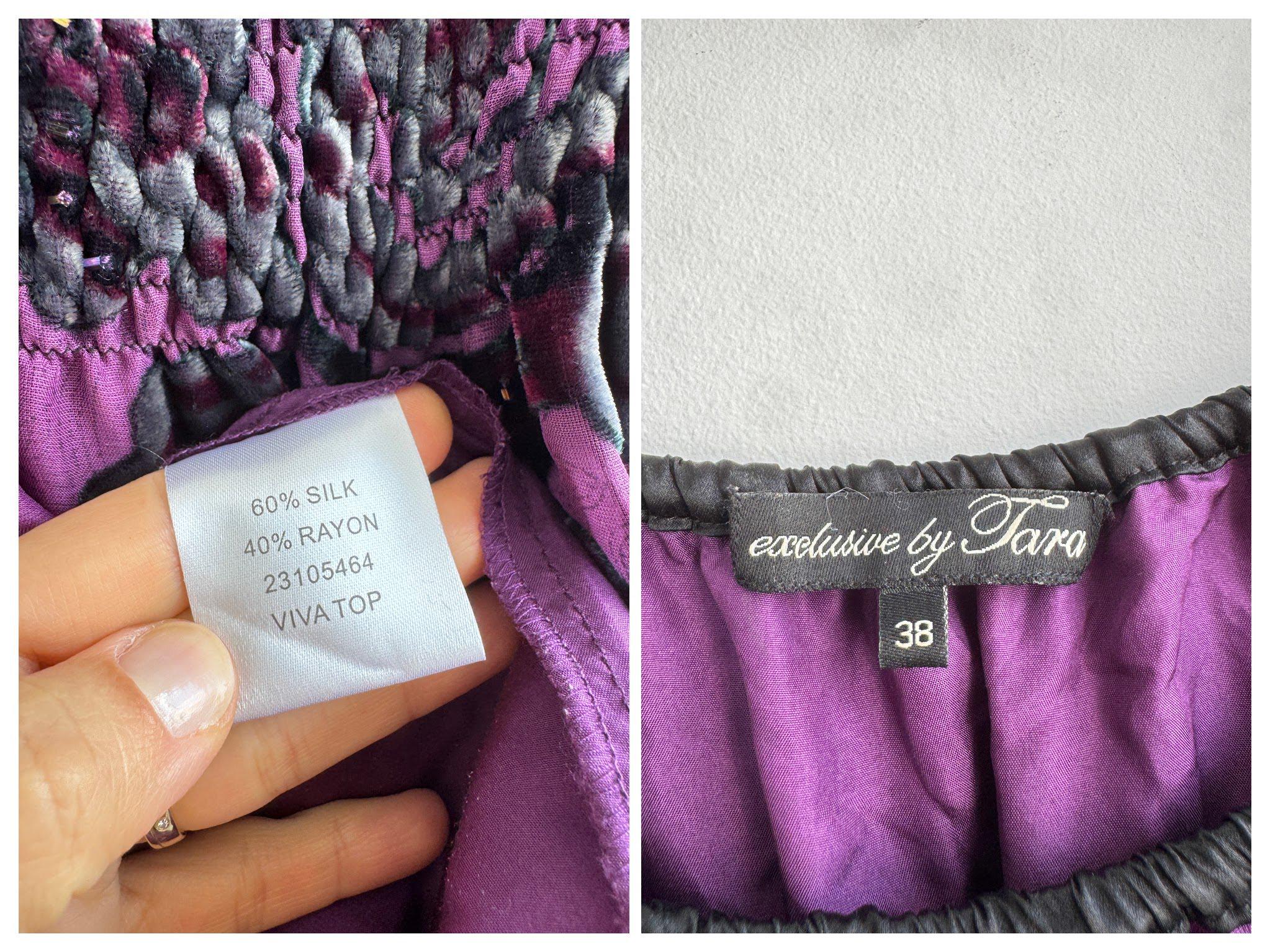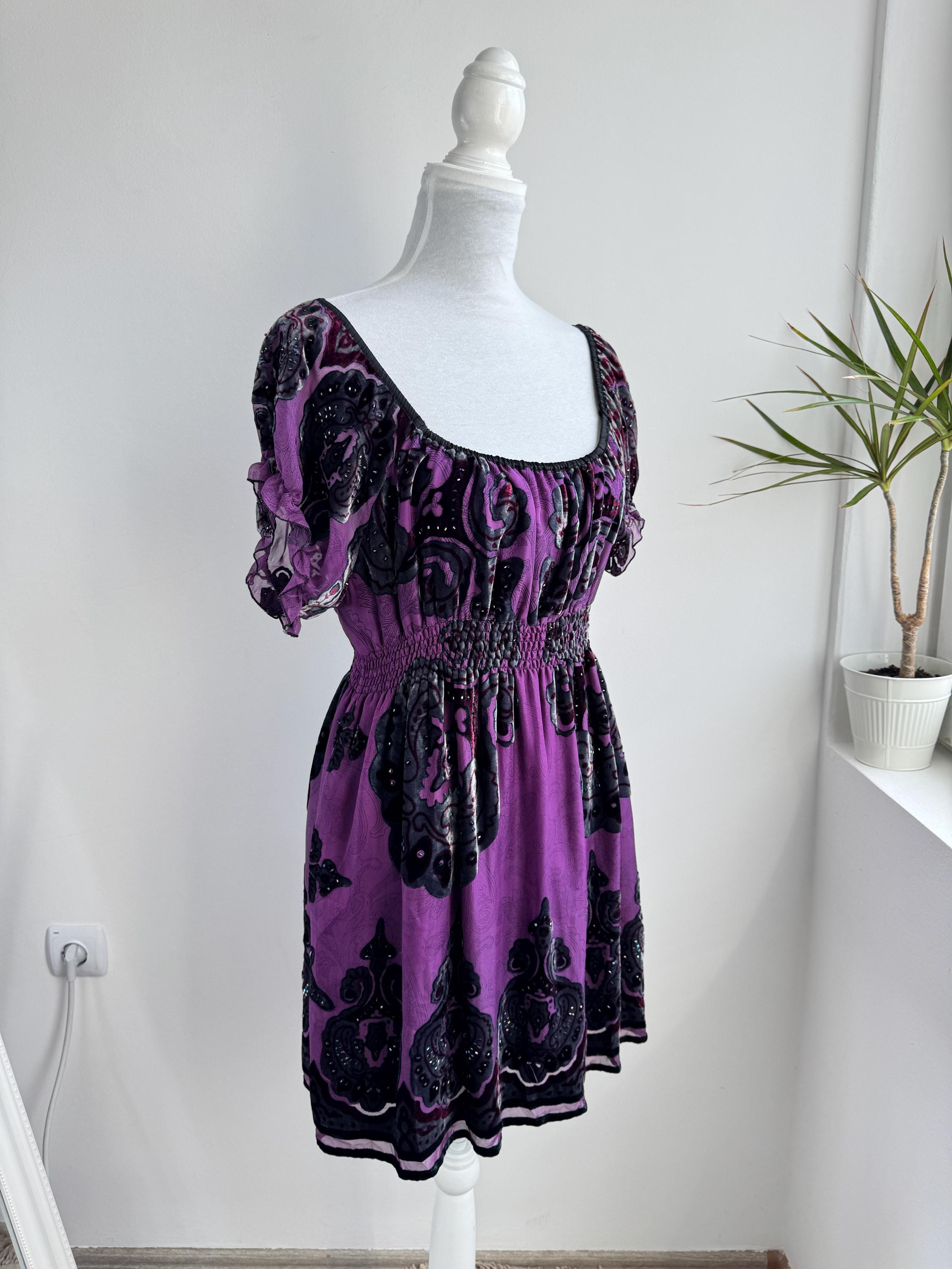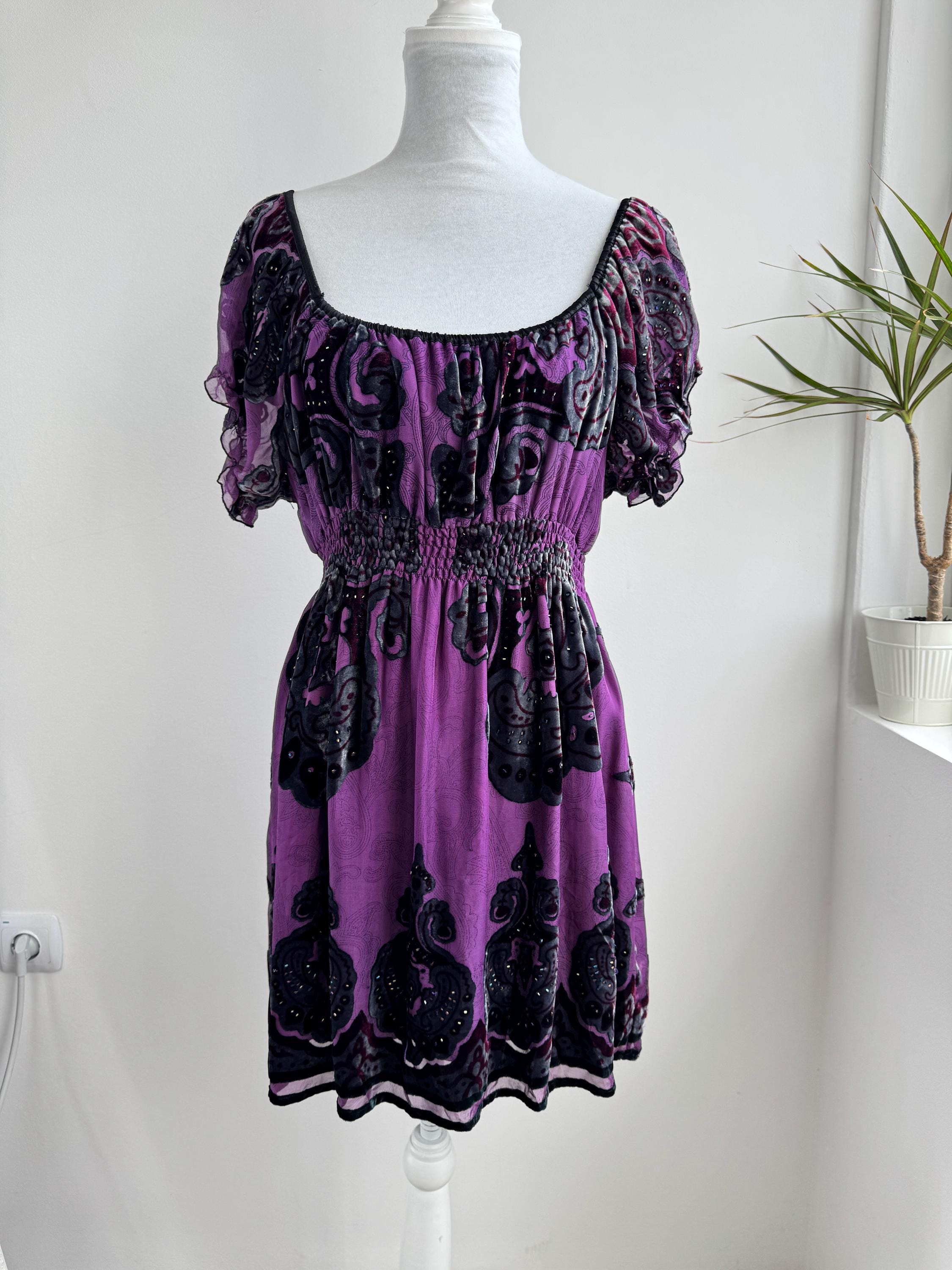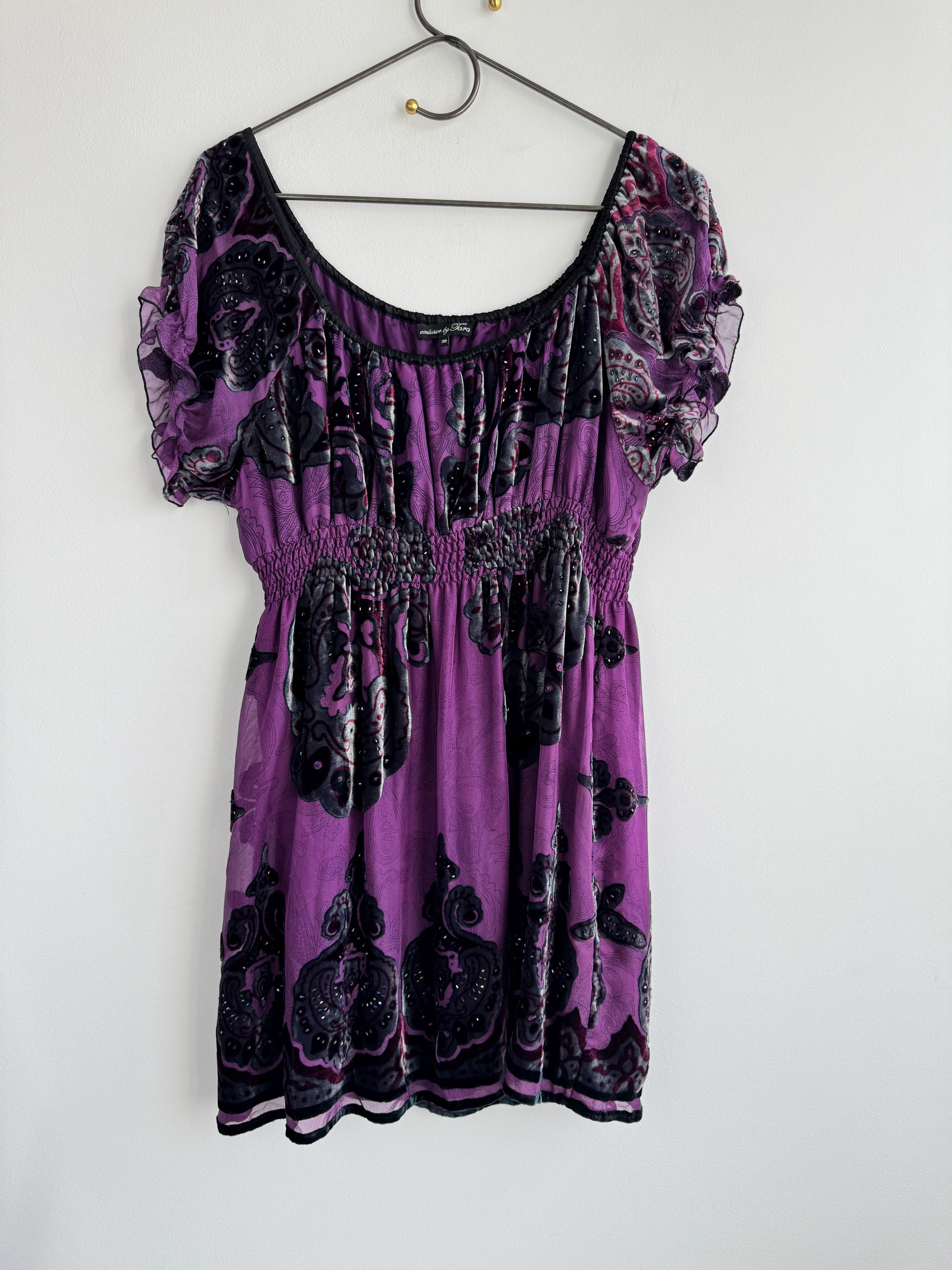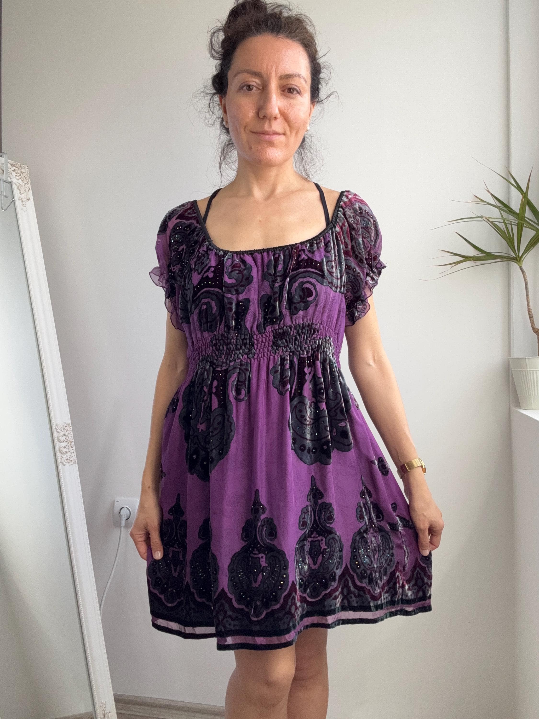 Step into bohemian elegance with this stunning "Exclusive by Tara" devore mini dress with paisley burnt velvet pattern and seed bead decoration. Crafted from a luxurious silk and rayon blend, this piece features a breathtaking velvet devoré (burnout) paisley pattern in shades of deep purple and charcoal grey. The intricate fabric is further elevated by delicate hand-beaded accents throughout the bodice and sleeves, catching the light with every movement.