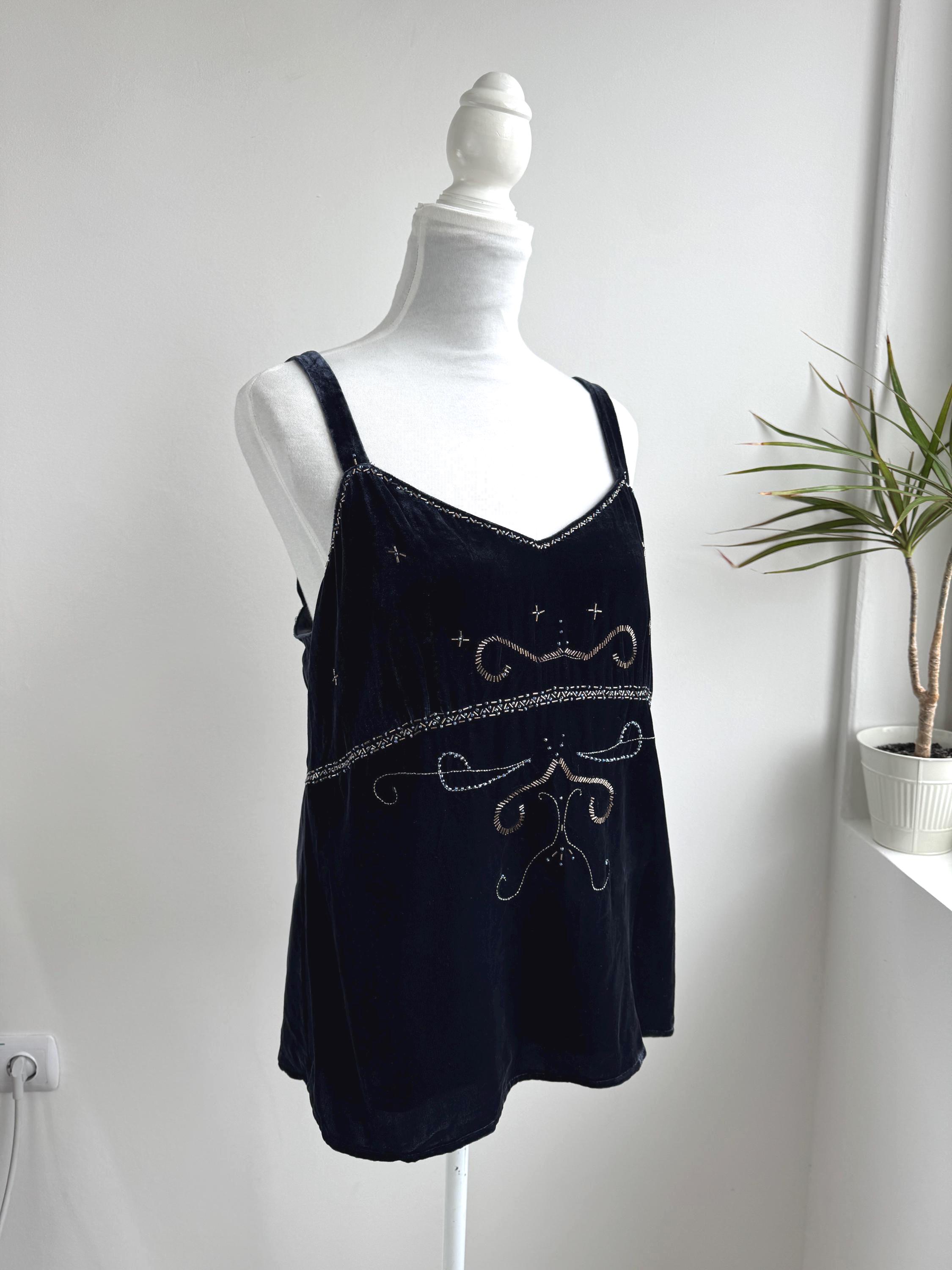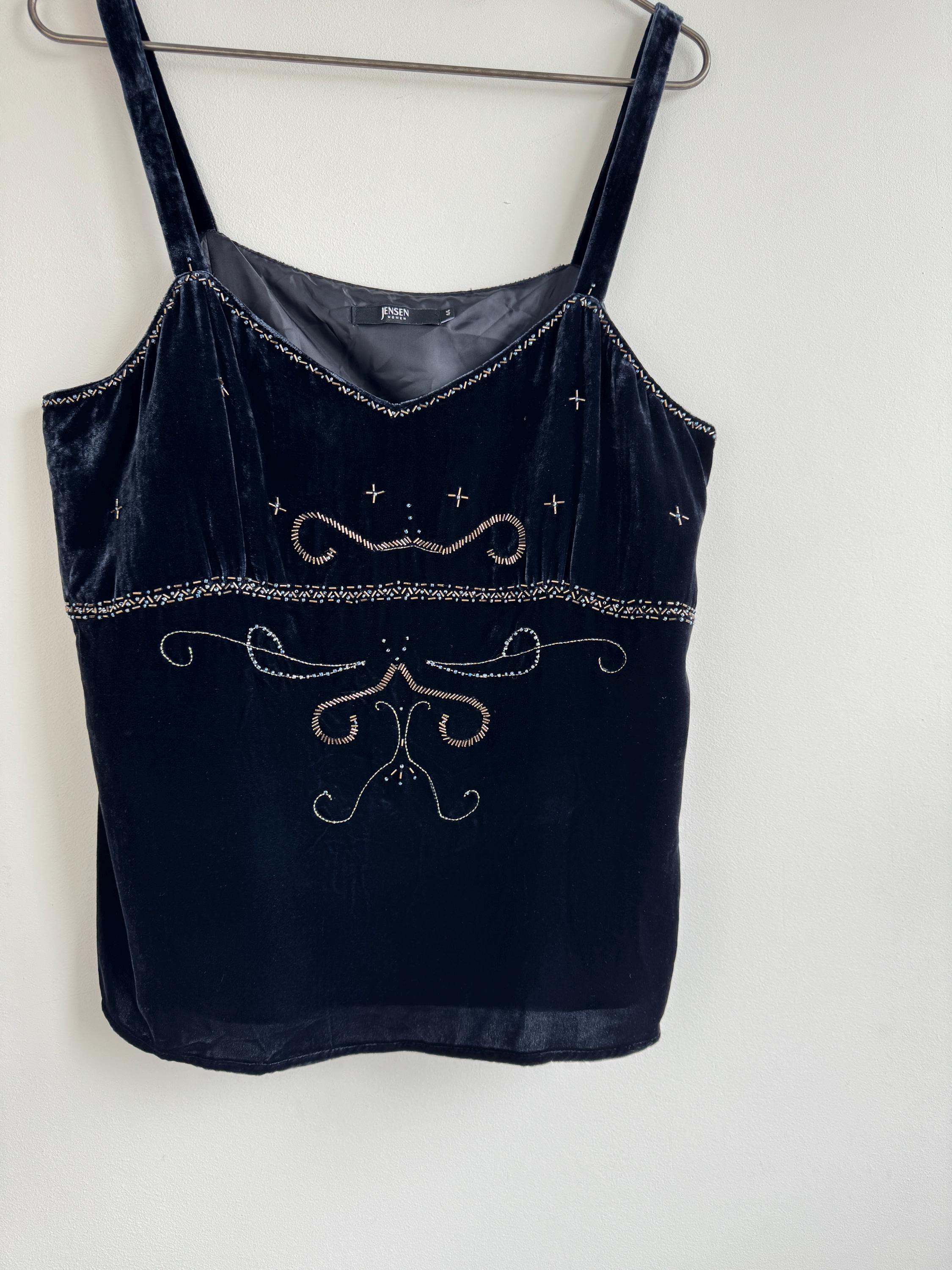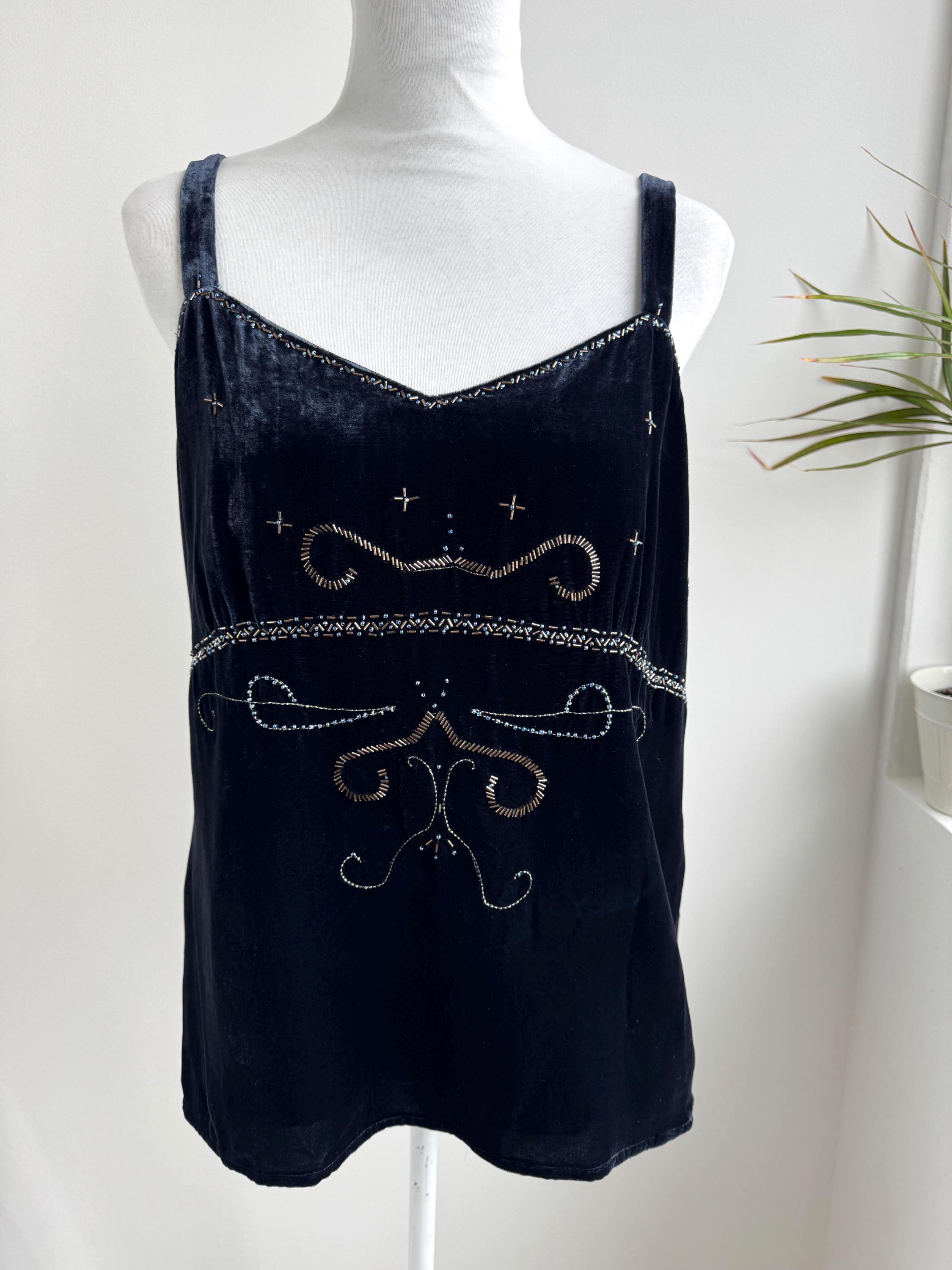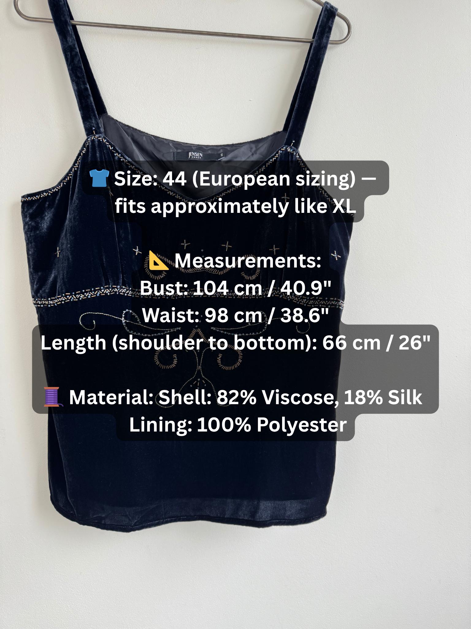 This is a vintage Y2K navy blue silk velvet beaded camisole from Jensen Women in size EU 44 which fits like XL. The deep midnight navy velvet is soft and lustrous, made from an 82% viscose and 18% silk blend that gives it a genuinely luxurious feel against the skin. But it's the embellishment that really sets it apart. Across the front, an intricate pattern of beads, tiny blue crystal beads, and cross-shaped metallic studs creates swirling Art Nouveau-inspired motifs.