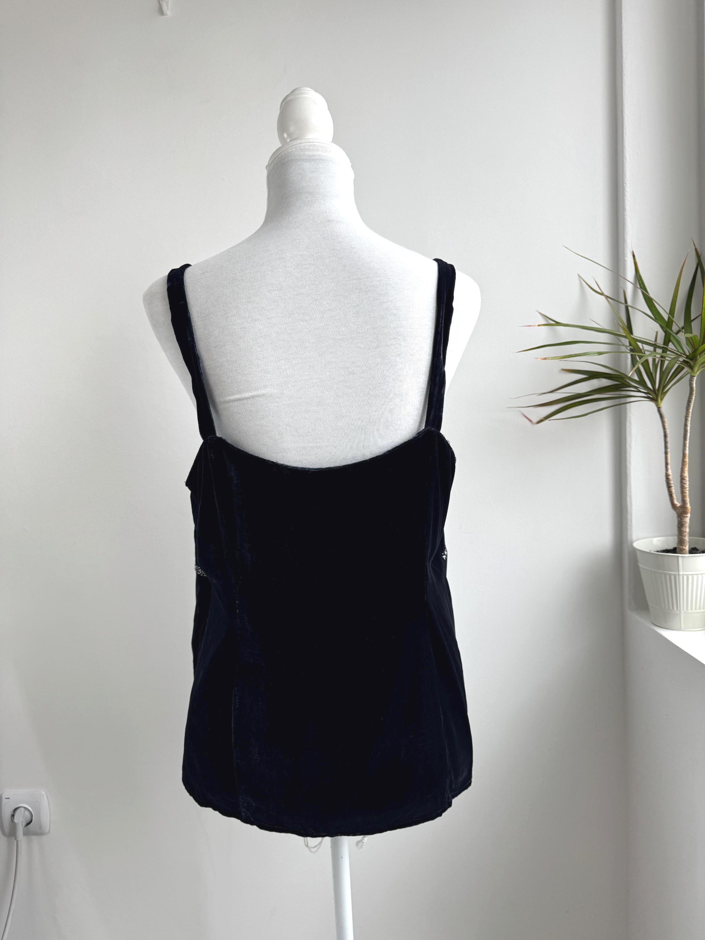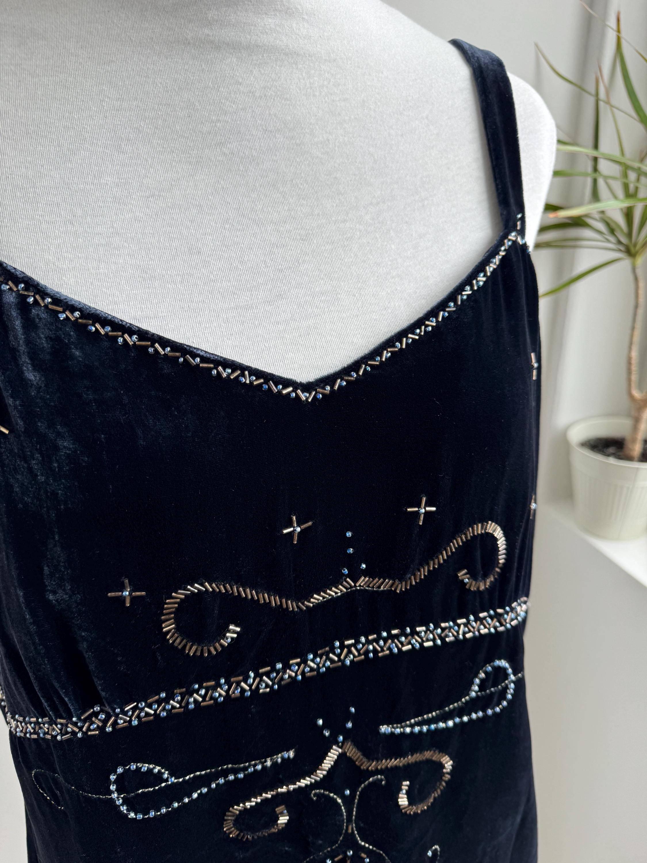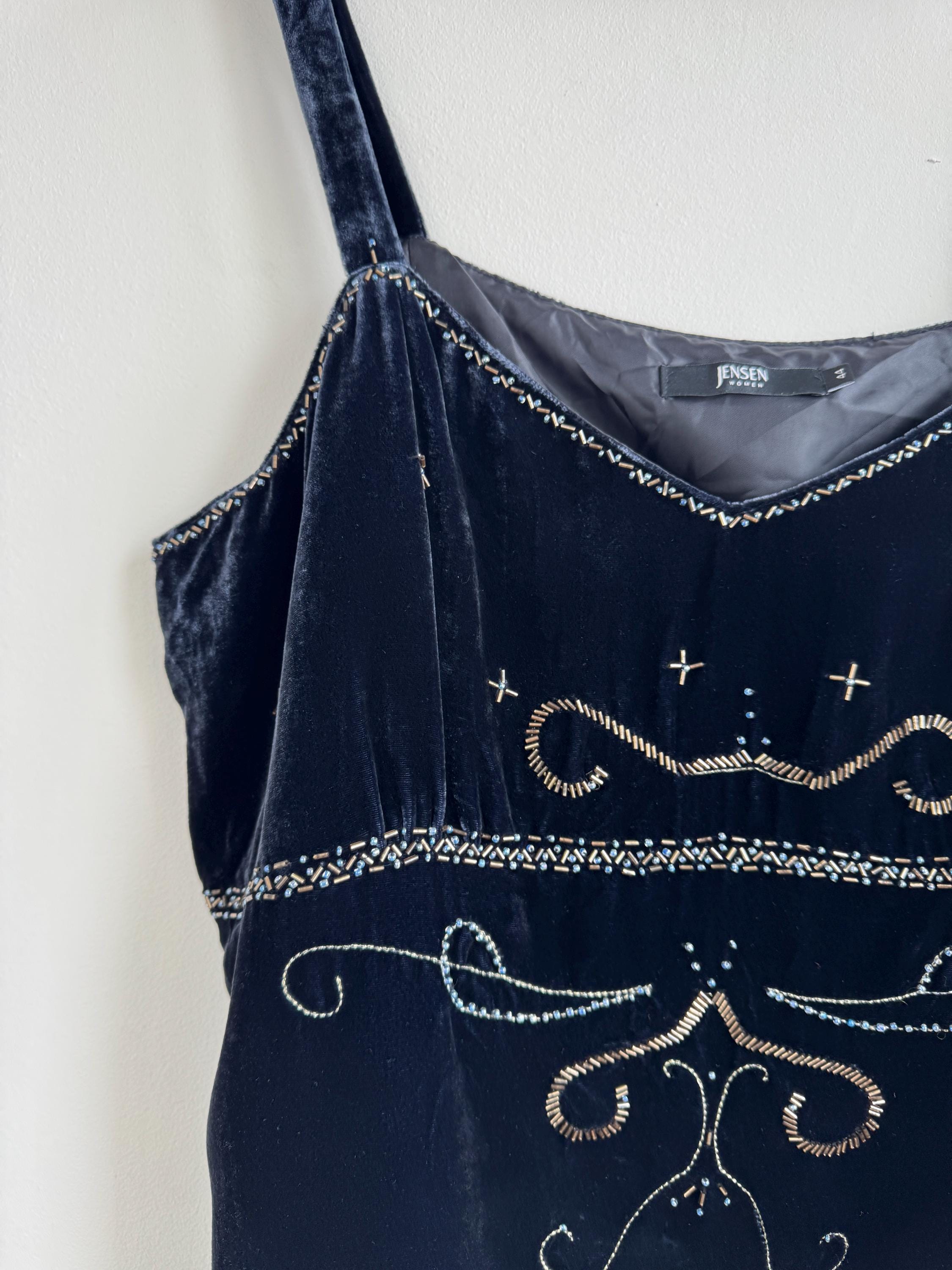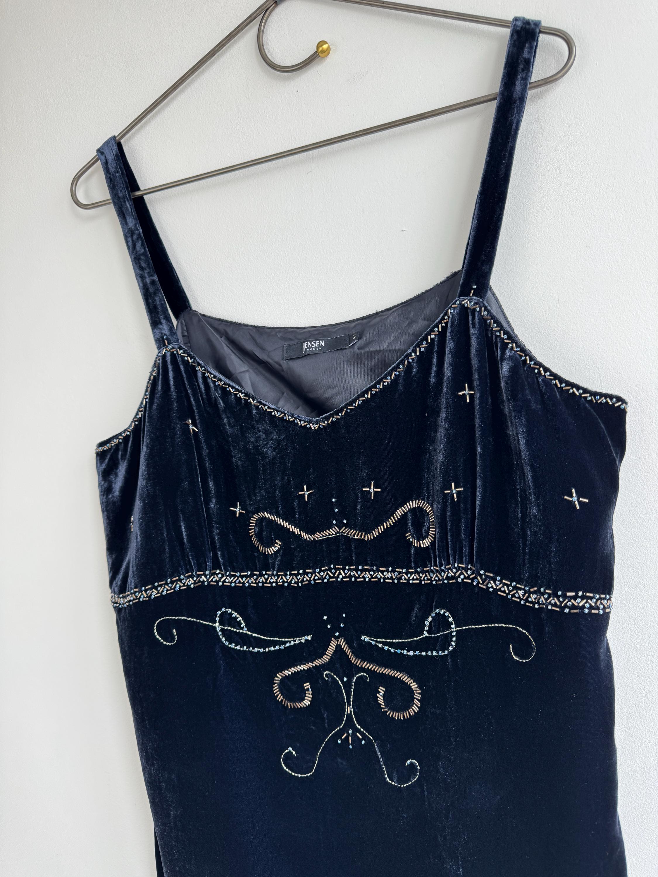 This is a vintage Y2K navy blue silk velvet beaded camisole from Jensen Women in size EU 44 which fits like XL. The deep midnight navy velvet is soft and lustrous, made from an 82% viscose and 18% silk blend that gives it a genuinely luxurious feel against the skin. But it's the embellishment that really sets it apart. Across the front, an intricate pattern of beads, tiny blue crystal beads, and cross-shaped metallic studs creates swirling Art Nouveau-inspired motifs.