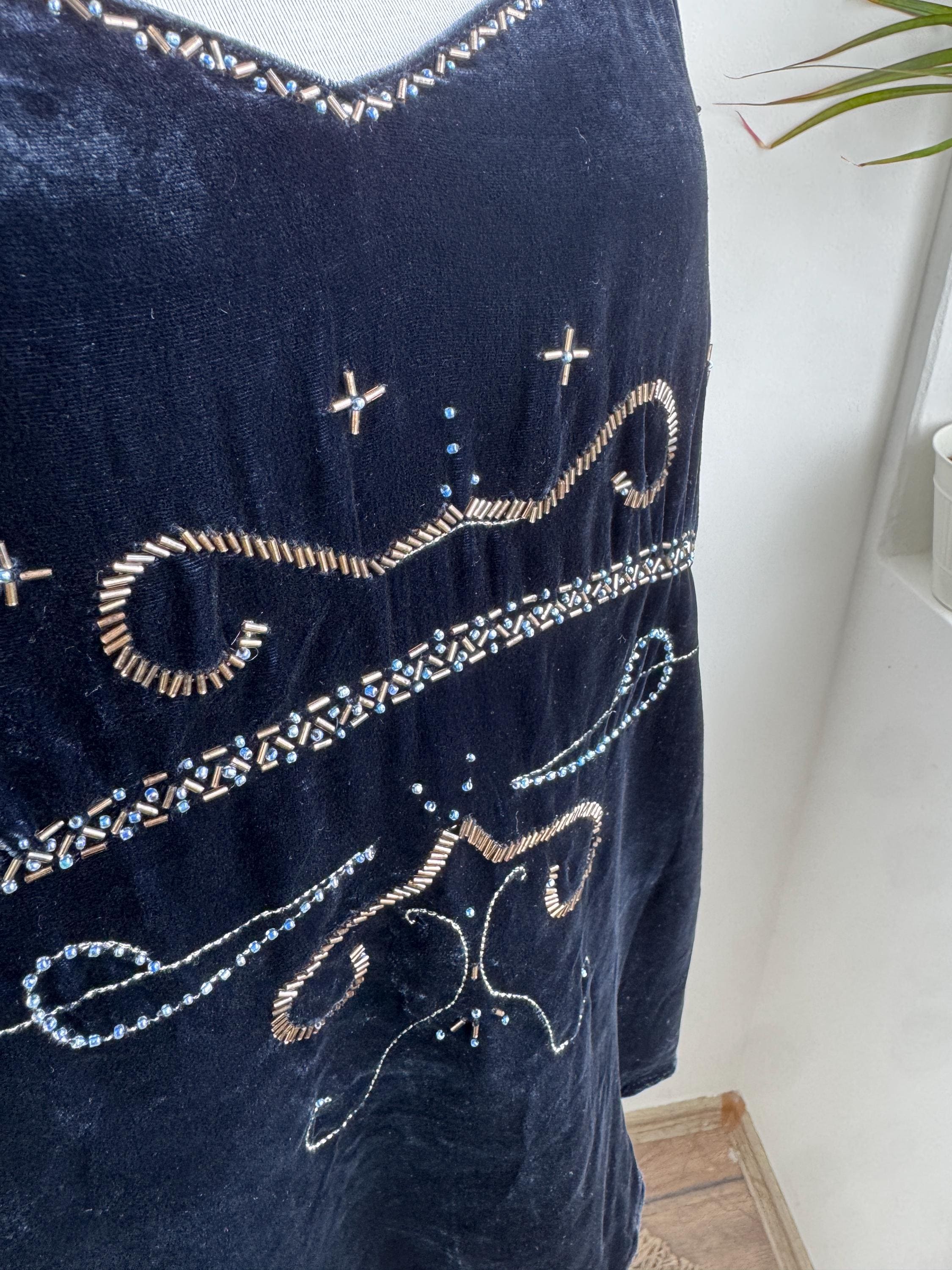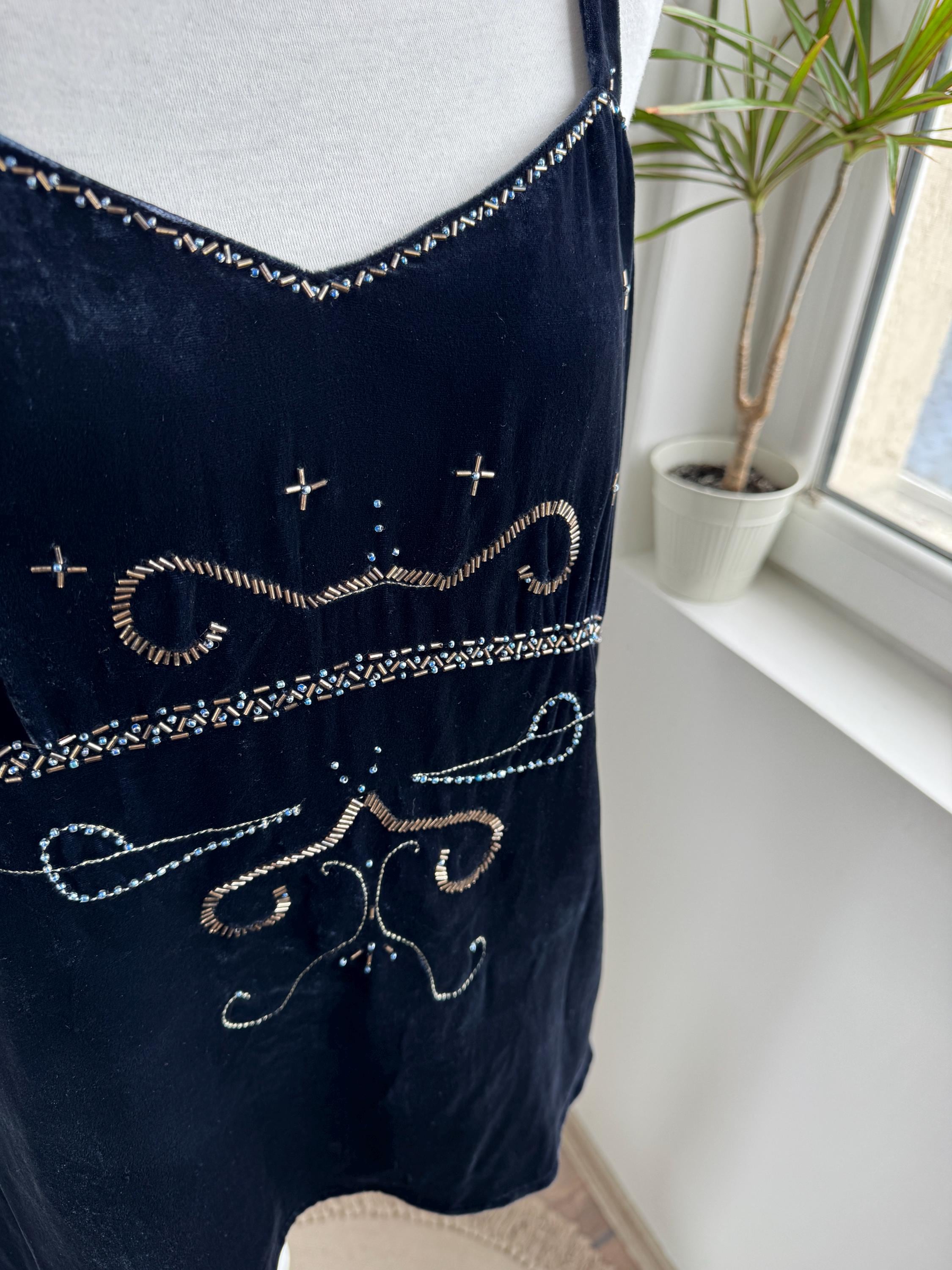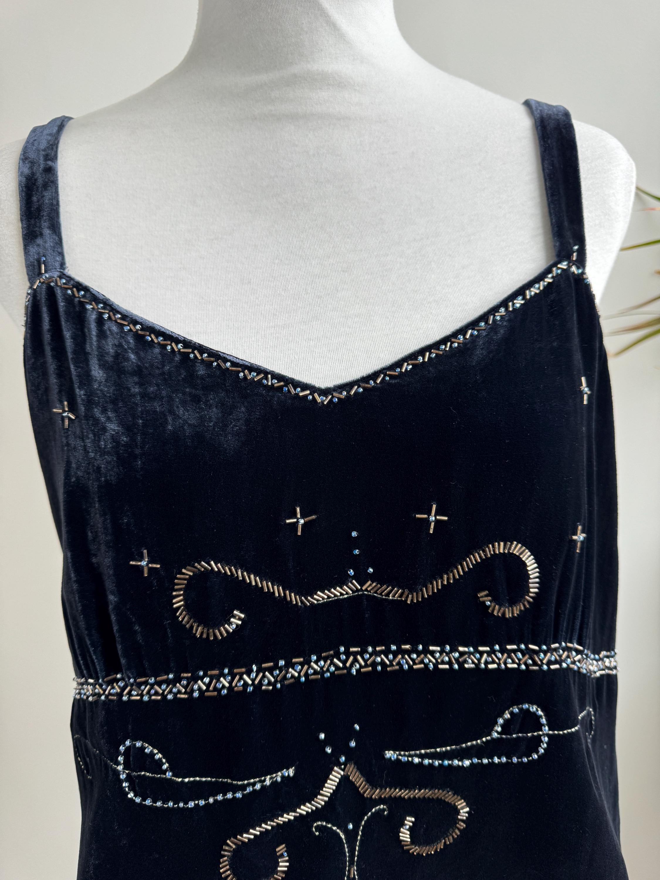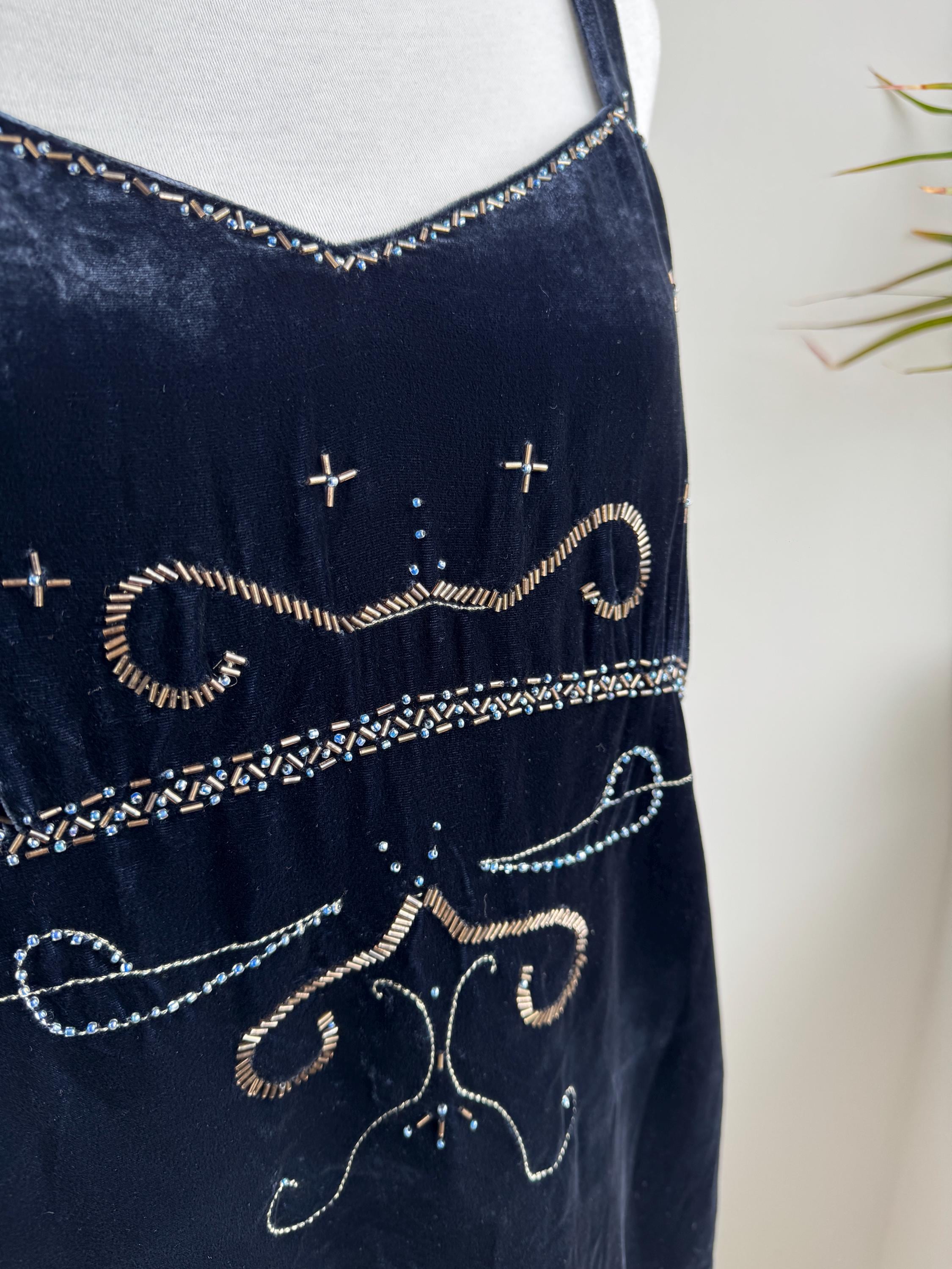 This is a vintage Y2K navy blue silk velvet beaded camisole from Jensen Women in size EU 44 which fits like XL. The deep midnight navy velvet is soft and lustrous, made from an 82% viscose and 18% silk blend that gives it a genuinely luxurious feel against the skin. But it's the embellishment that really sets it apart. Across the front, an intricate pattern of beads, tiny blue crystal beads, and cross-shaped metallic studs creates swirling Art Nouveau-inspired motifs.